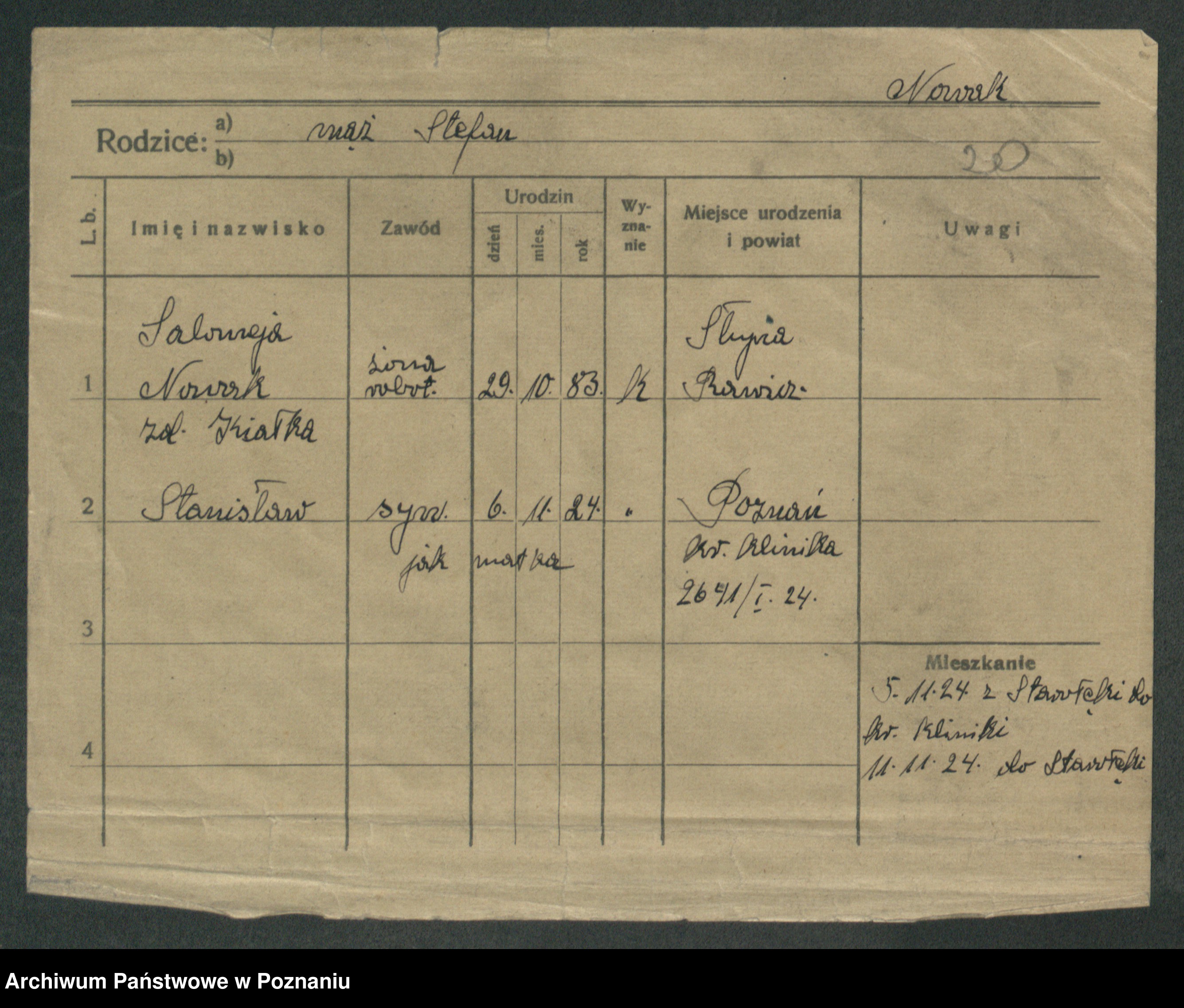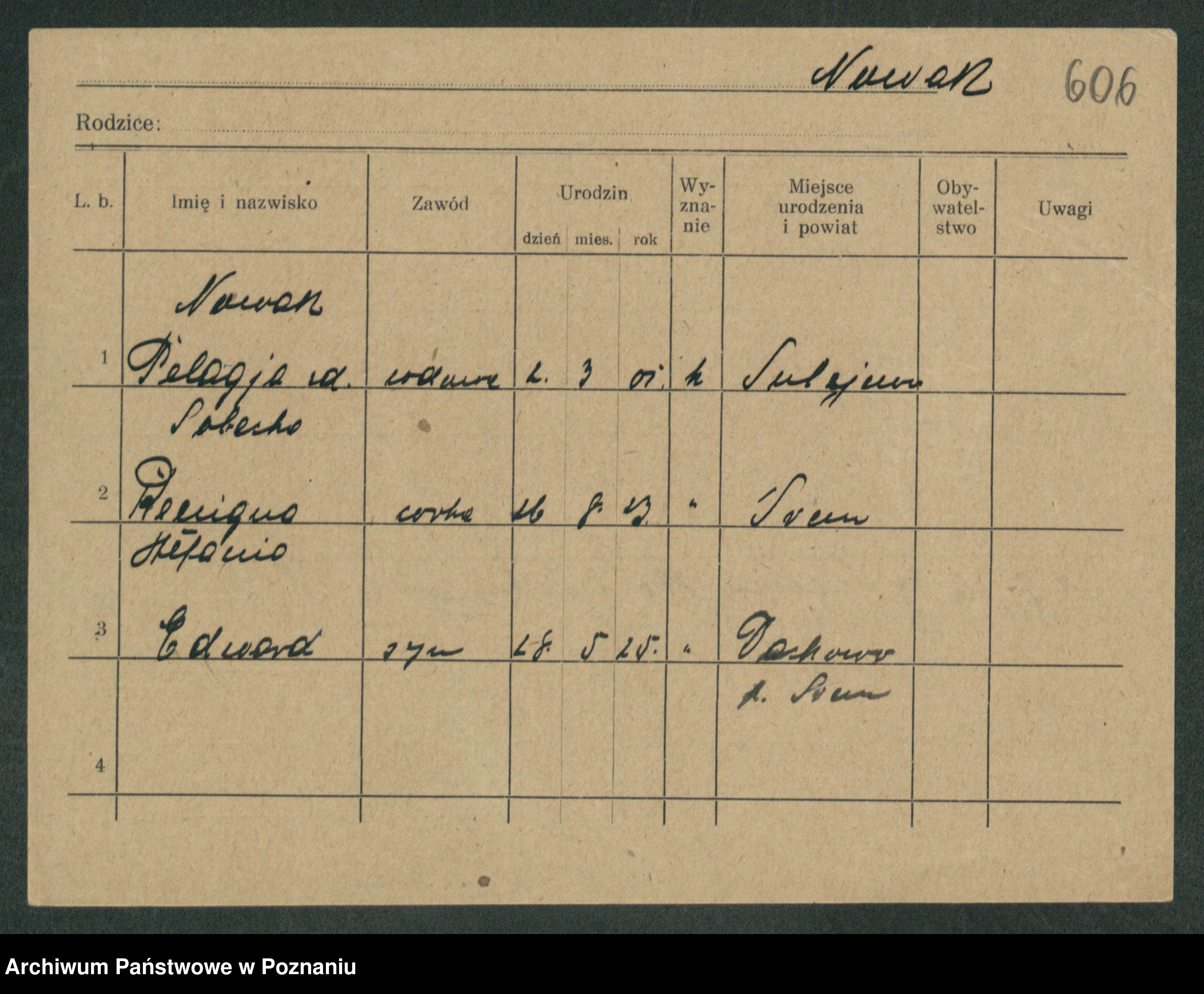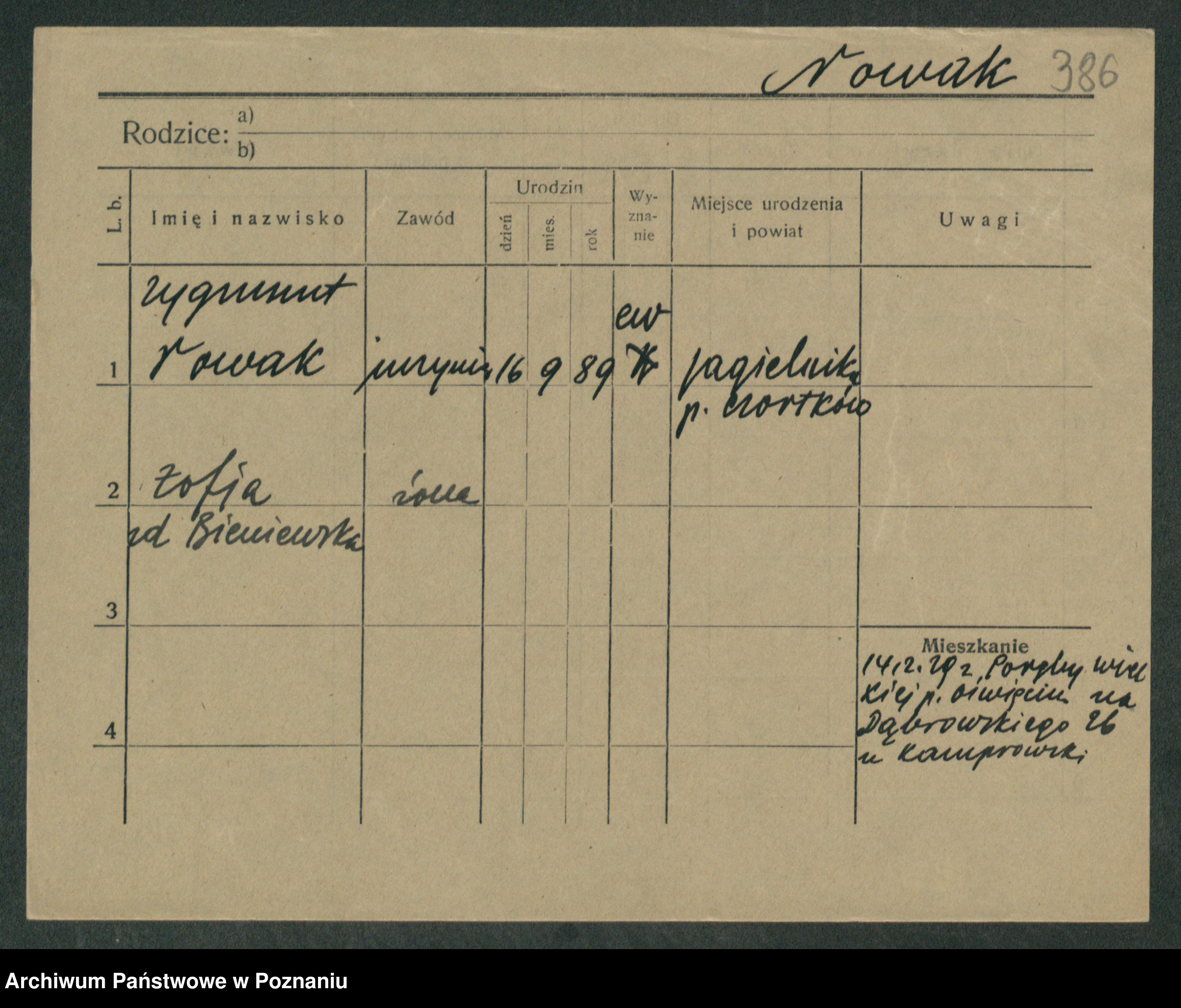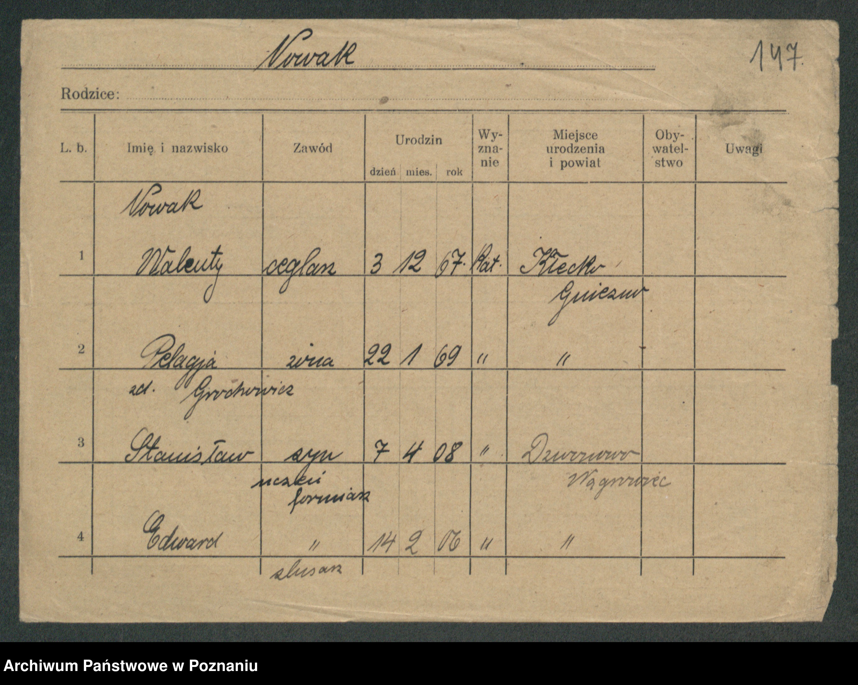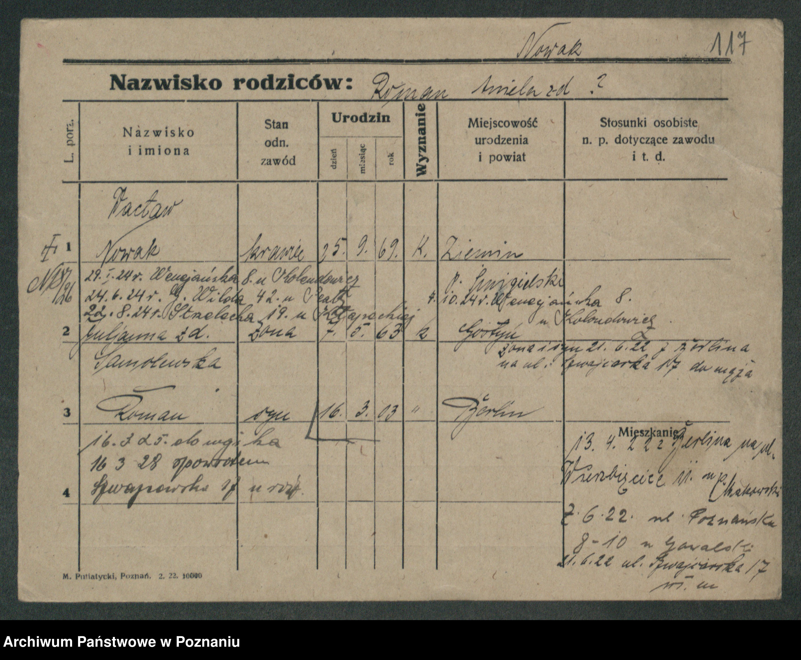Podgląd karty osobowej dostępny jest po kliknięciu na nazwisko lub ikonkę karty. Można dokonywać powiększenia (ikony na górze) lub przechodzić między kolejnymi skanami (strzałki po bokach).