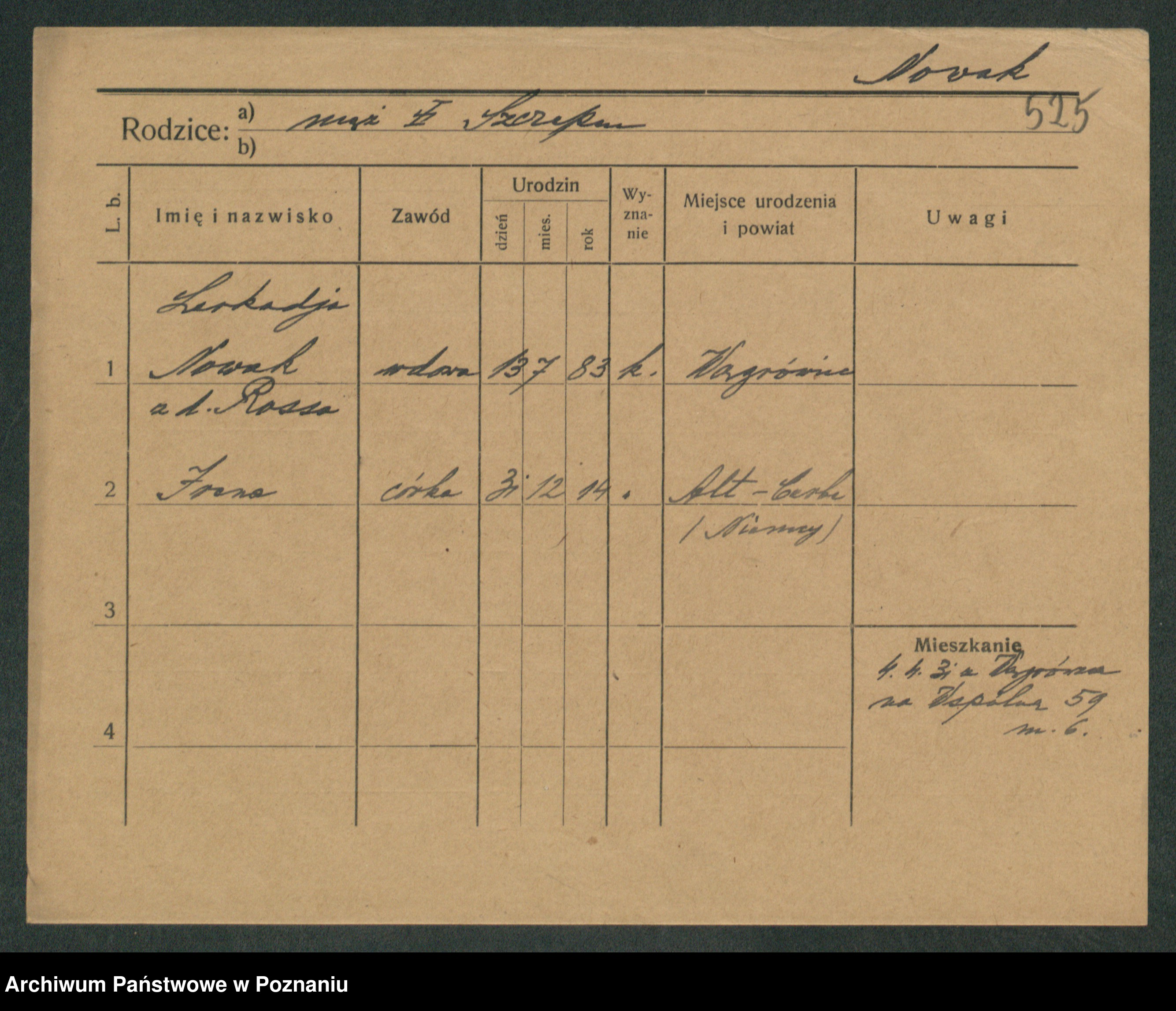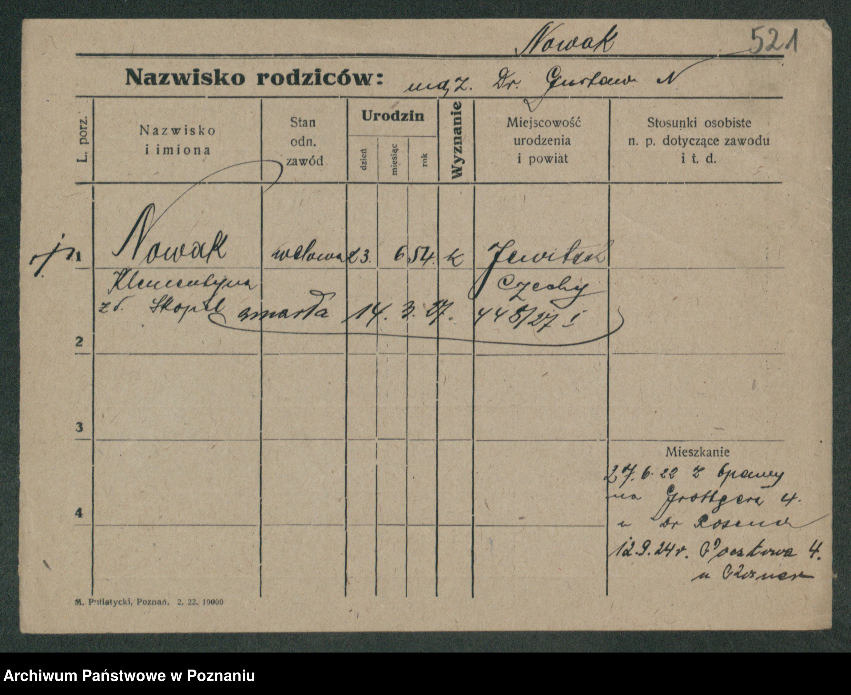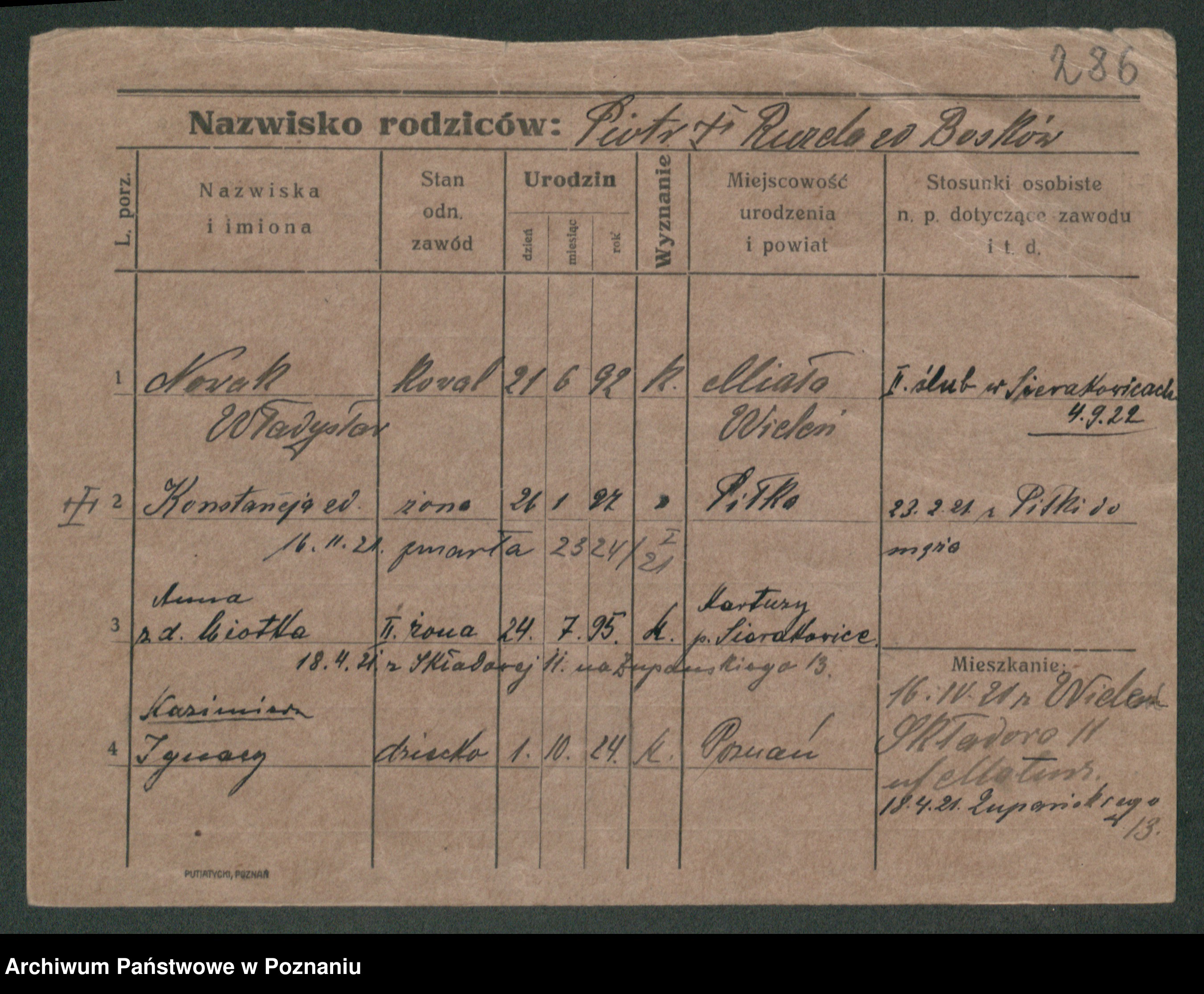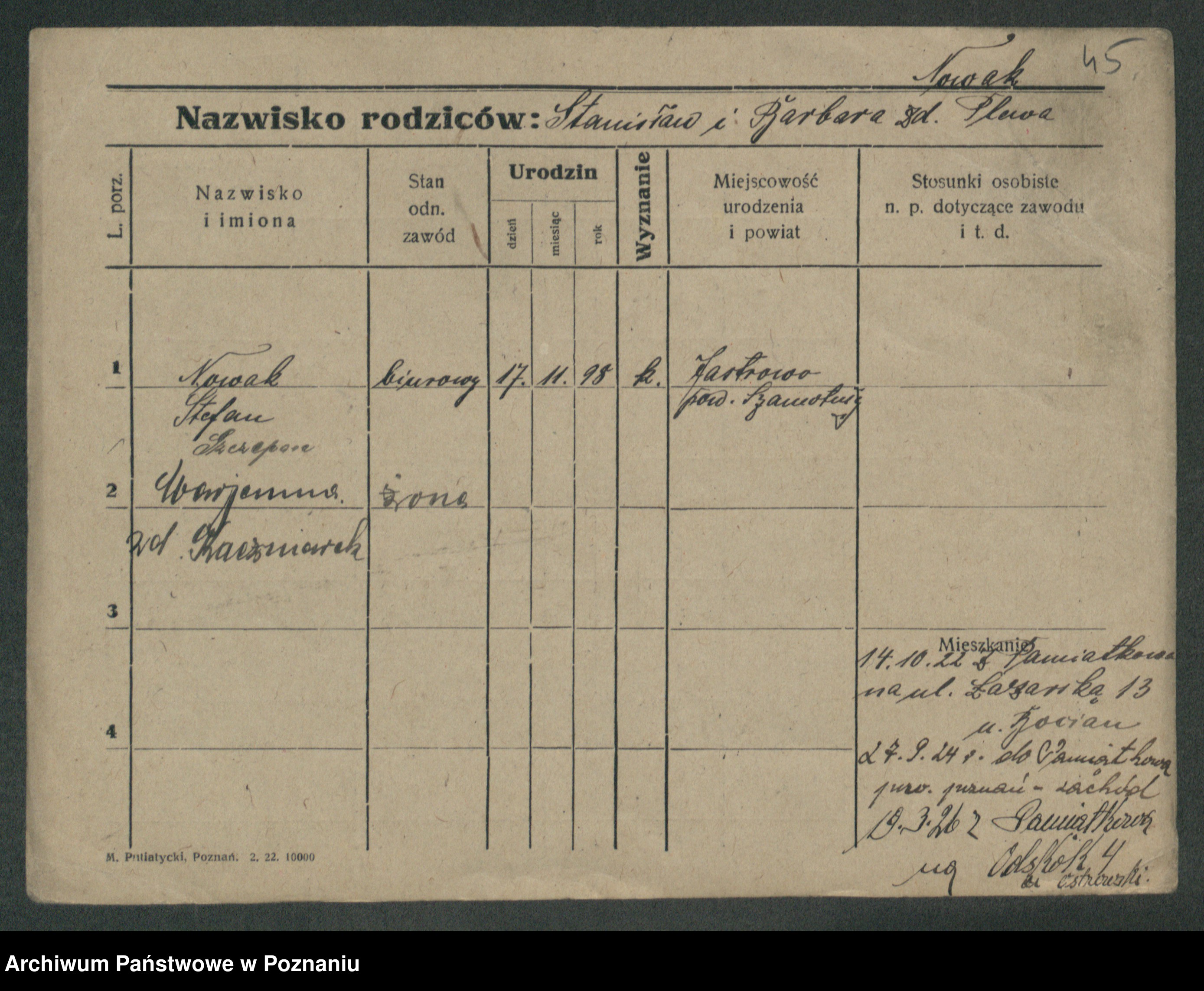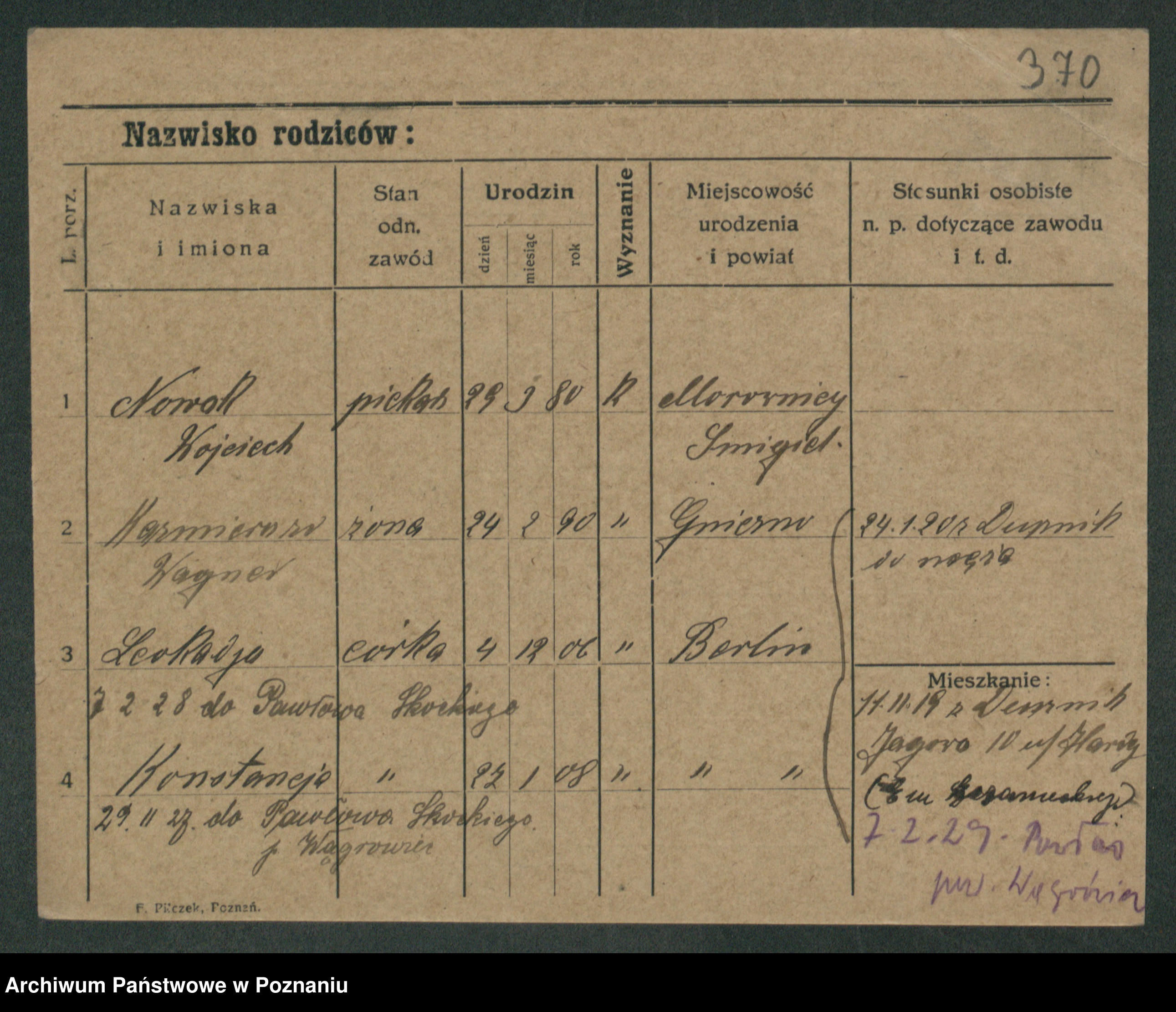 Podgląd karty osobowej dostępny jest po kliknięciu na nazwisko lub ikonkę karty. Można dokonywać powiększenia (ikony na górze) lub przechodzić między kolejnymi skanami (strzałki po bokach).