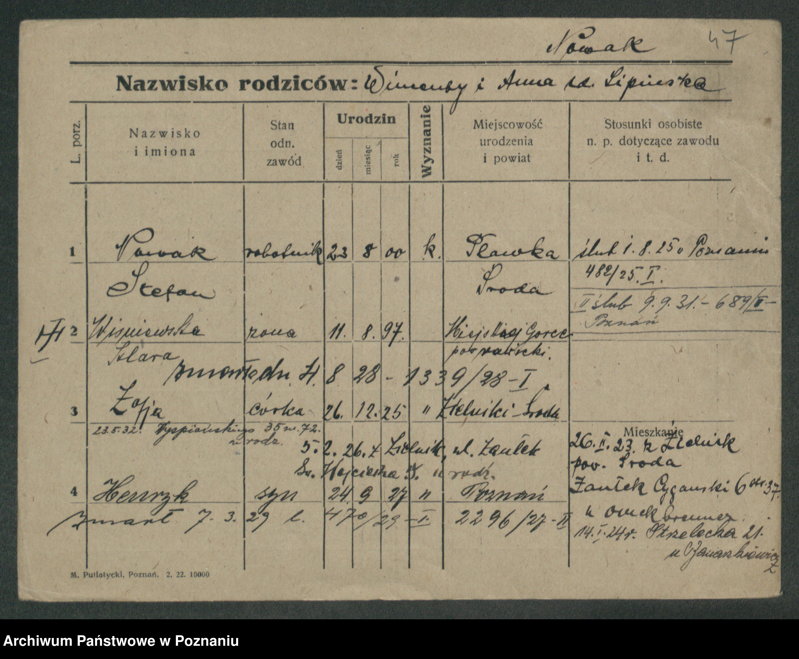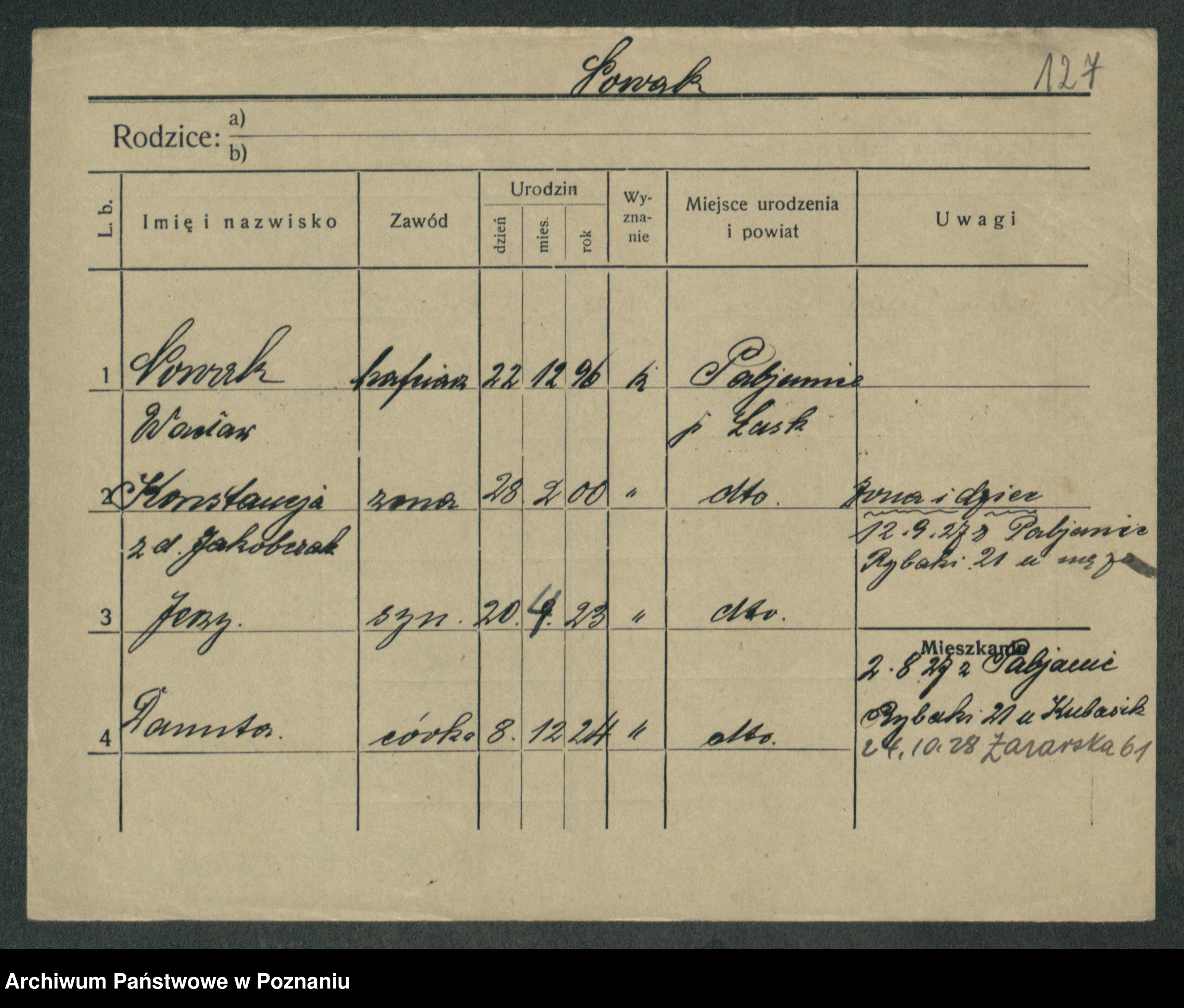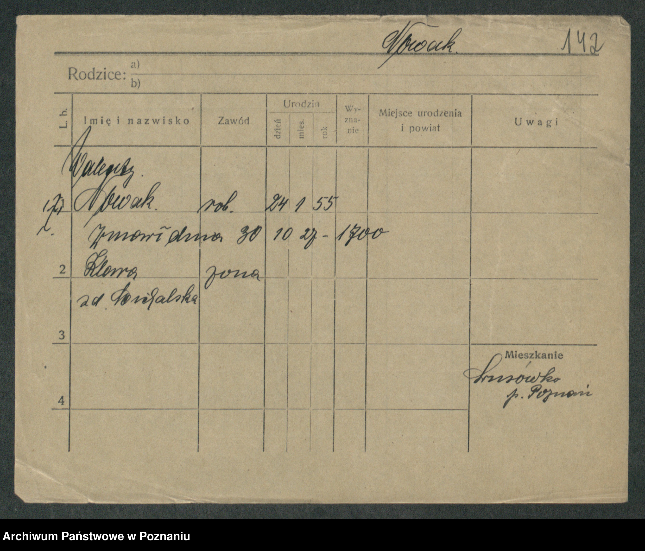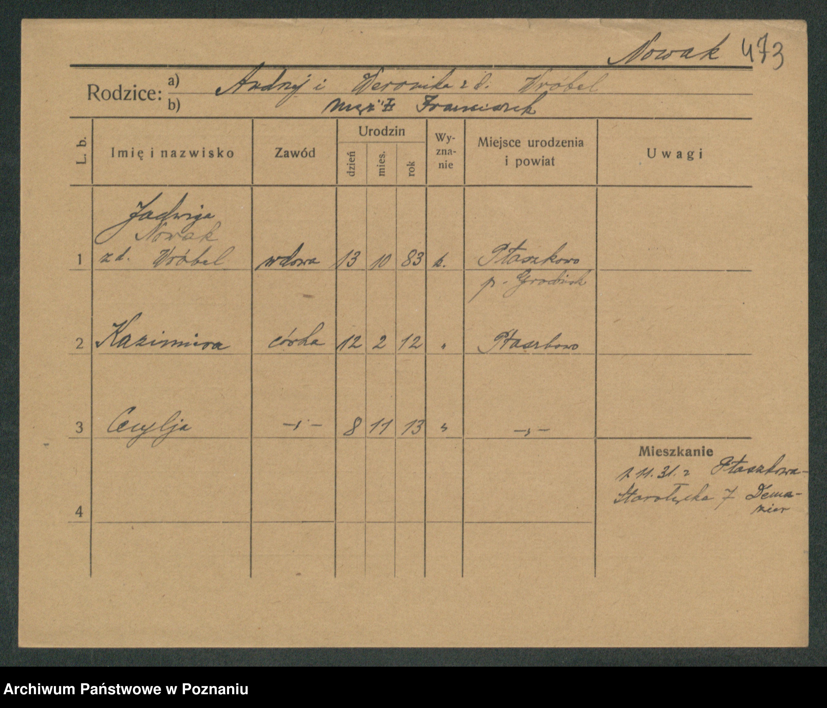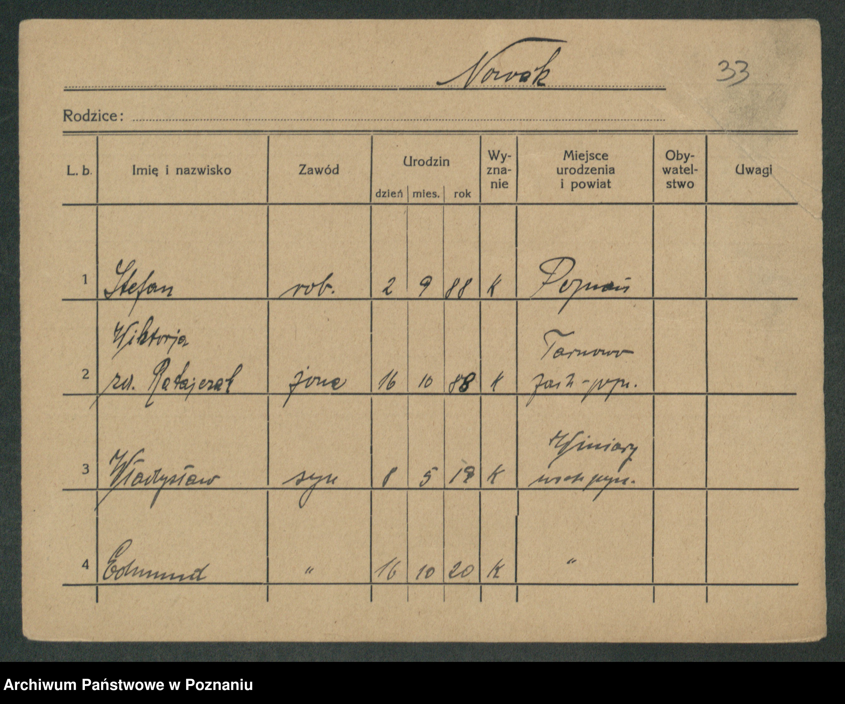 Podgląd karty osobowej dostępny jest po kliknięciu na nazwisko lub ikonkę karty. Można dokonywać powiększenia (ikony na górze) lub przechodzić między kolejnymi skanami (strzałki po bokach).