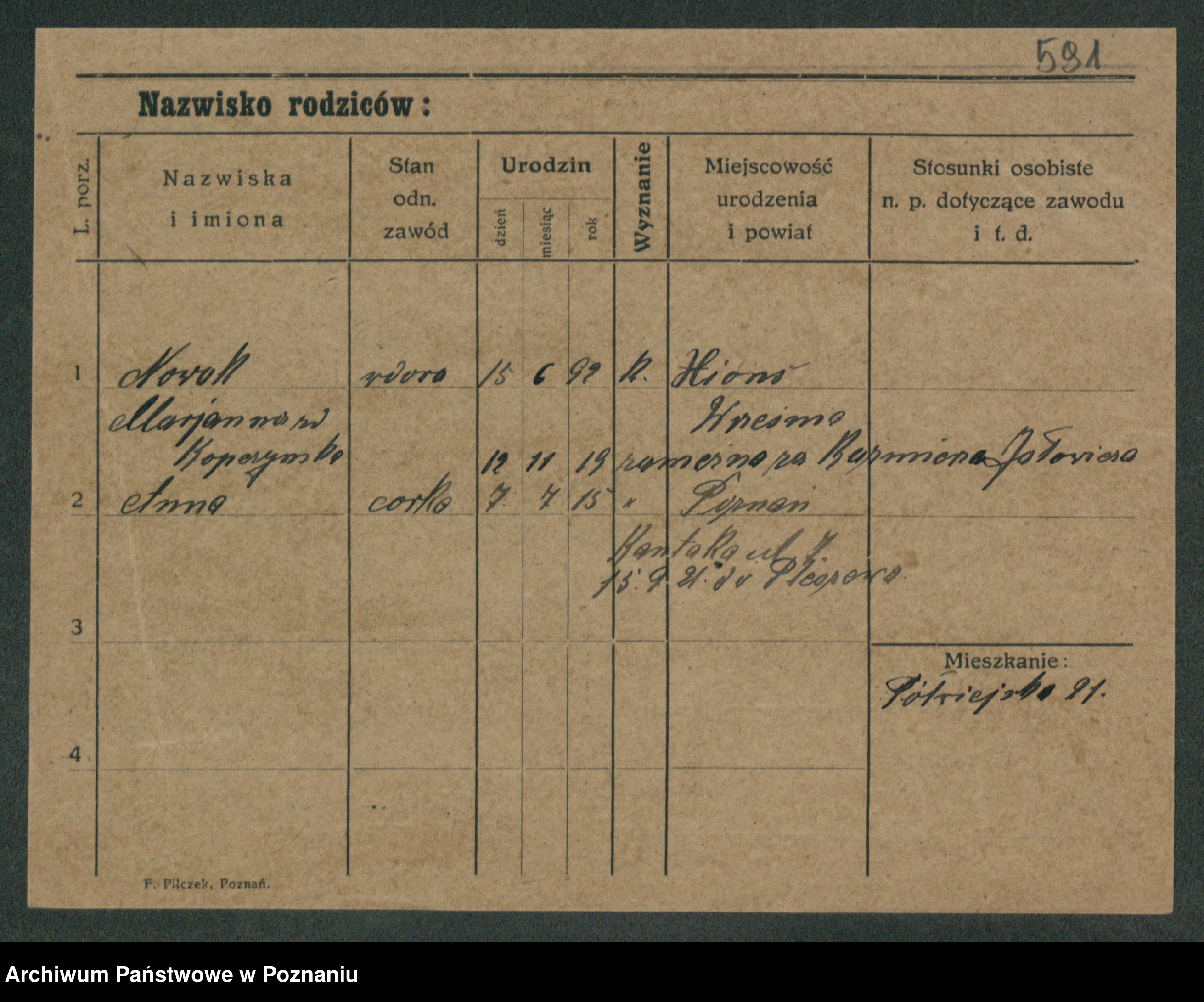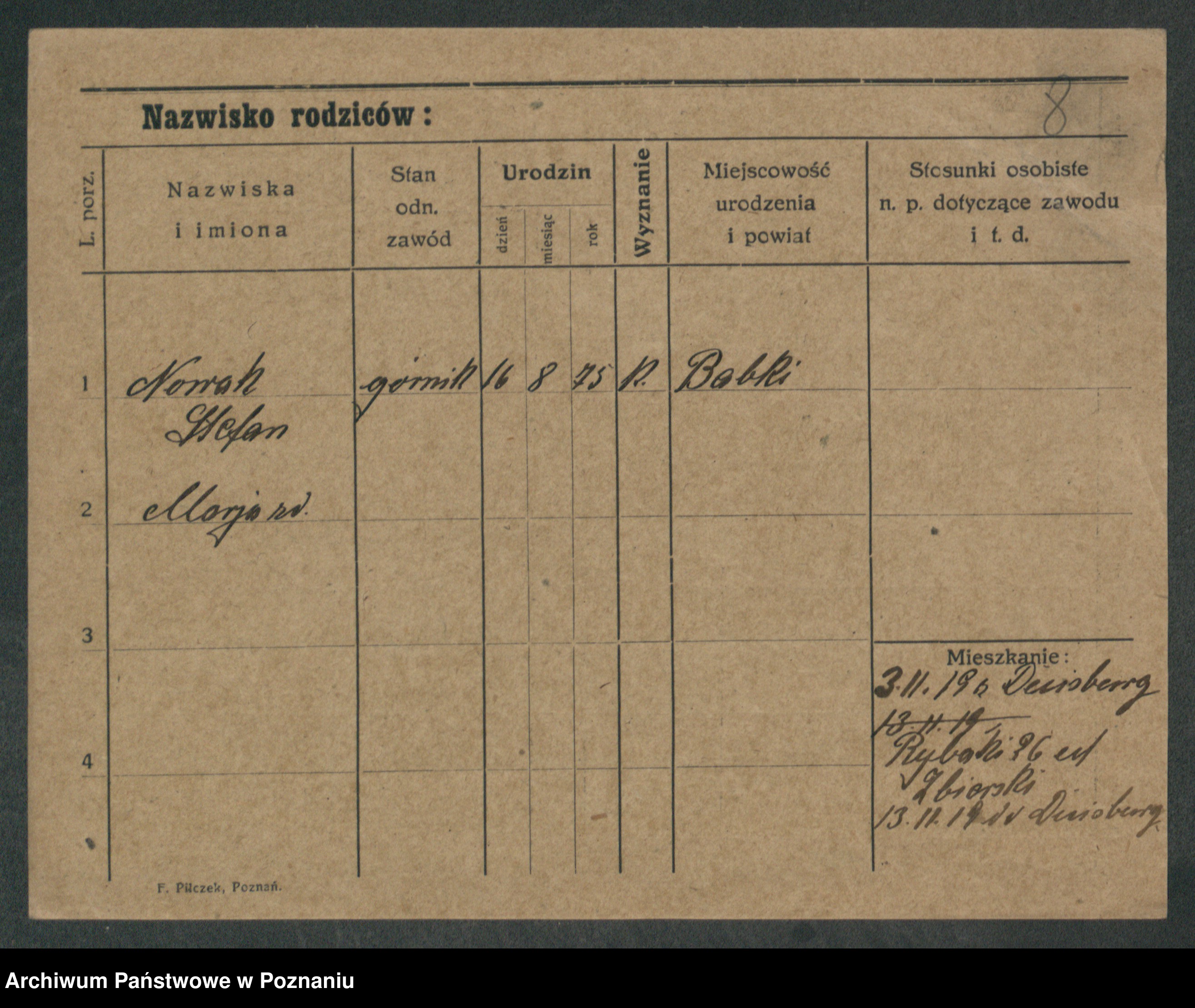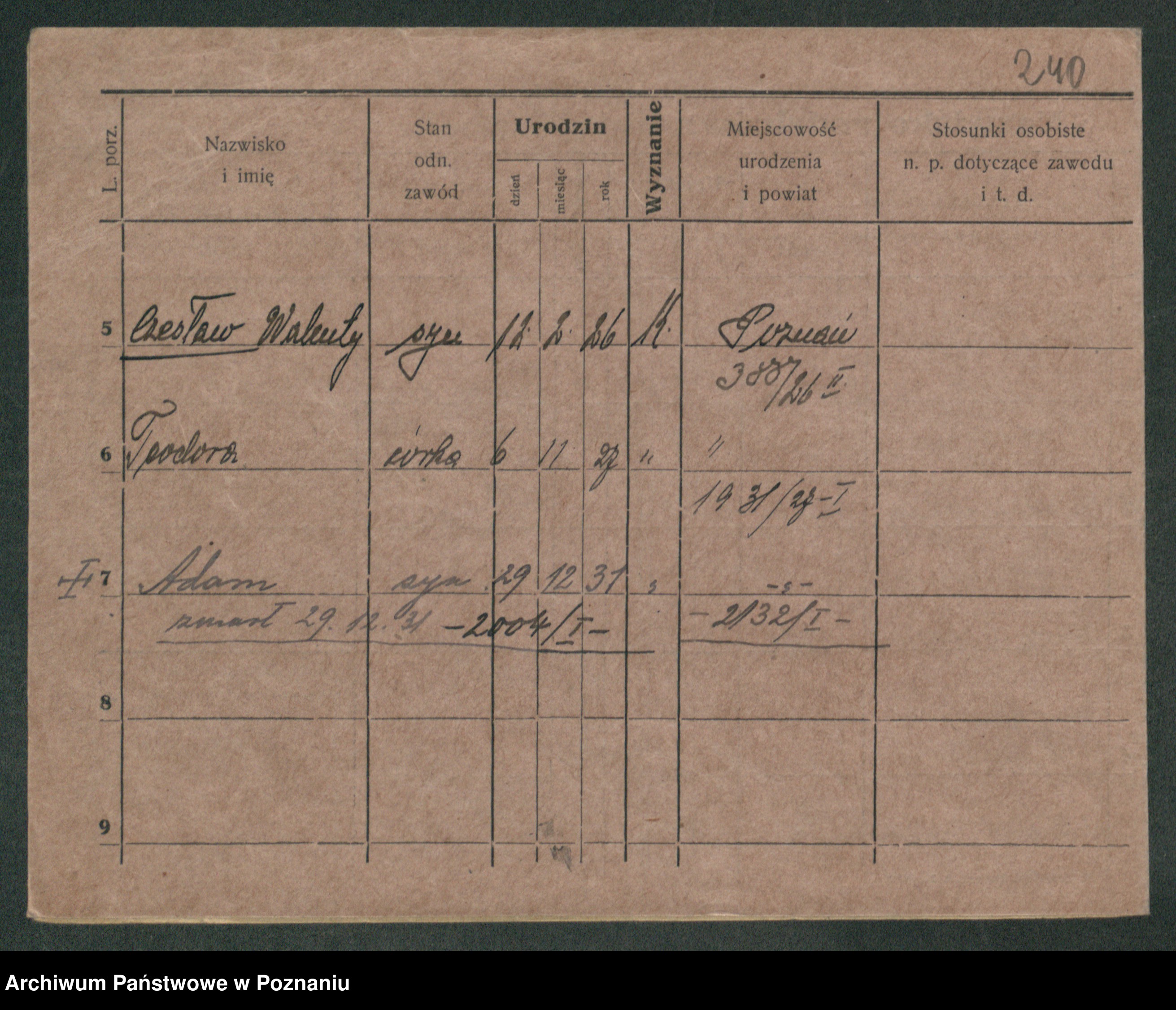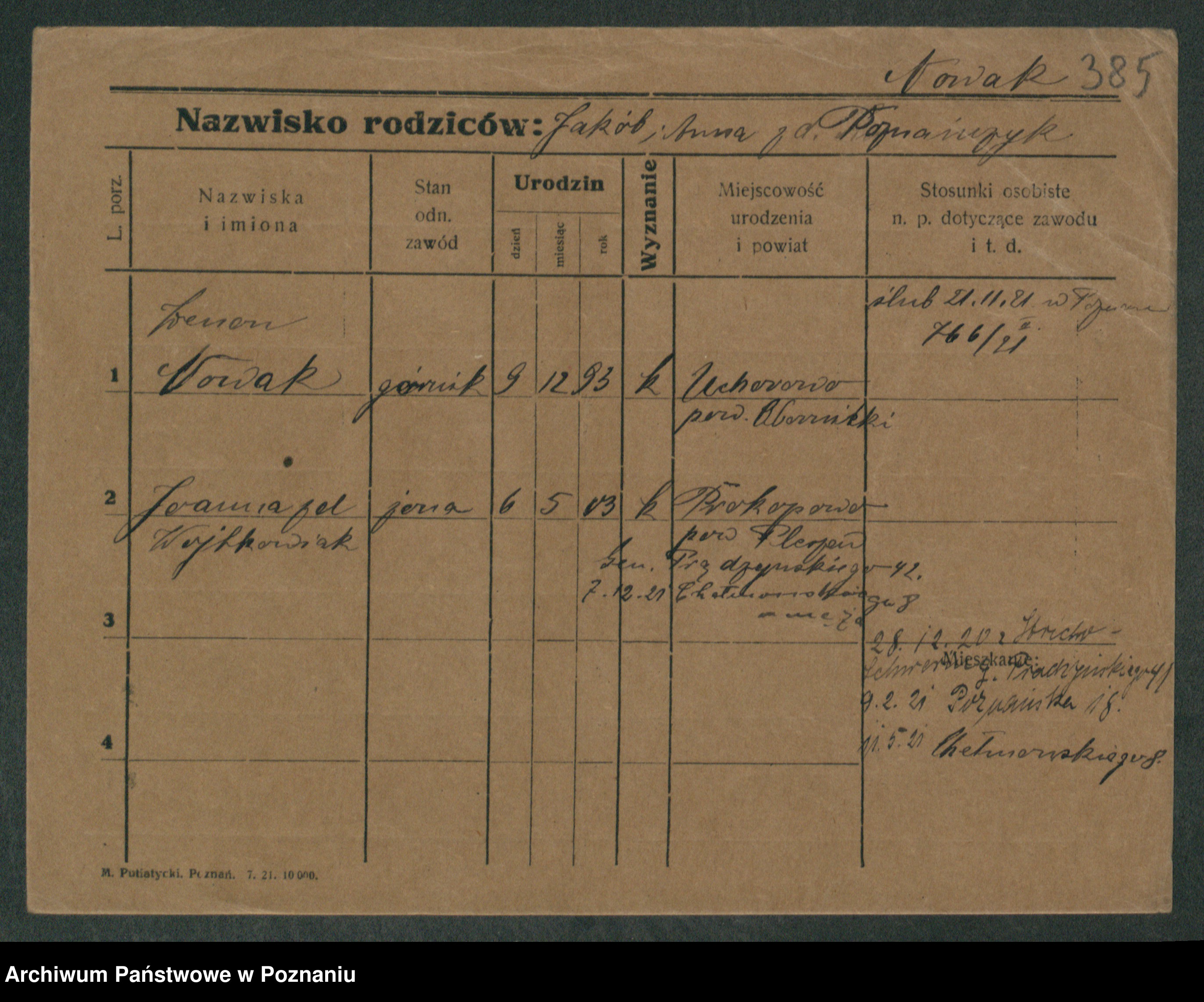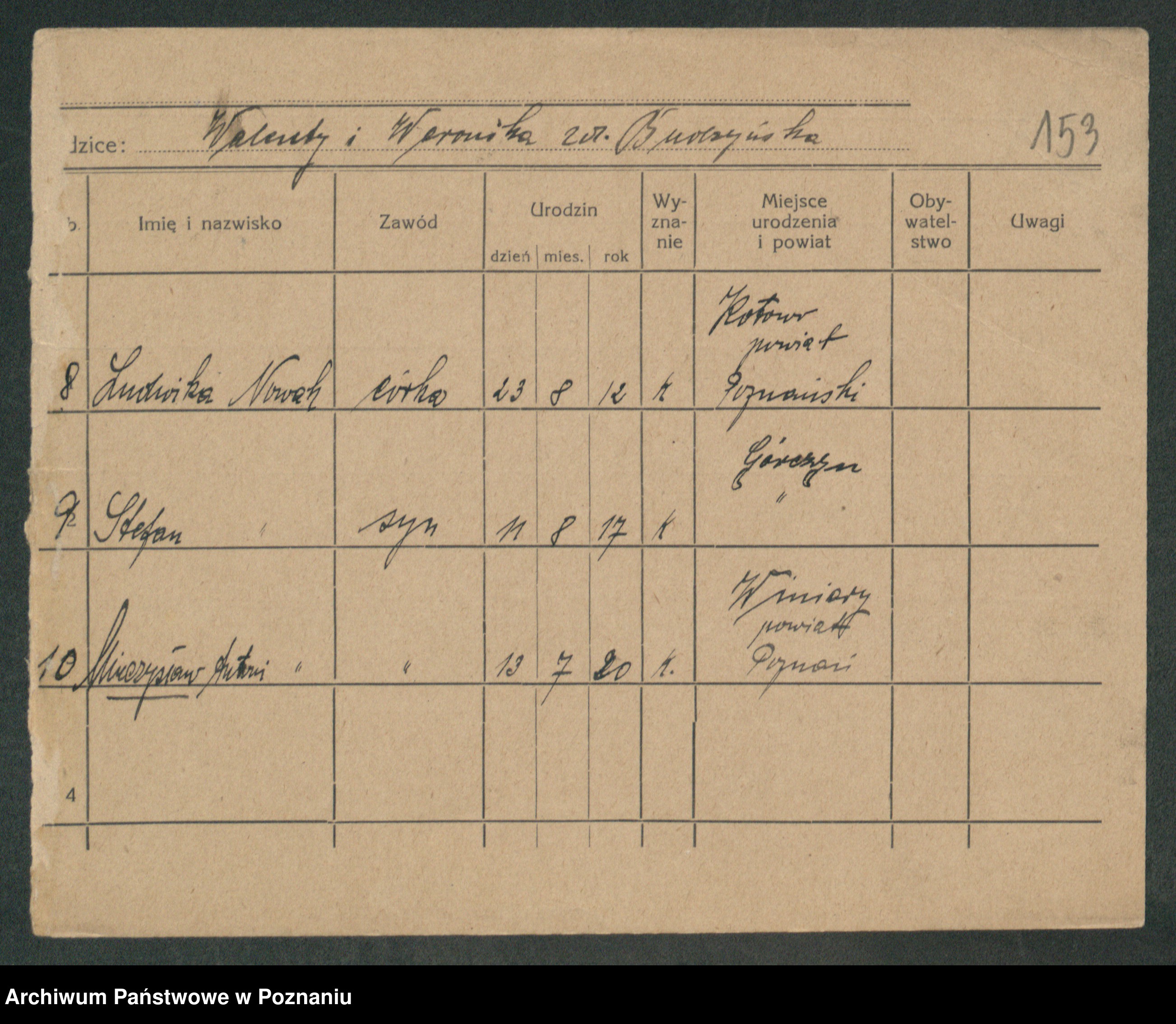 Podgląd karty osobowej dostępny jest po kliknięciu na nazwisko lub ikonkę karty. Można dokonywać powiększenia (ikony na górze) lub przechodzić między kolejnymi skanami (strzałki po bokach).