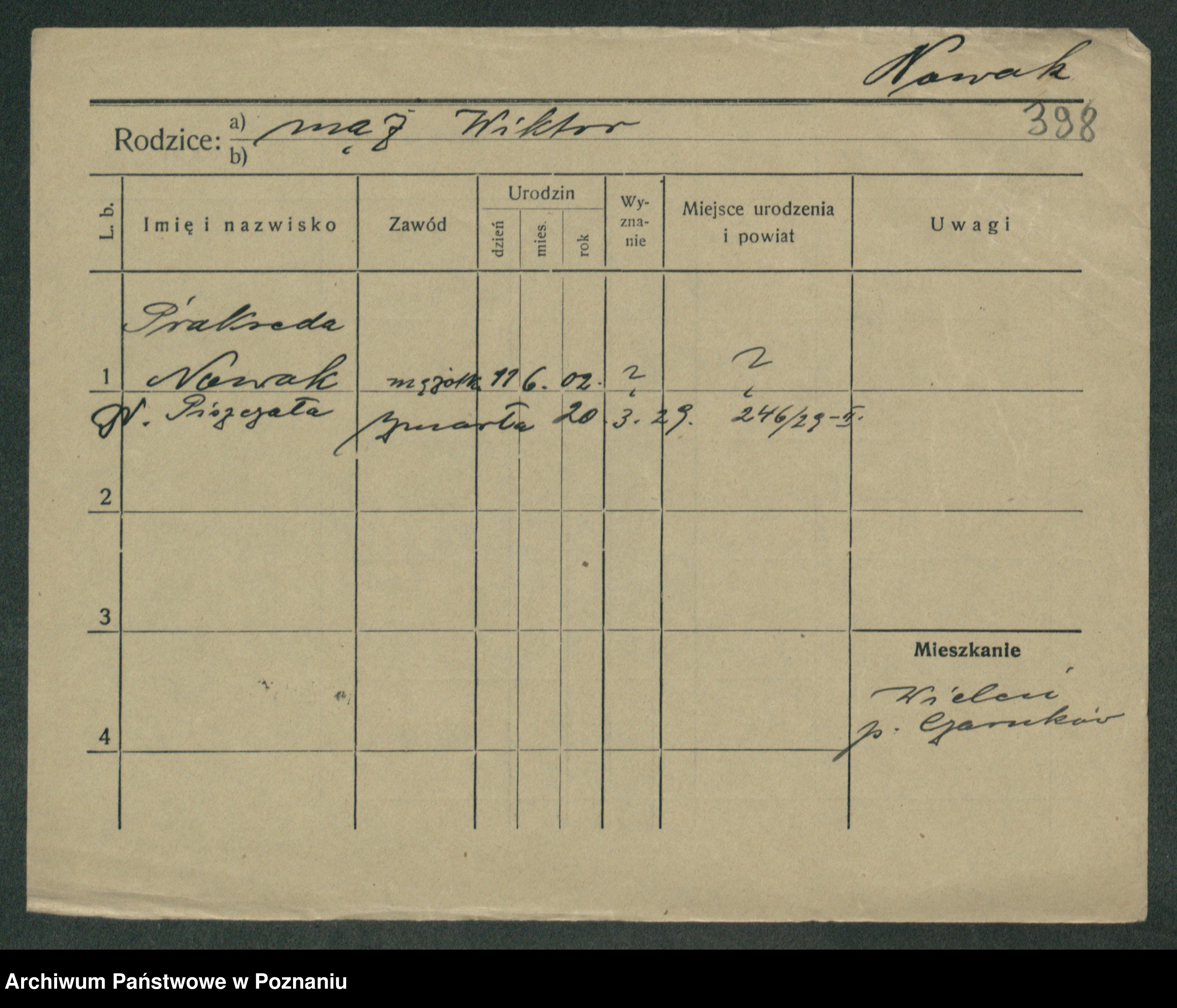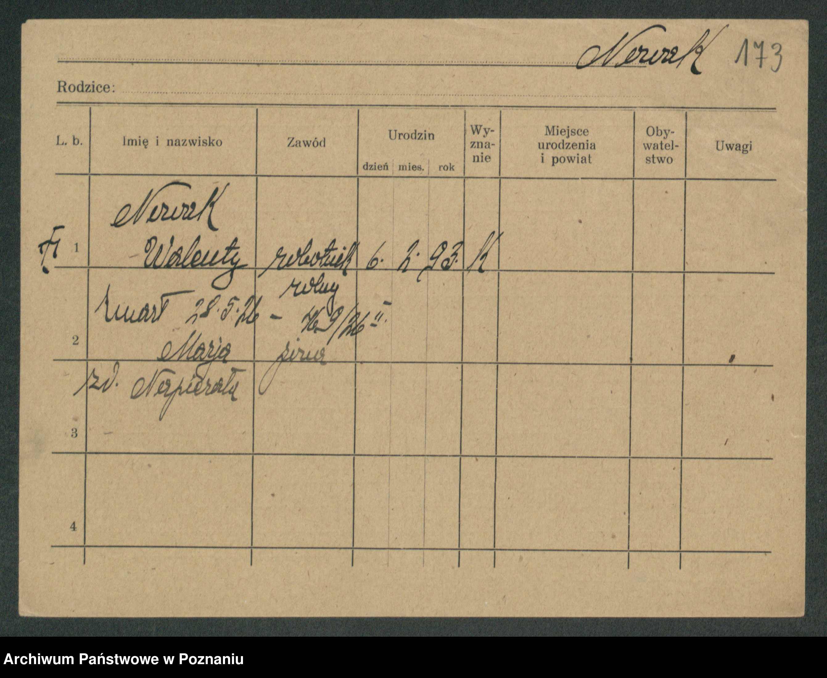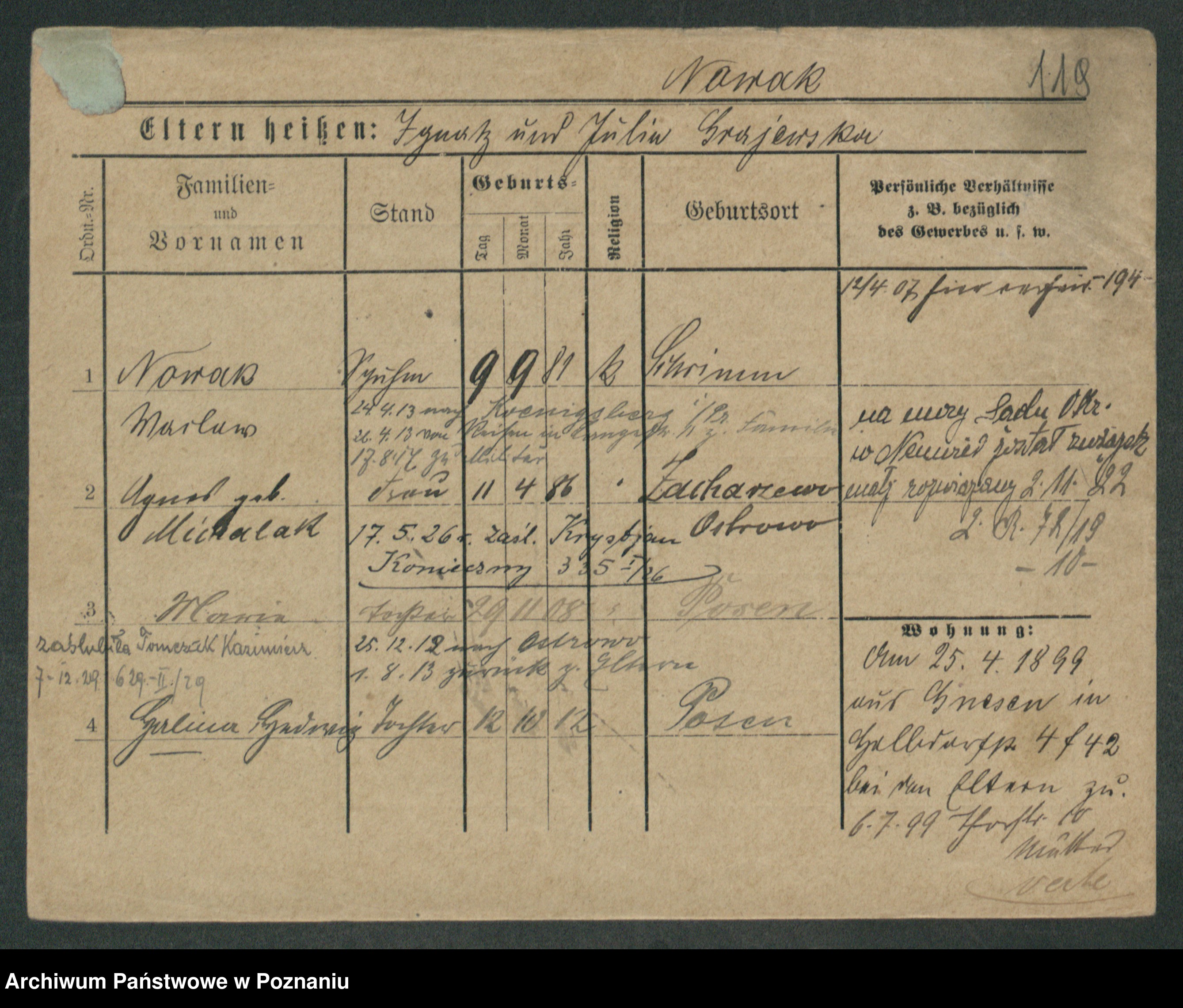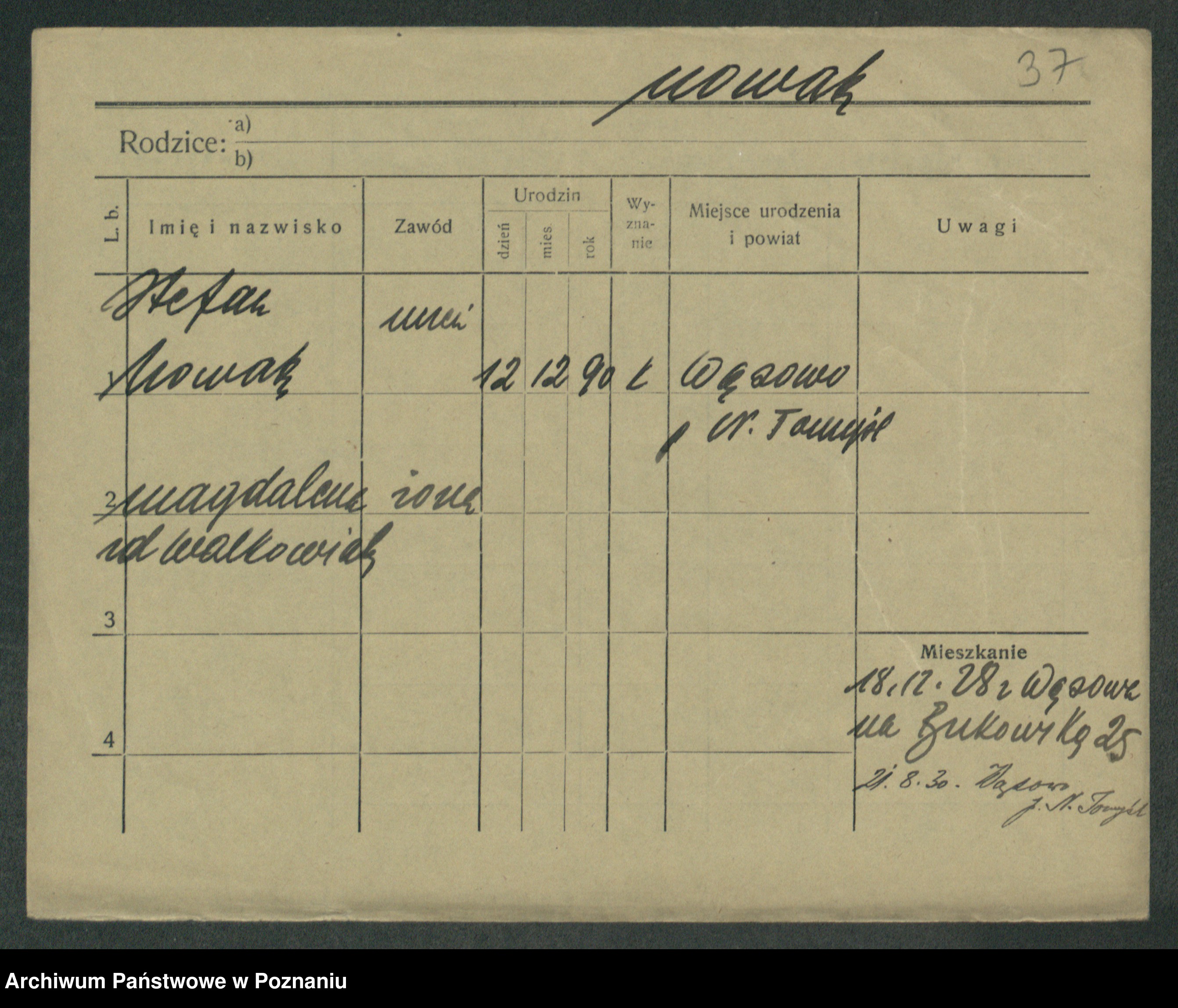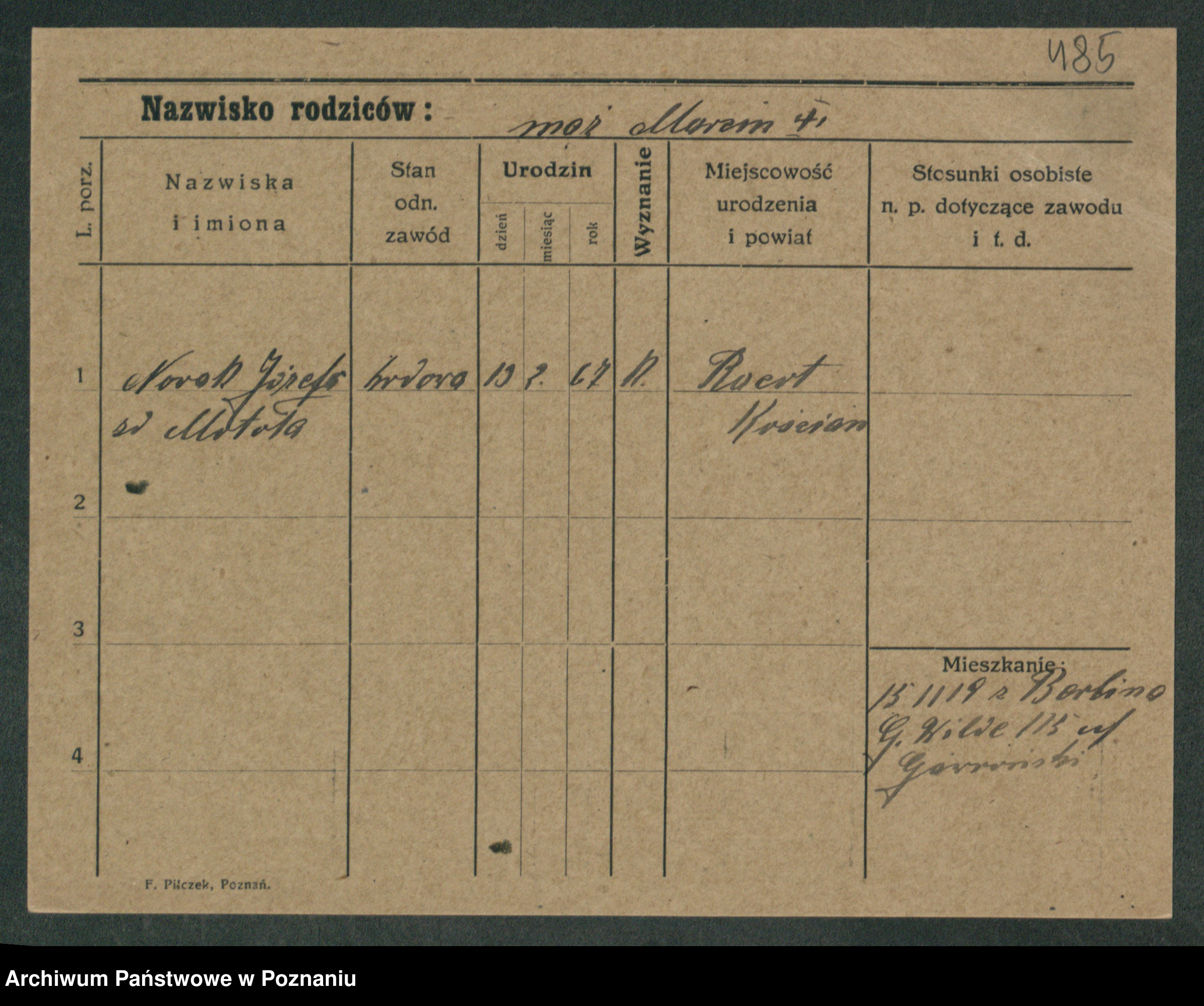 Podgląd karty osobowej dostępny jest po kliknięciu na nazwisko lub ikonkę karty. Można dokonywać powiększenia (ikony na górze) lub przechodzić między kolejnymi skanami (strzałki po bokach).