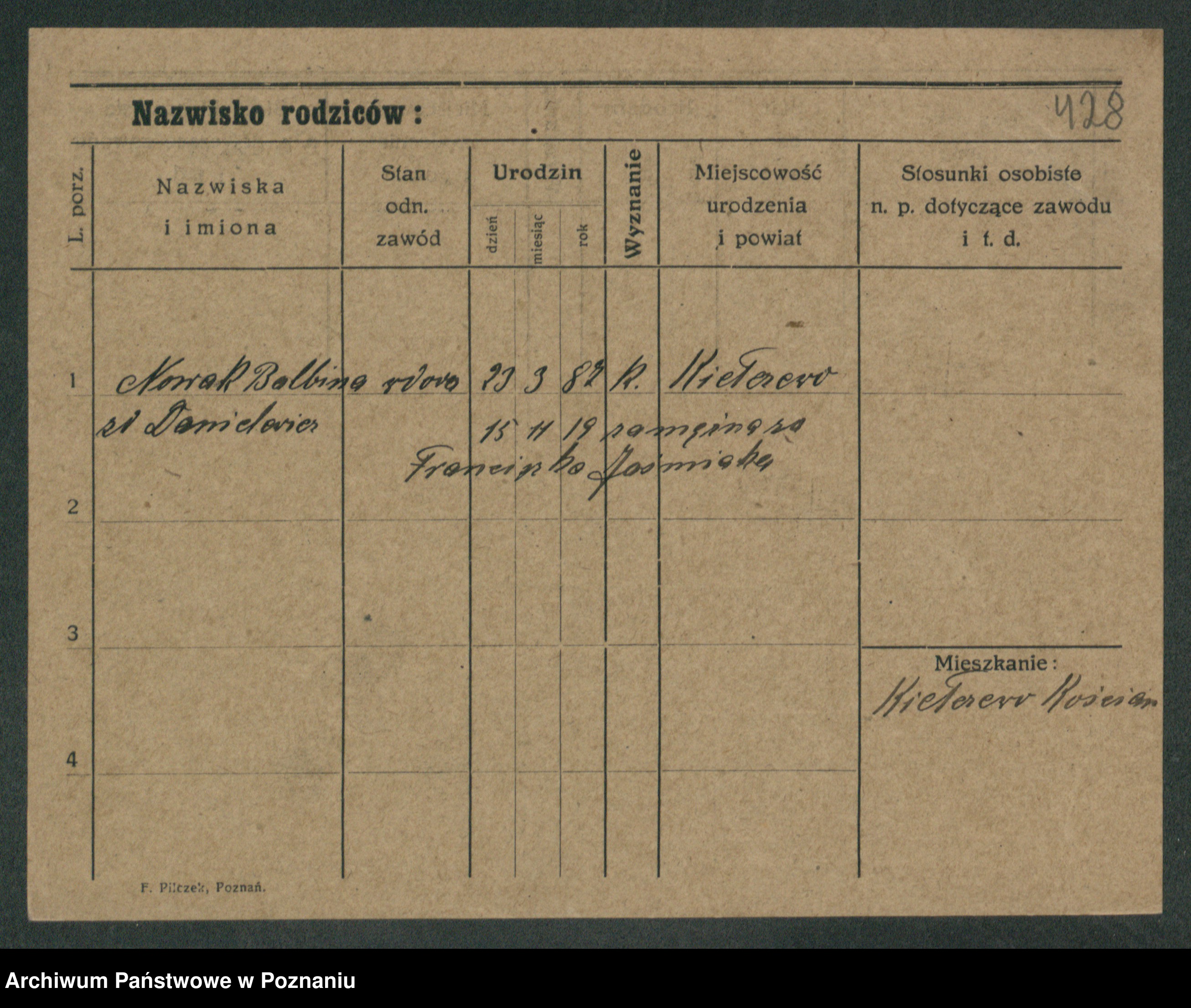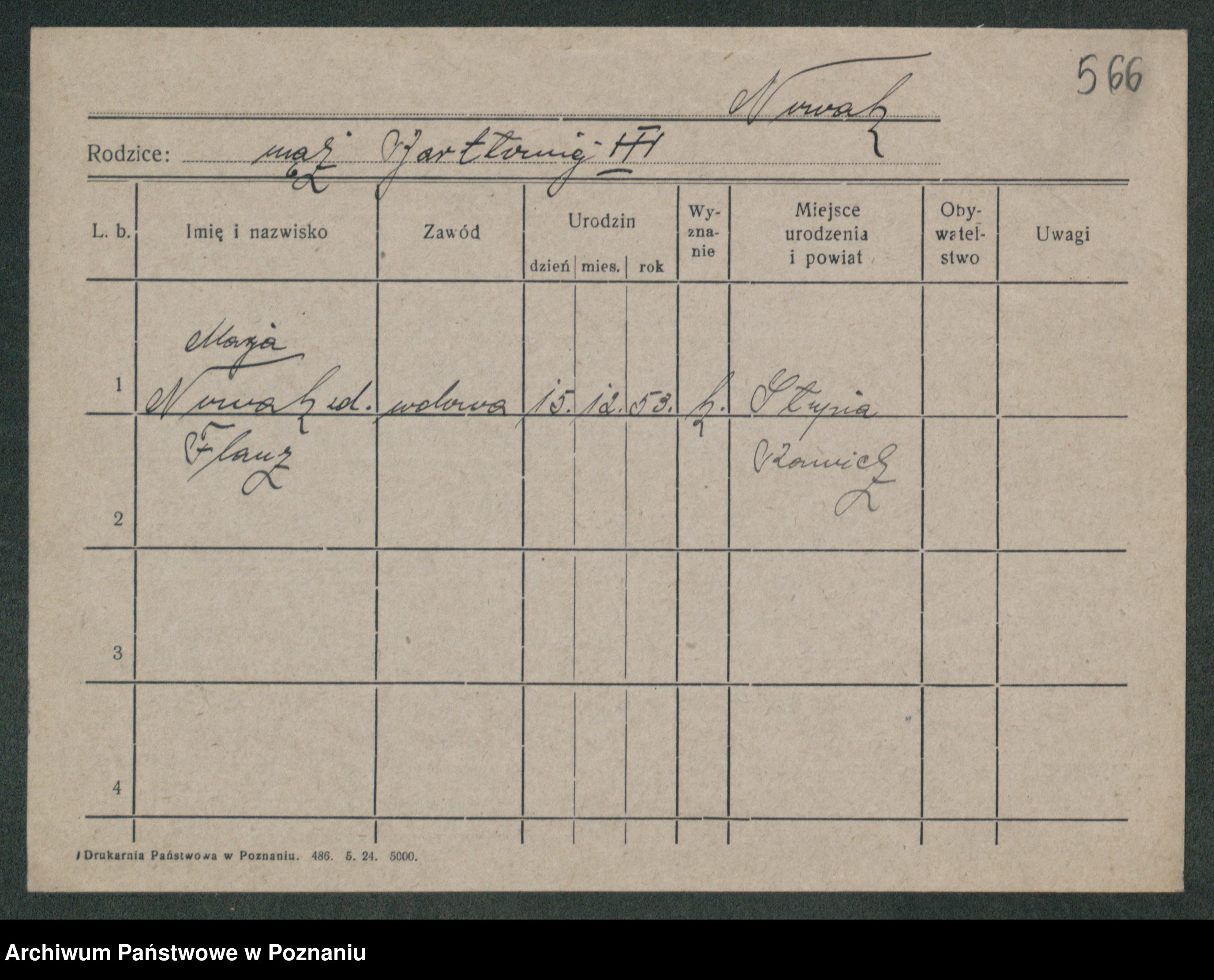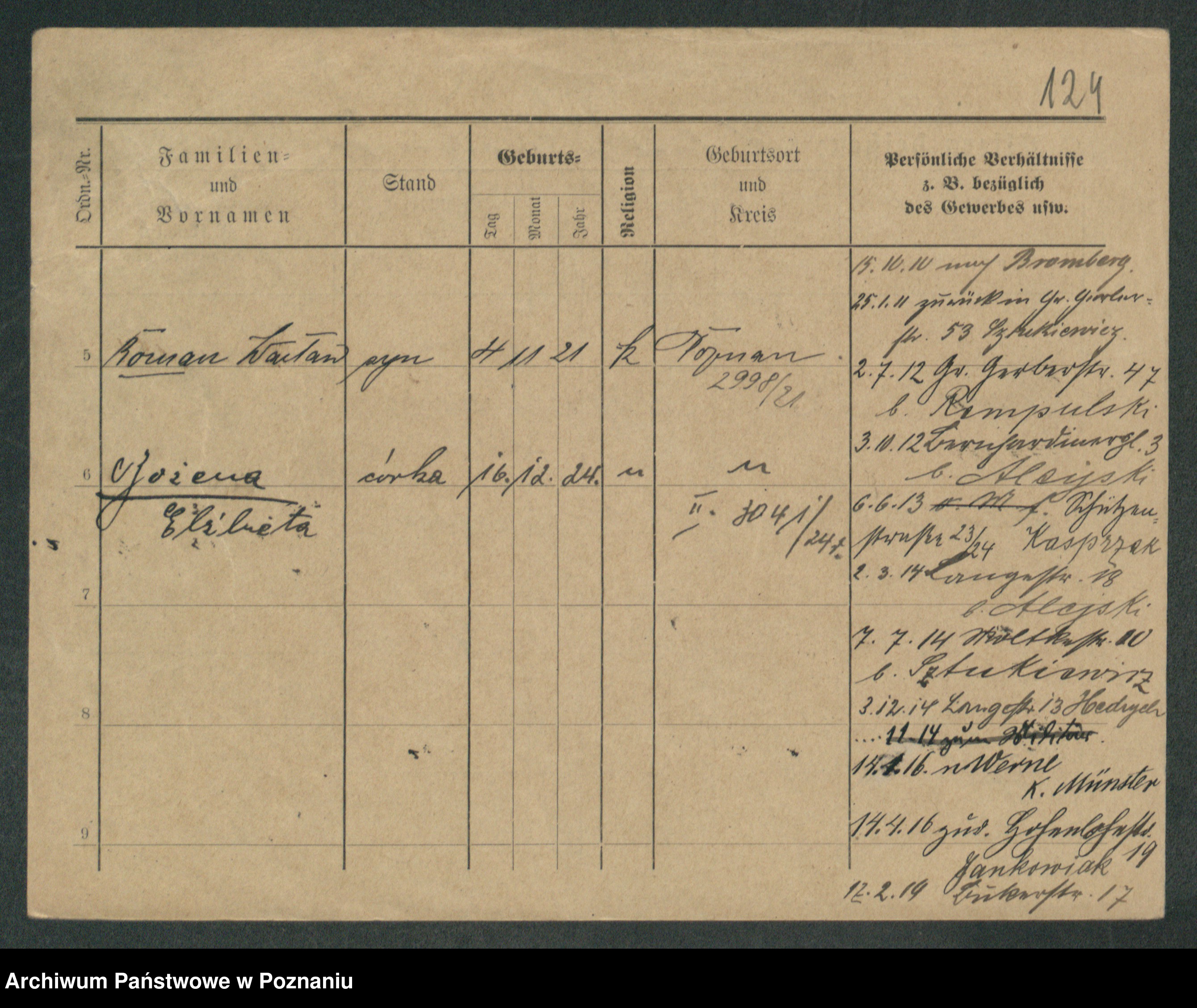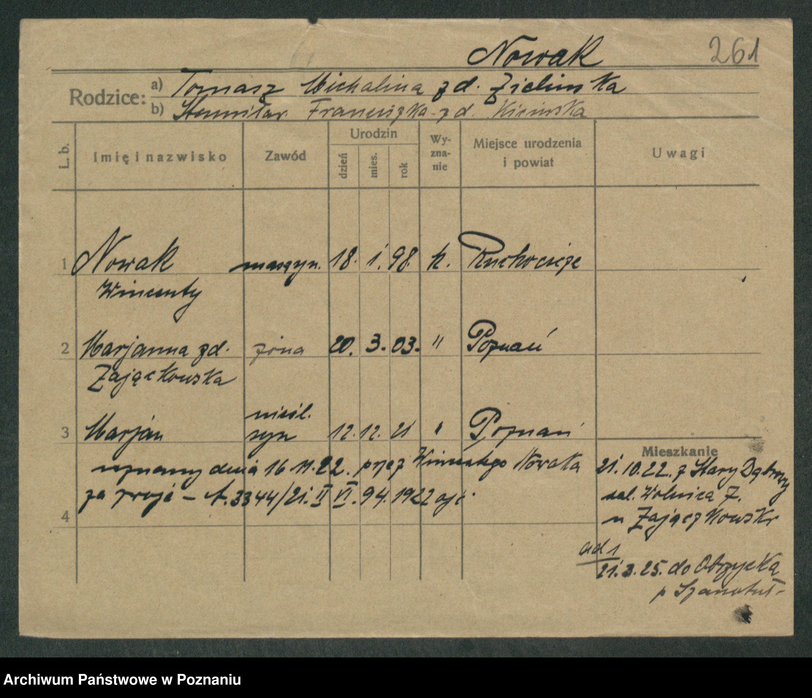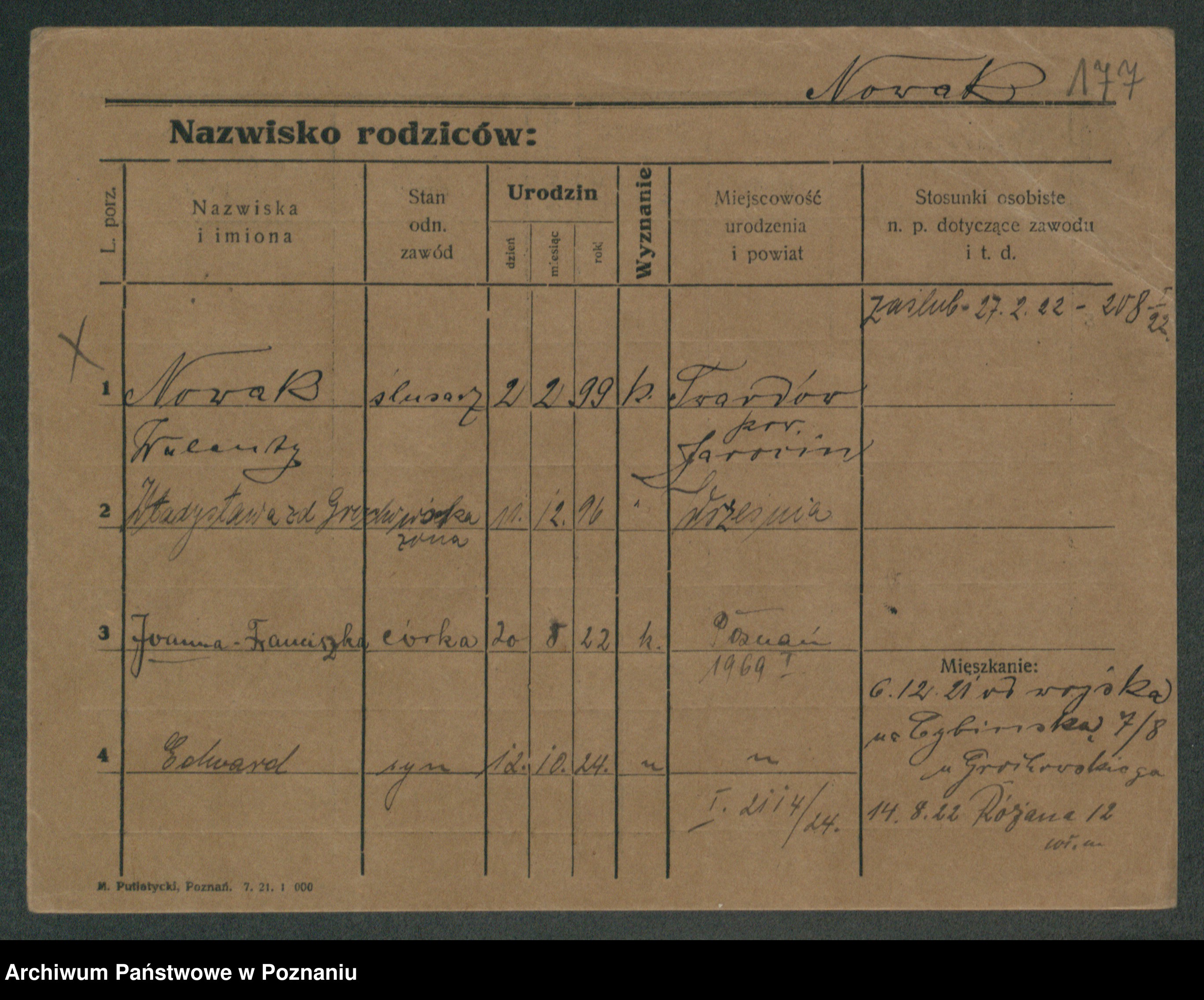 Podgląd karty osobowej dostępny jest po kliknięciu na nazwisko lub ikonkę karty. Można dokonywać powiększenia (ikony na górze) lub przechodzić między kolejnymi skanami (strzałki po bokach).