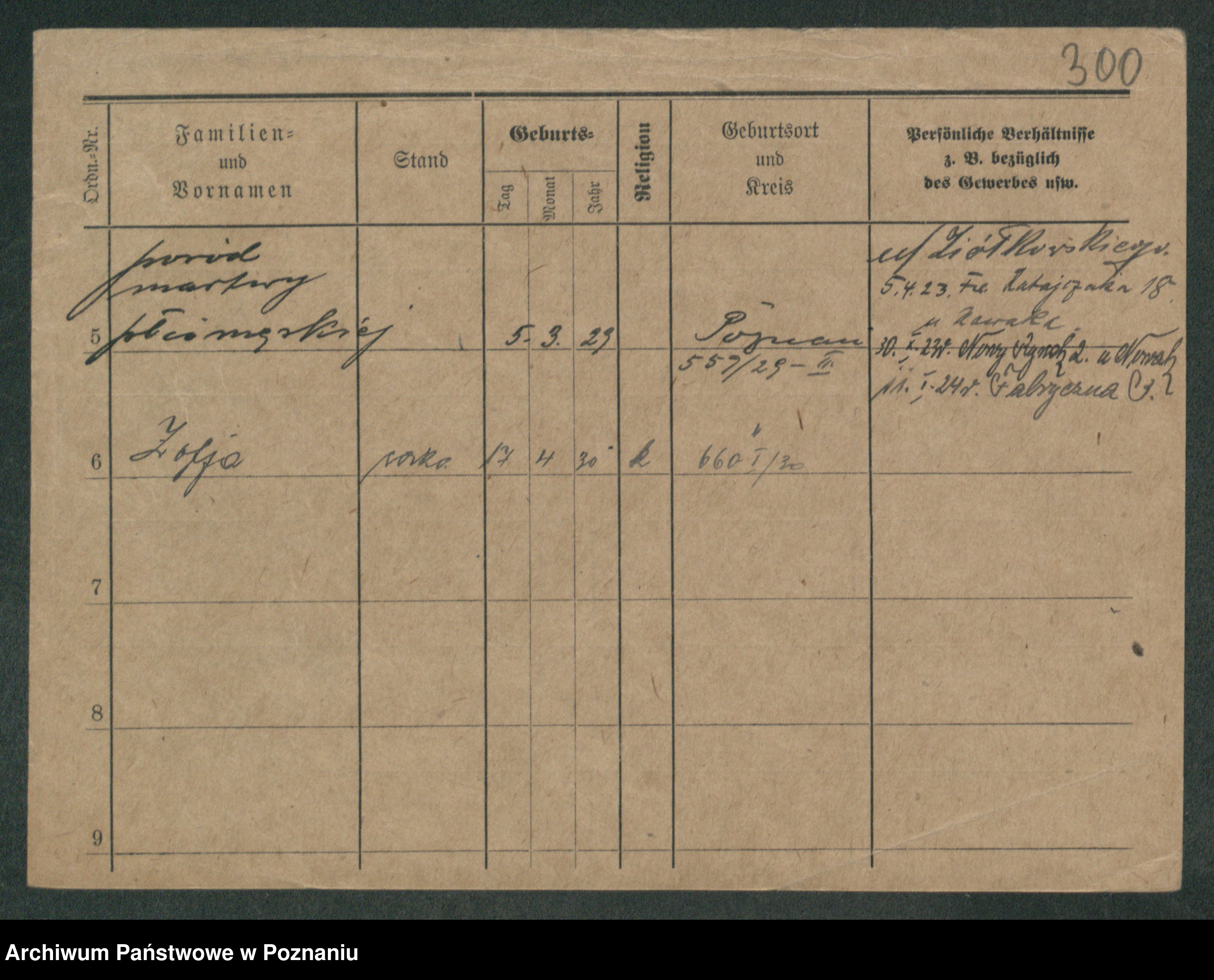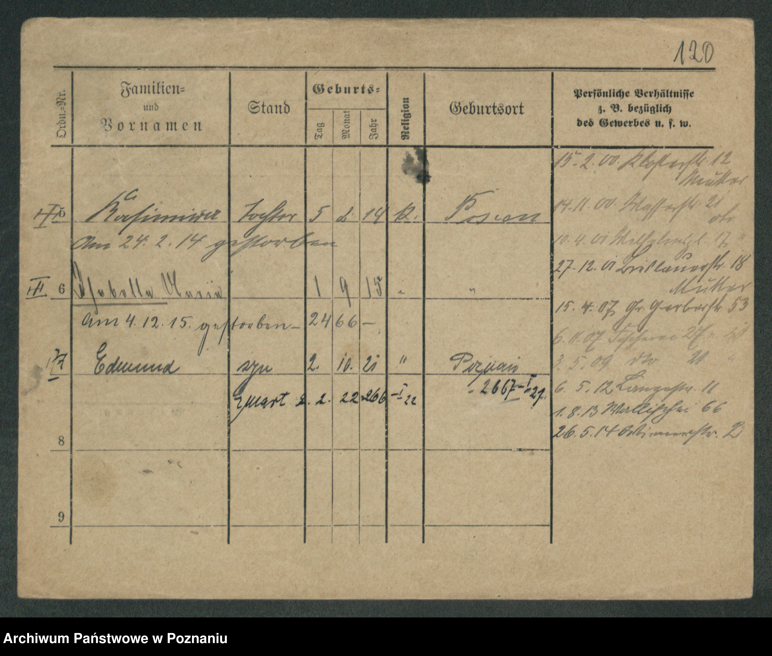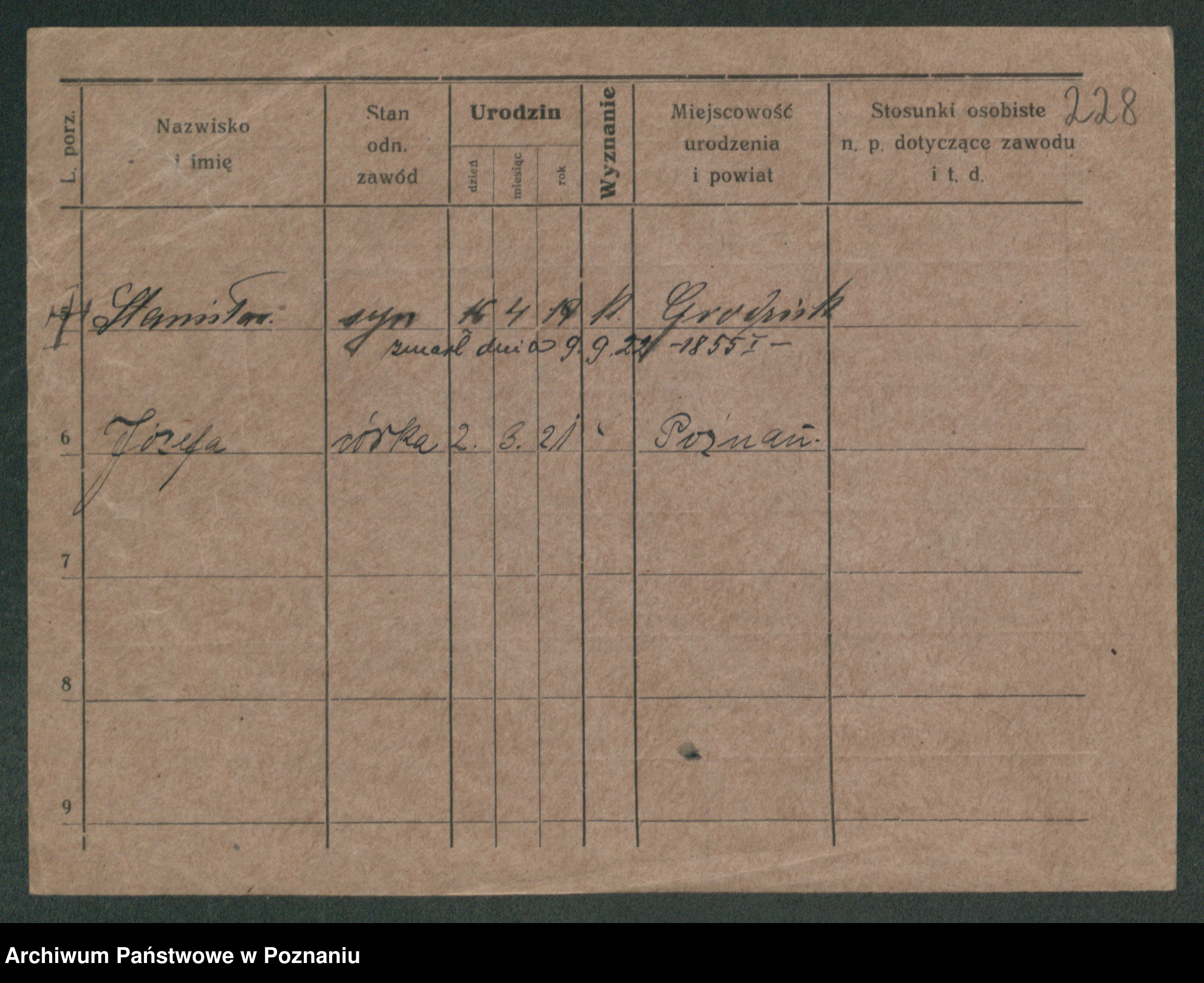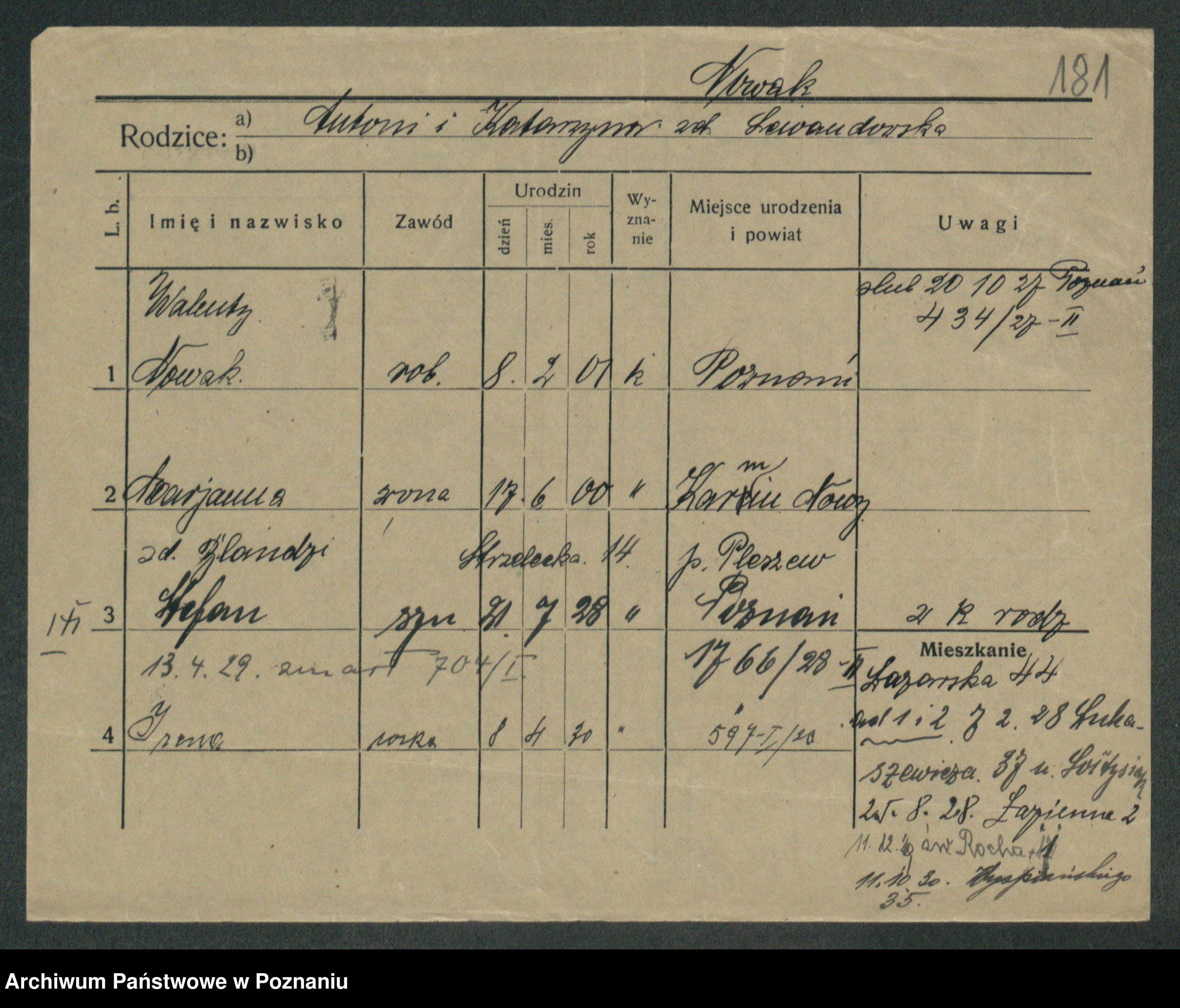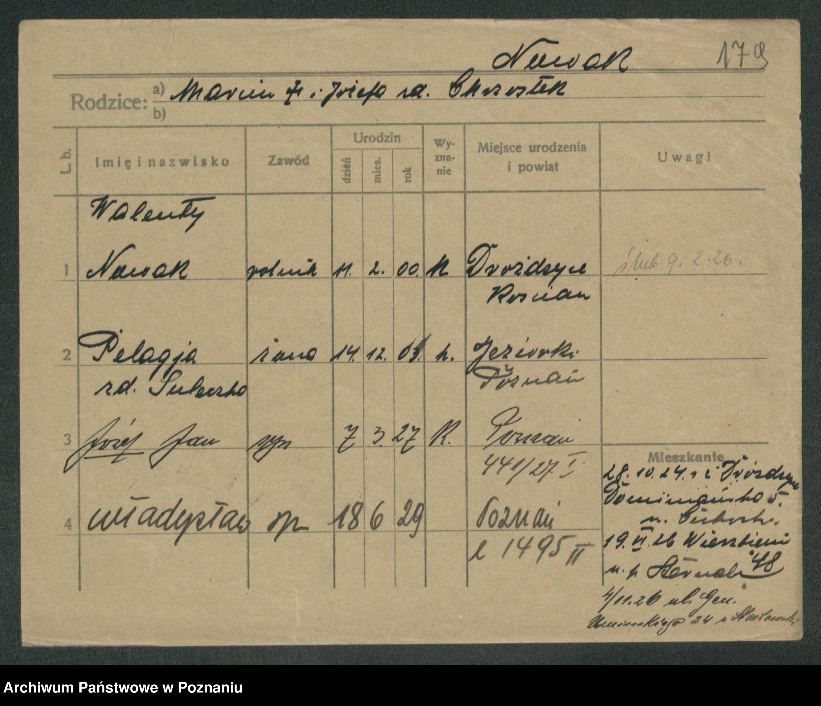 Podgląd karty osobowej dostępny jest po kliknięciu na nazwisko lub ikonkę karty. Można dokonywać powiększenia (ikony na górze) lub przechodzić między kolejnymi skanami (strzałki po bokach).