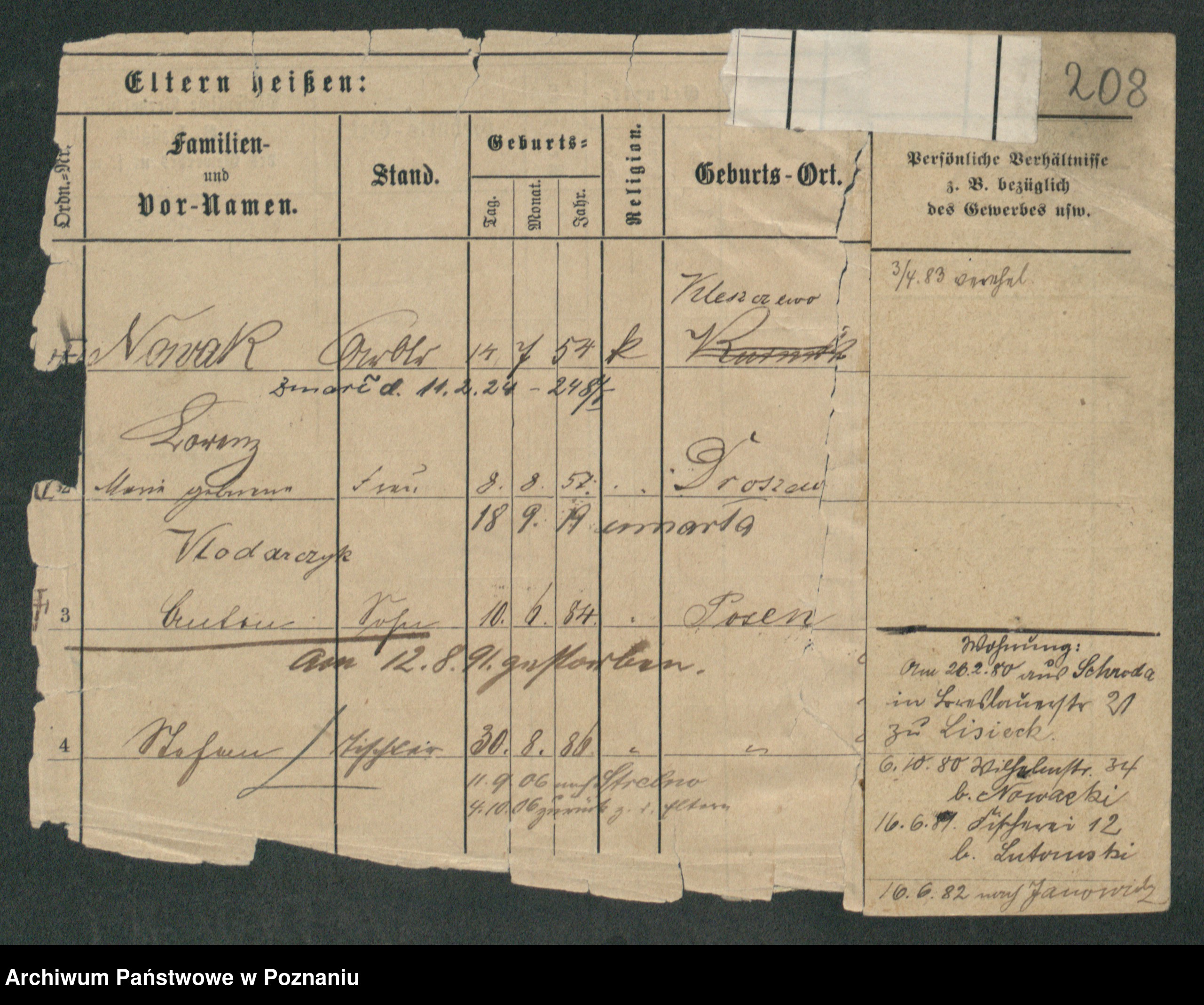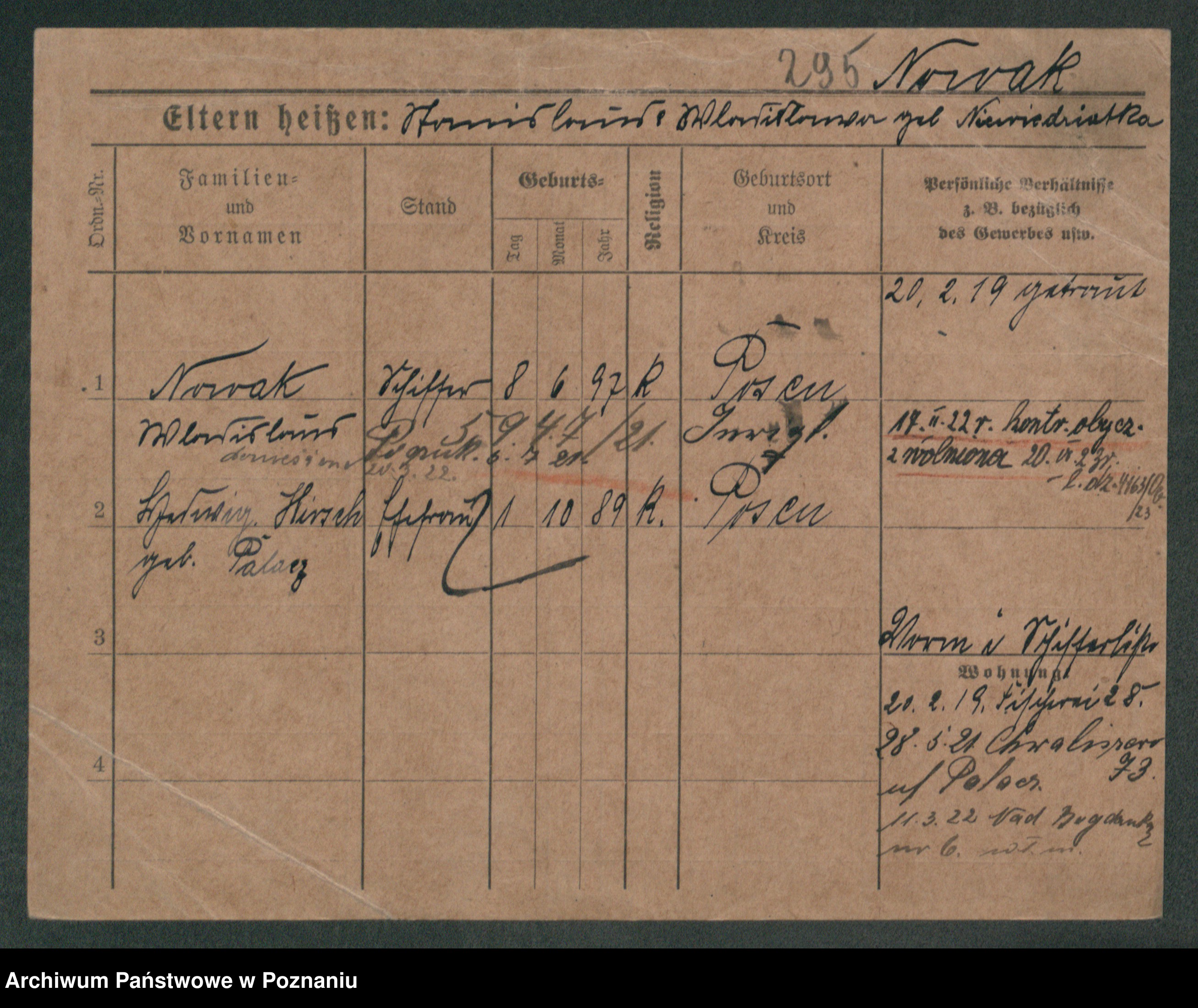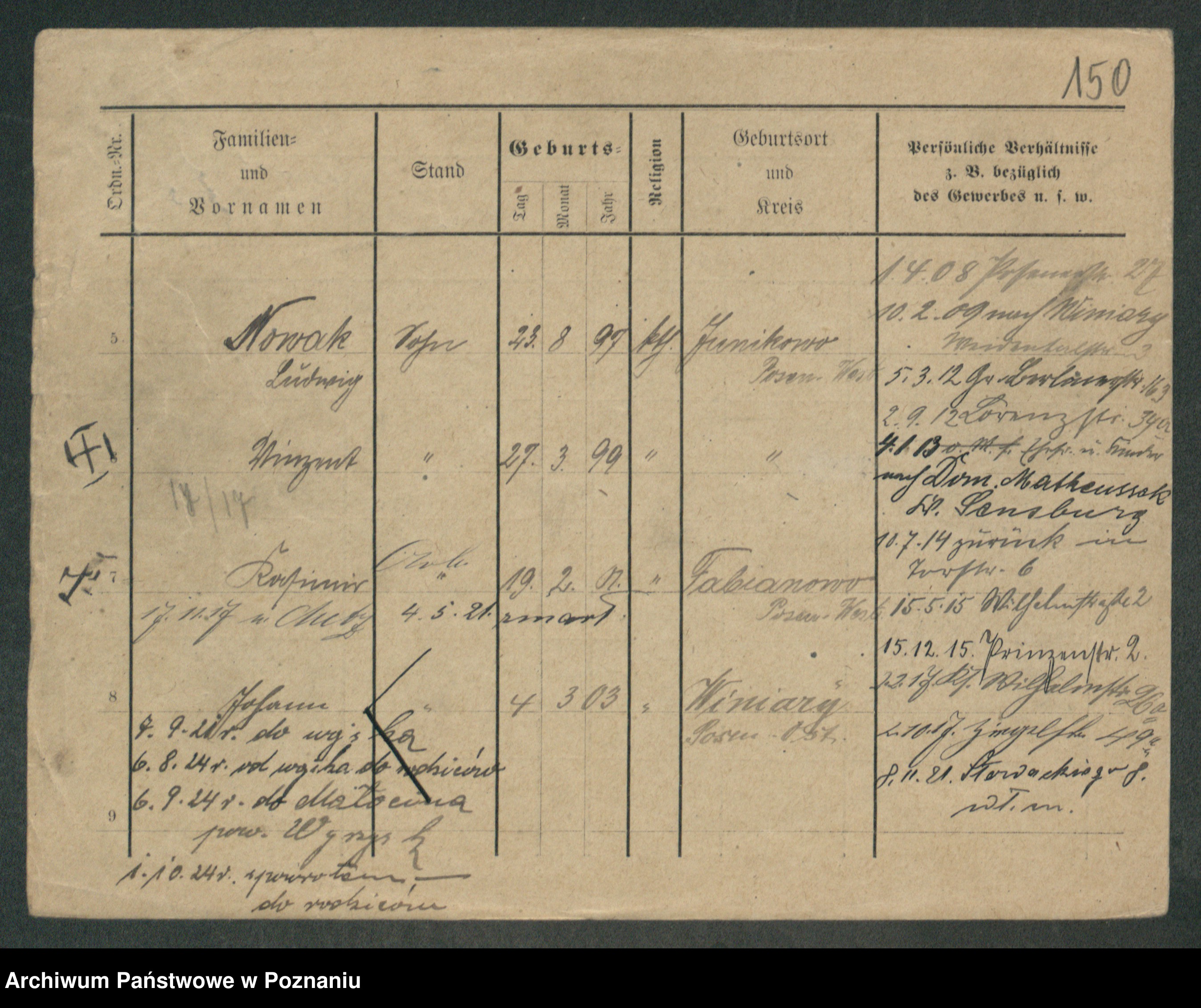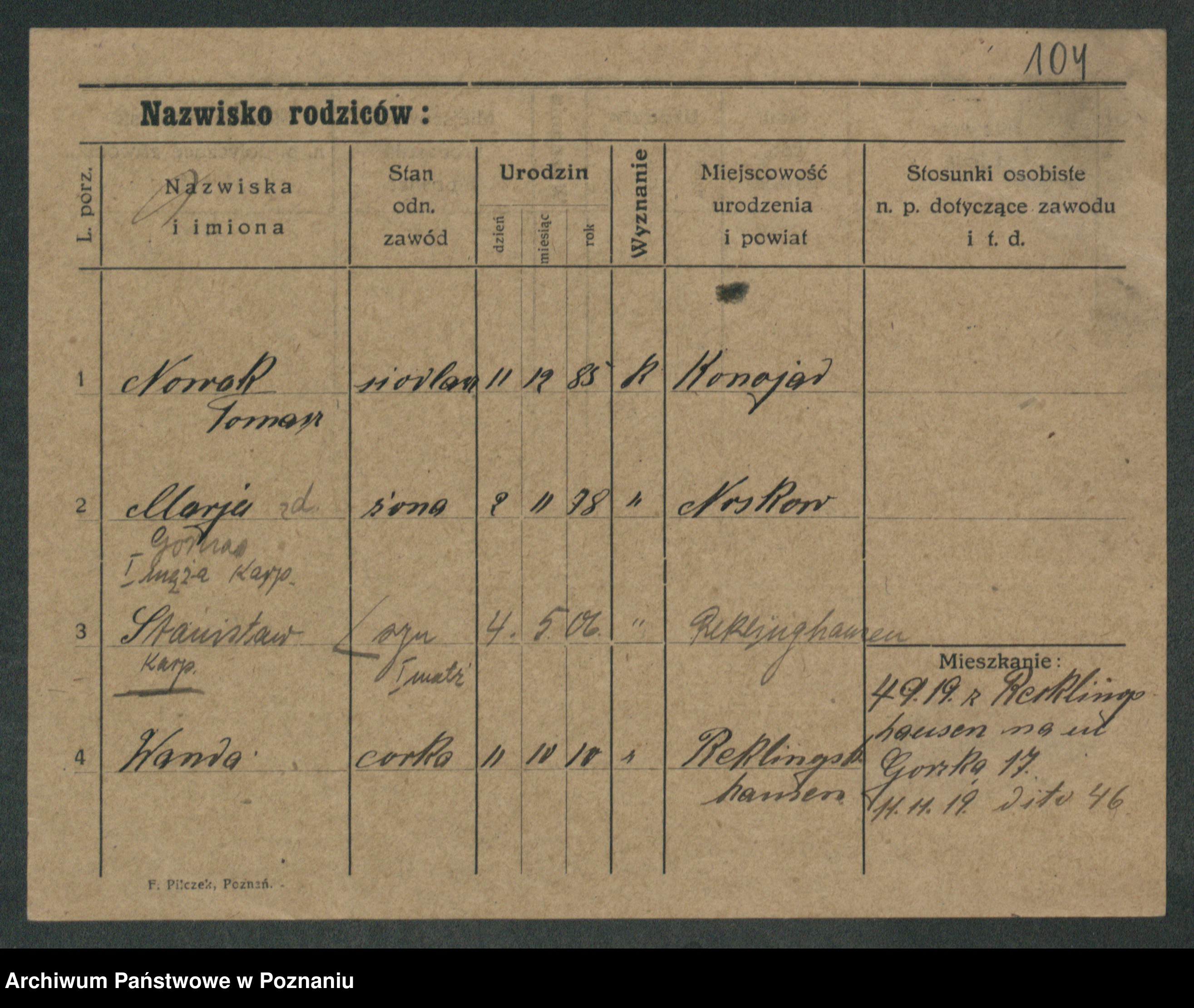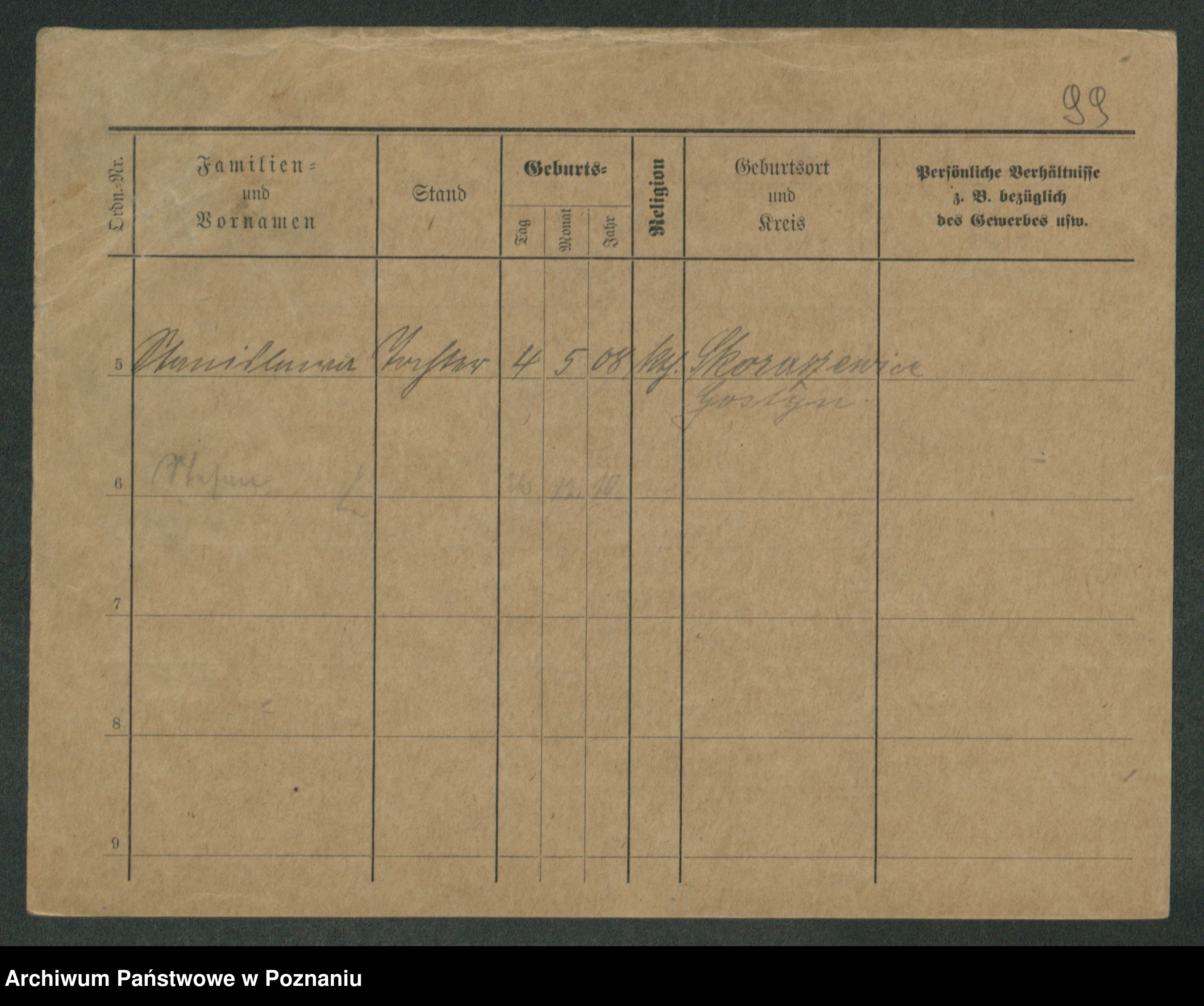 Podgląd karty osobowej dostępny jest po kliknięciu na nazwisko lub ikonkę karty. Można dokonywać powiększenia (ikony na górze) lub przechodzić między kolejnymi skanami (strzałki po bokach).