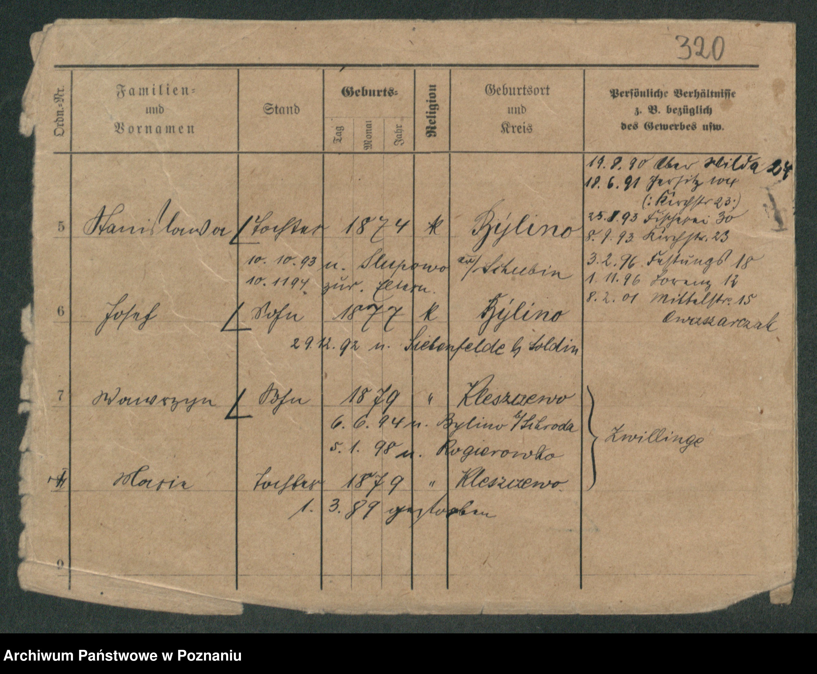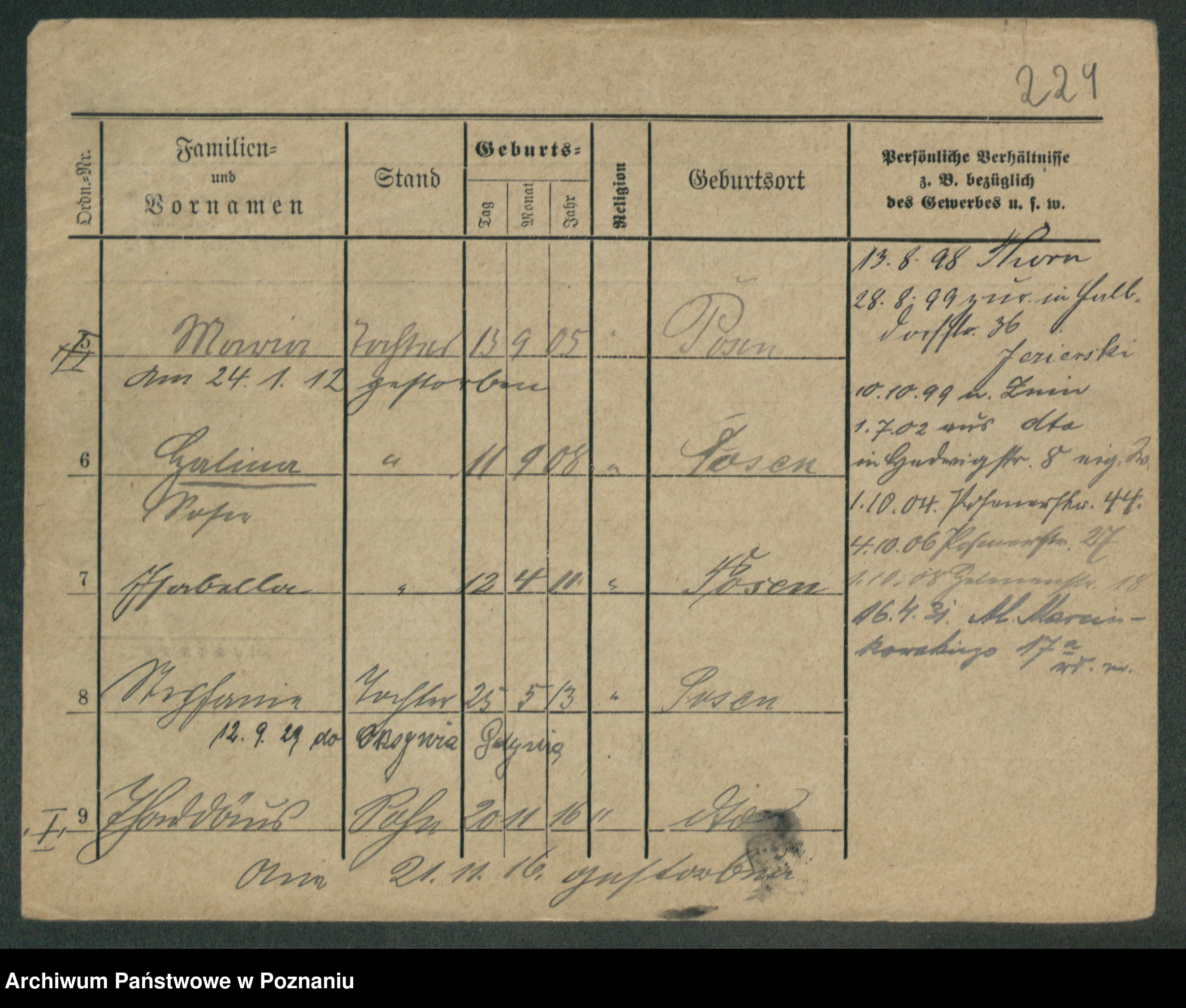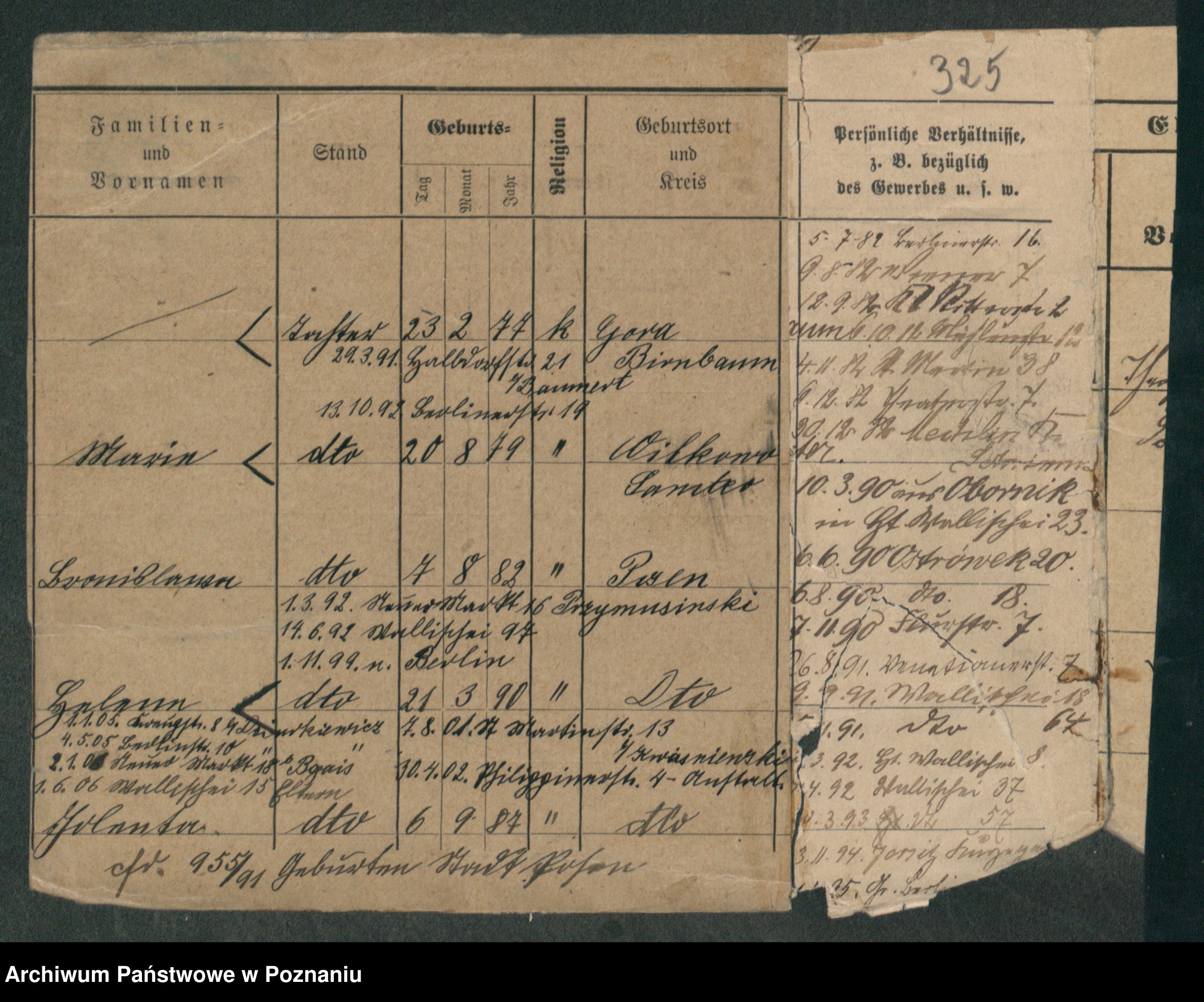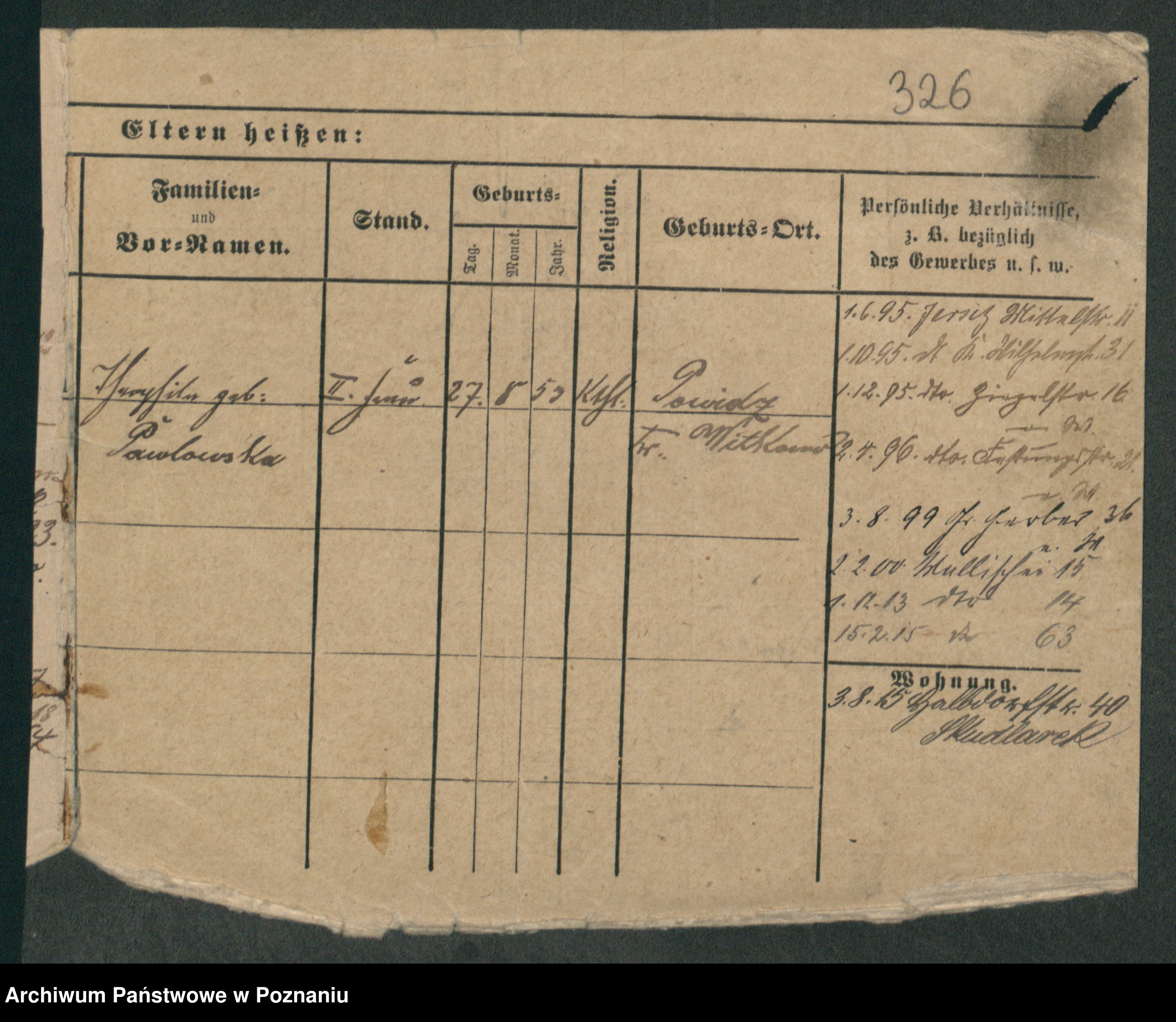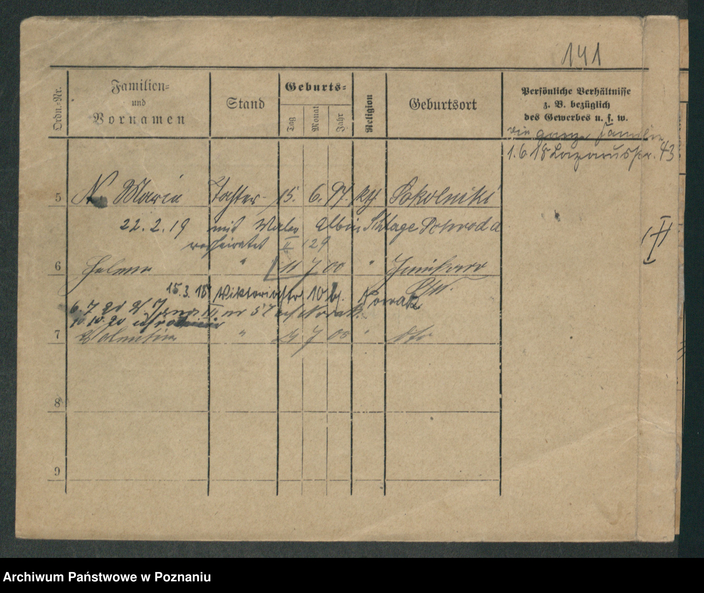 Podgląd karty osobowej dostępny jest po kliknięciu na nazwisko lub ikonkę karty. Można dokonywać powiększenia (ikony na górze) lub przechodzić między kolejnymi skanami (strzałki po bokach).