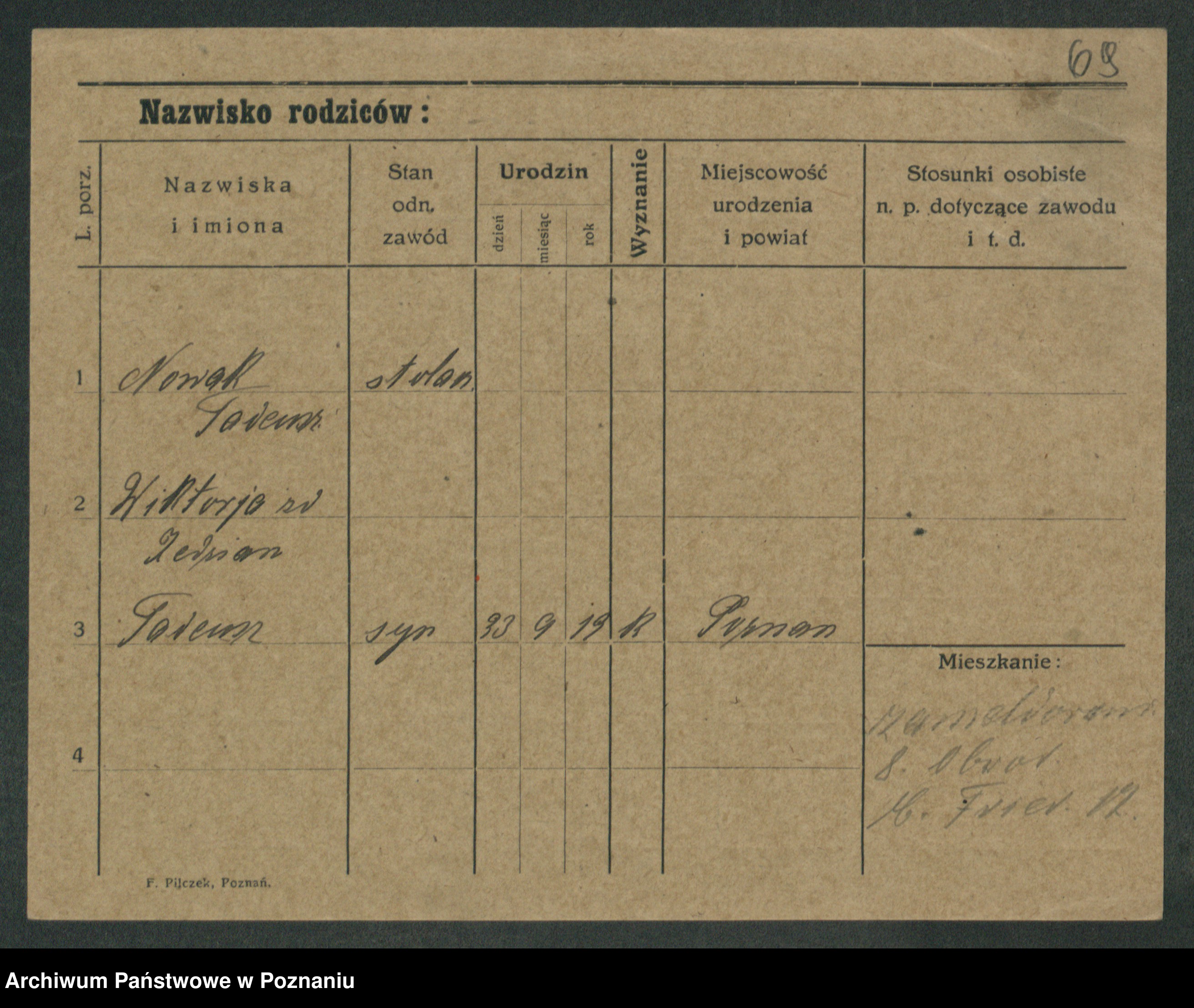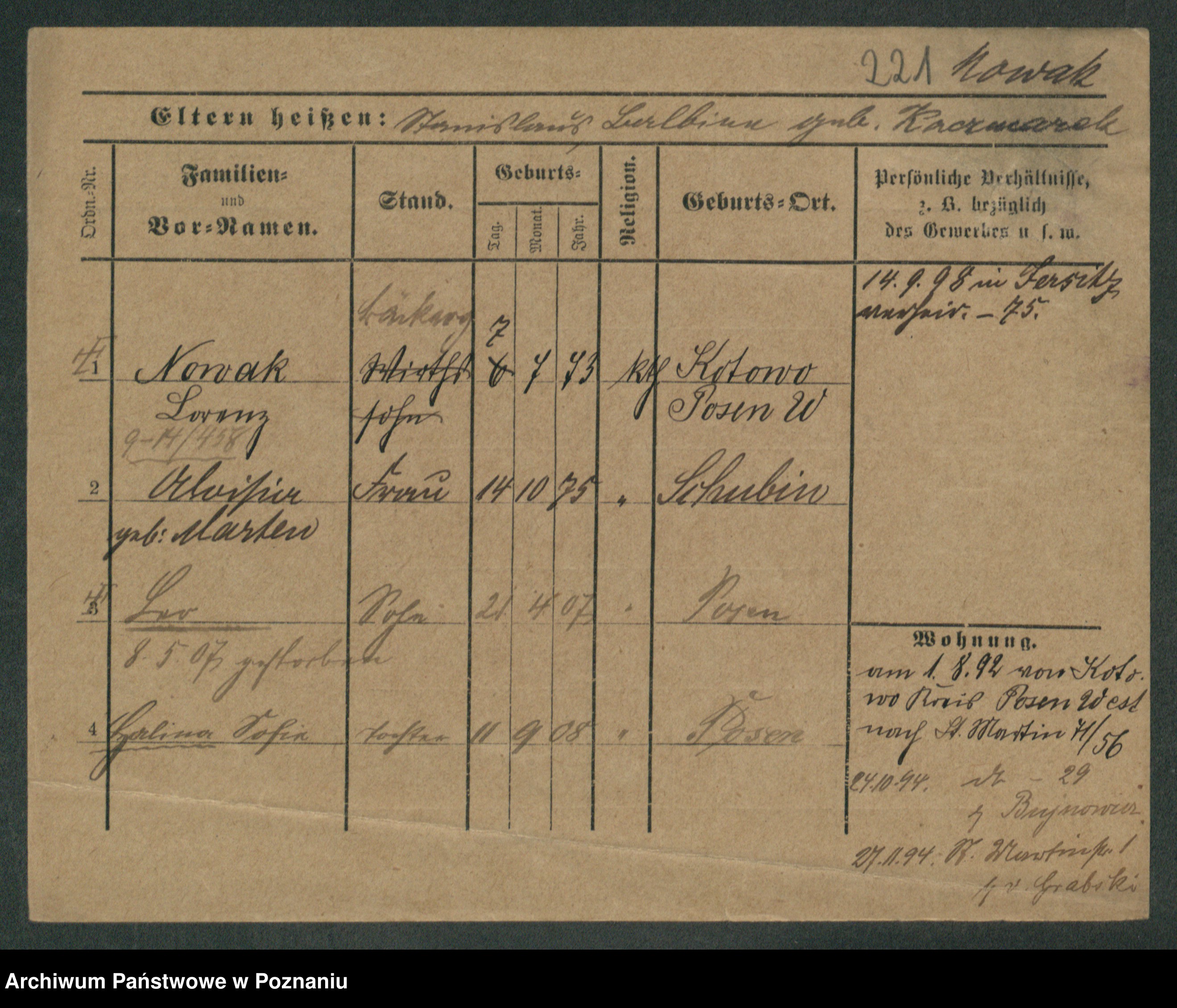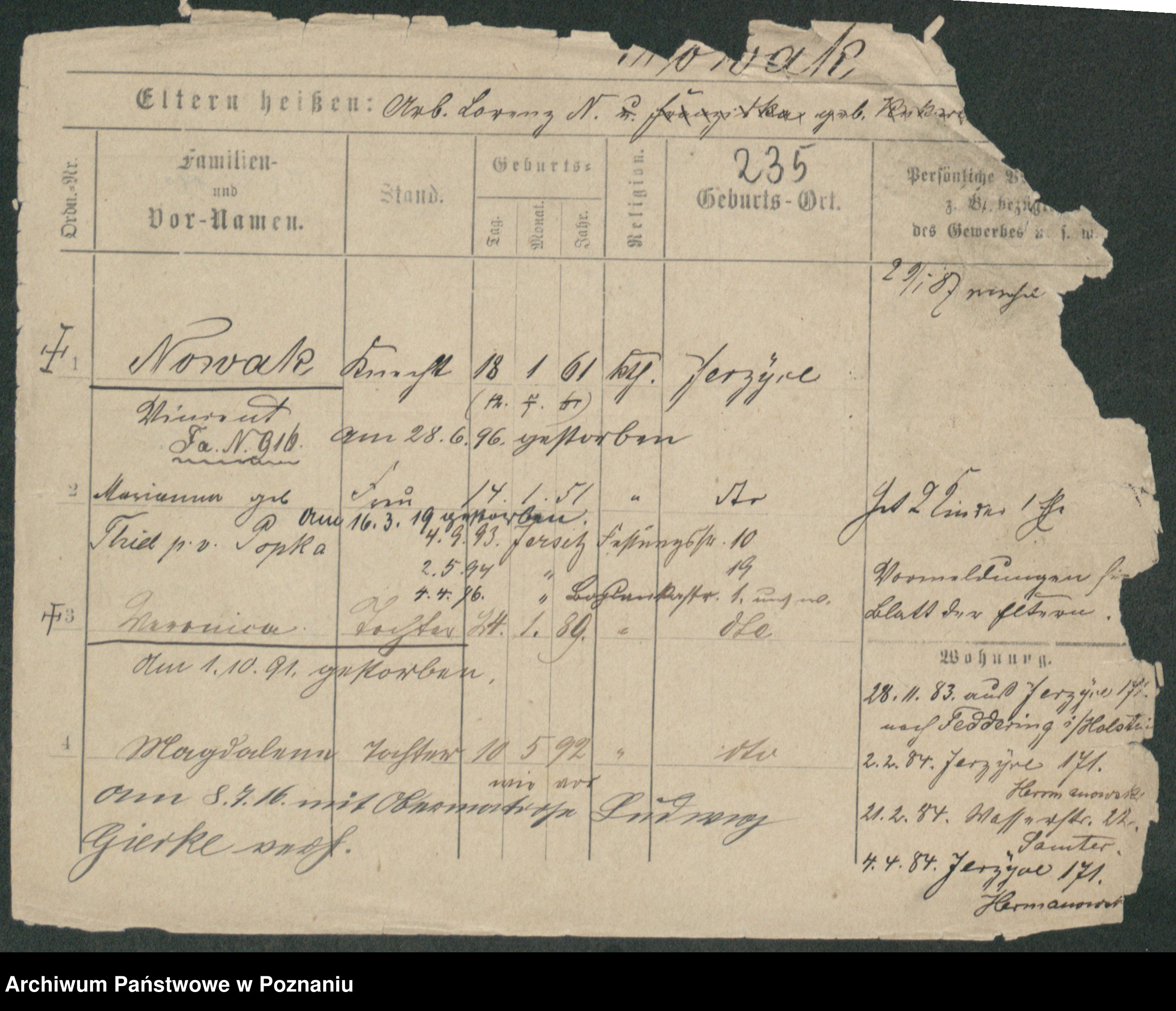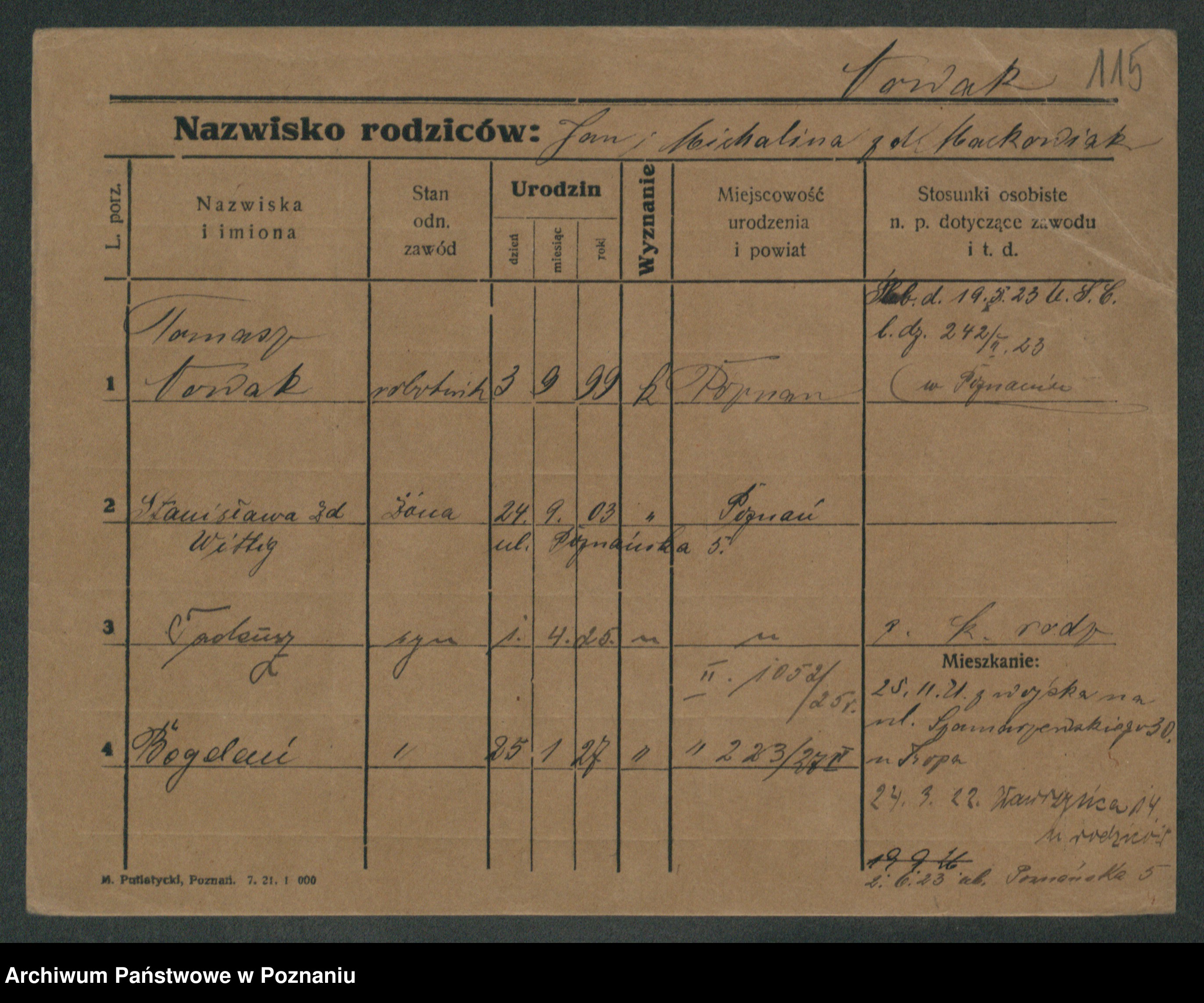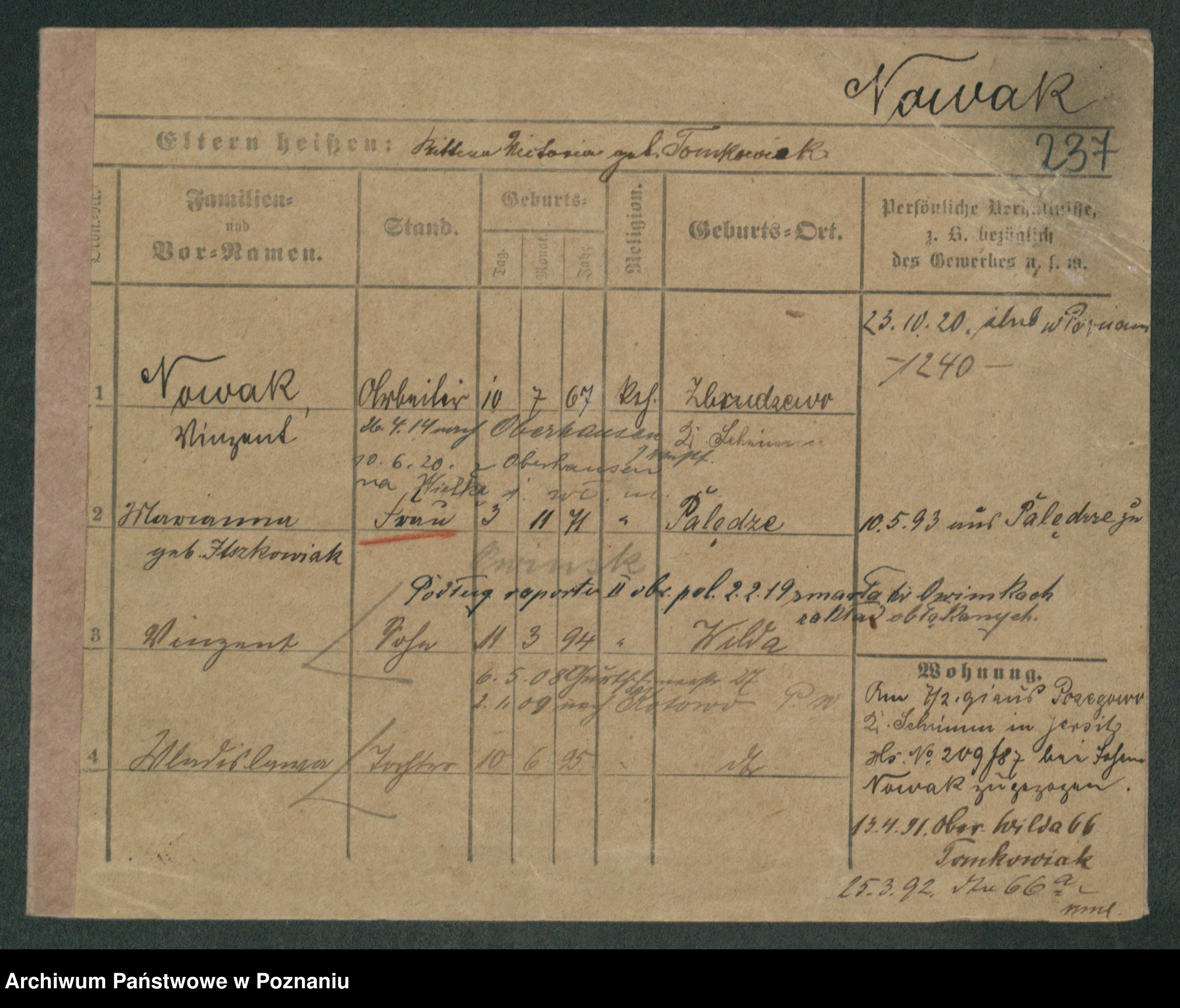 Podgląd karty osobowej dostępny jest po kliknięciu na nazwisko lub ikonkę karty. Można dokonywać powiększenia (ikony na górze) lub przechodzić między kolejnymi skanami (strzałki po bokach).