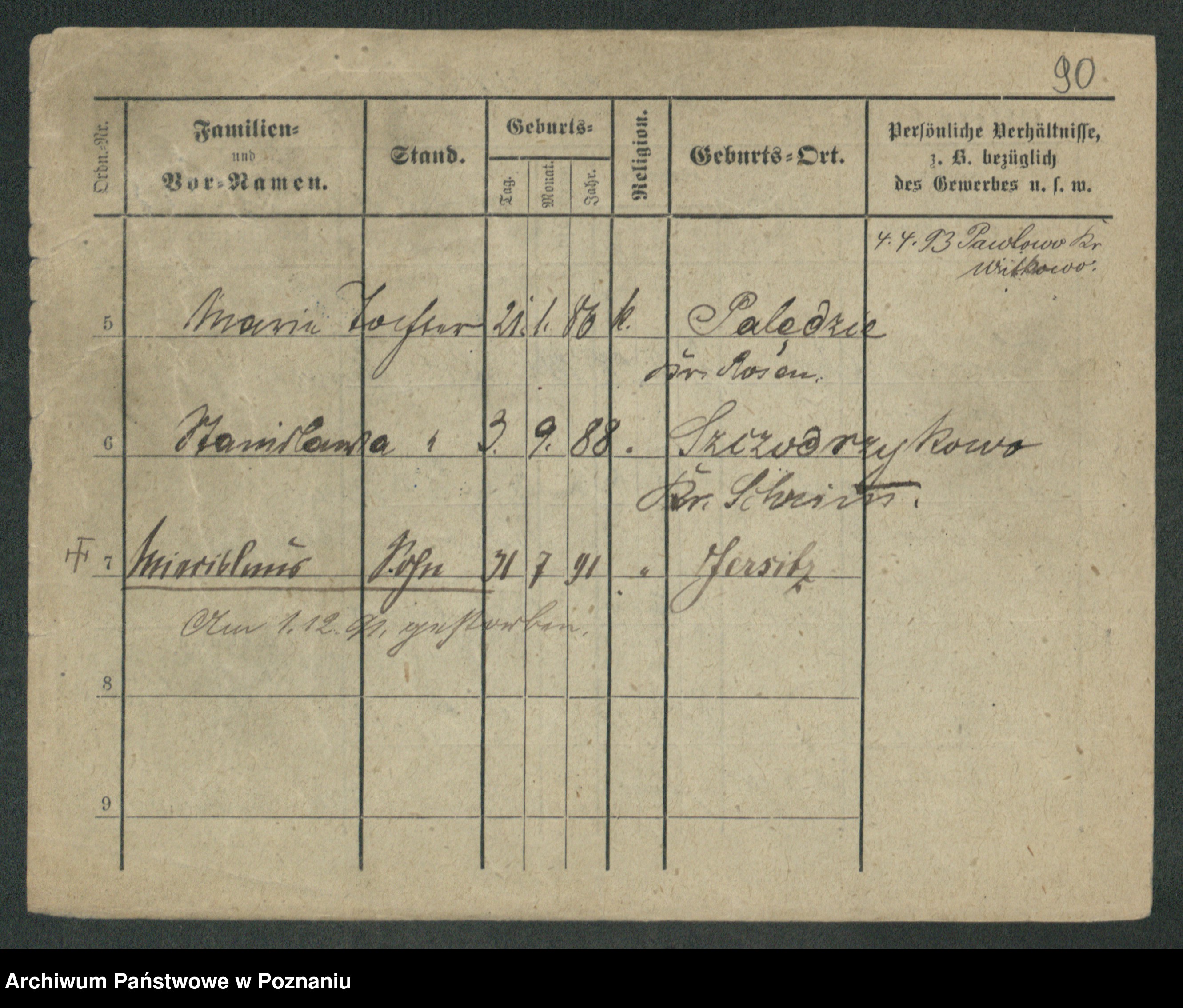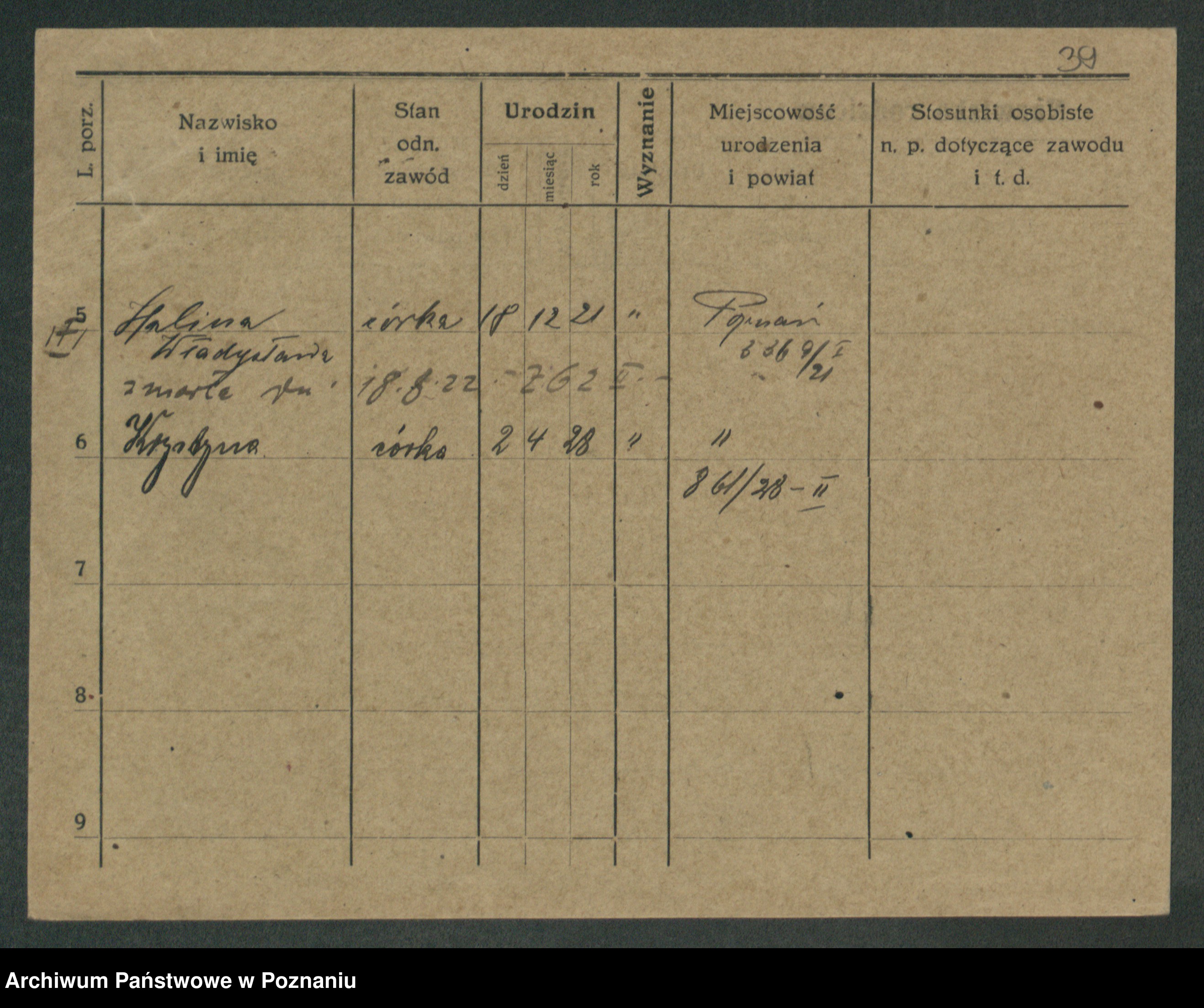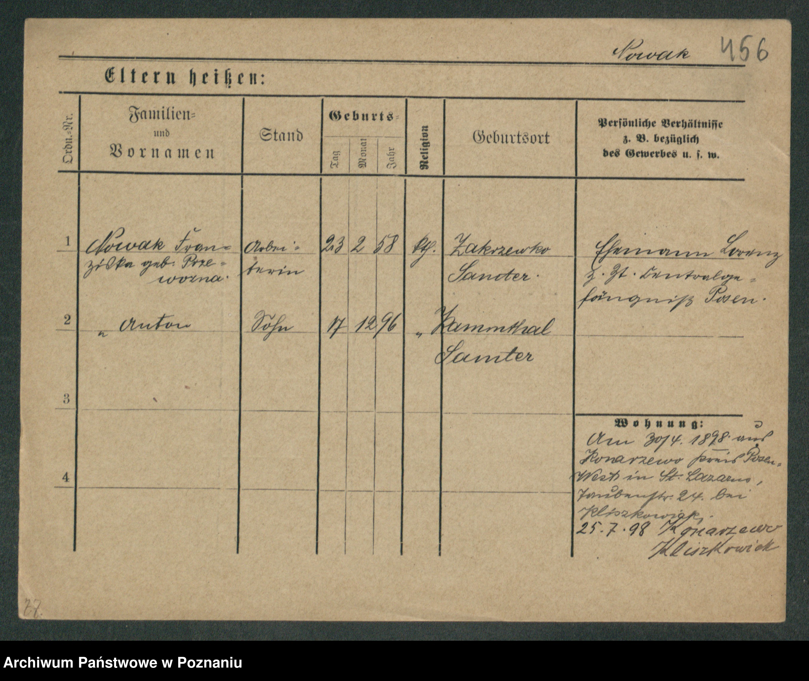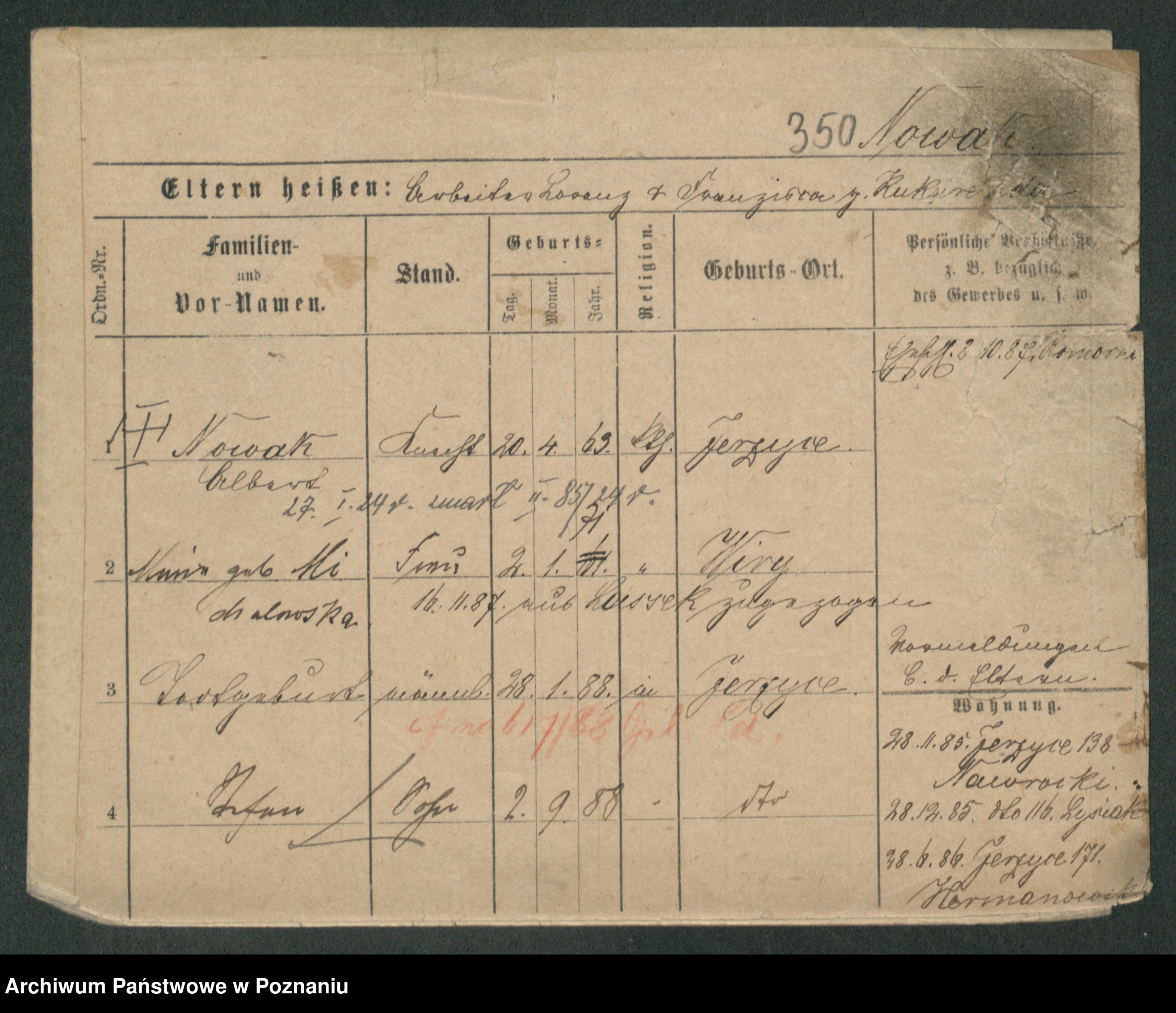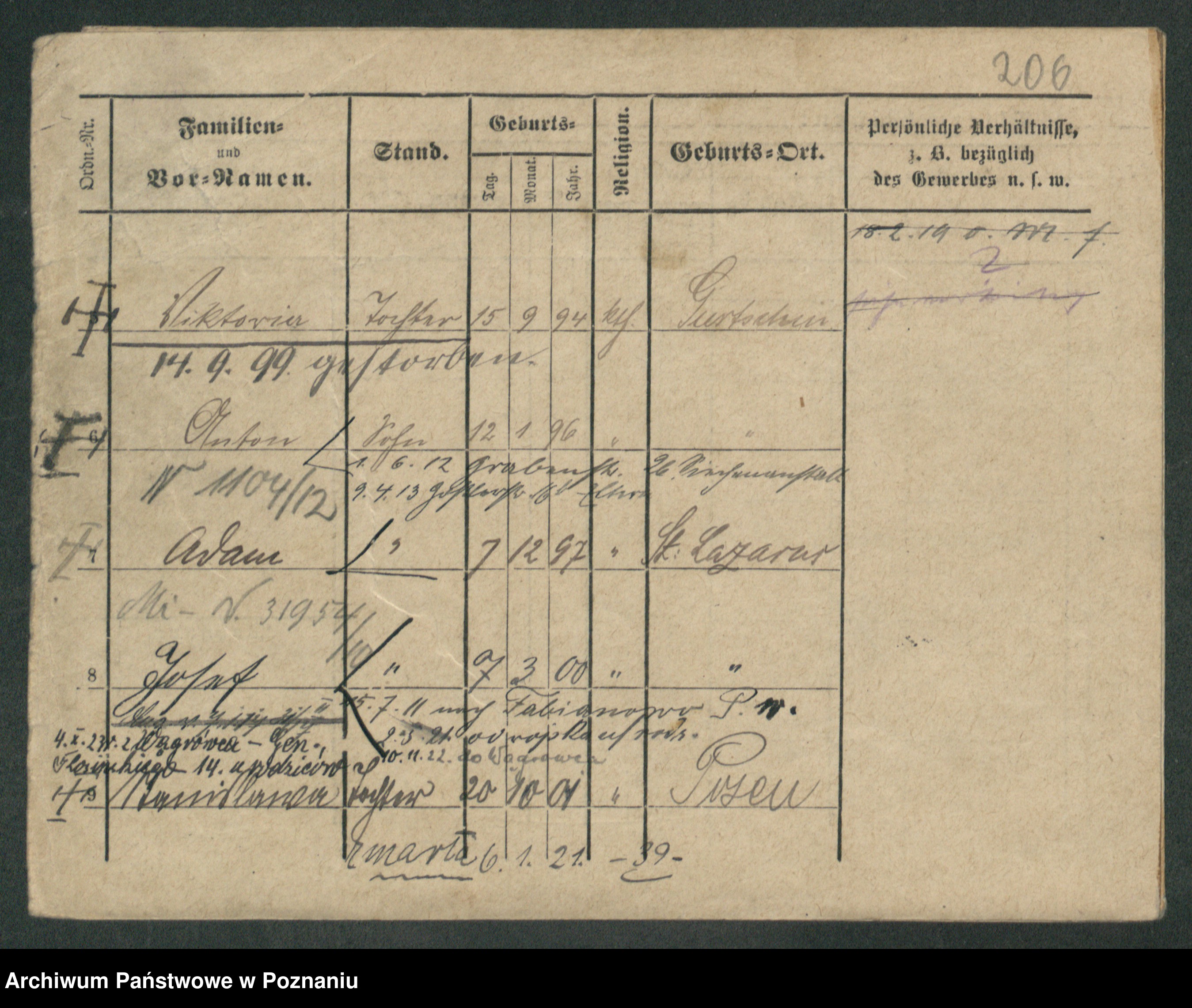 Podgląd karty osobowej dostępny jest po kliknięciu na nazwisko lub ikonkę karty. Można dokonywać powiększenia (ikony na górze) lub przechodzić między kolejnymi skanami (strzałki po bokach).