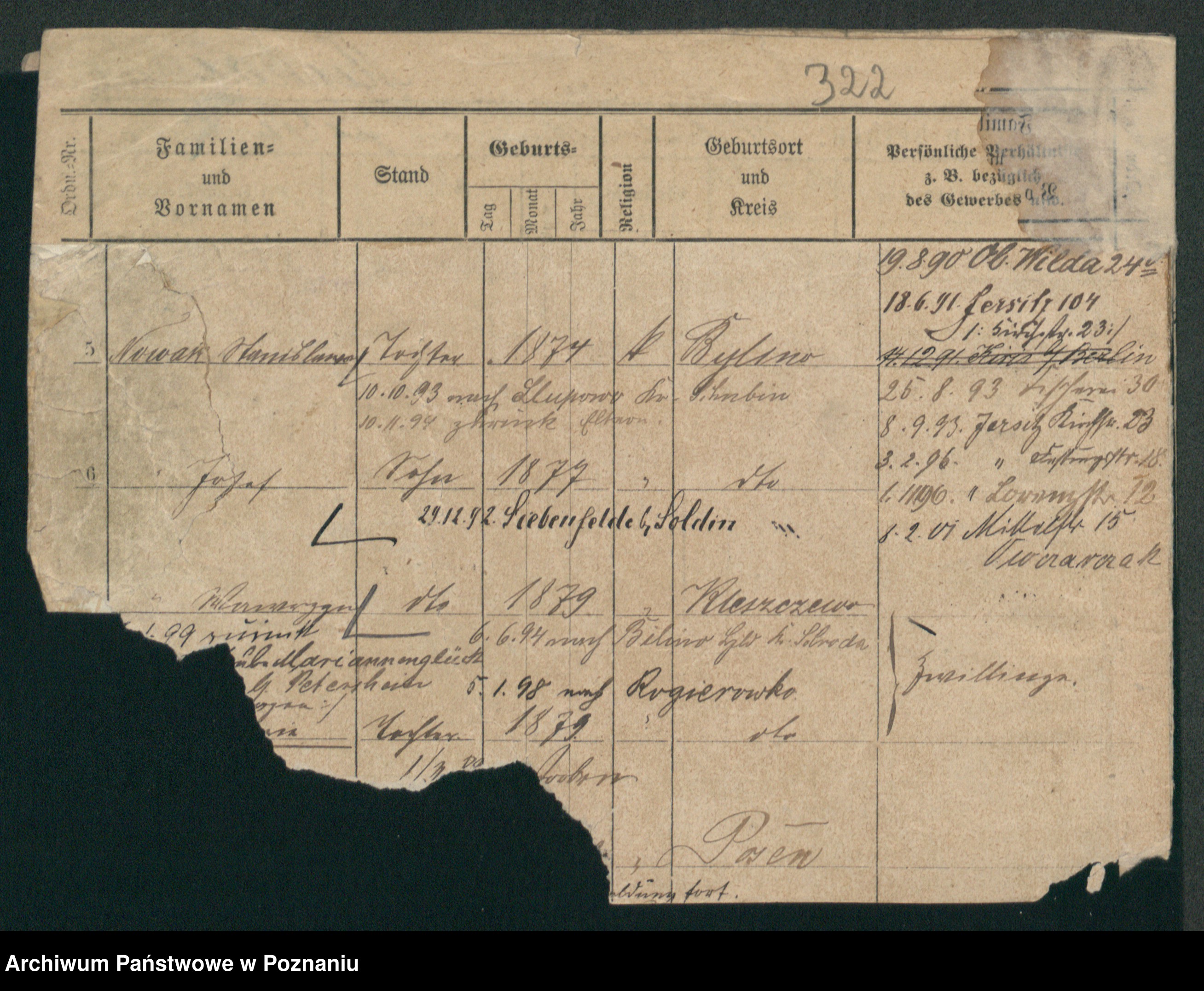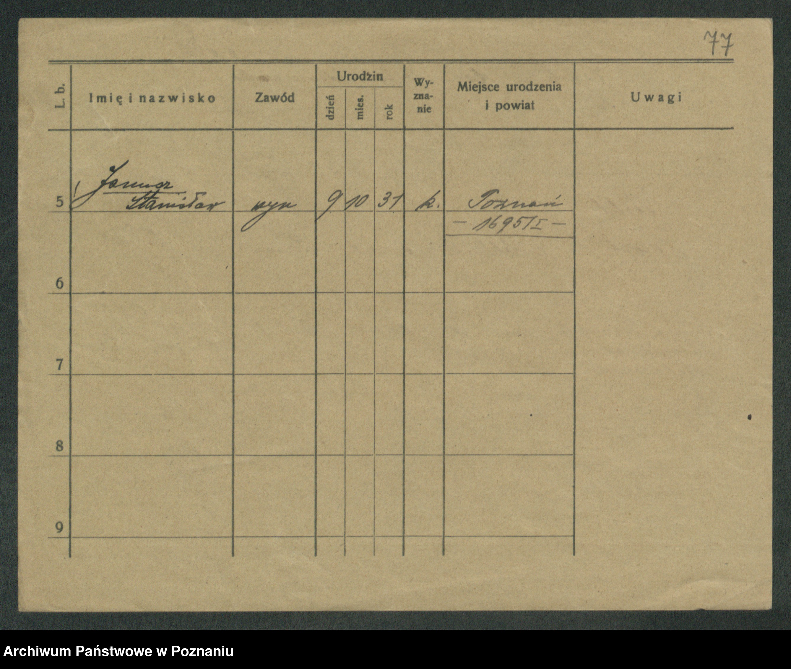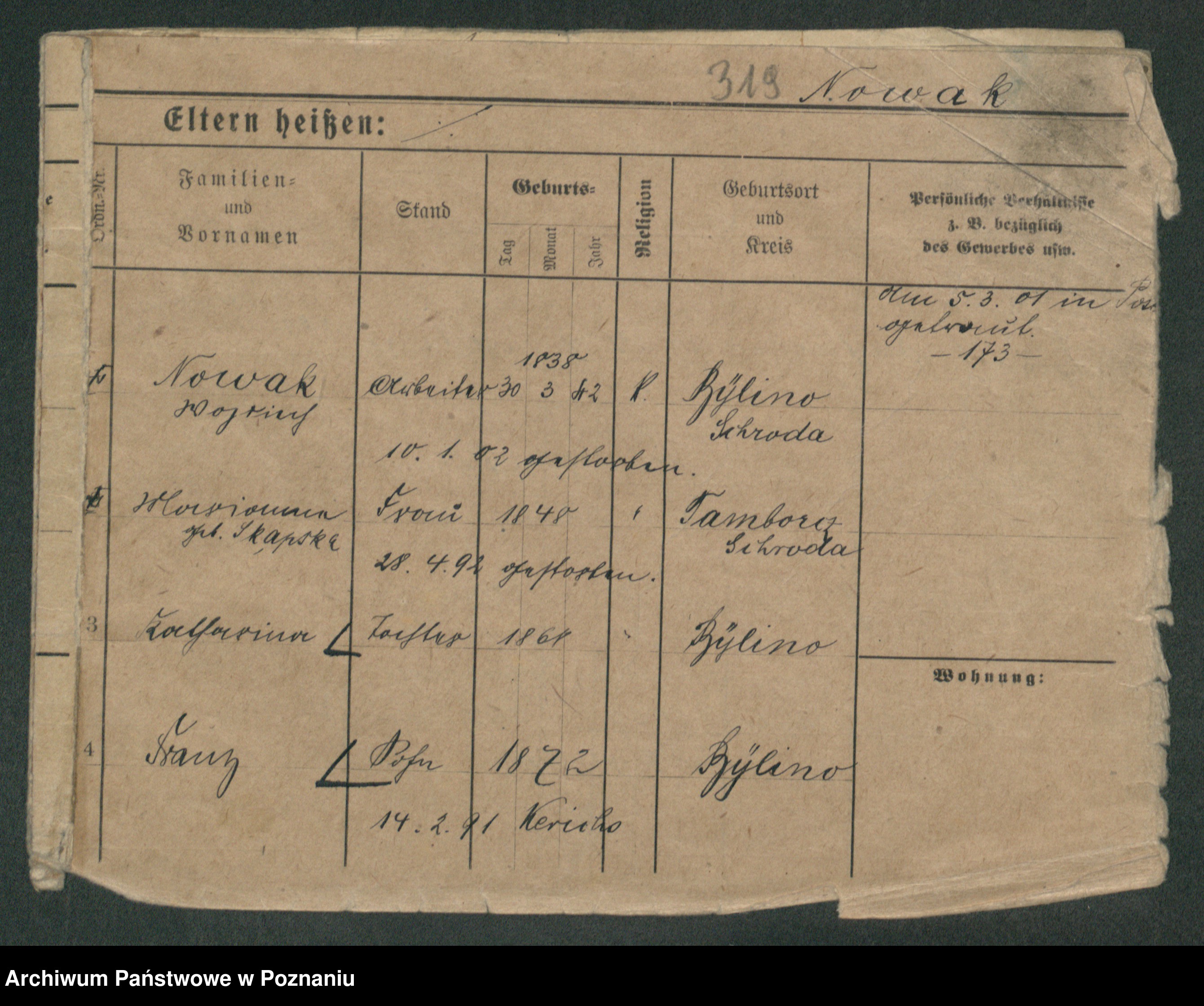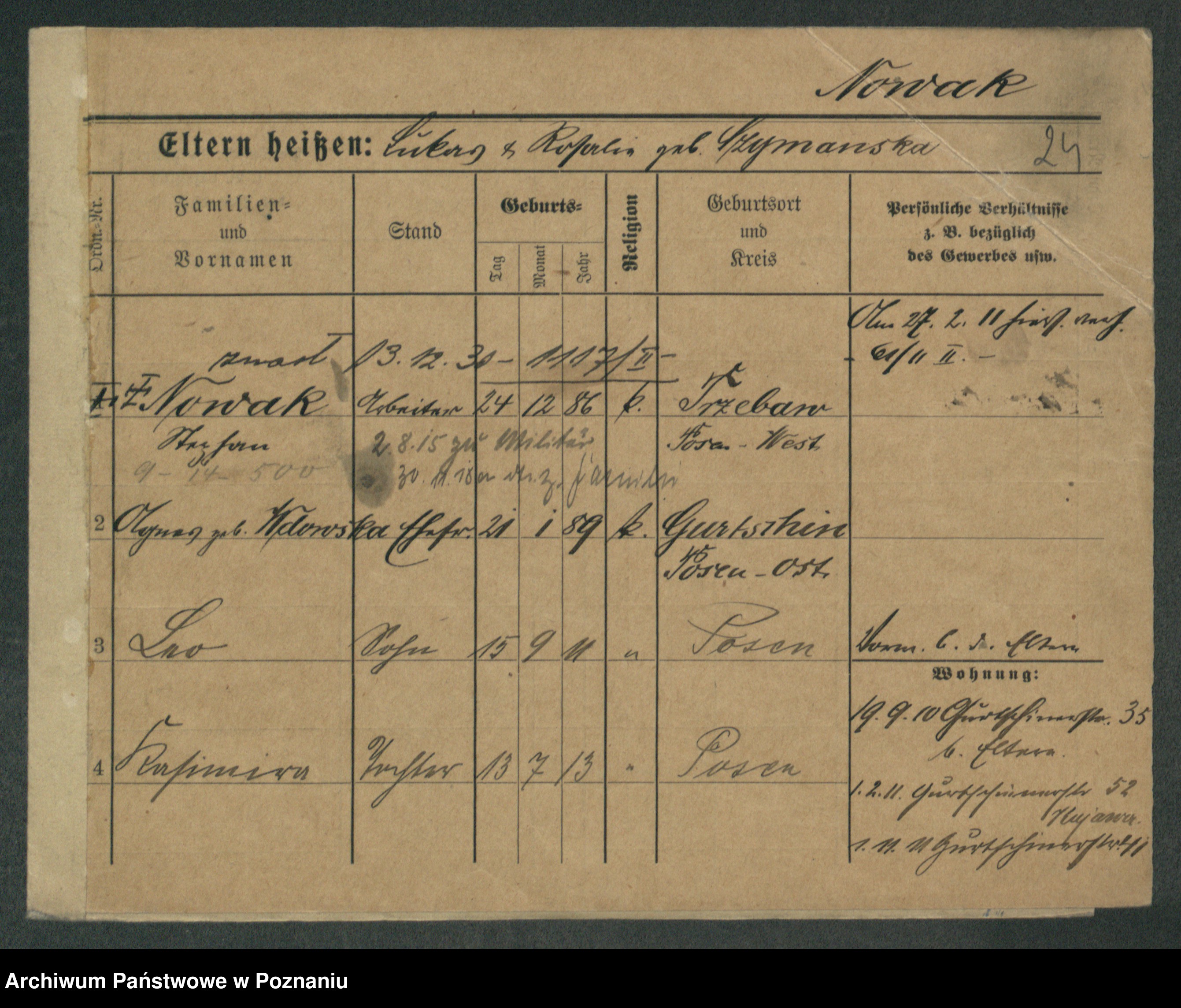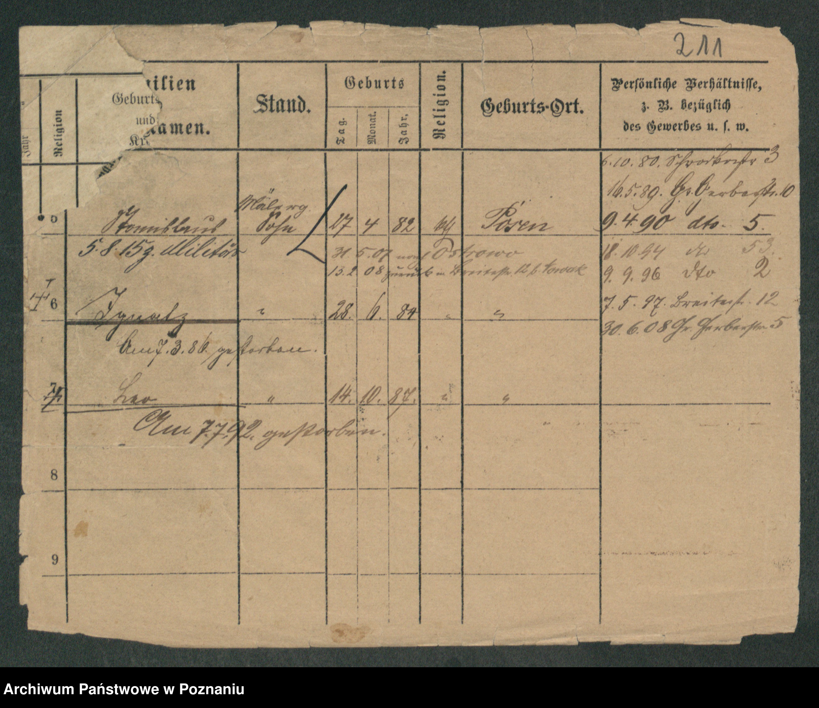 Podgląd karty osobowej dostępny jest po kliknięciu na nazwisko lub ikonkę karty. Można dokonywać powiększenia (ikony na górze) lub przechodzić między kolejnymi skanami (strzałki po bokach).