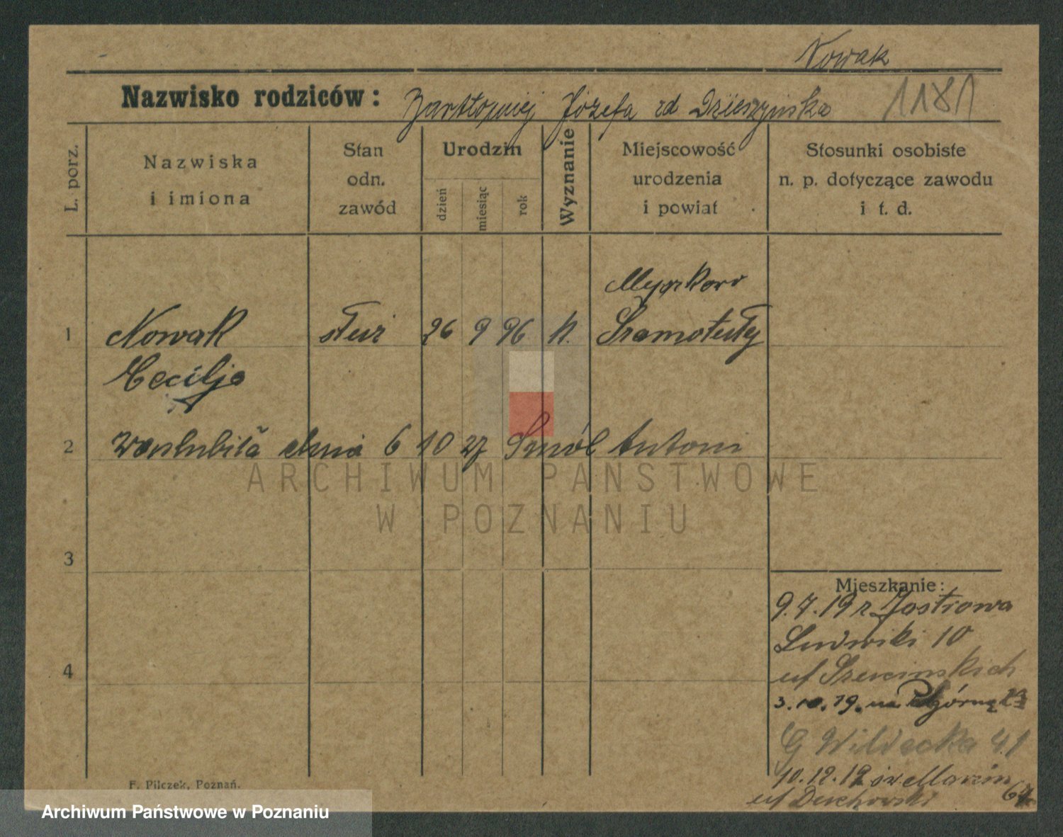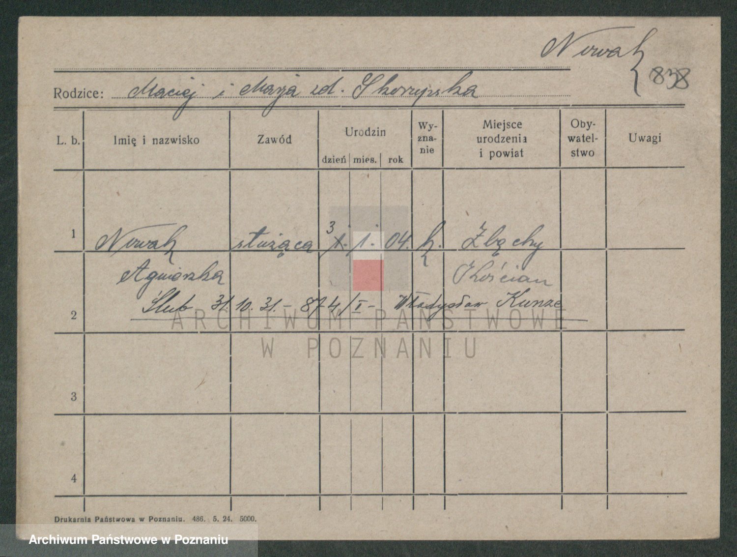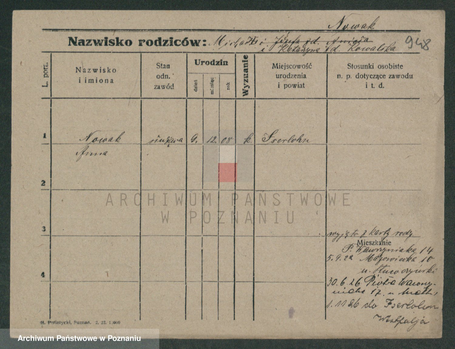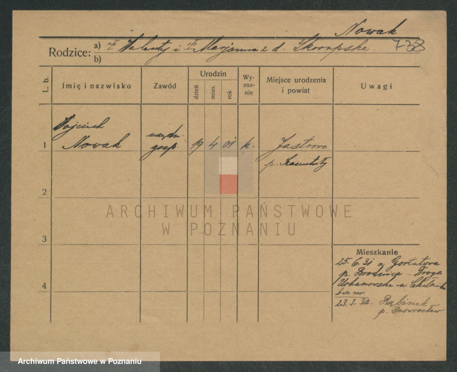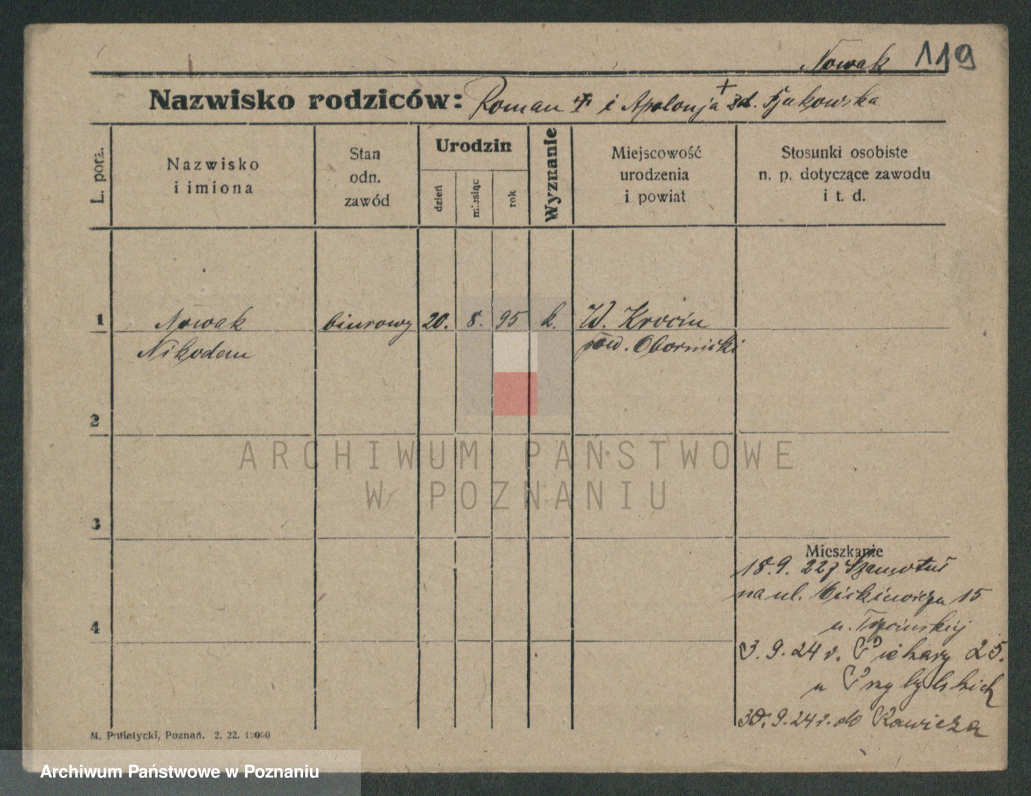 Podgląd karty osobowej dostępny jest po kliknięciu na nazwisko lub ikonkę karty. Można dokonywać powiększenia (ikony na górze) lub przechodzić między kolejnymi skanami (strzałki po bokach).