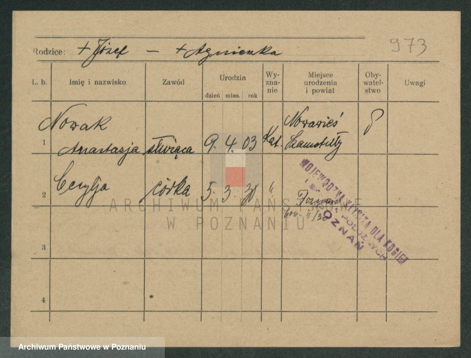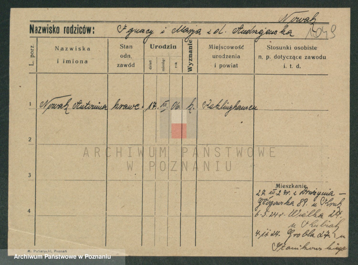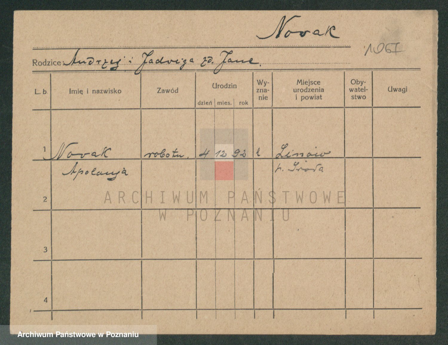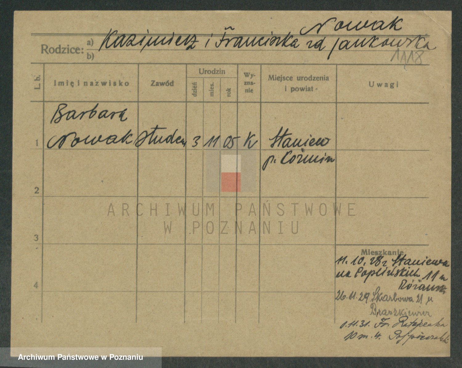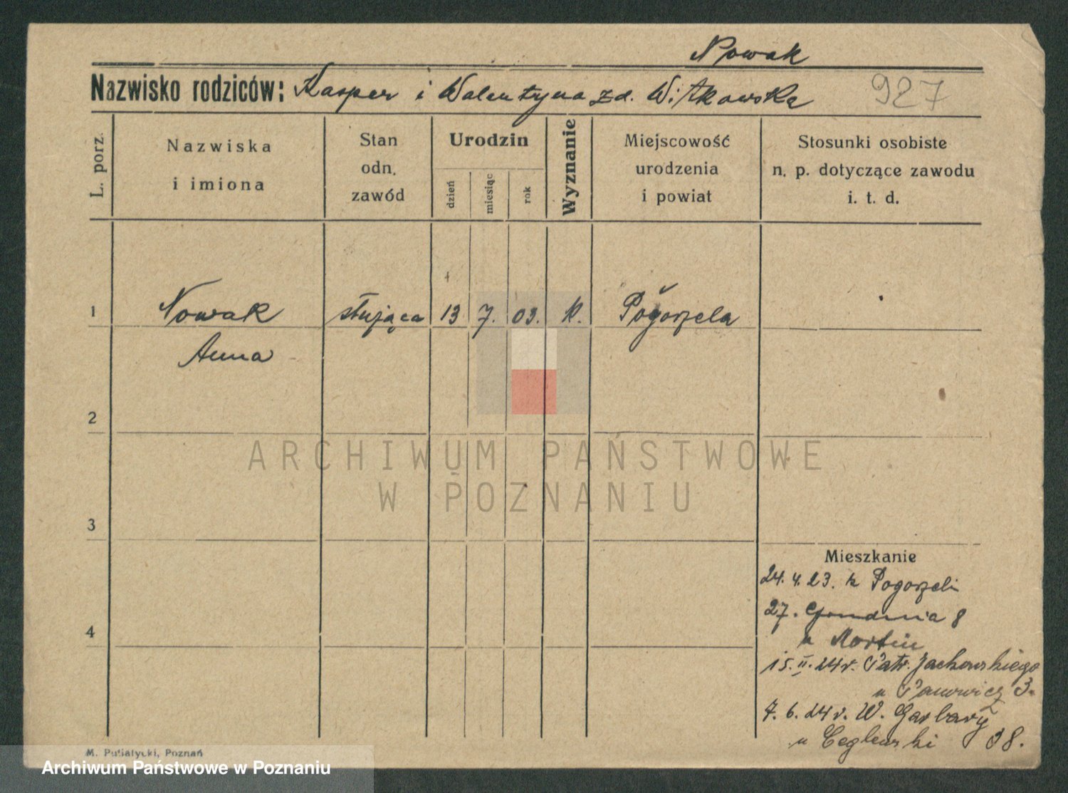 Podgląd karty osobowej dostępny jest po kliknięciu na nazwisko lub ikonkę karty. Można dokonywać powiększenia (ikony na górze) lub przechodzić między kolejnymi skanami (strzałki po bokach).