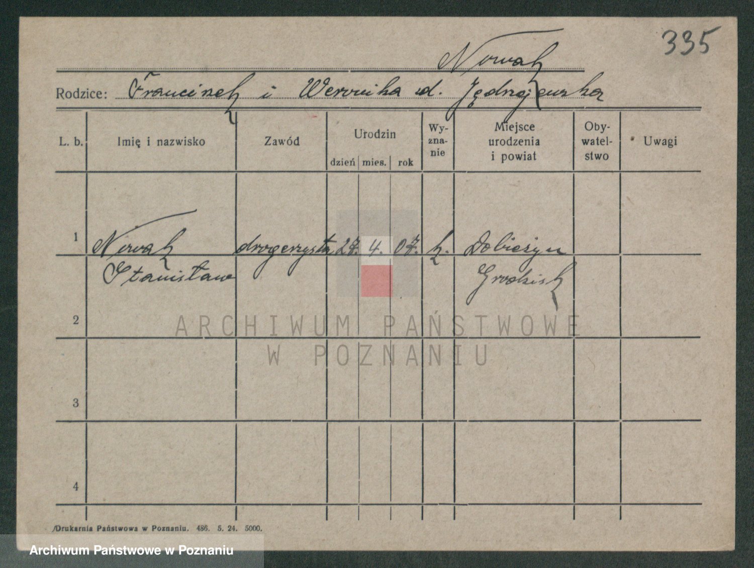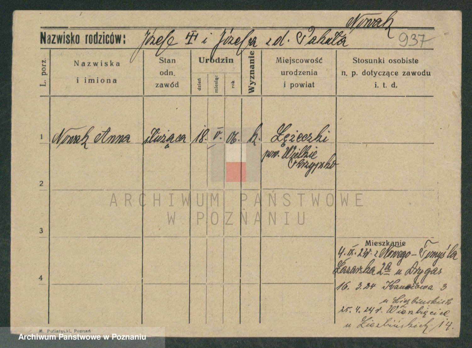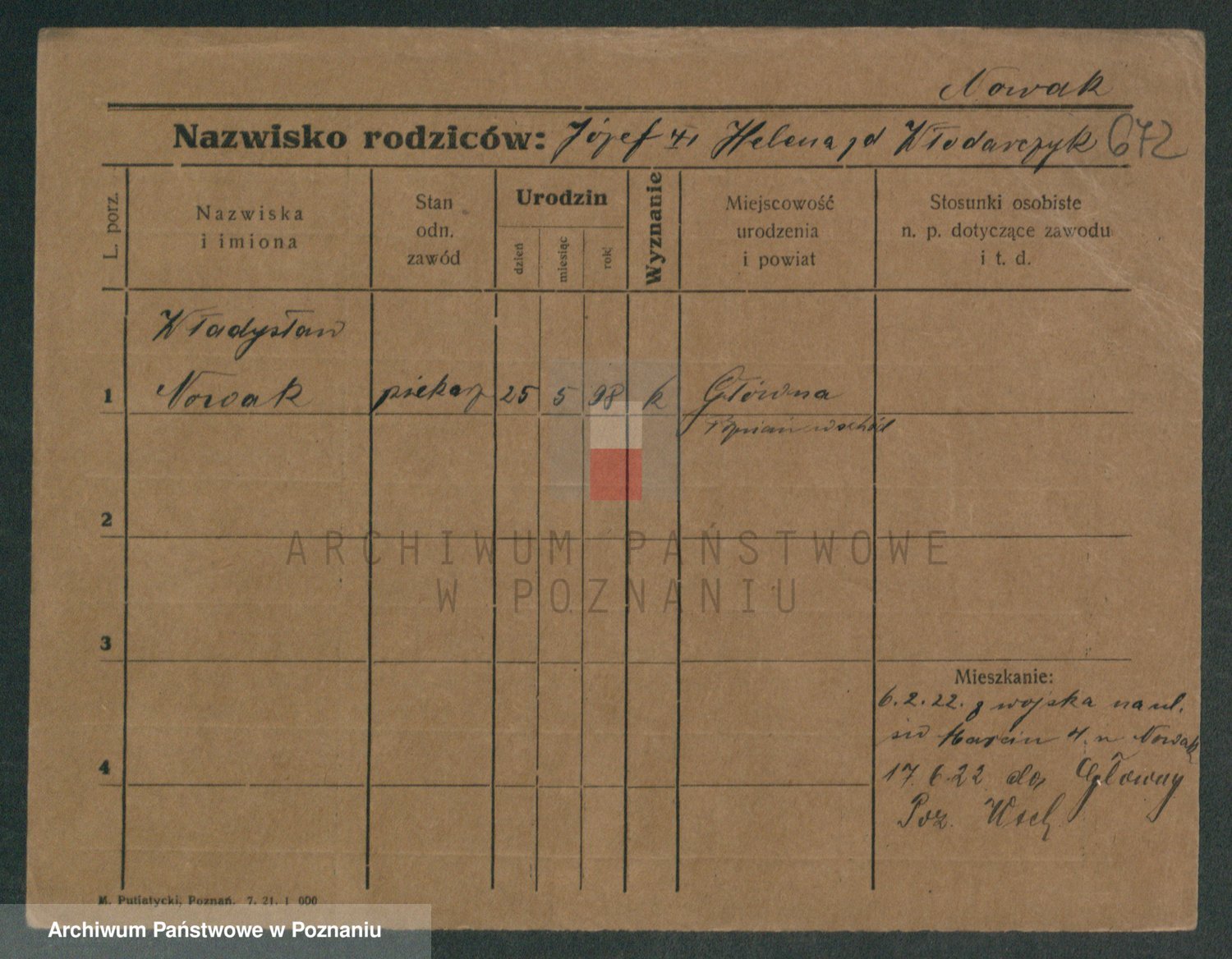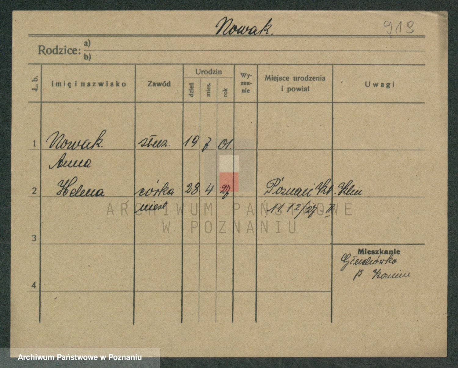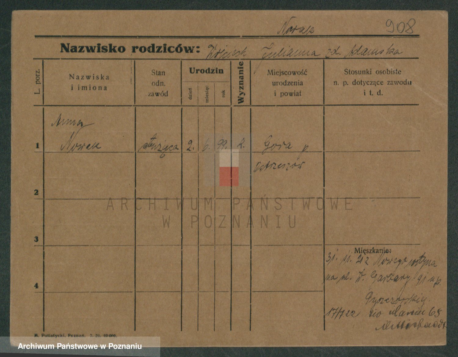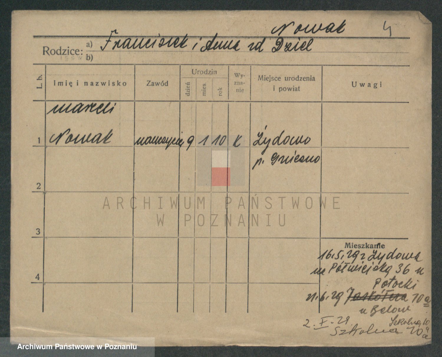 Podgląd karty osobowej dostępny jest po kliknięciu na nazwisko lub ikonkę karty. Można dokonywać powiększenia (ikony na górze) lub przechodzić między kolejnymi skanami (strzałki po bokach).