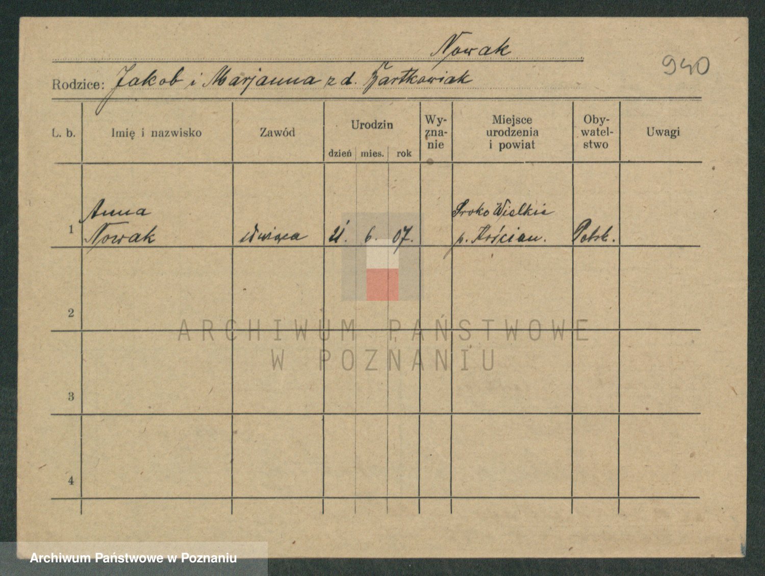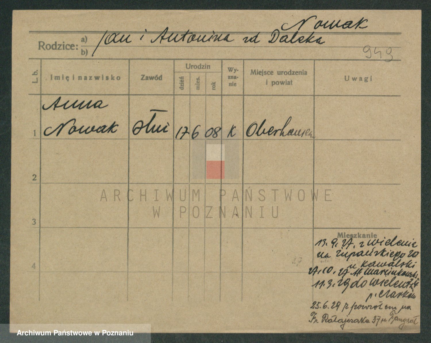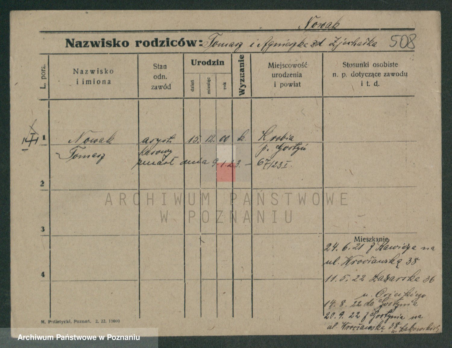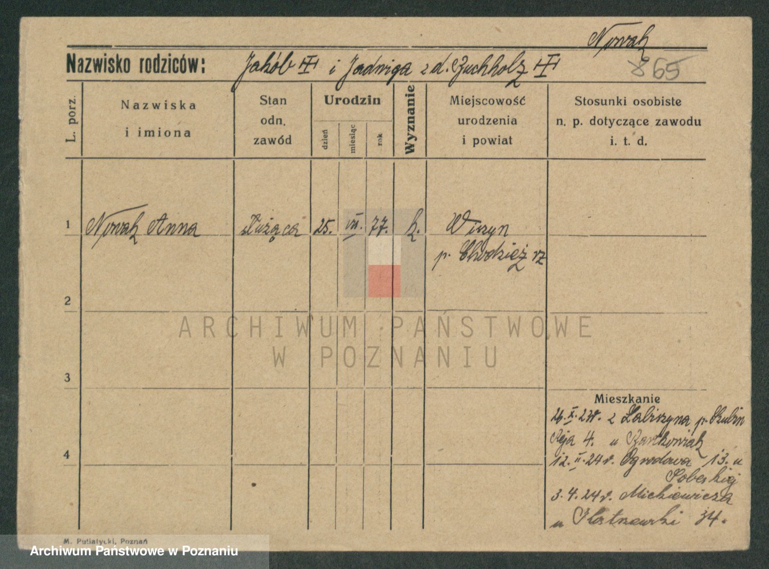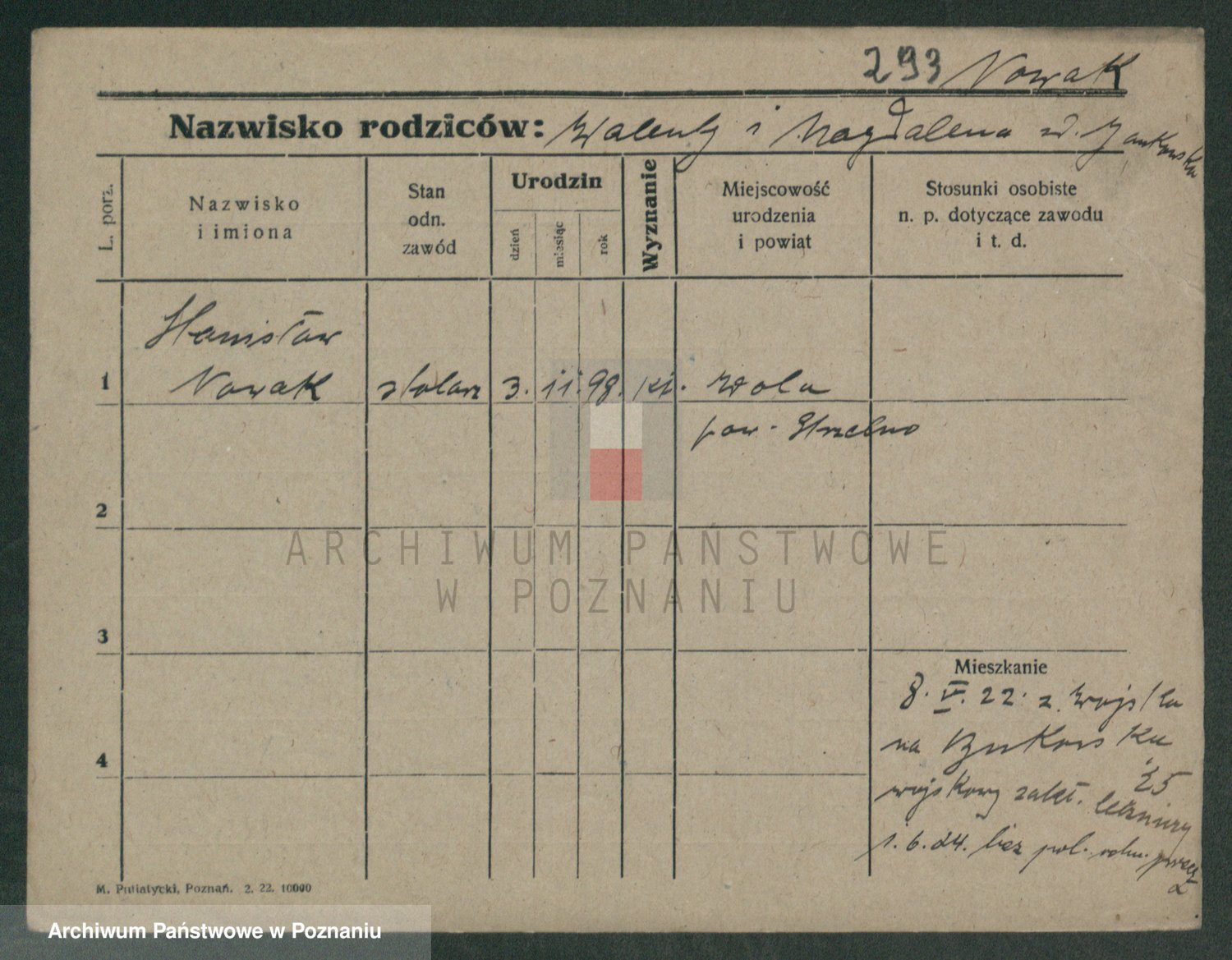 Podgląd karty osobowej dostępny jest po kliknięciu na nazwisko lub ikonkę karty. Można dokonywać powiększenia (ikony na górze) lub przechodzić między kolejnymi skanami (strzałki po bokach).