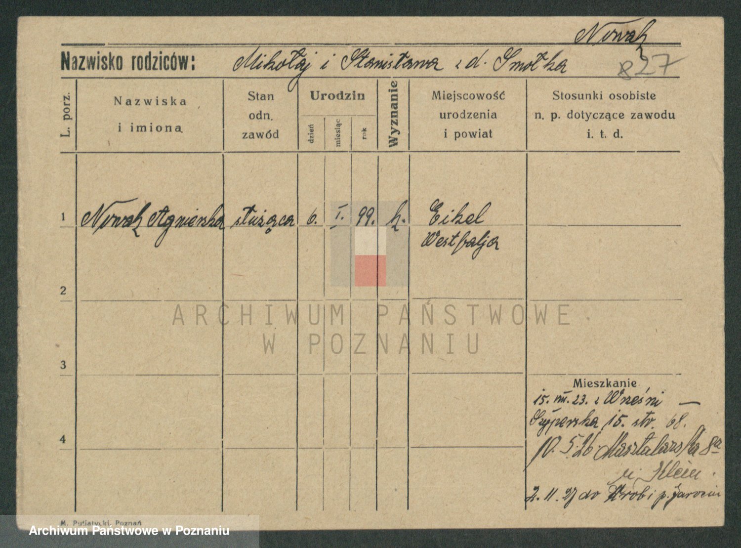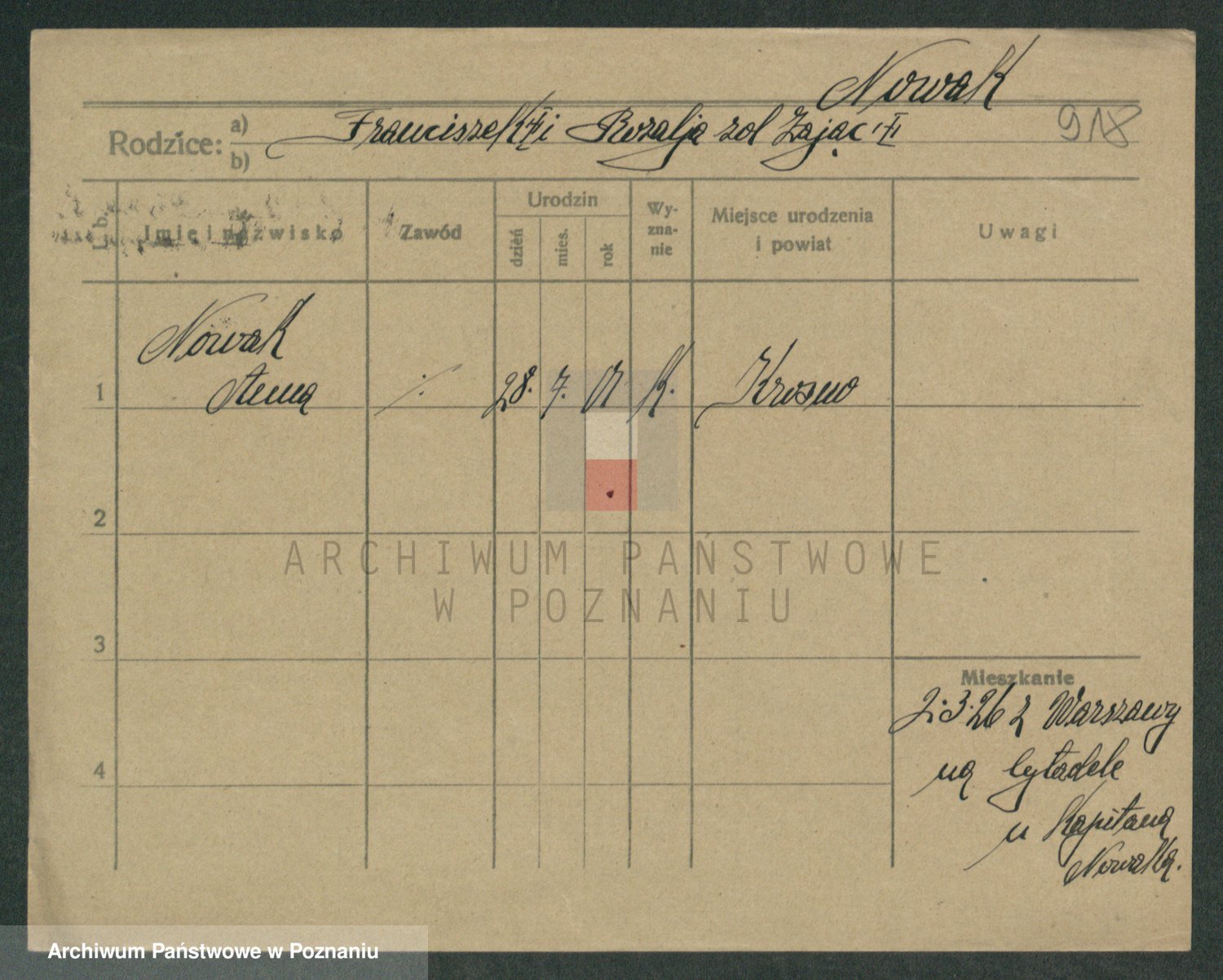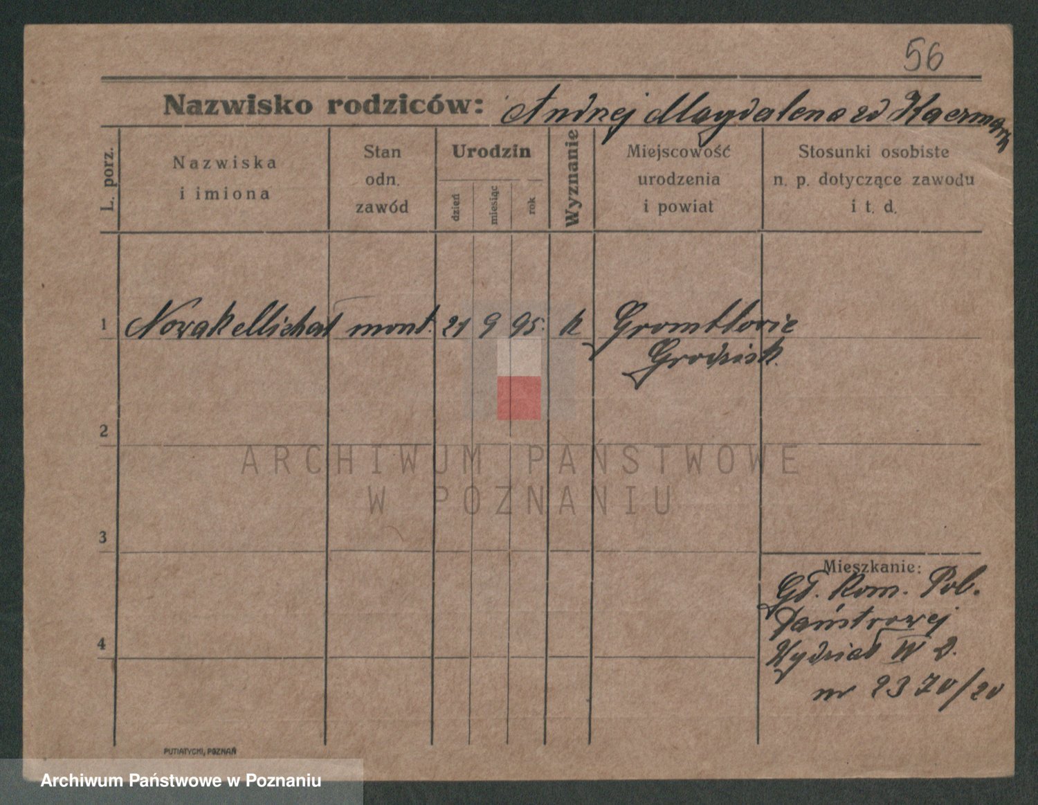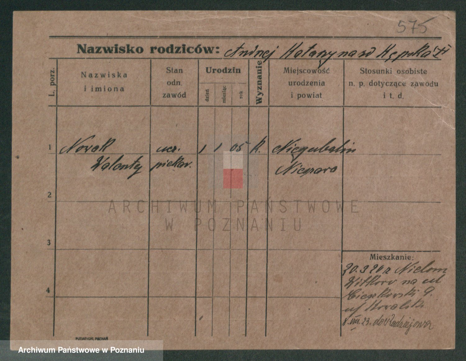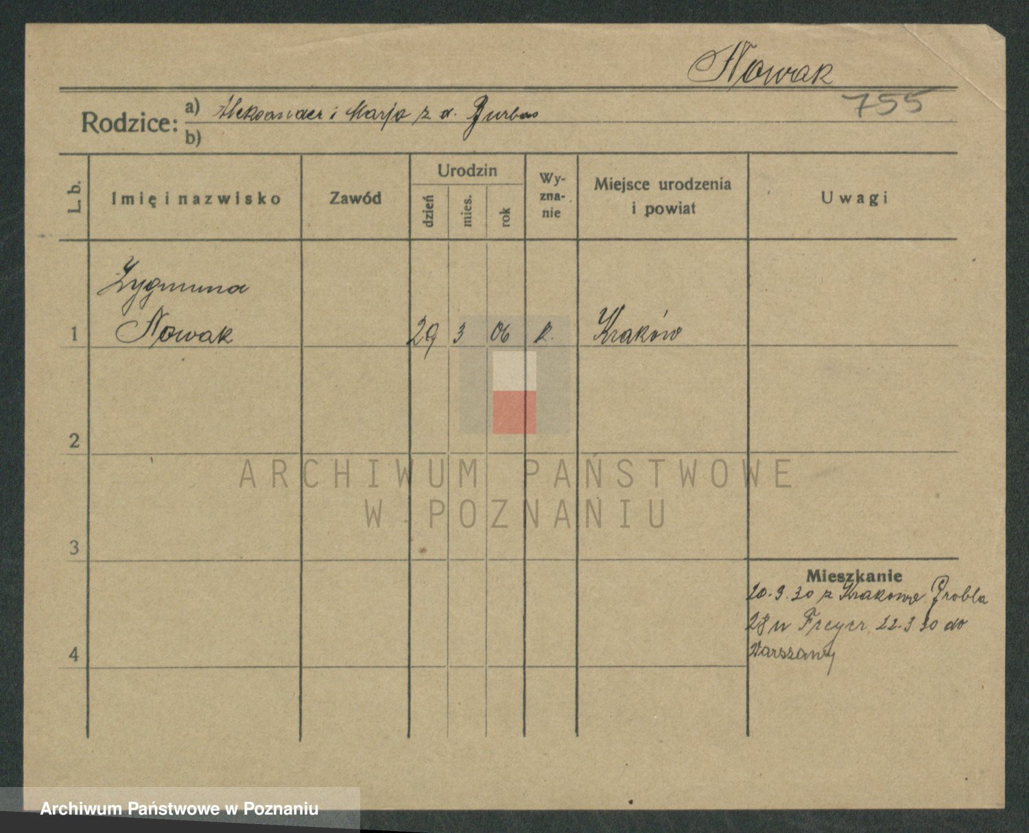 Podgląd karty osobowej dostępny jest po kliknięciu na nazwisko lub ikonkę karty. Można dokonywać powiększenia (ikony na górze) lub przechodzić między kolejnymi skanami (strzałki po bokach).
