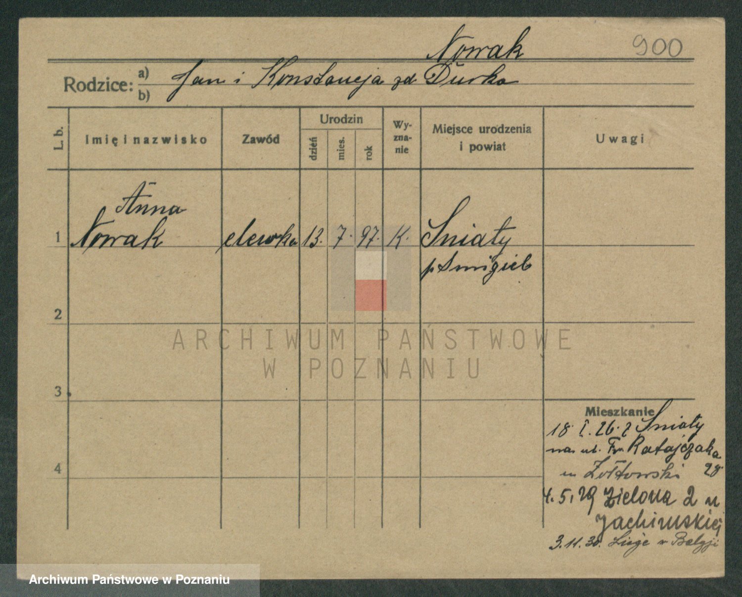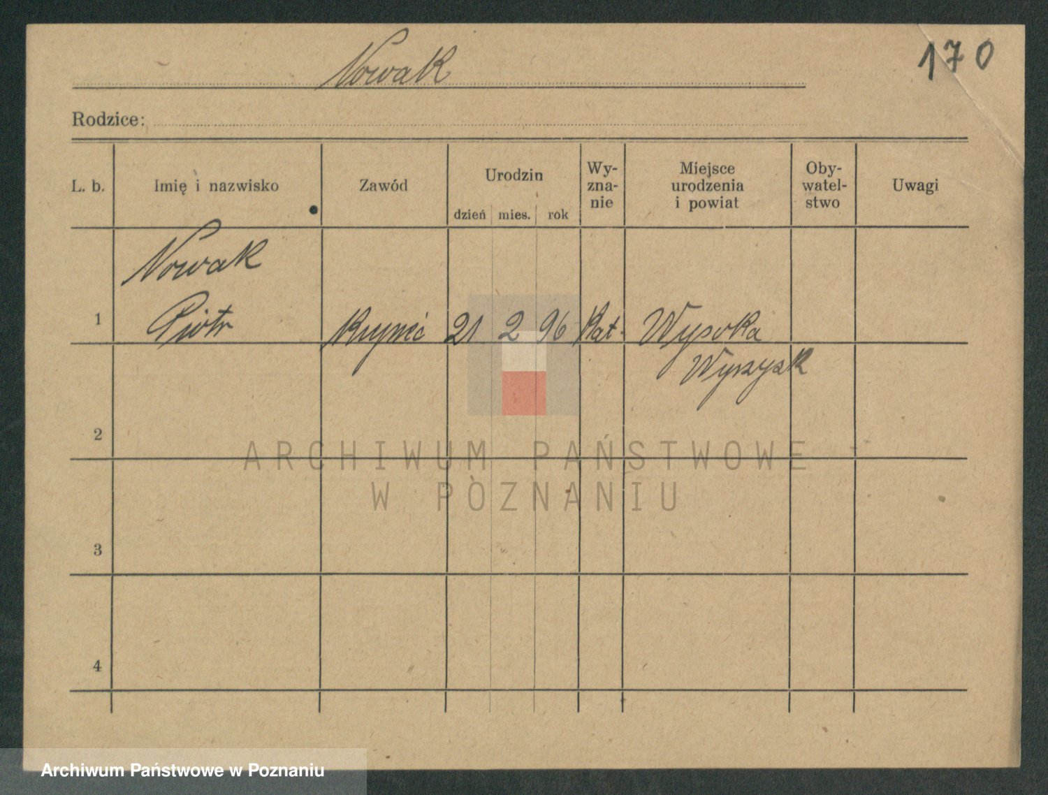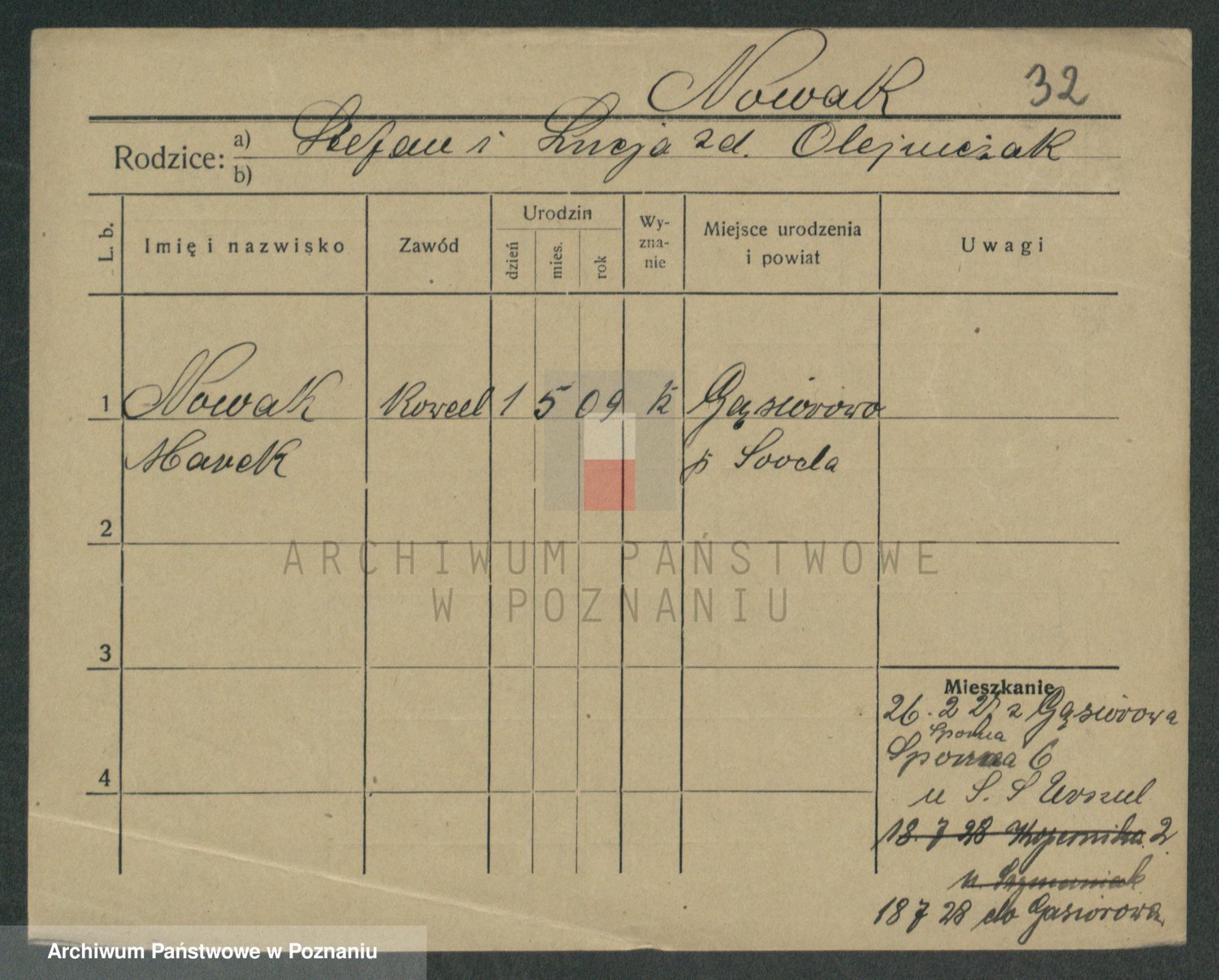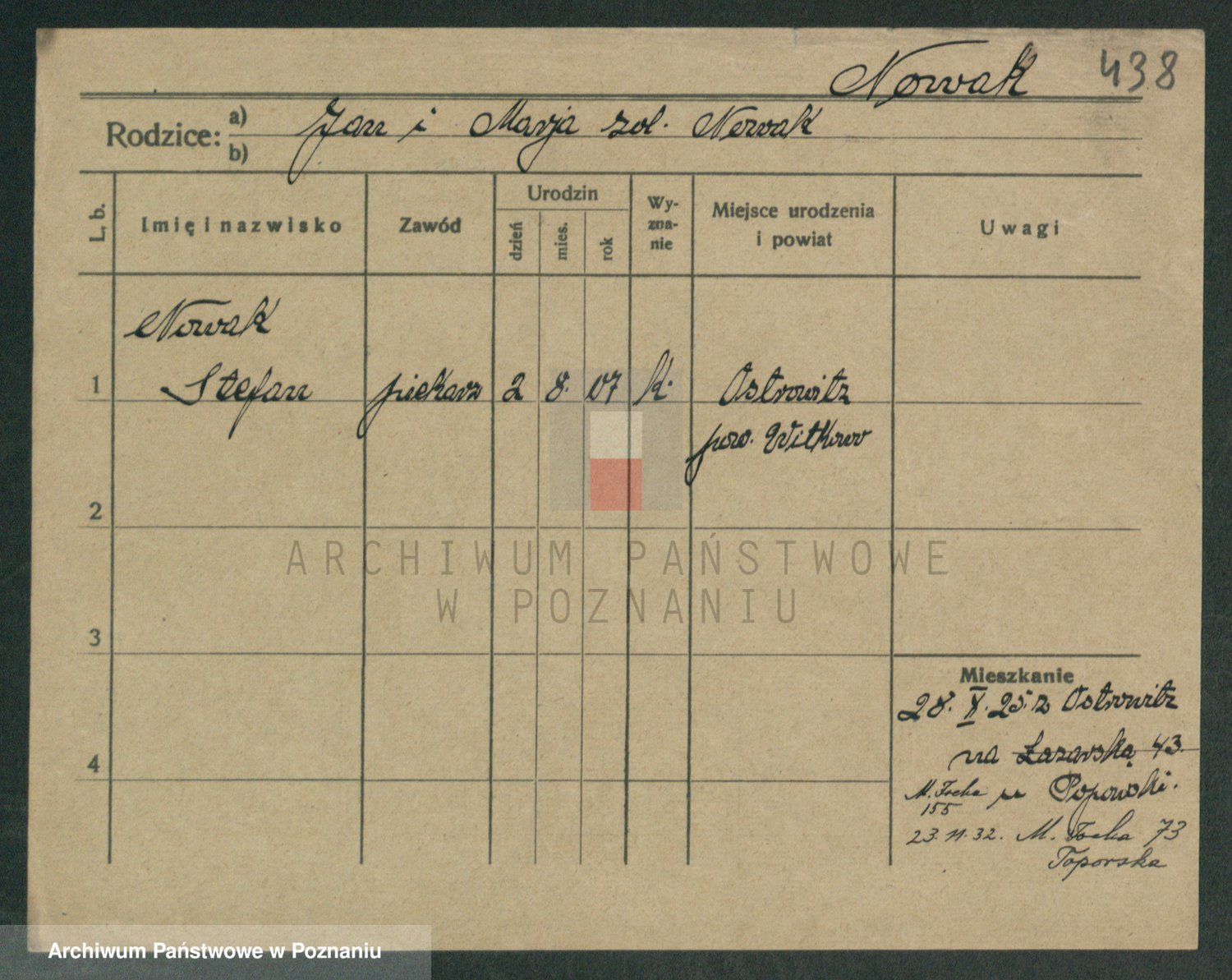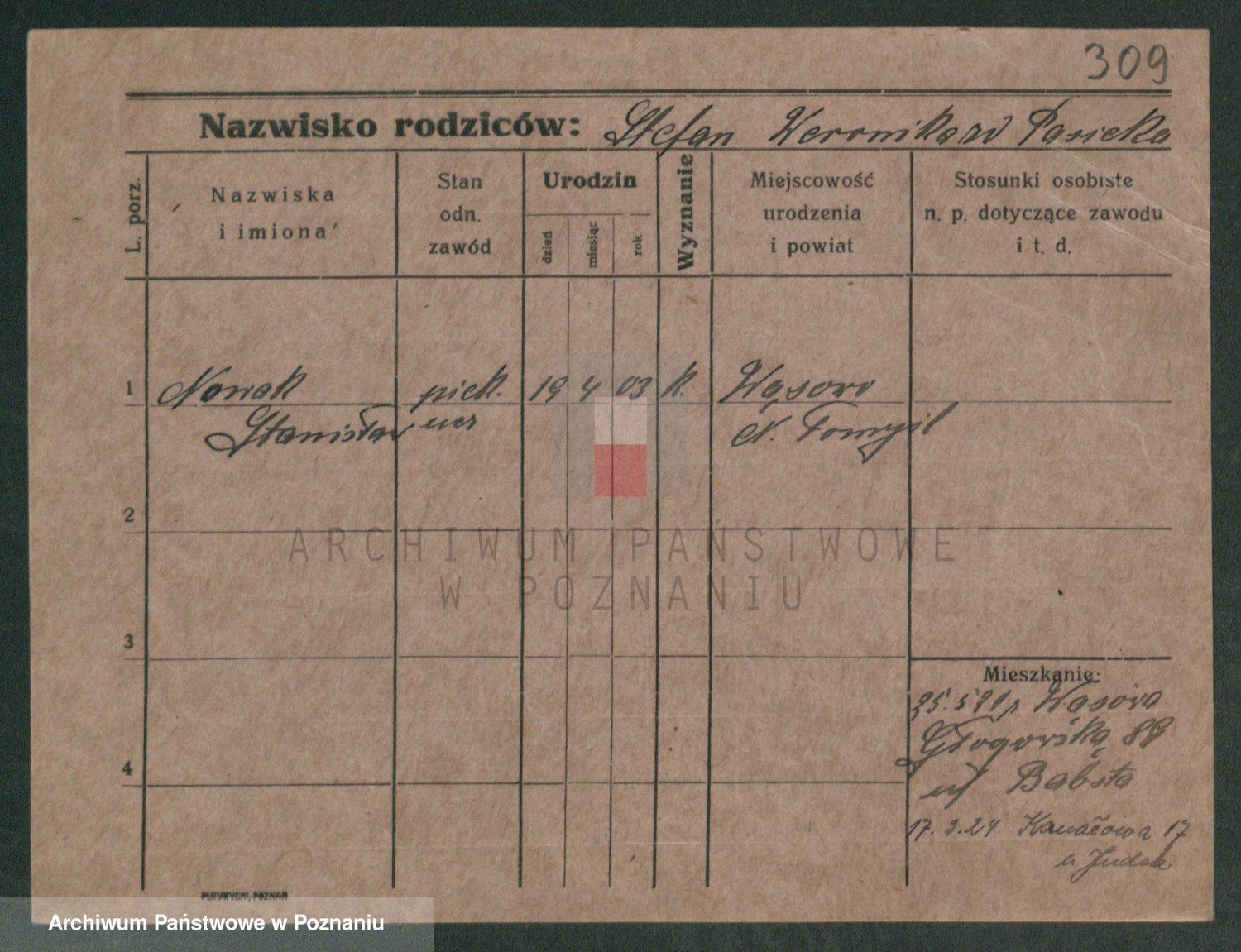 Podgląd karty osobowej dostępny jest po kliknięciu na nazwisko lub ikonkę karty. Można dokonywać powiększenia (ikony na górze) lub przechodzić między kolejnymi skanami (strzałki po bokach).