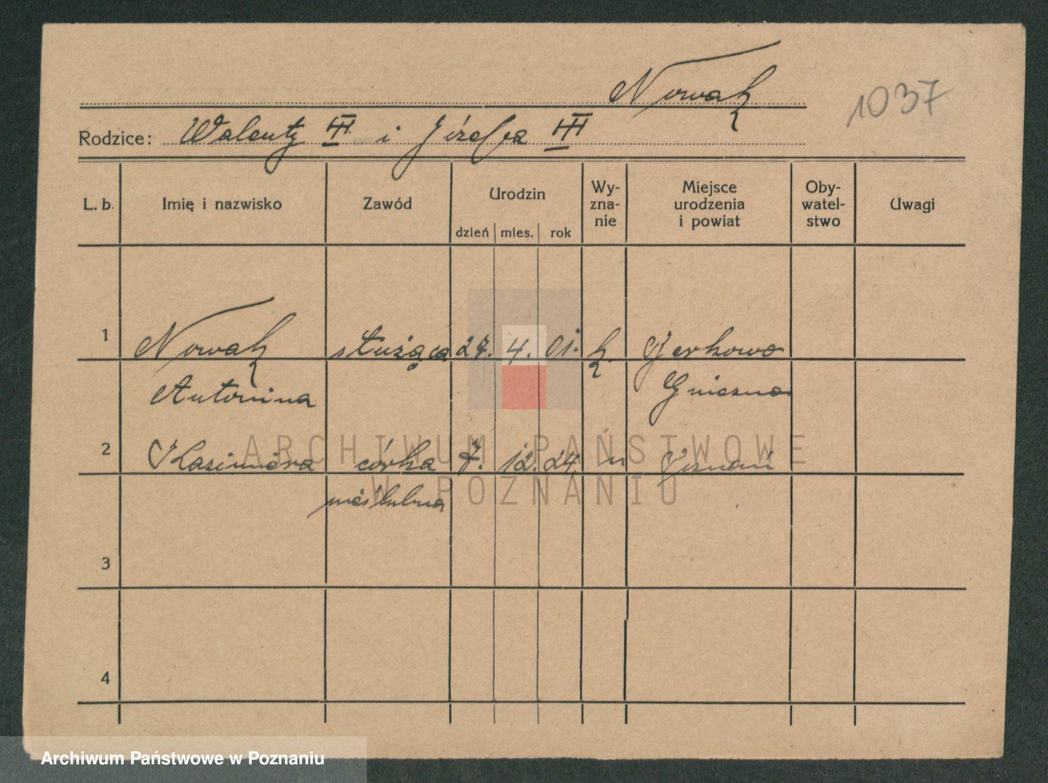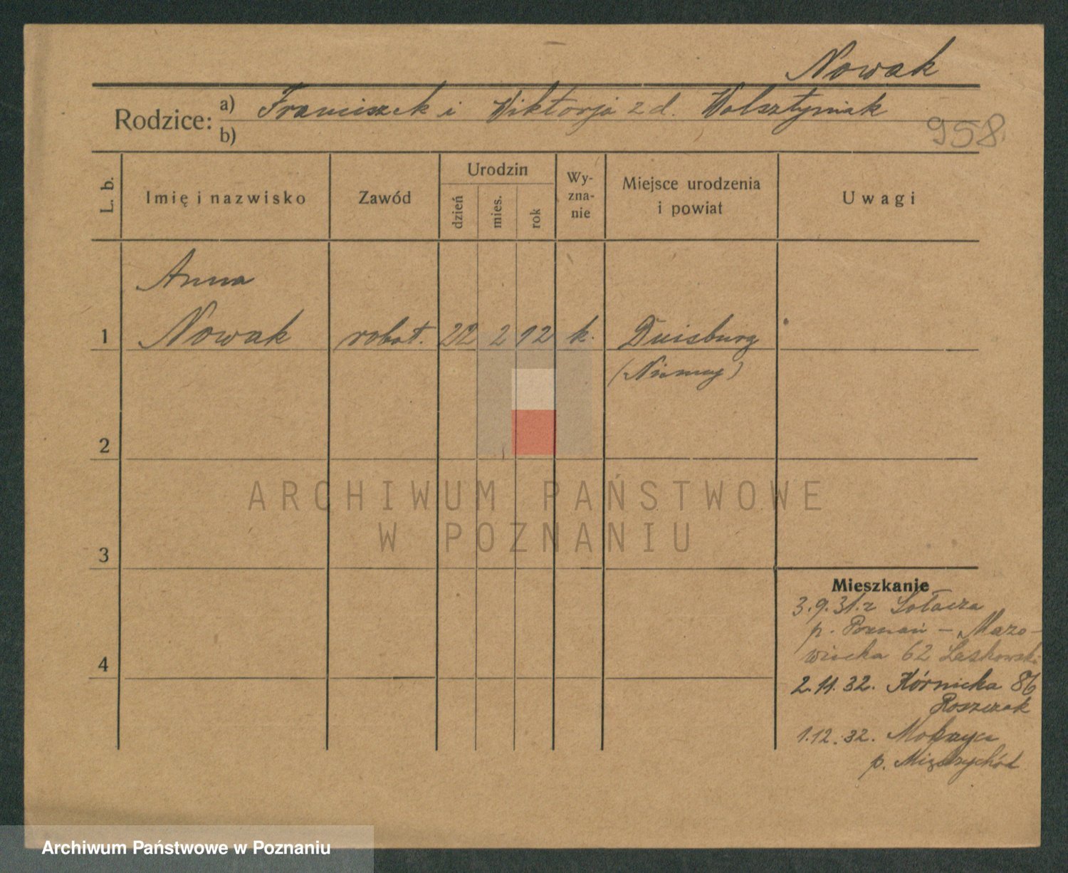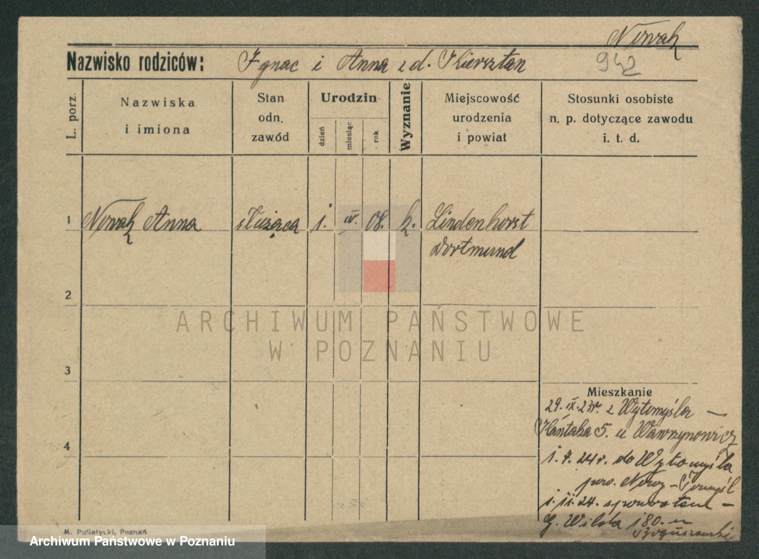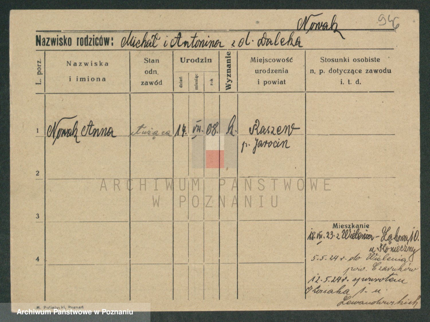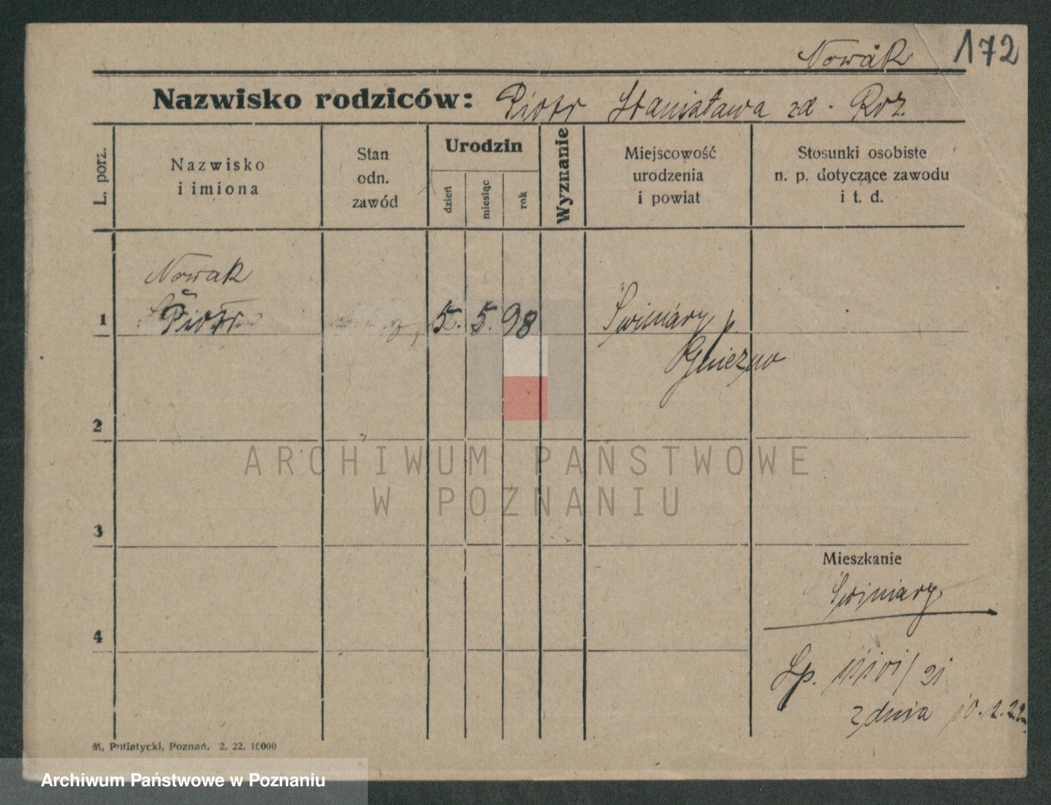 Podgląd karty osobowej dostępny jest po kliknięciu na nazwisko lub ikonkę karty. Można dokonywać powiększenia (ikony na górze) lub przechodzić między kolejnymi skanami (strzałki po bokach).