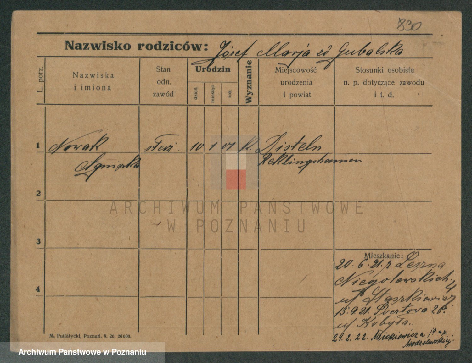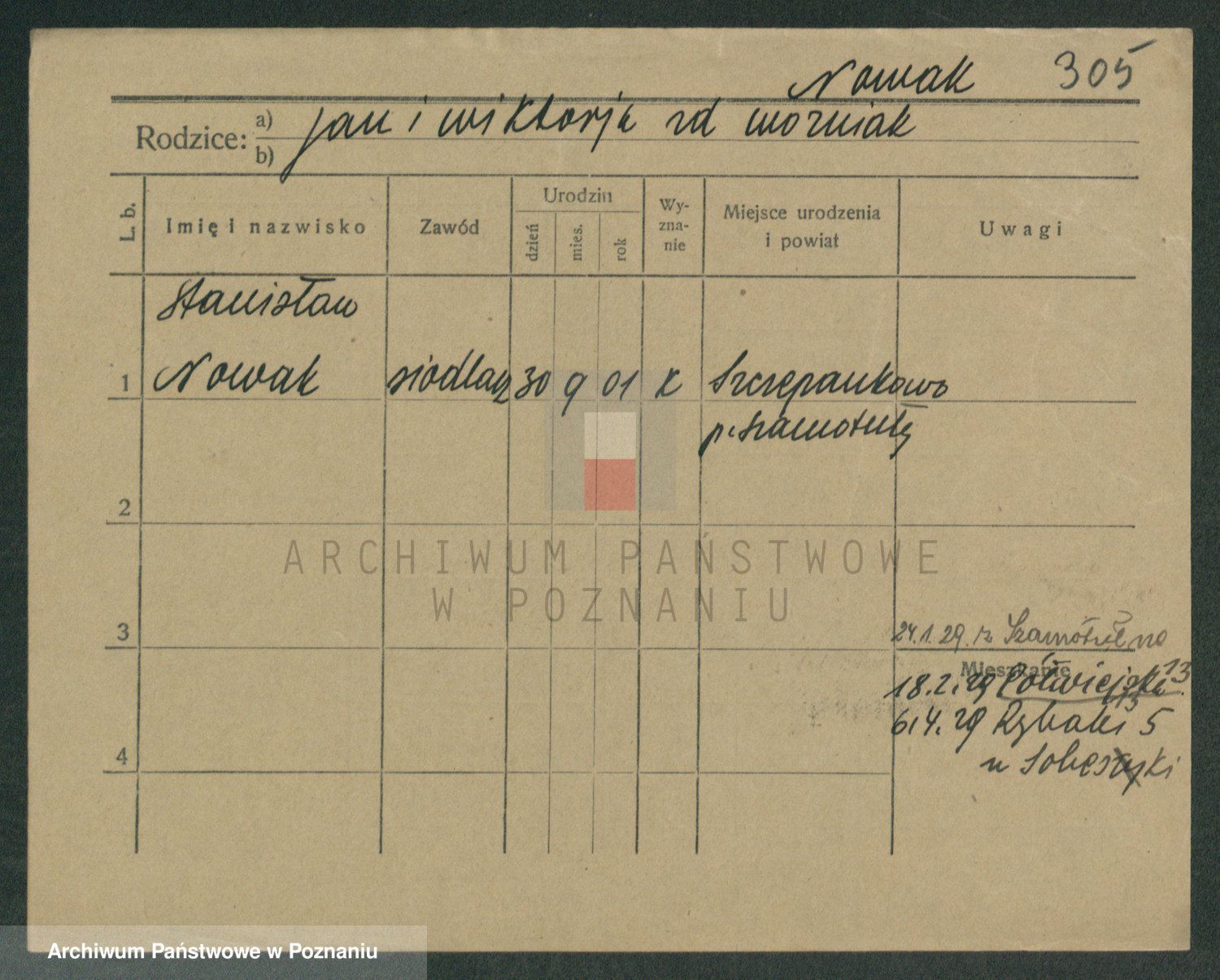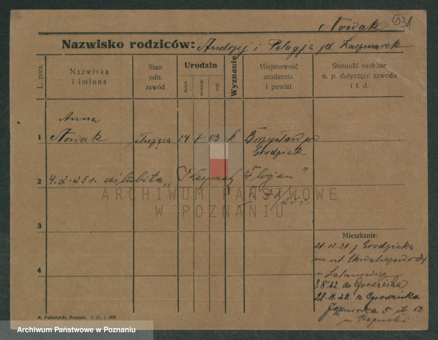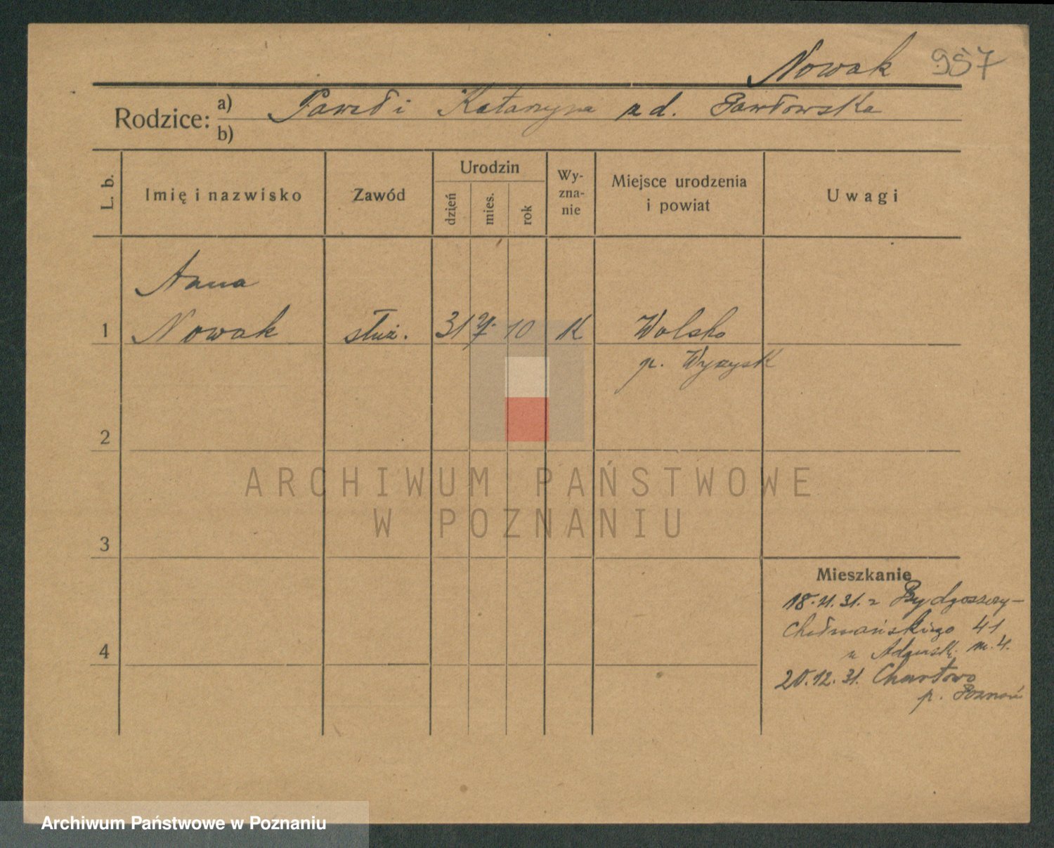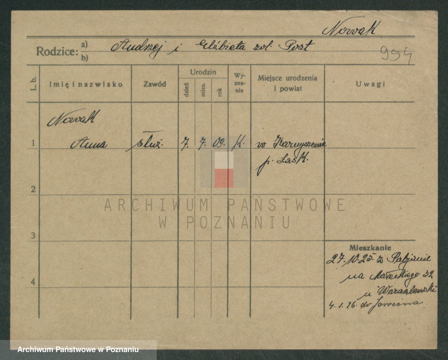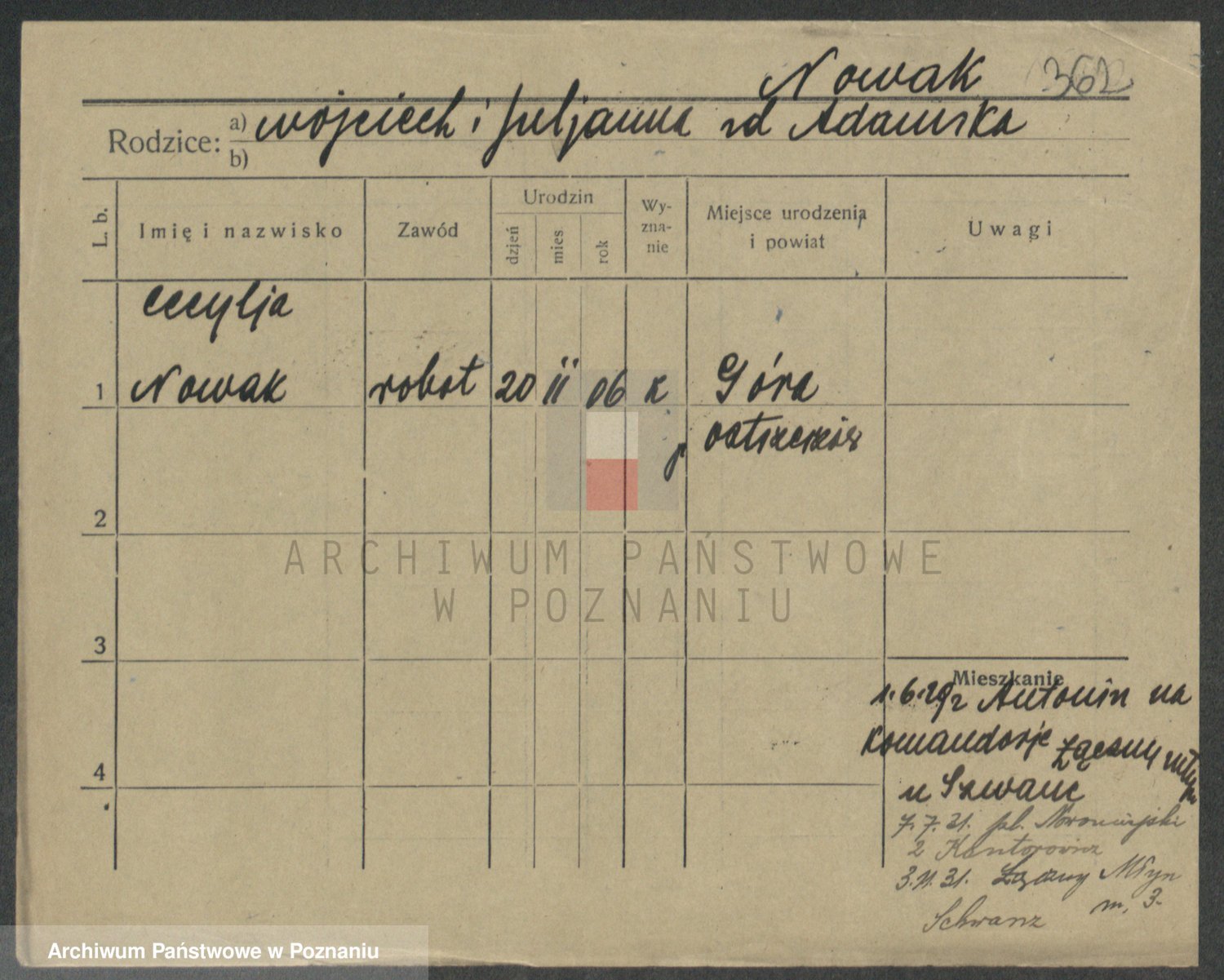 Podgląd karty osobowej dostępny jest po kliknięciu na nazwisko lub ikonkę karty. Można dokonywać powiększenia (ikony na górze) lub przechodzić między kolejnymi skanami (strzałki po bokach).