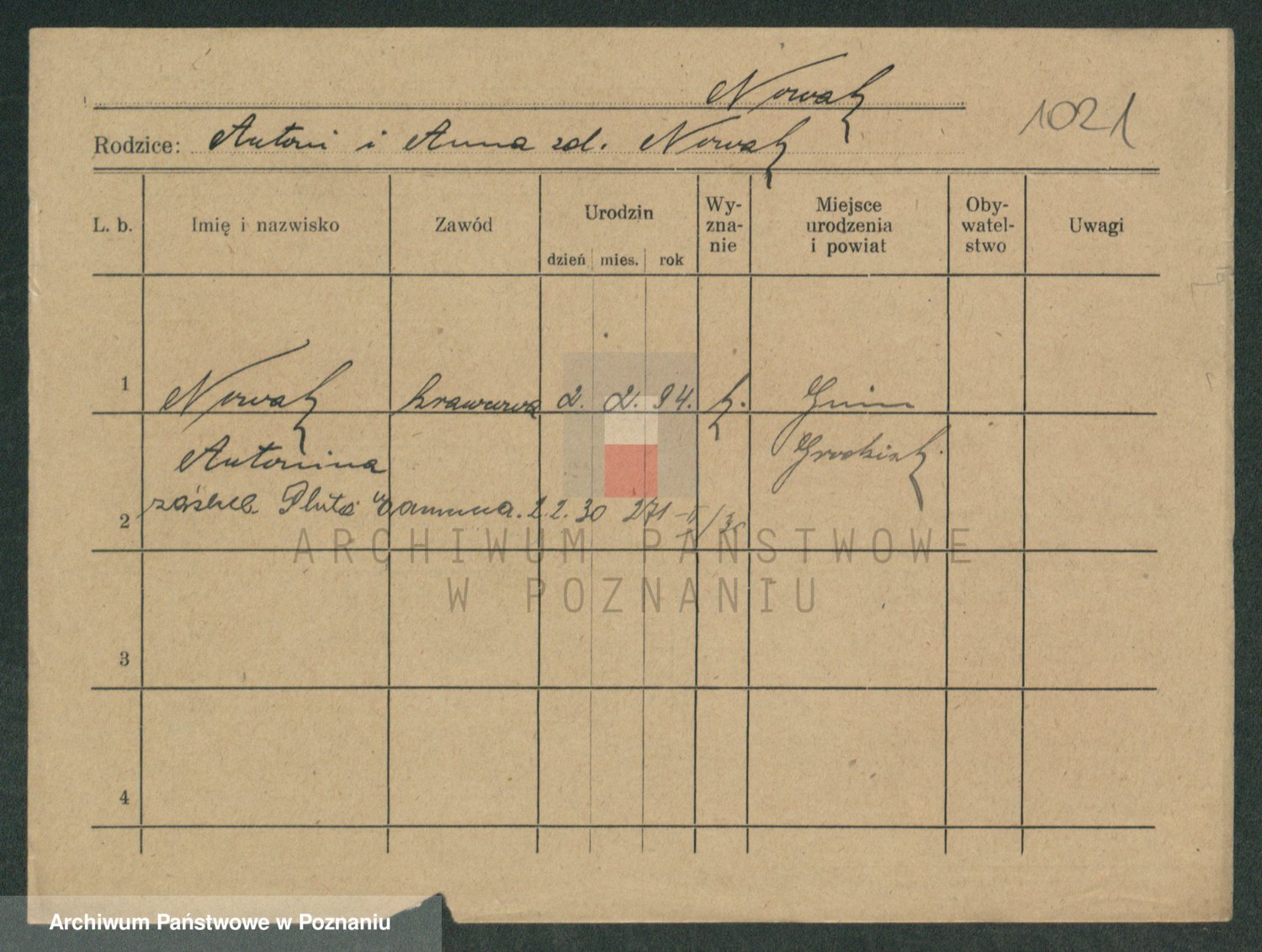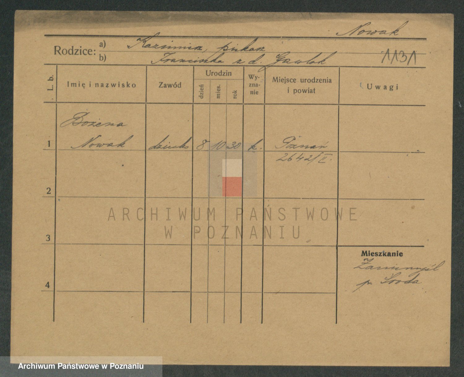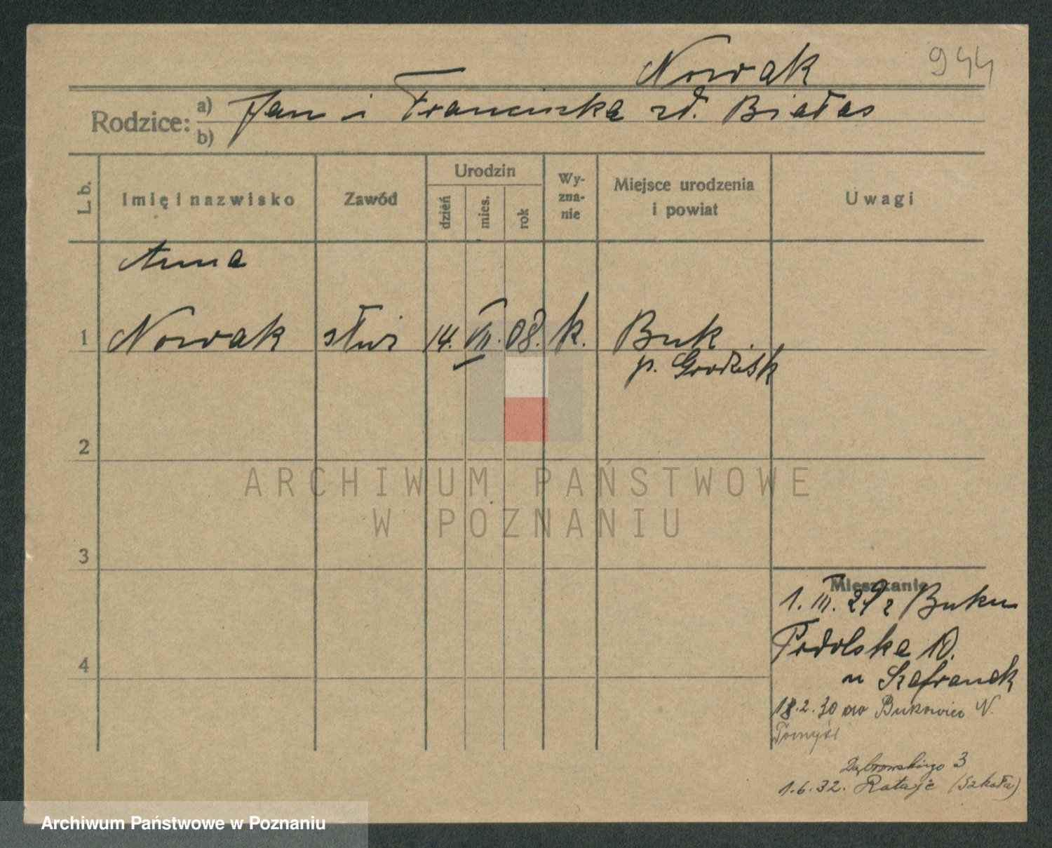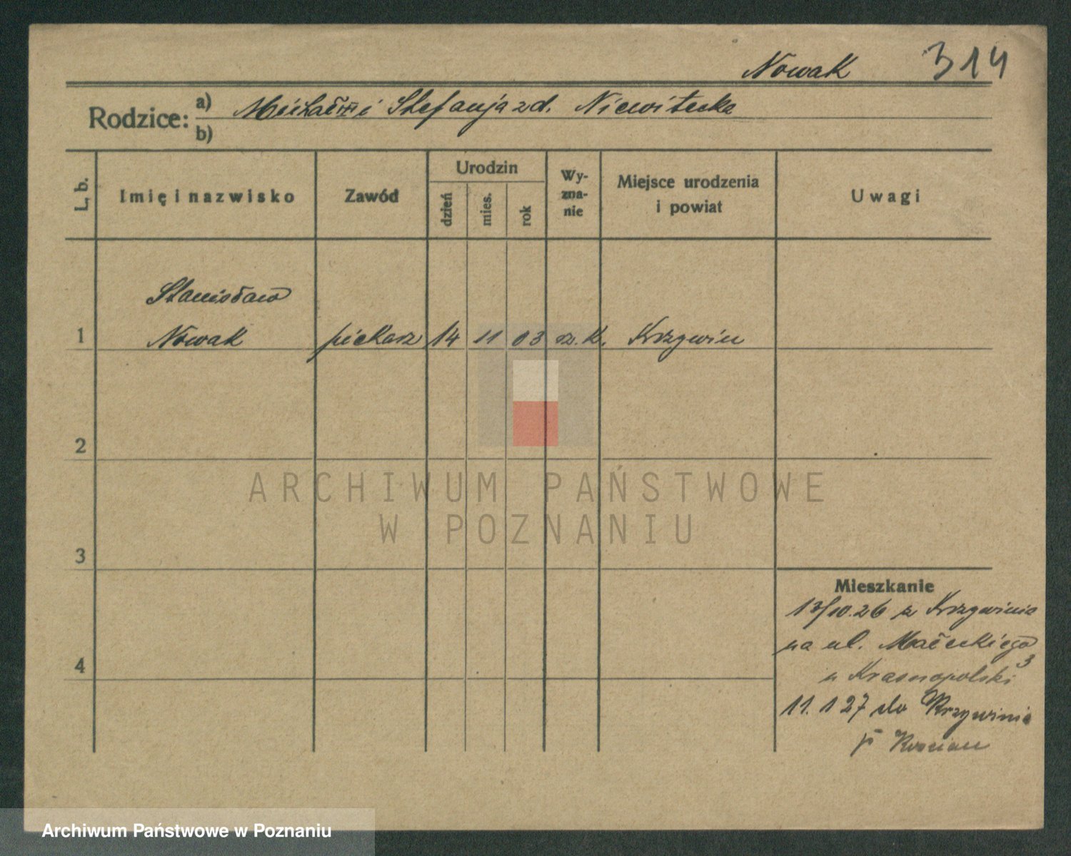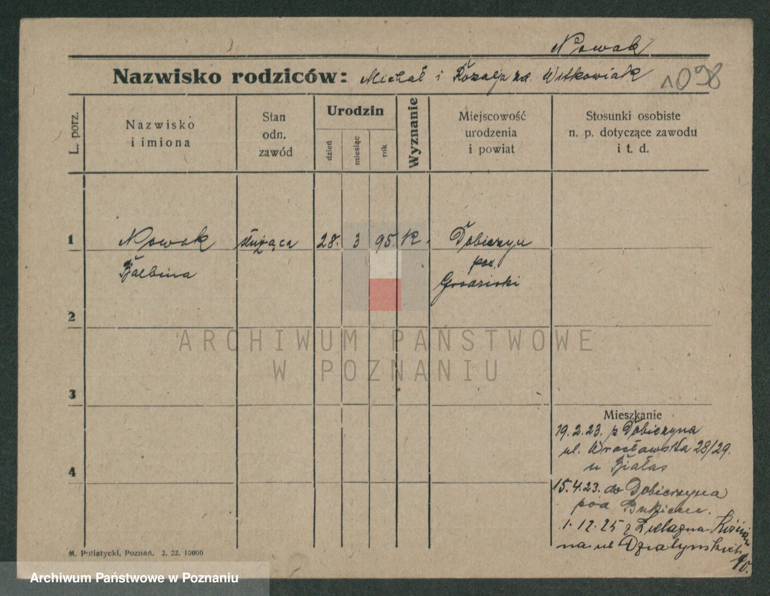 Podgląd karty osobowej dostępny jest po kliknięciu na nazwisko lub ikonkę karty. Można dokonywać powiększenia (ikony na górze) lub przechodzić między kolejnymi skanami (strzałki po bokach).