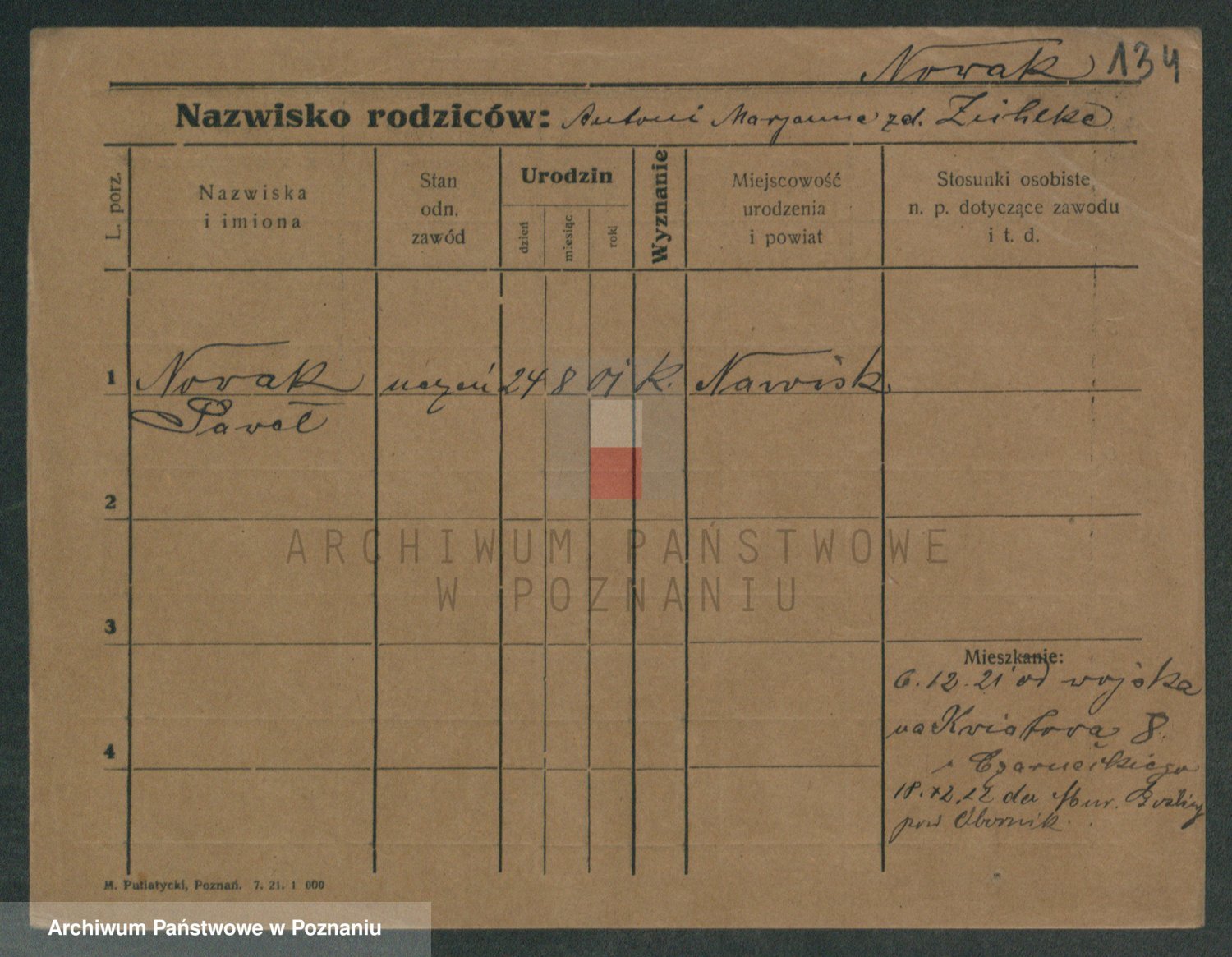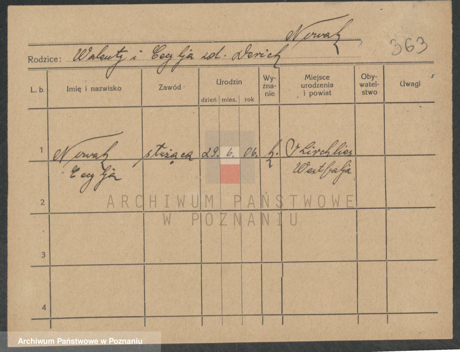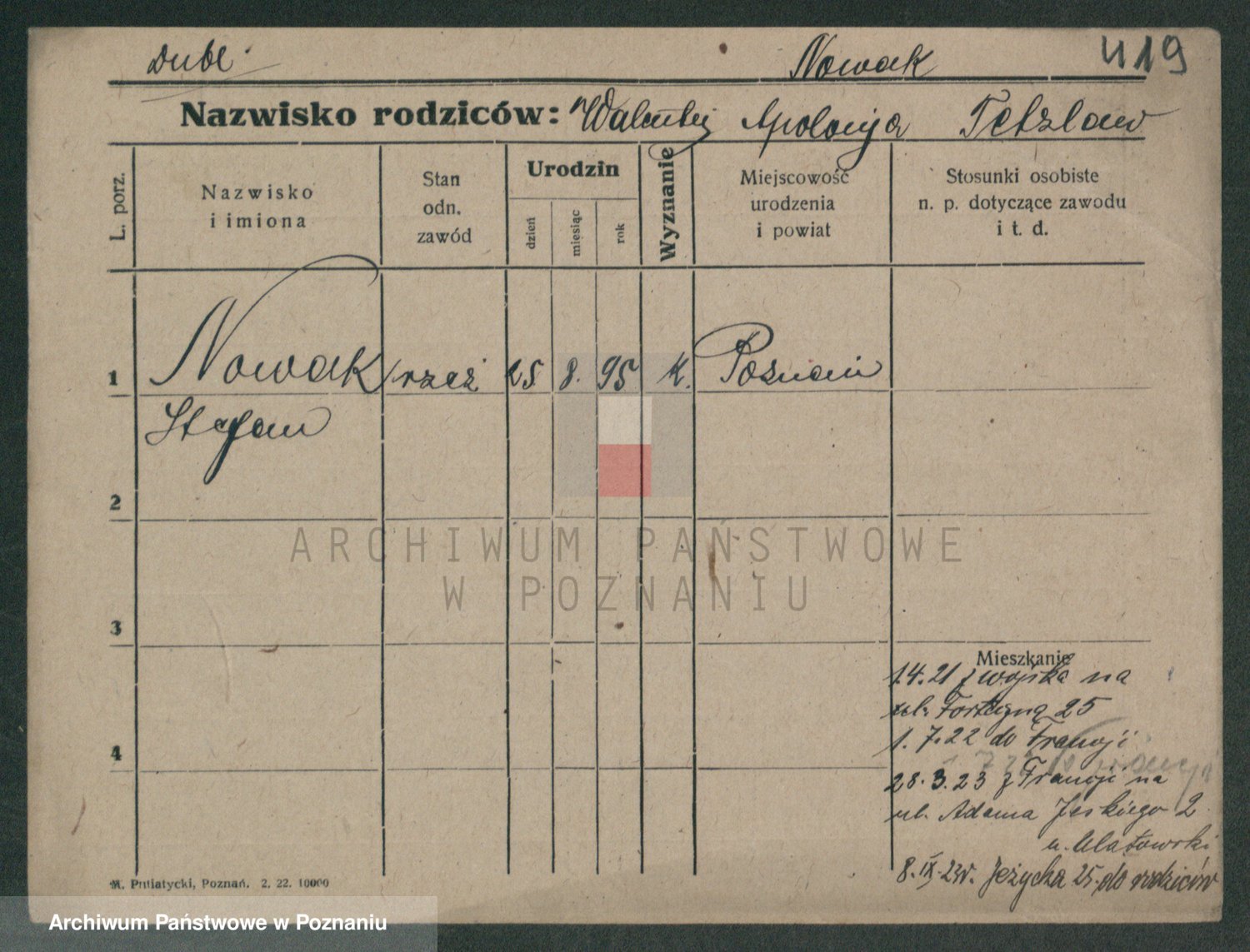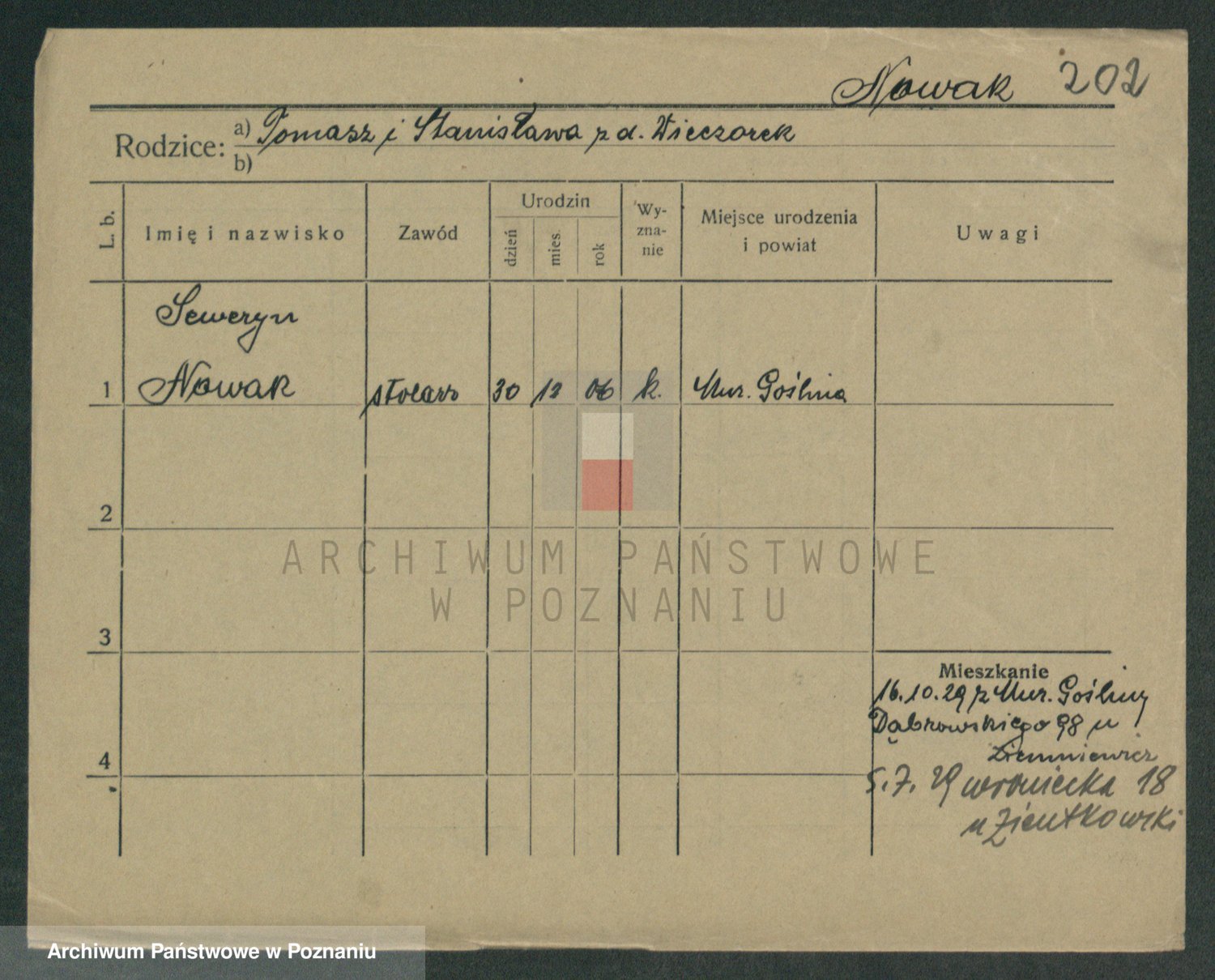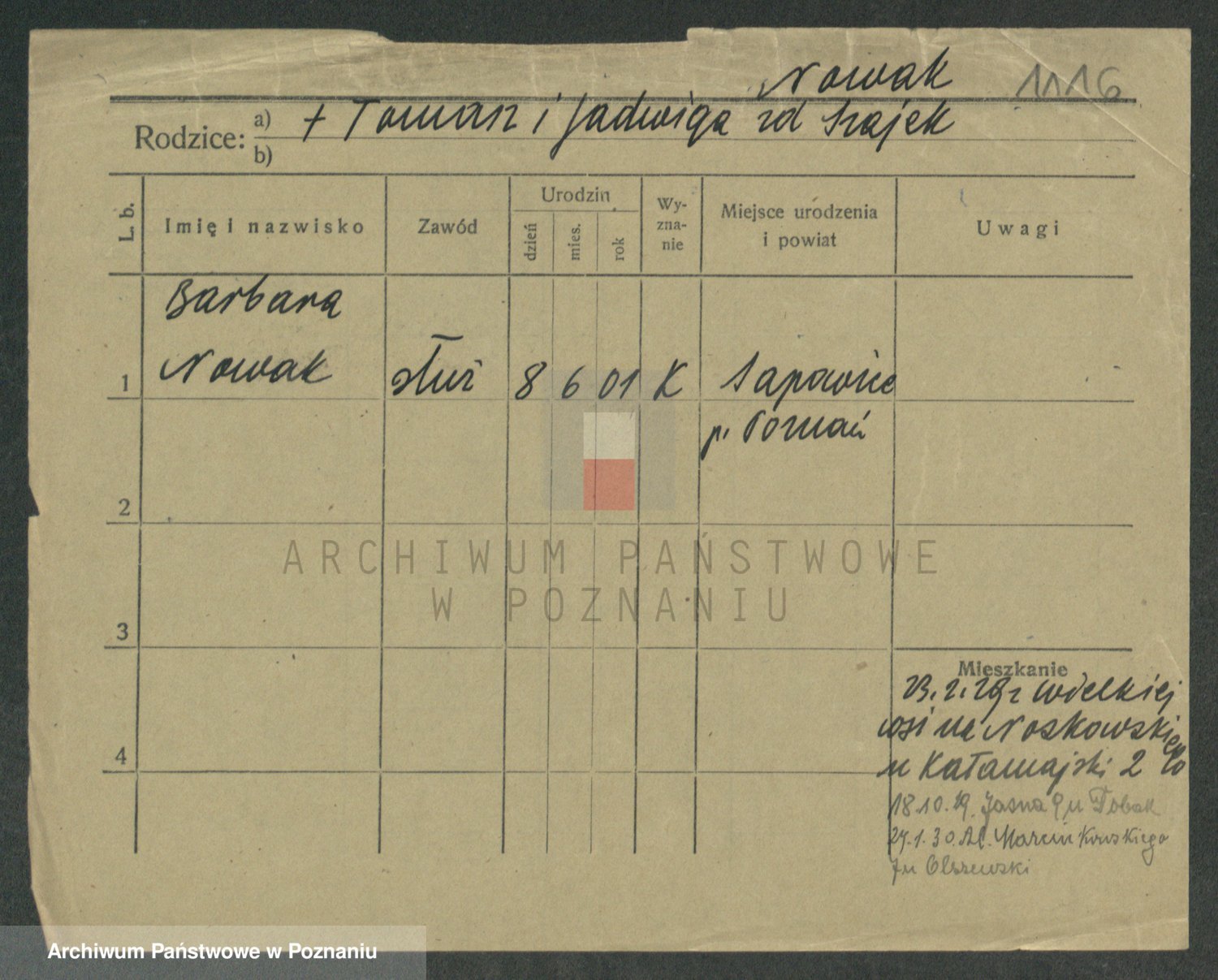 Podgląd karty osobowej dostępny jest po kliknięciu na nazwisko lub ikonkę karty. Można dokonywać powiększenia (ikony na górze) lub przechodzić między kolejnymi skanami (strzałki po bokach).