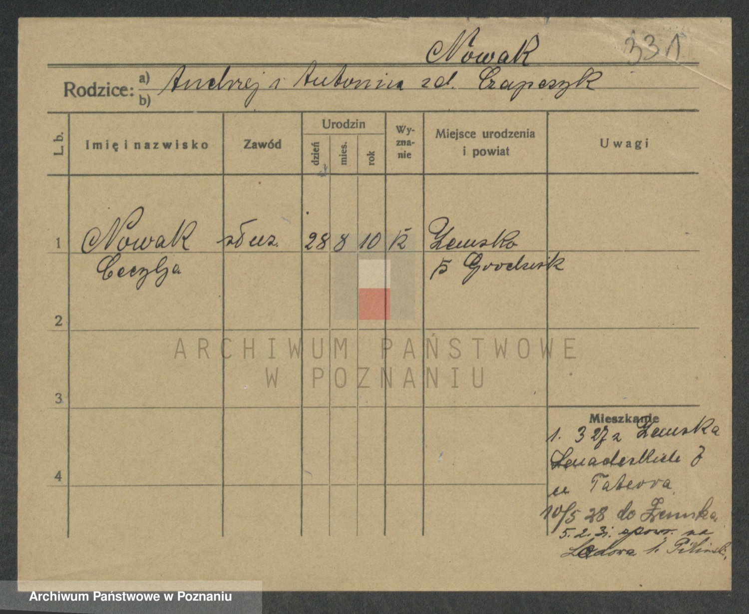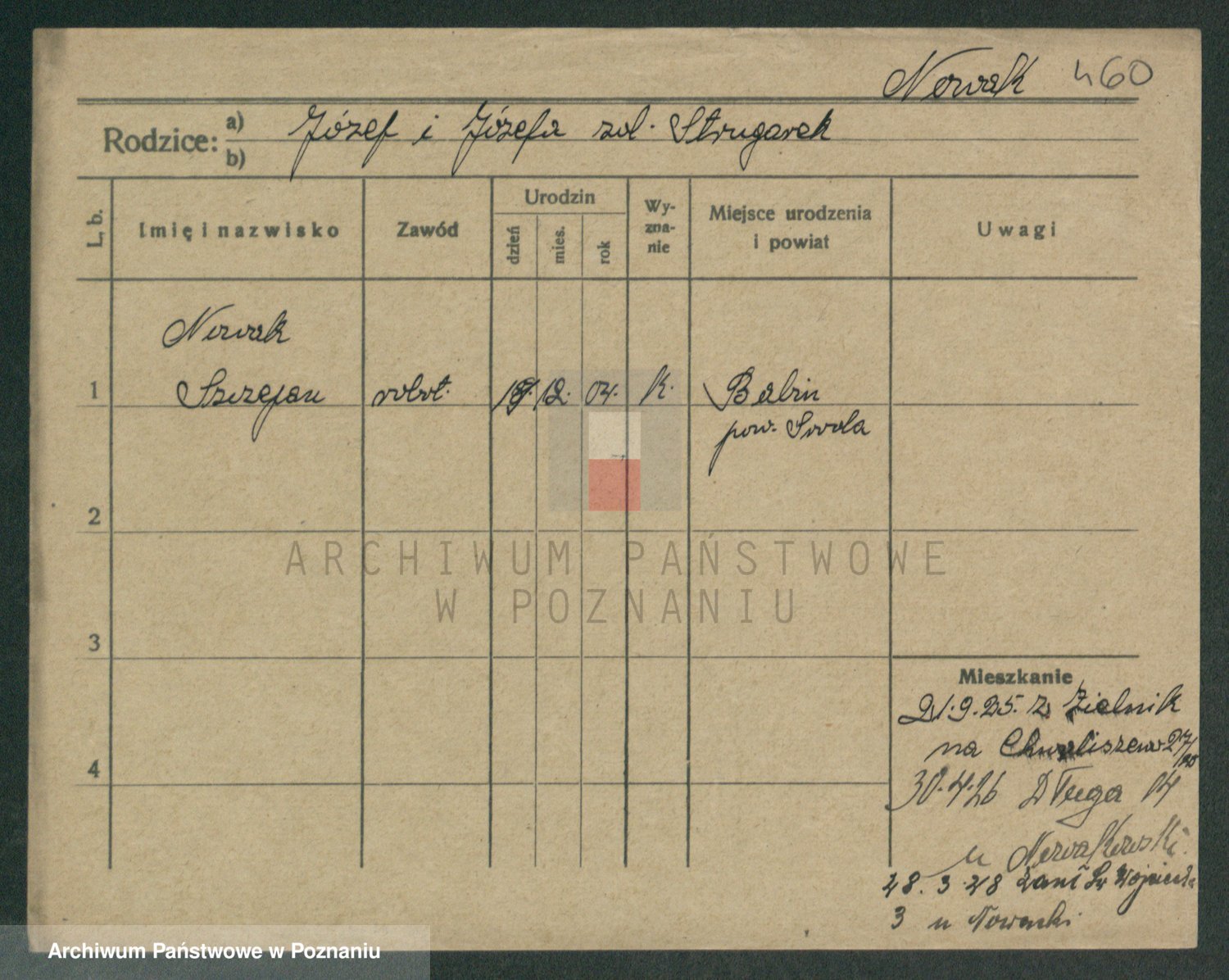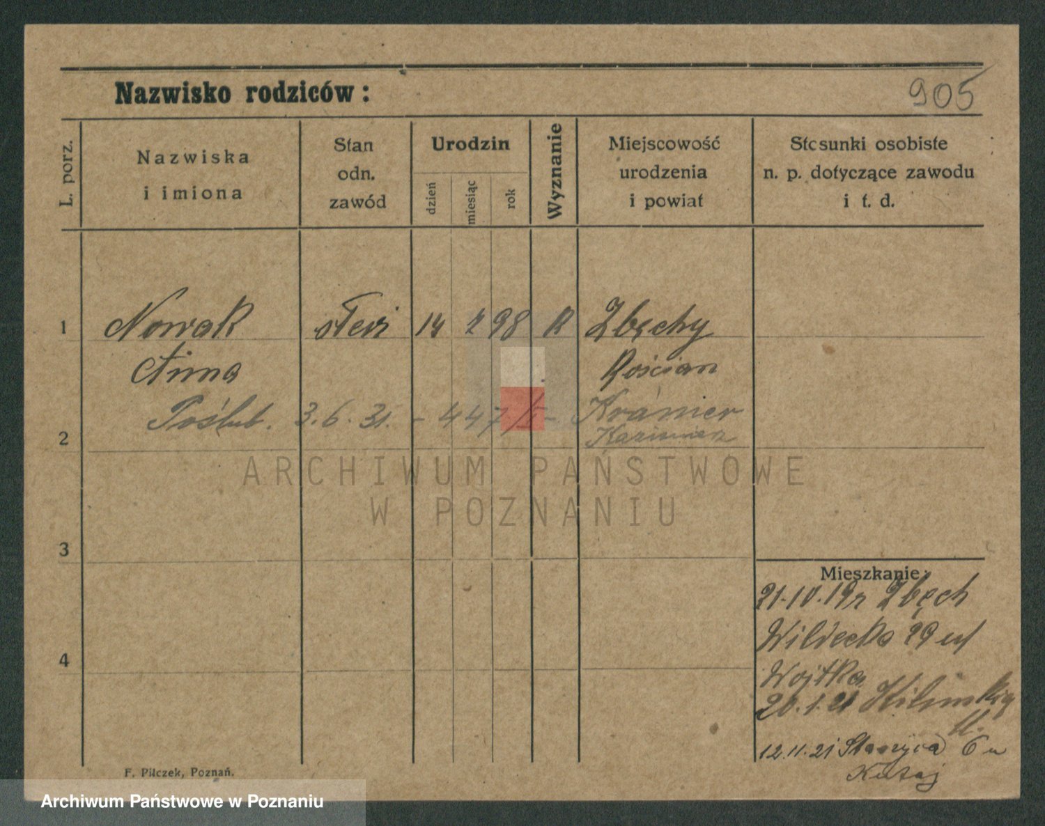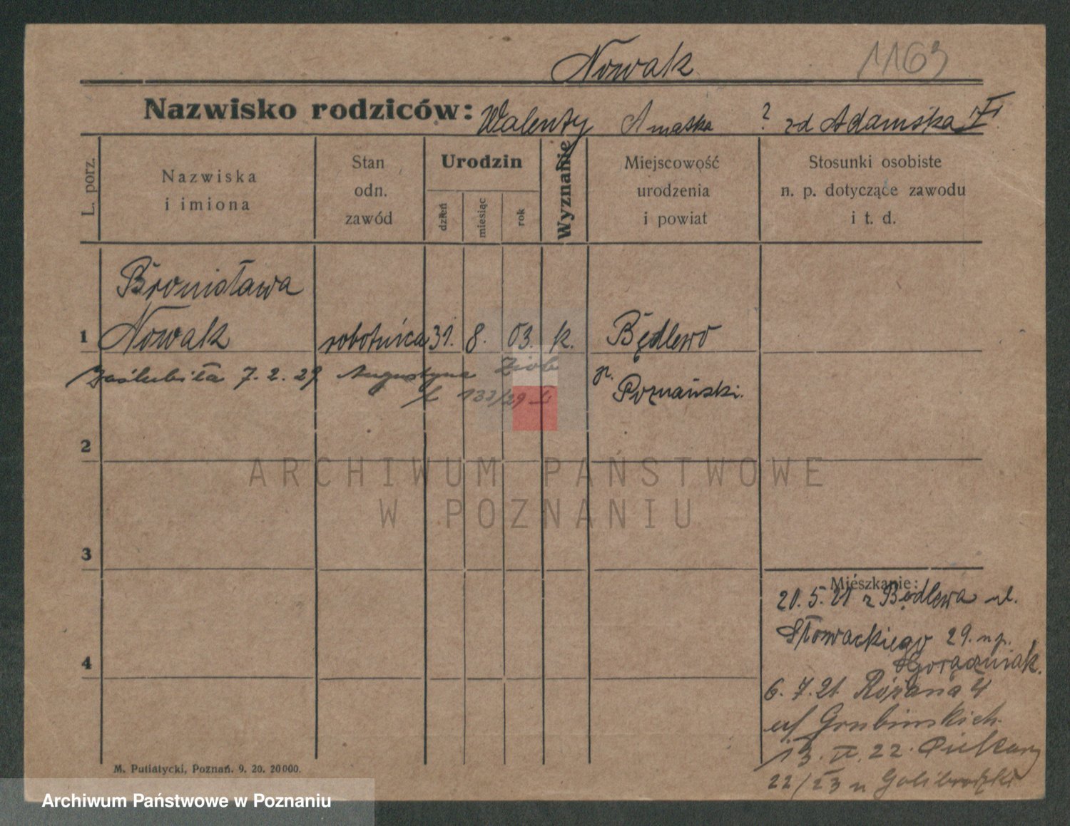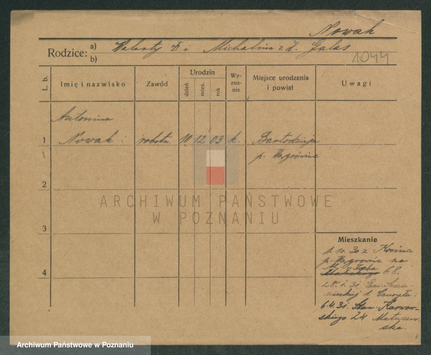 Podgląd karty osobowej dostępny jest po kliknięciu na nazwisko lub ikonkę karty. Można dokonywać powiększenia (ikony na górze) lub przechodzić między kolejnymi skanami (strzałki po bokach).