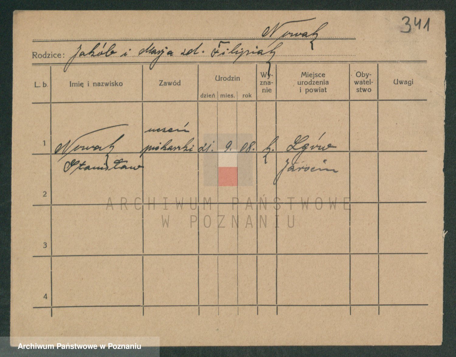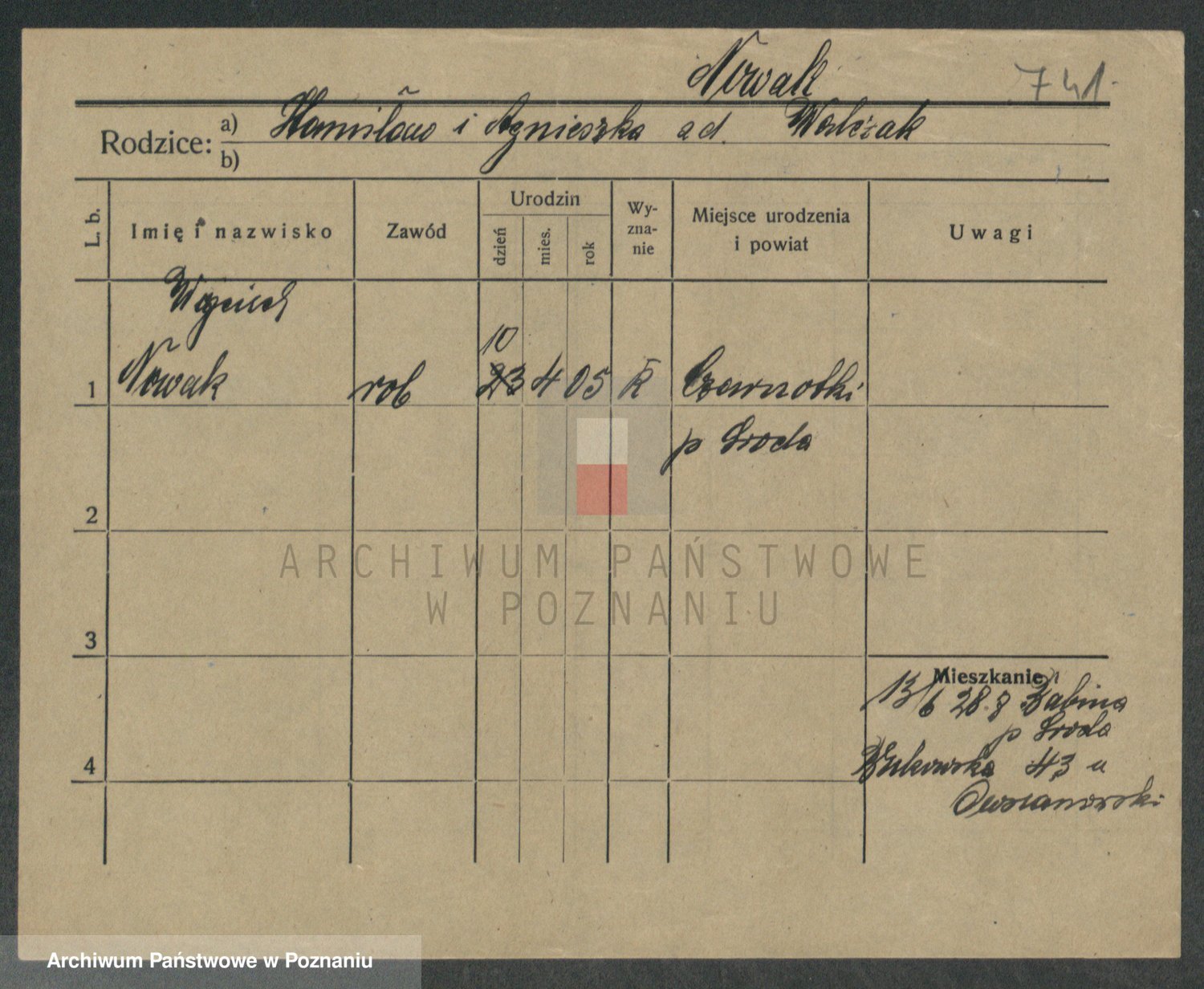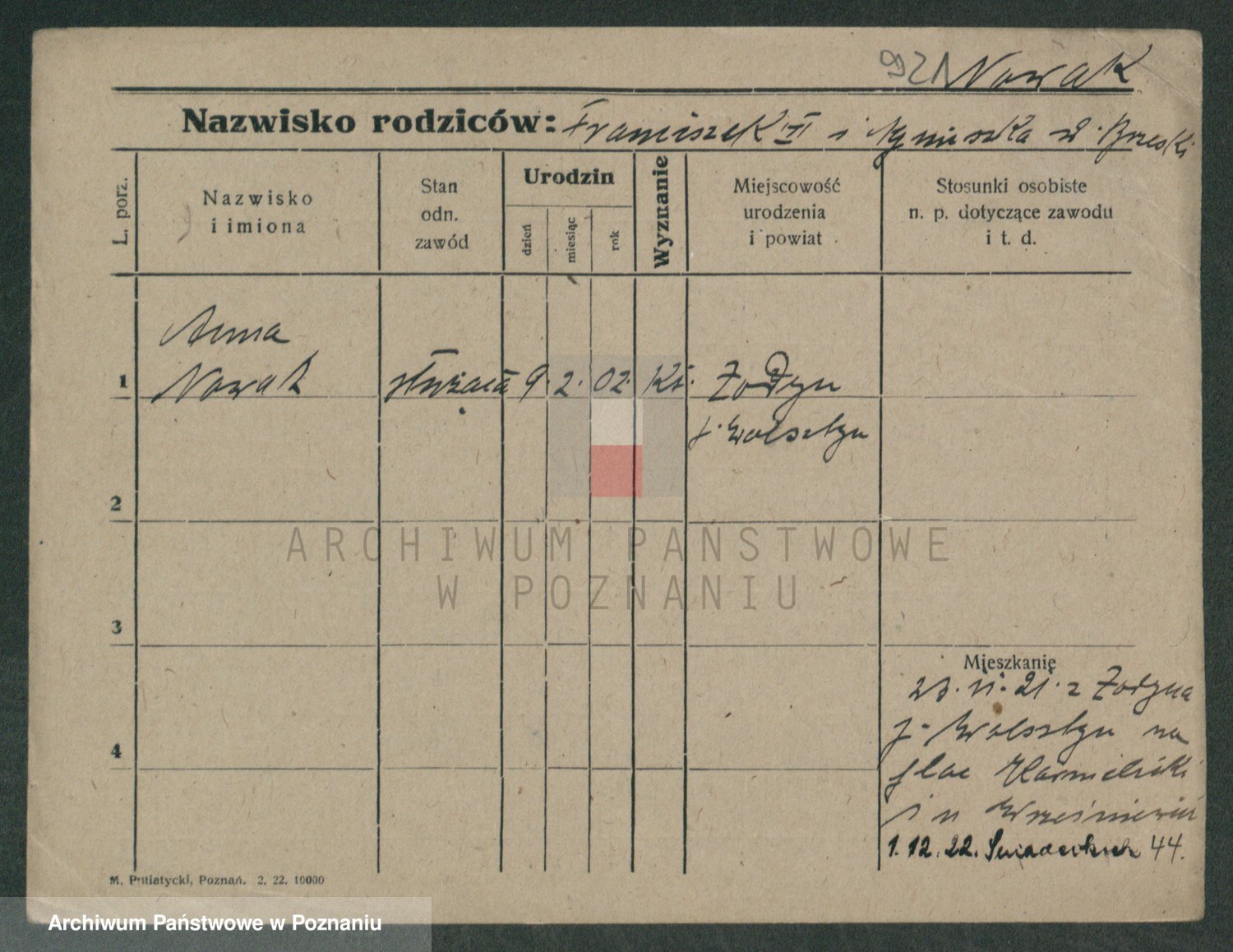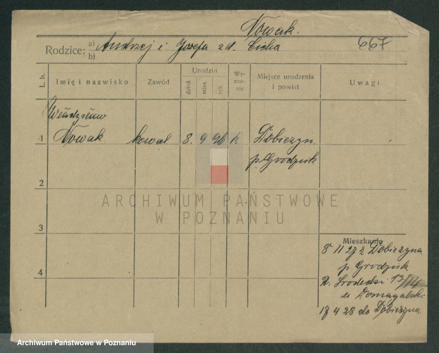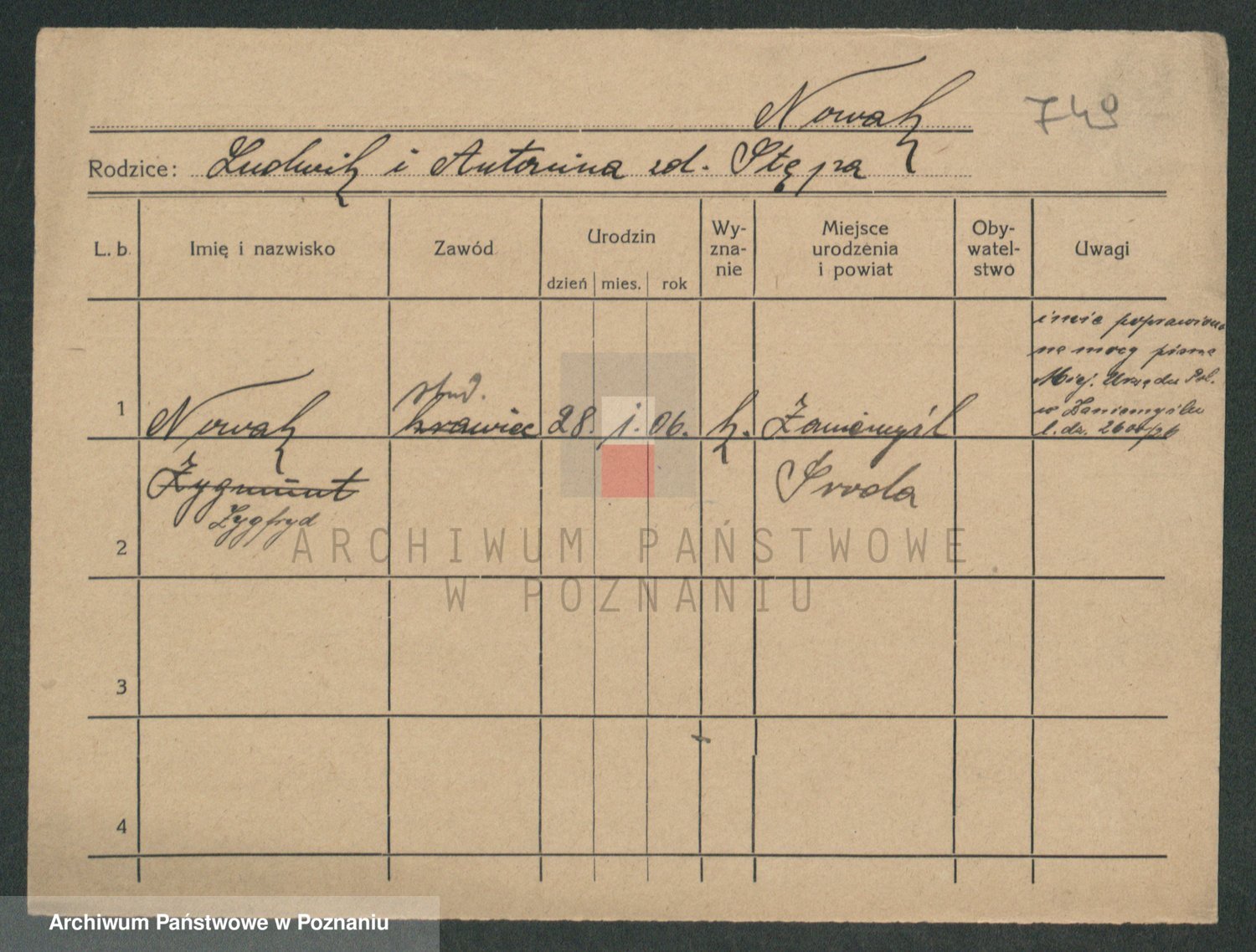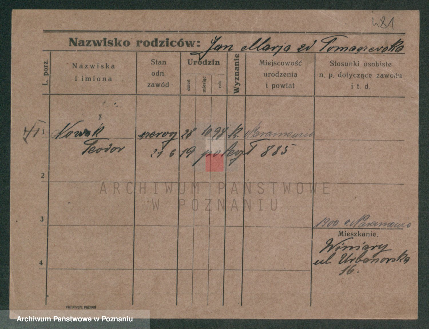 Podgląd karty osobowej dostępny jest po kliknięciu na nazwisko lub ikonkę karty. Można dokonywać powiększenia (ikony na górze) lub przechodzić między kolejnymi skanami (strzałki po bokach).