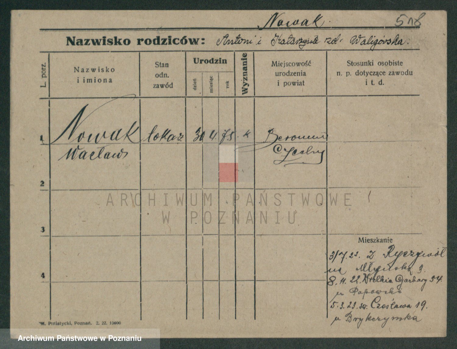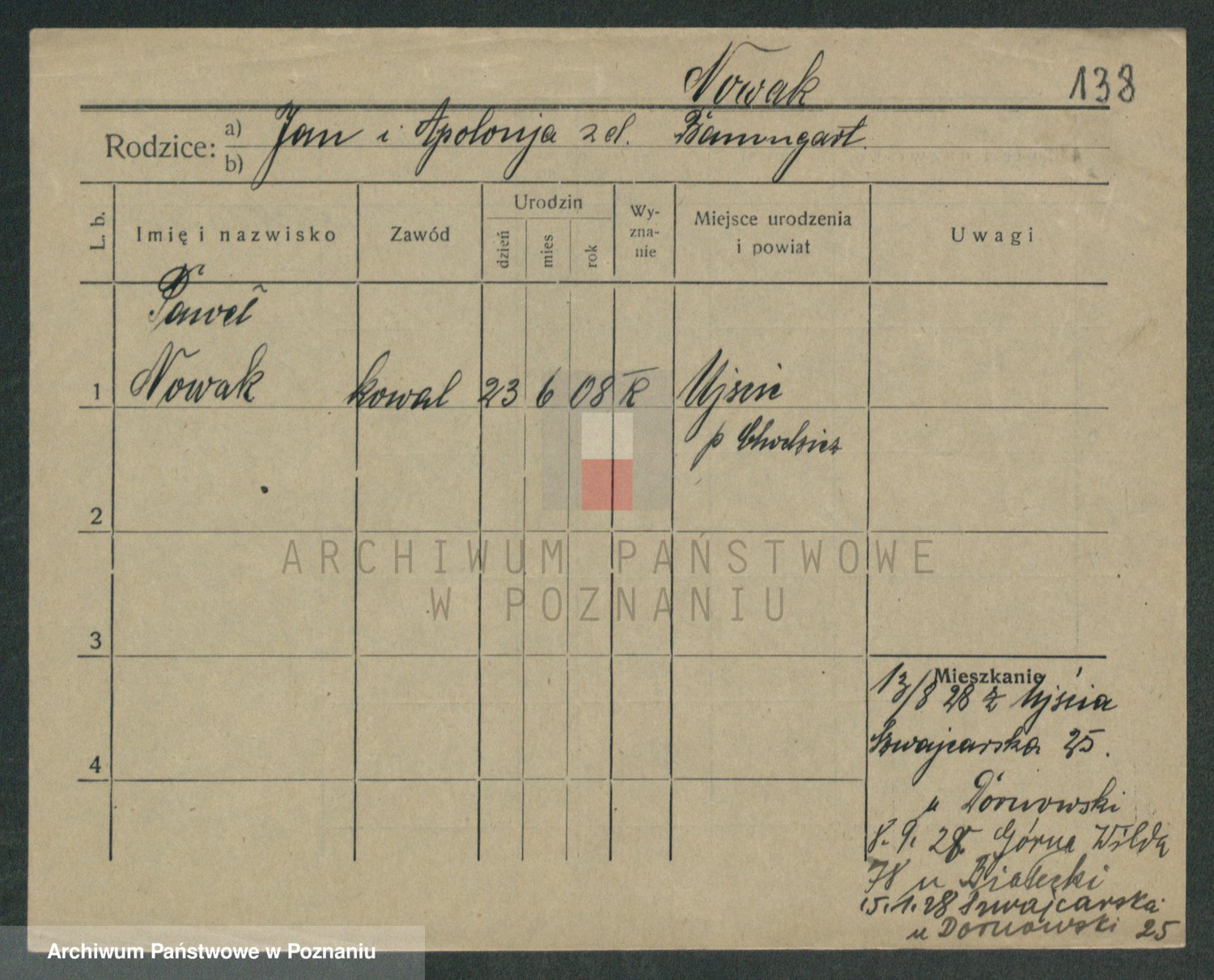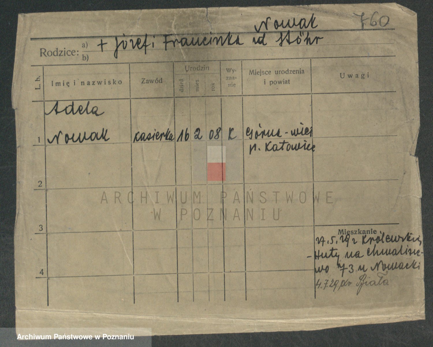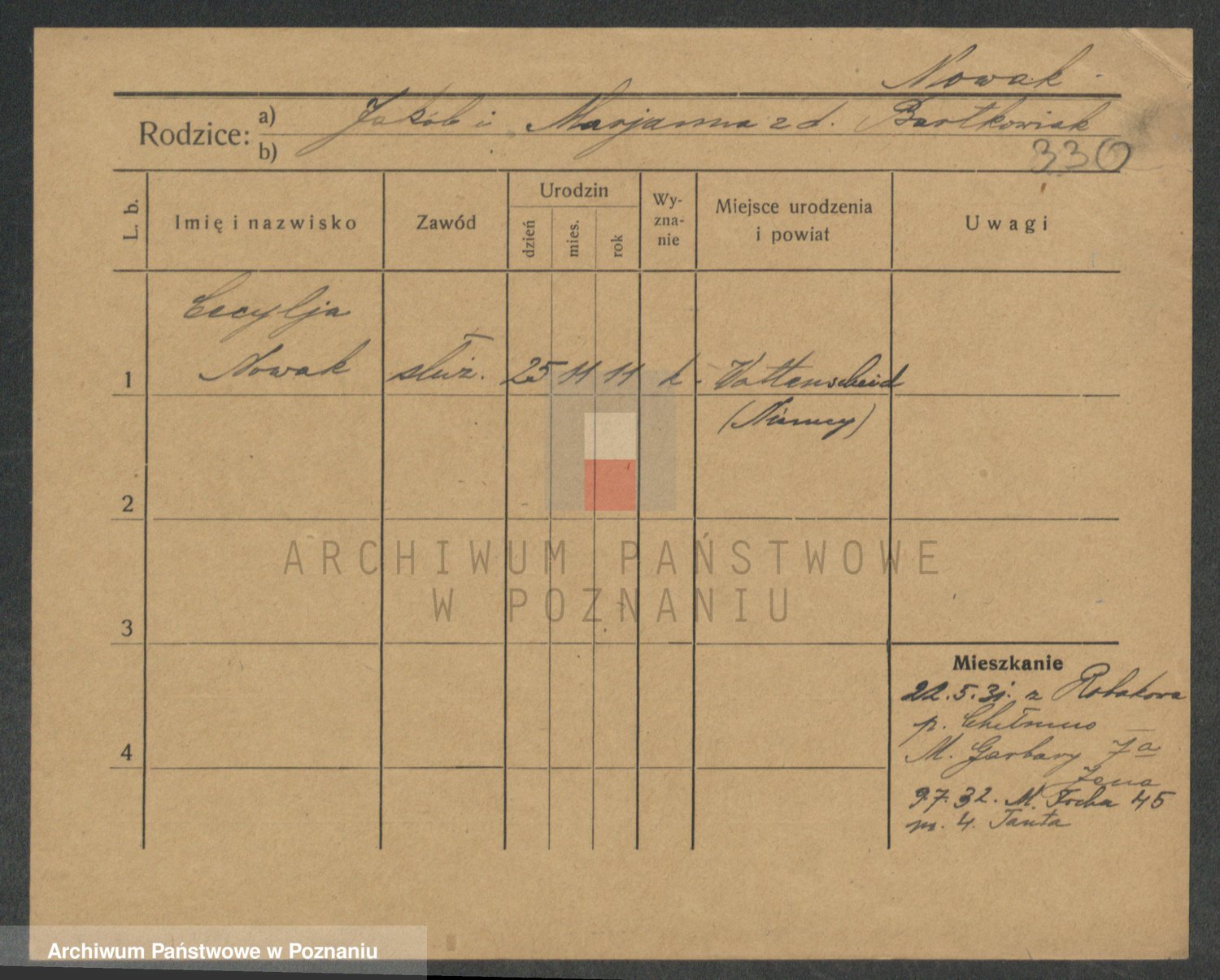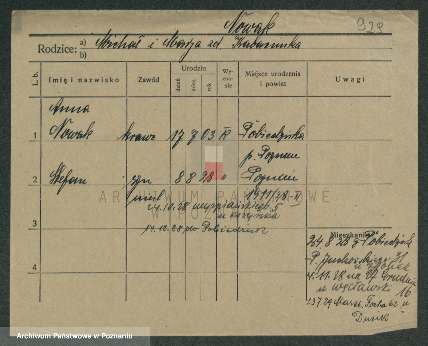 Podgląd karty osobowej dostępny jest po kliknięciu na nazwisko lub ikonkę karty. Można dokonywać powiększenia (ikony na górze) lub przechodzić między kolejnymi skanami (strzałki po bokach).