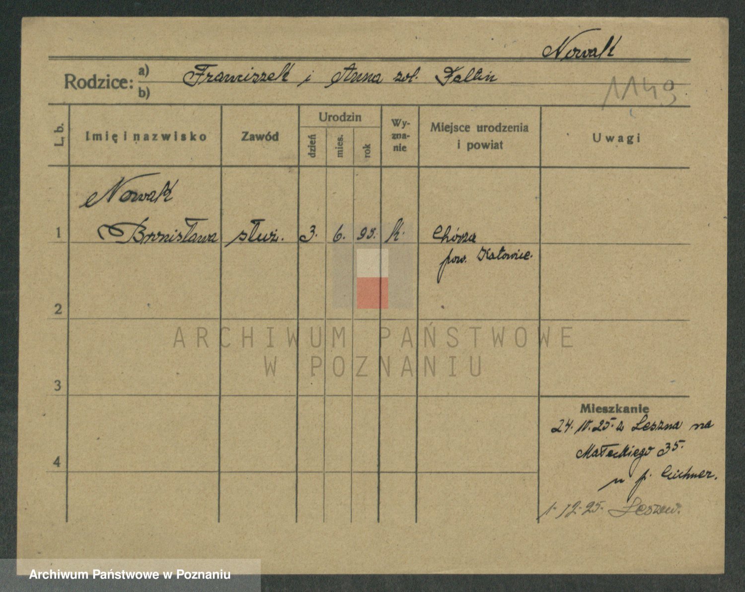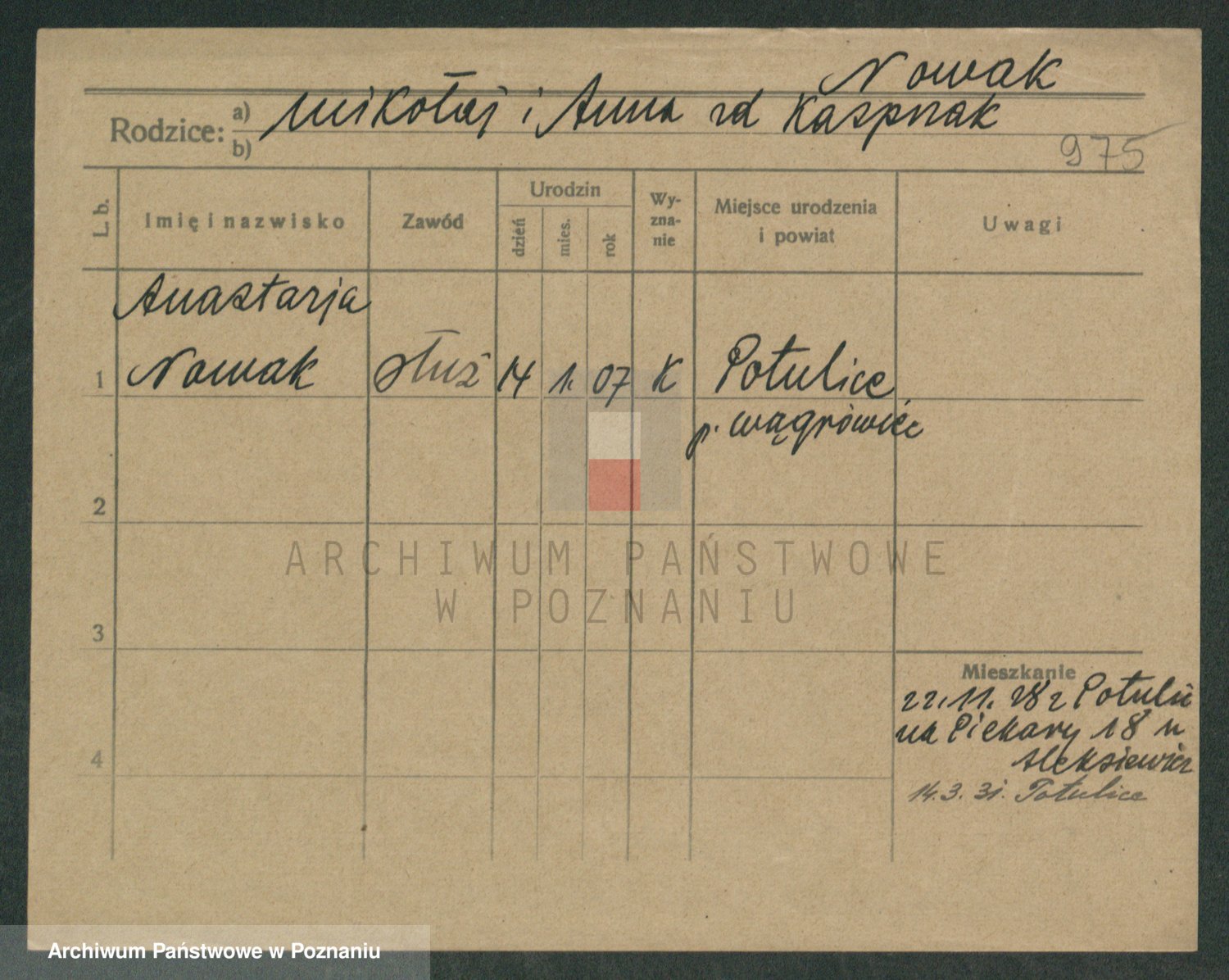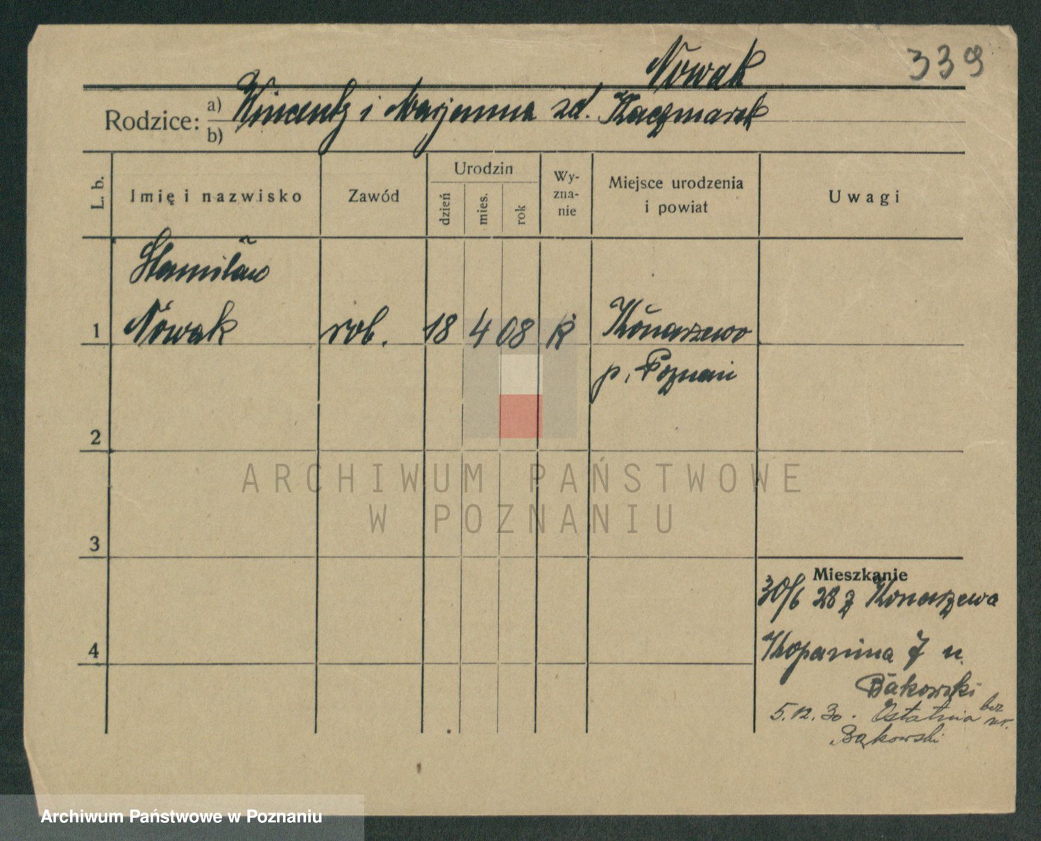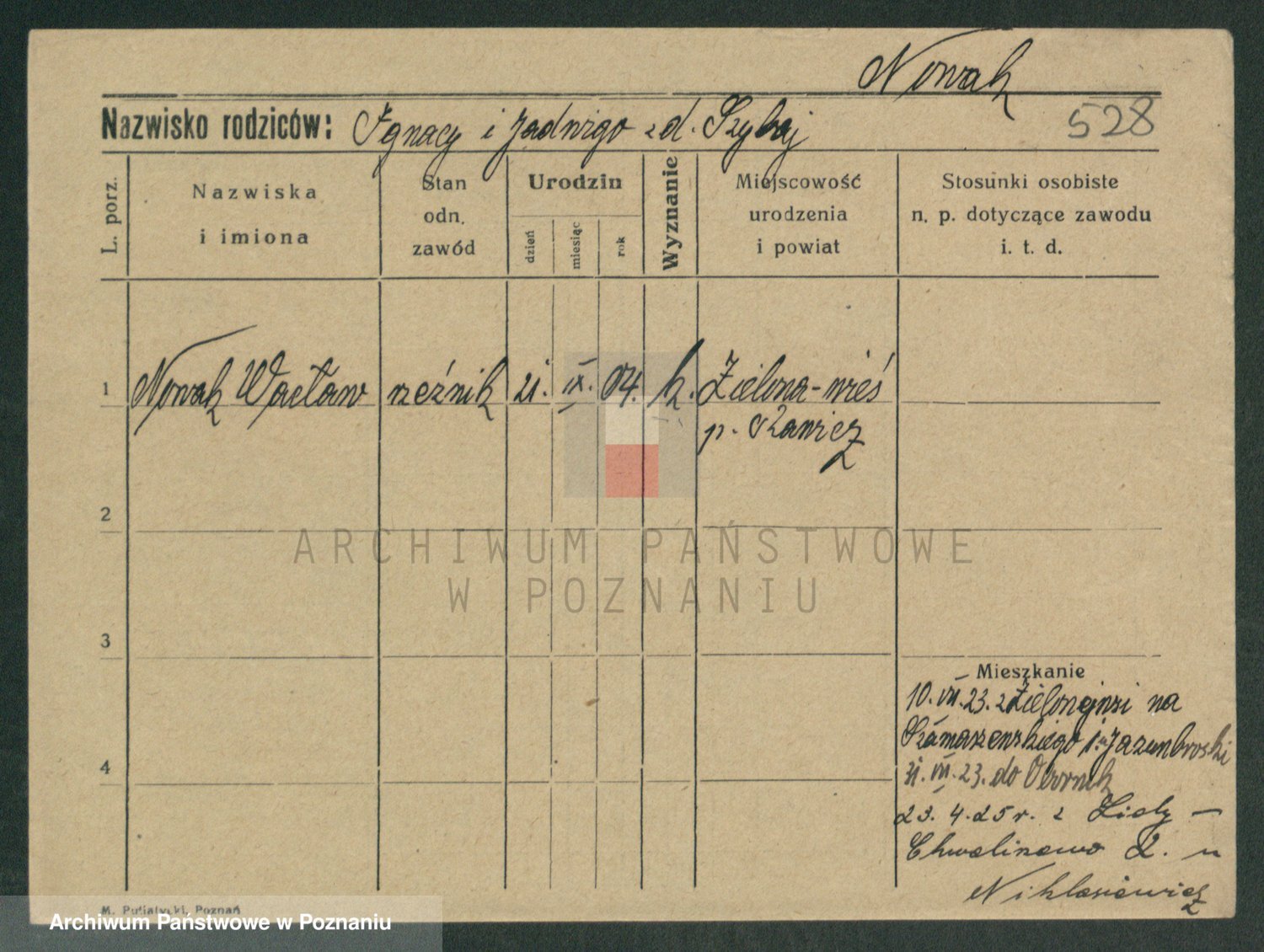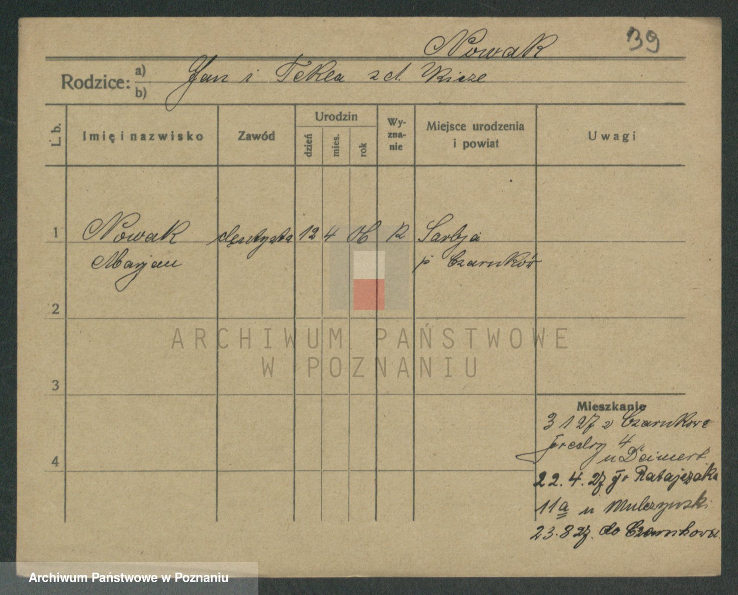 Podgląd karty osobowej dostępny jest po kliknięciu na nazwisko lub ikonkę karty. Można dokonywać powiększenia (ikony na górze) lub przechodzić między kolejnymi skanami (strzałki po bokach).