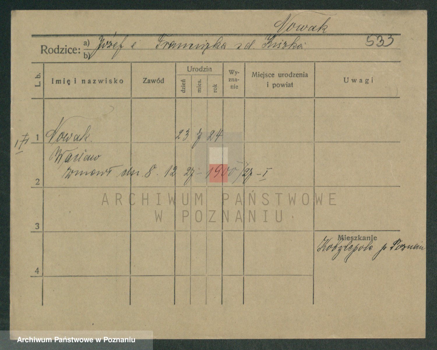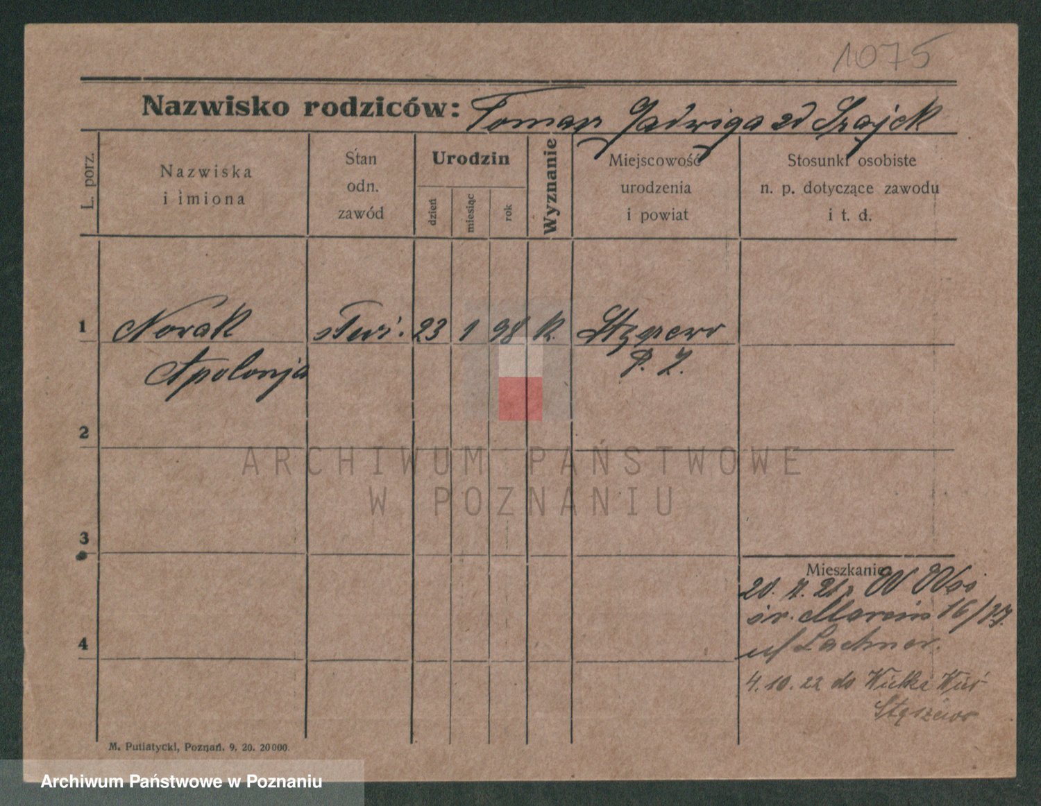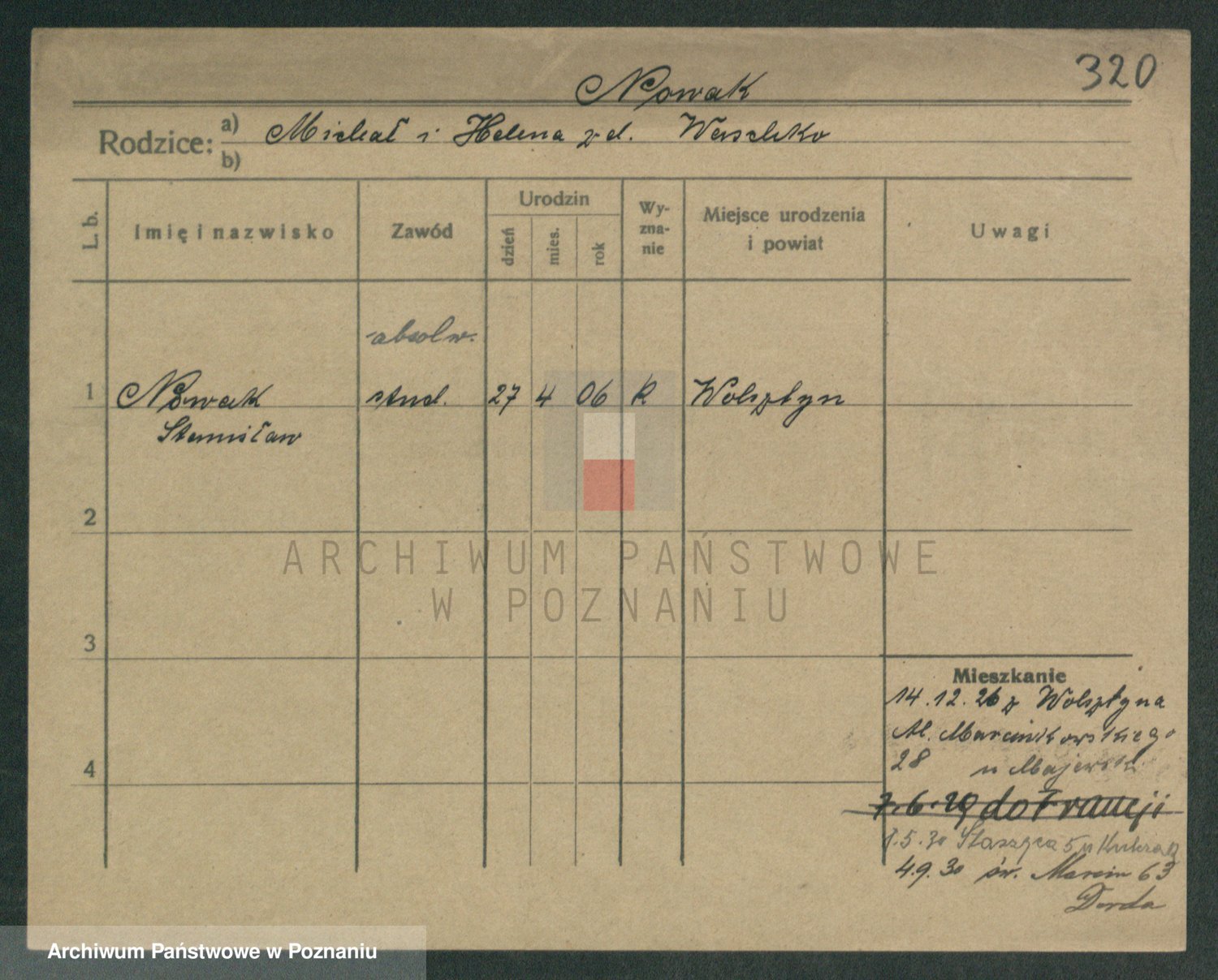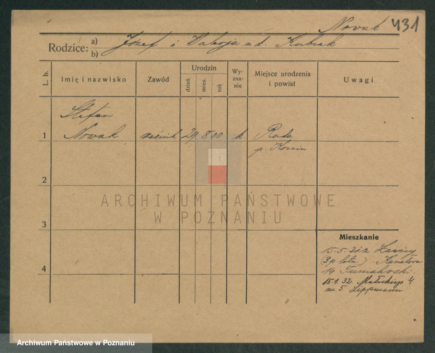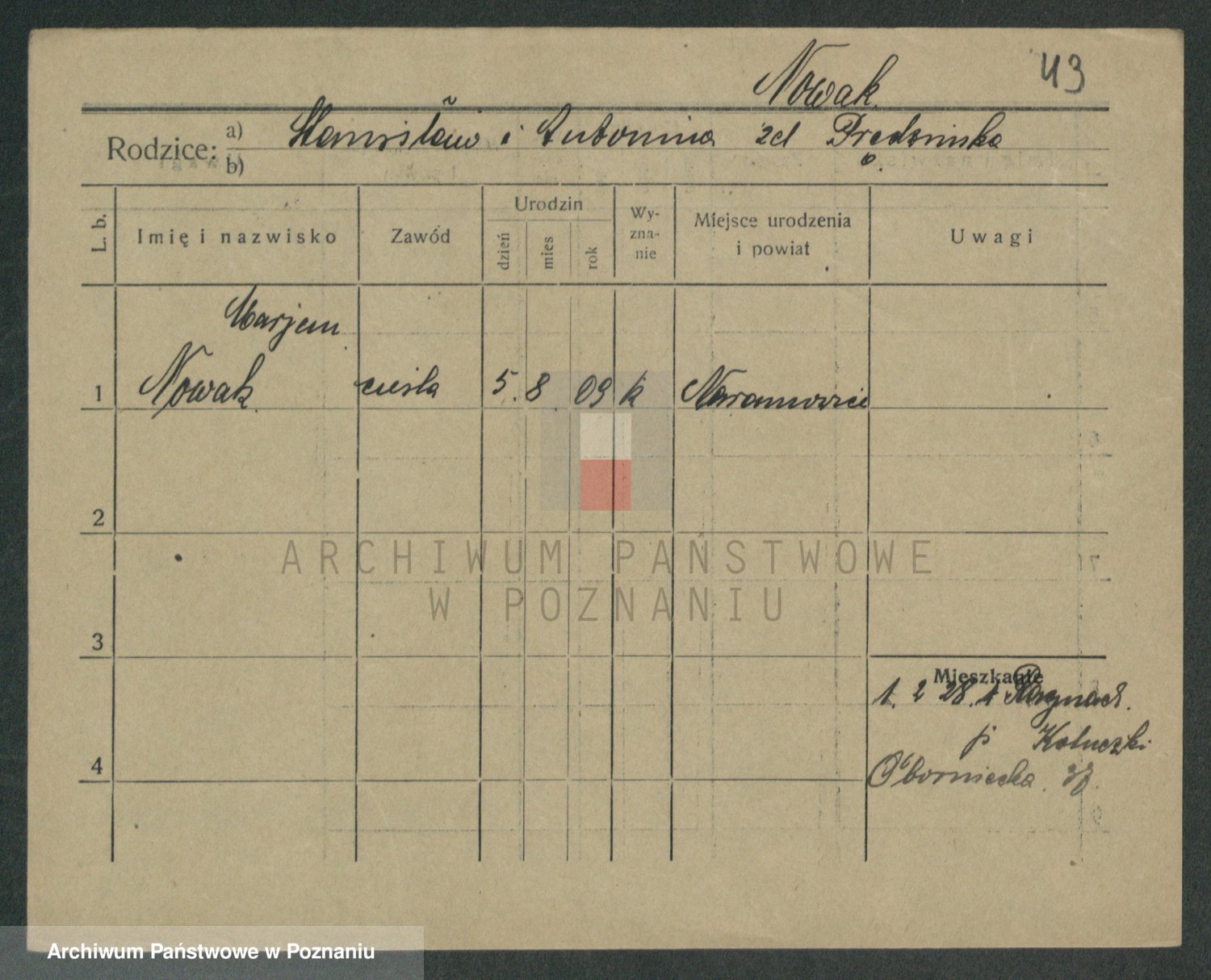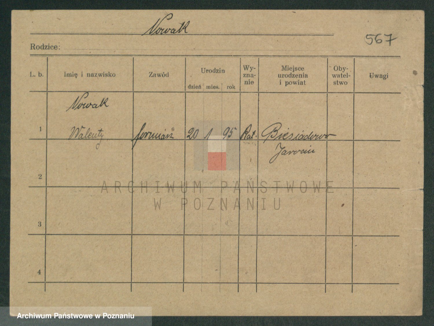 Podgląd karty osobowej dostępny jest po kliknięciu na nazwisko lub ikonkę karty. Można dokonywać powiększenia (ikony na górze) lub przechodzić między kolejnymi skanami (strzałki po bokach).