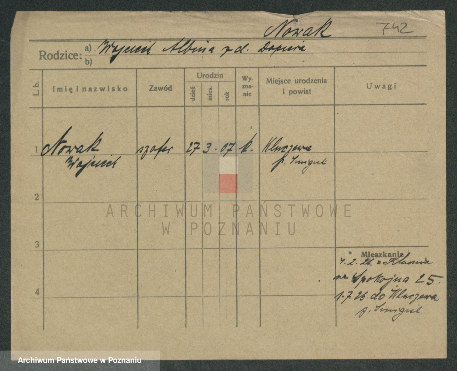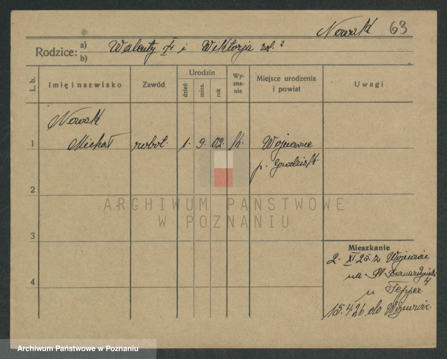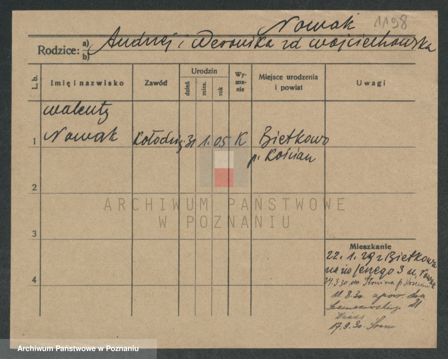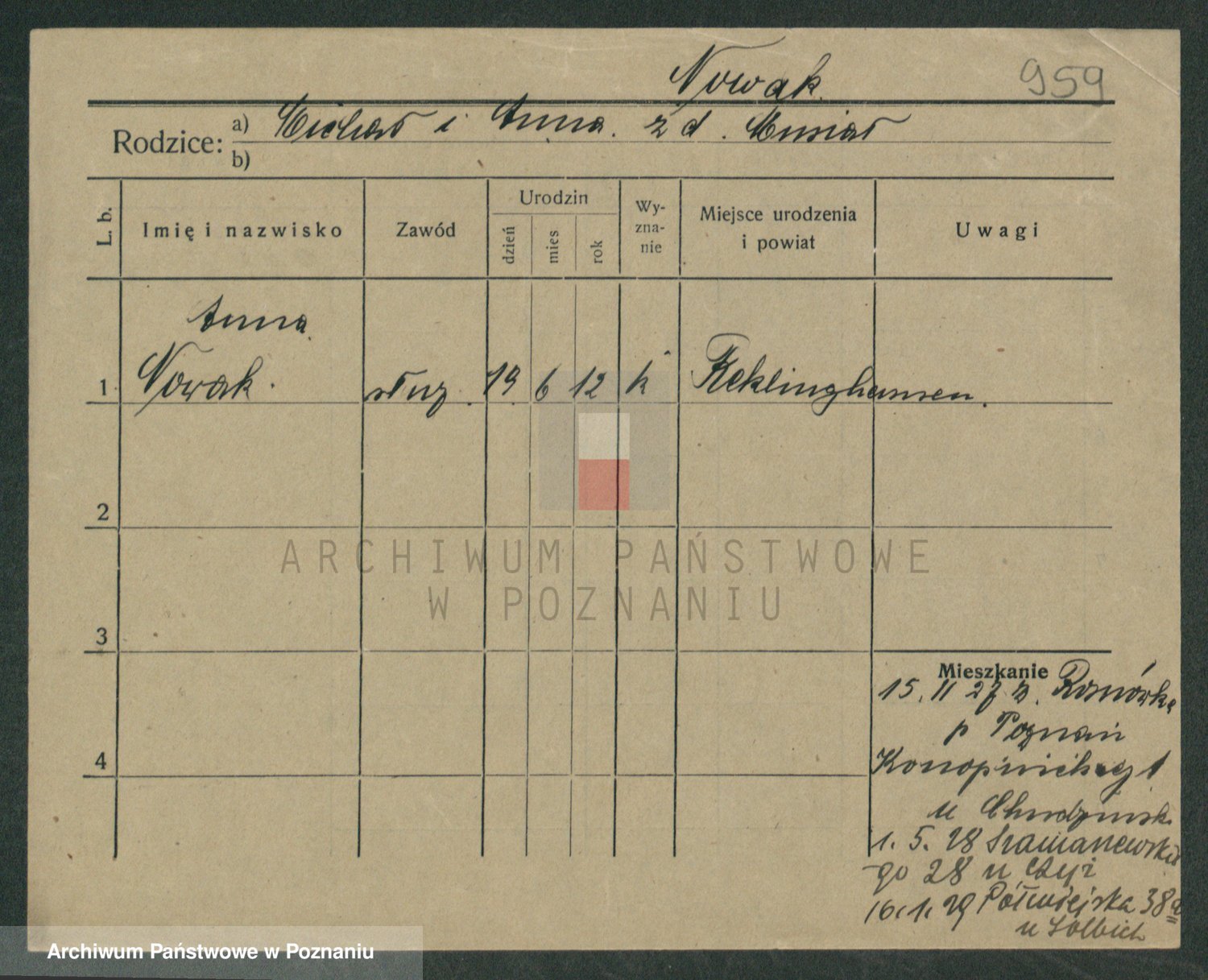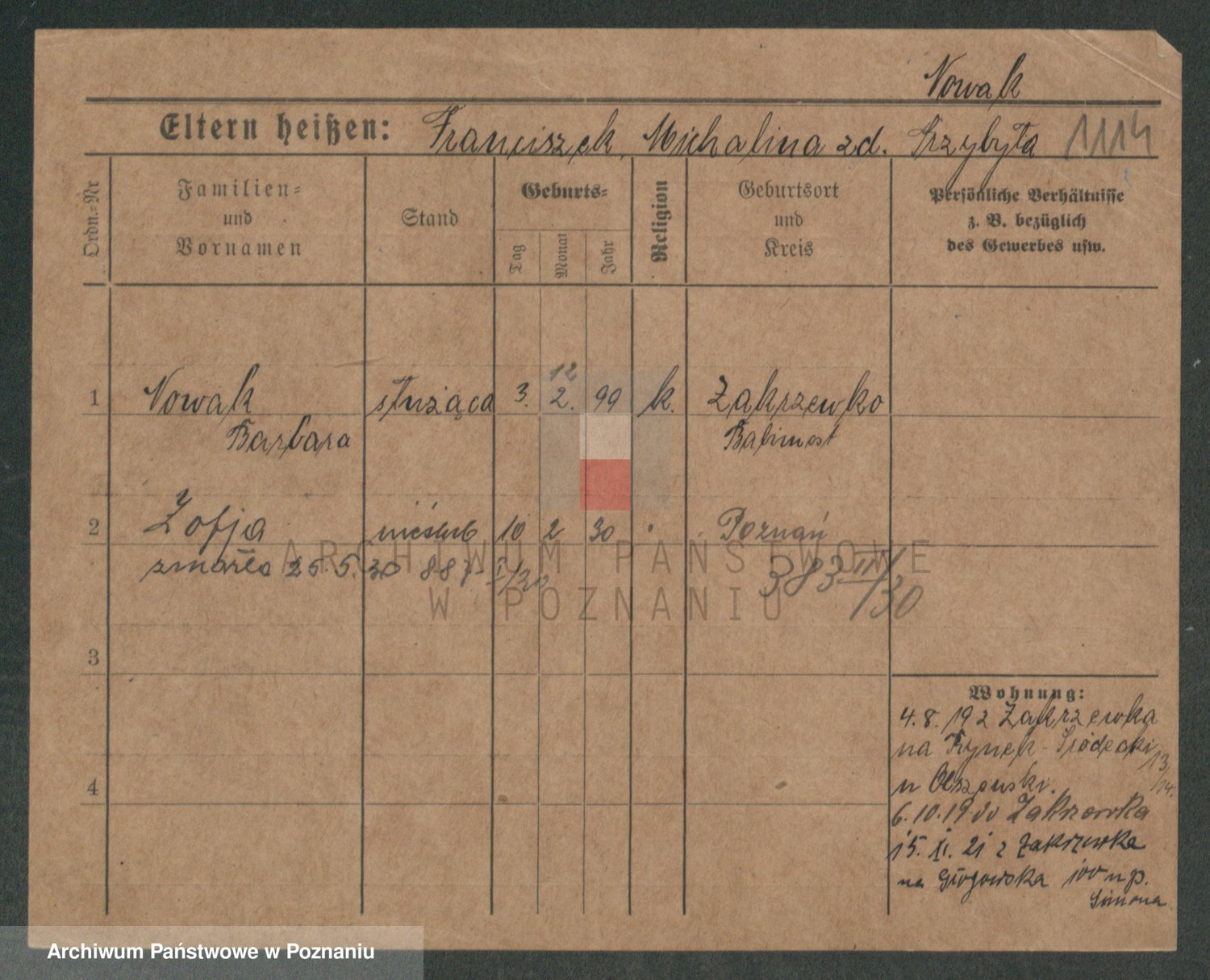 Podgląd karty osobowej dostępny jest po kliknięciu na nazwisko lub ikonkę karty. Można dokonywać powiększenia (ikony na górze) lub przechodzić między kolejnymi skanami (strzałki po bokach).
