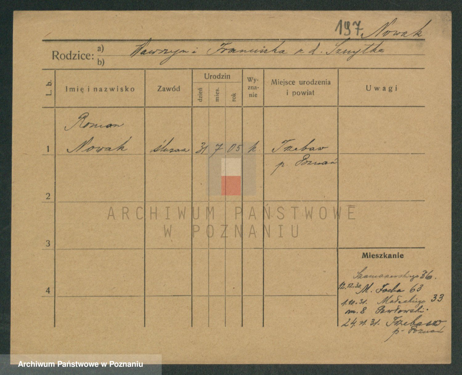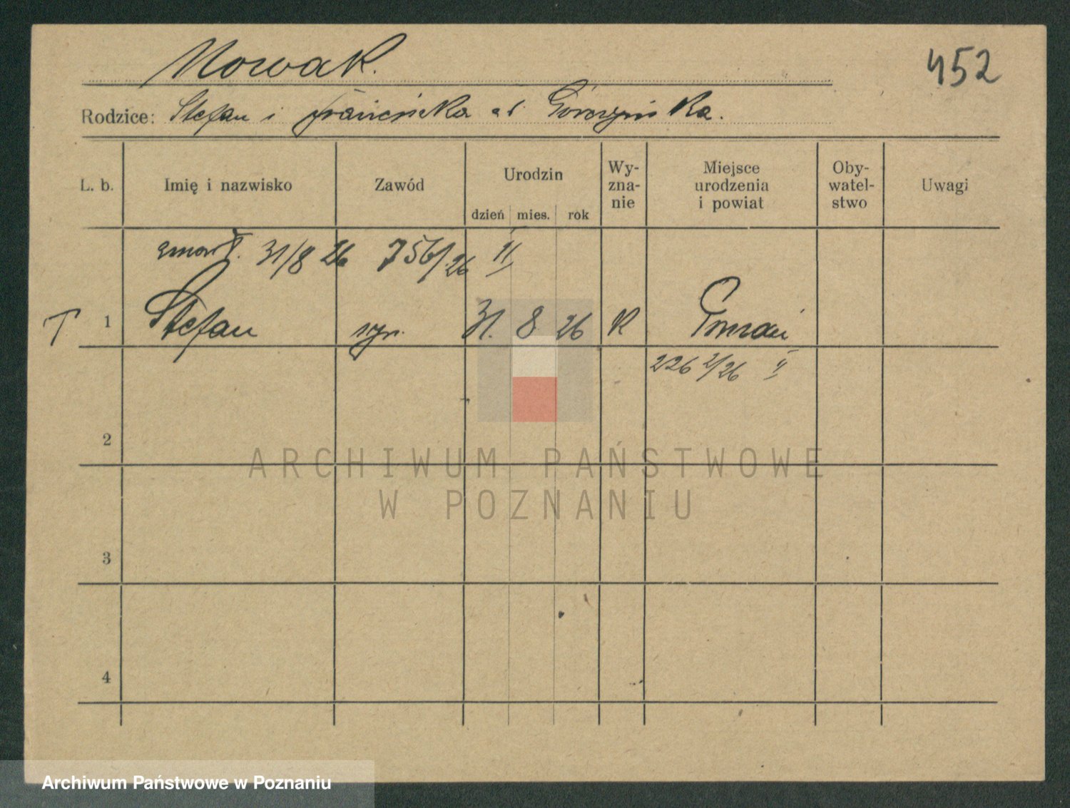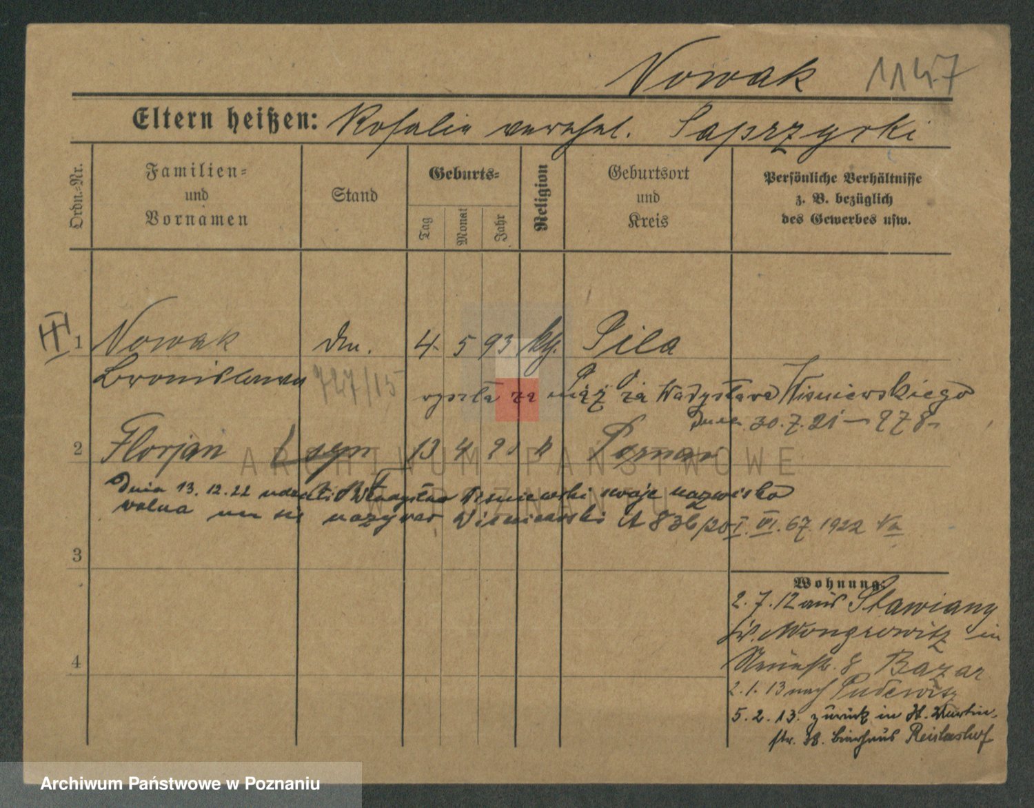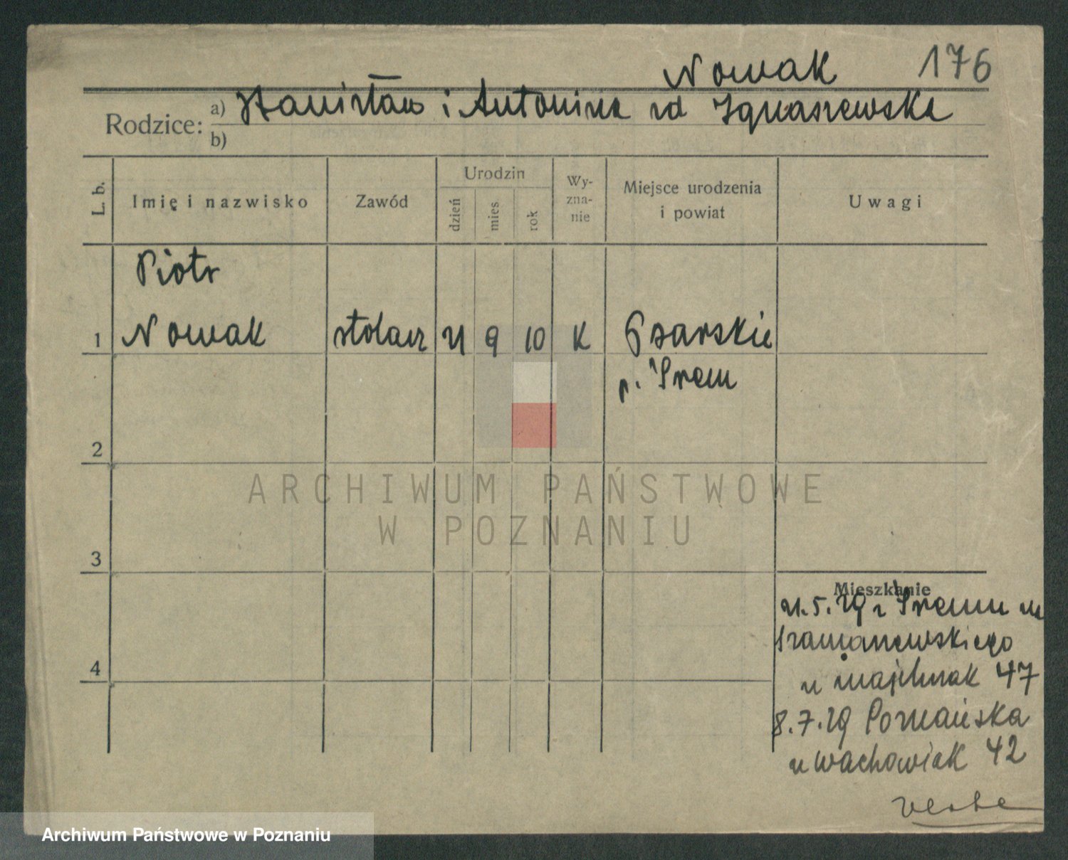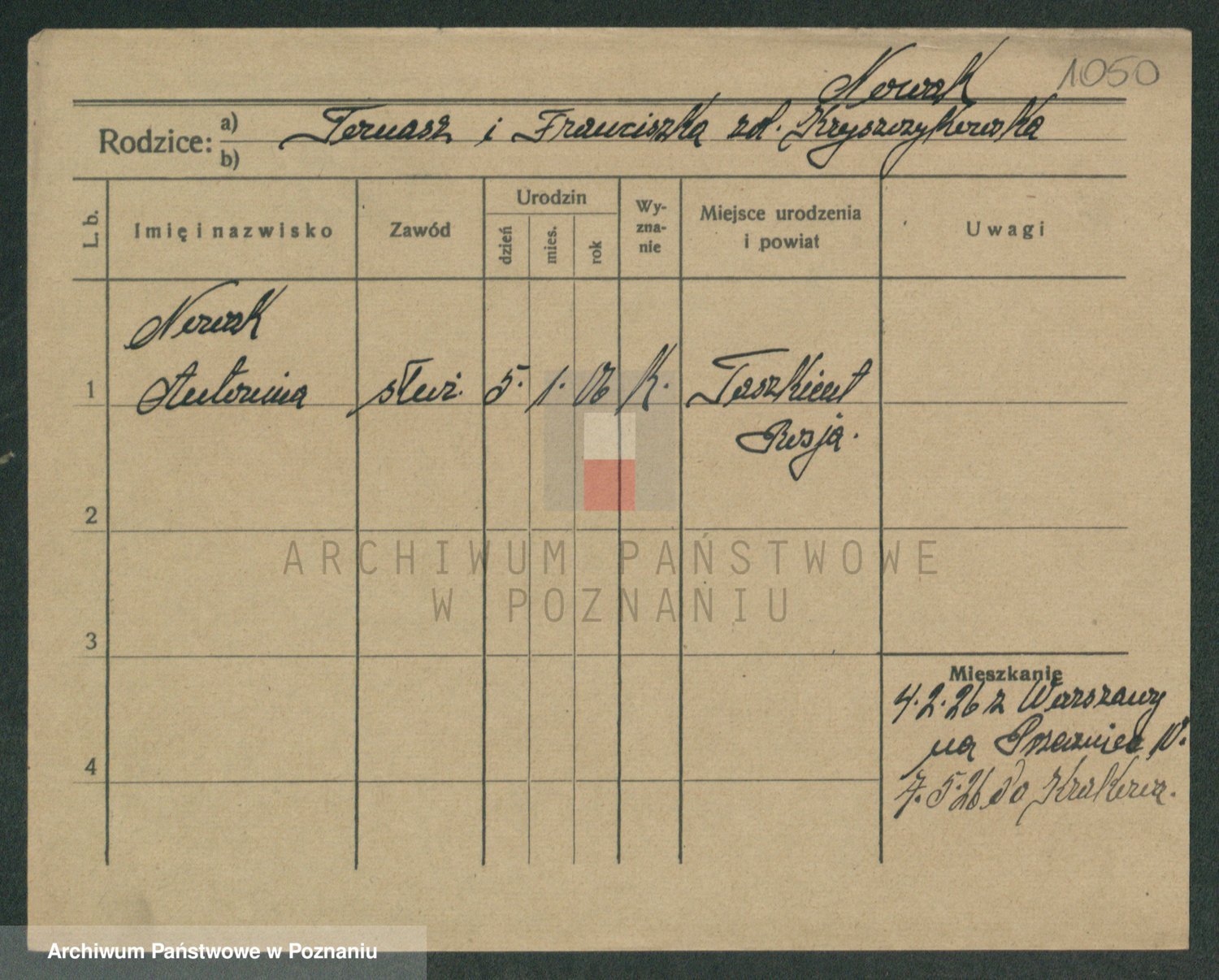 Podgląd karty osobowej dostępny jest po kliknięciu na nazwisko lub ikonkę karty. Można dokonywać powiększenia (ikony na górze) lub przechodzić między kolejnymi skanami (strzałki po bokach).