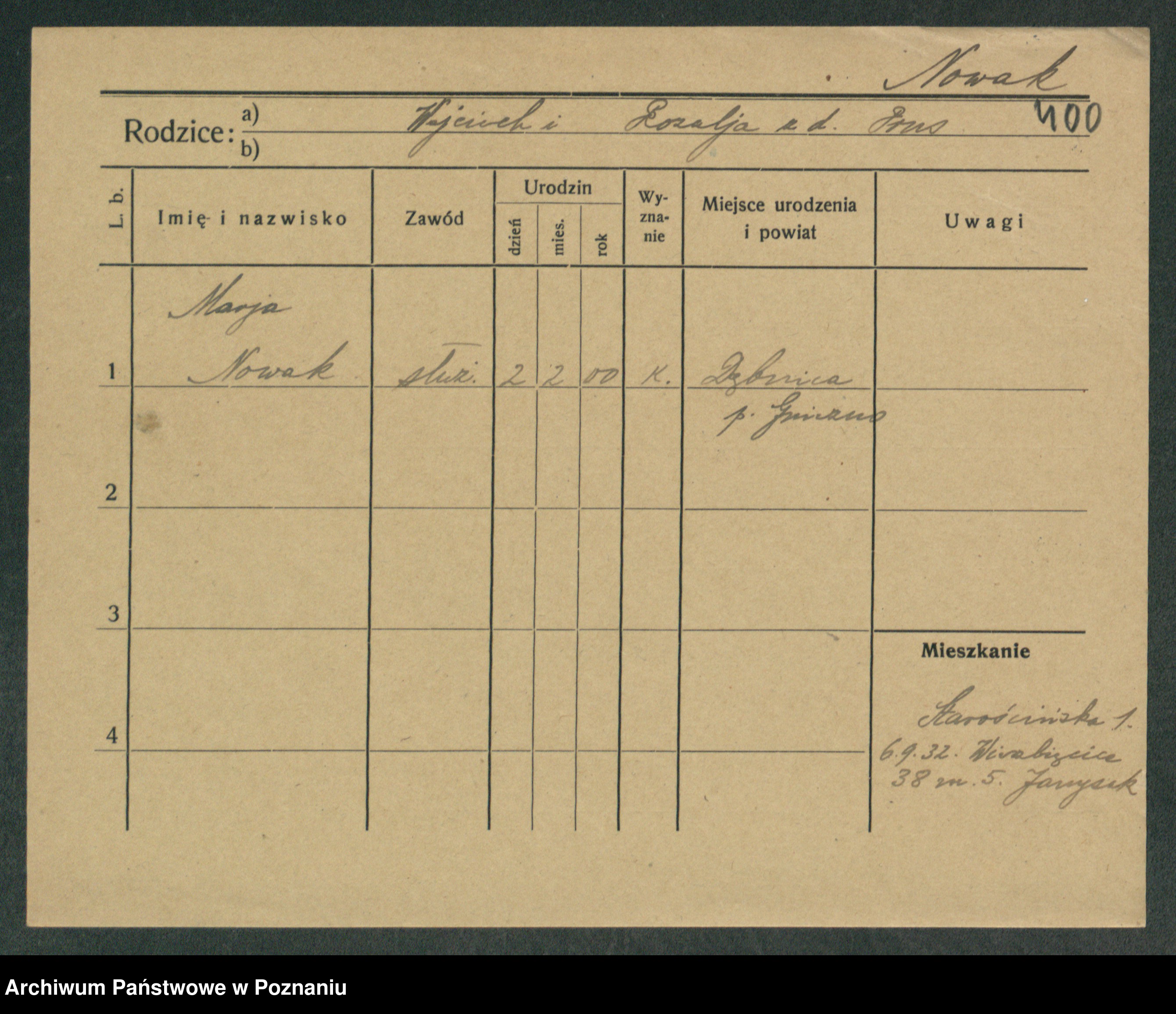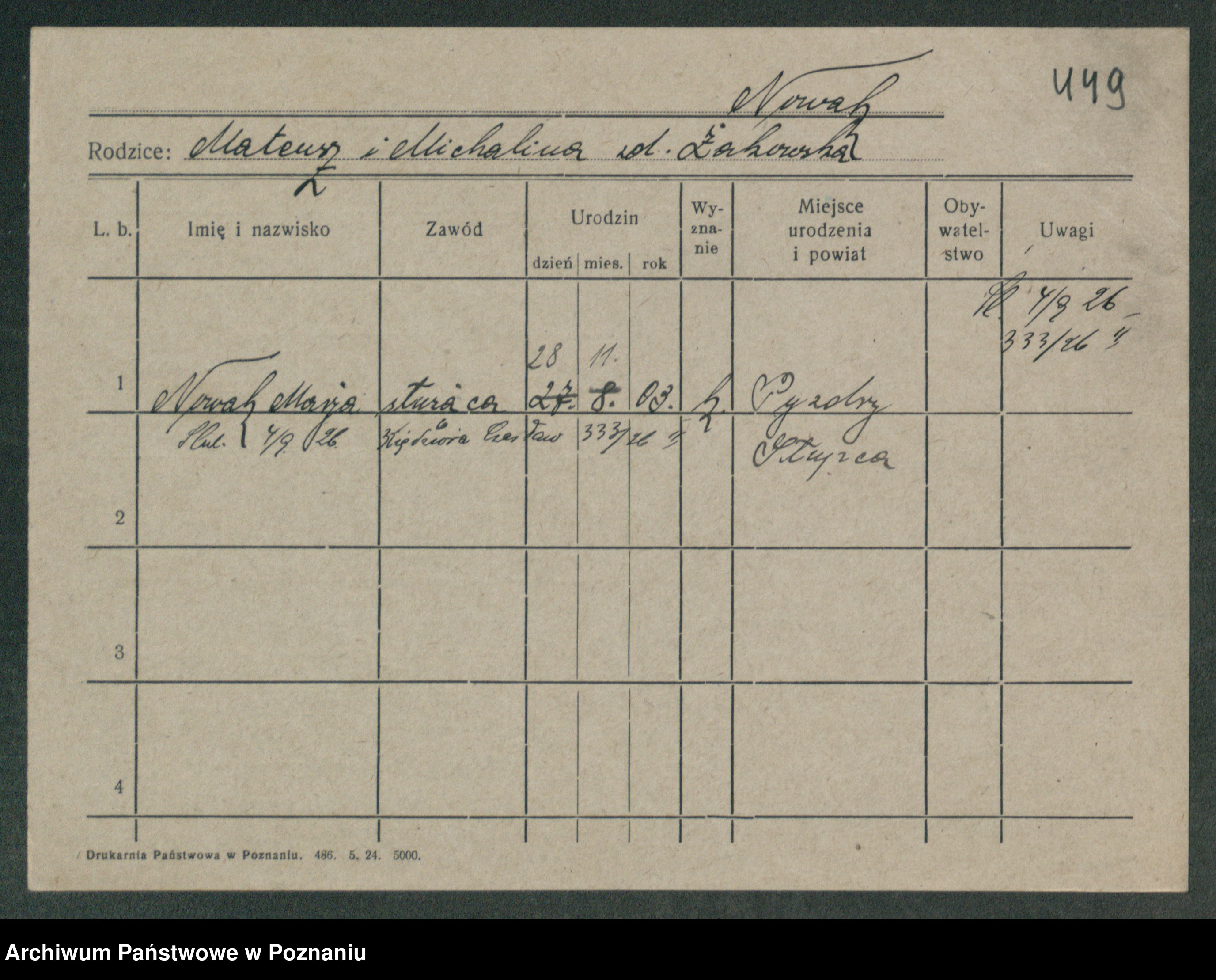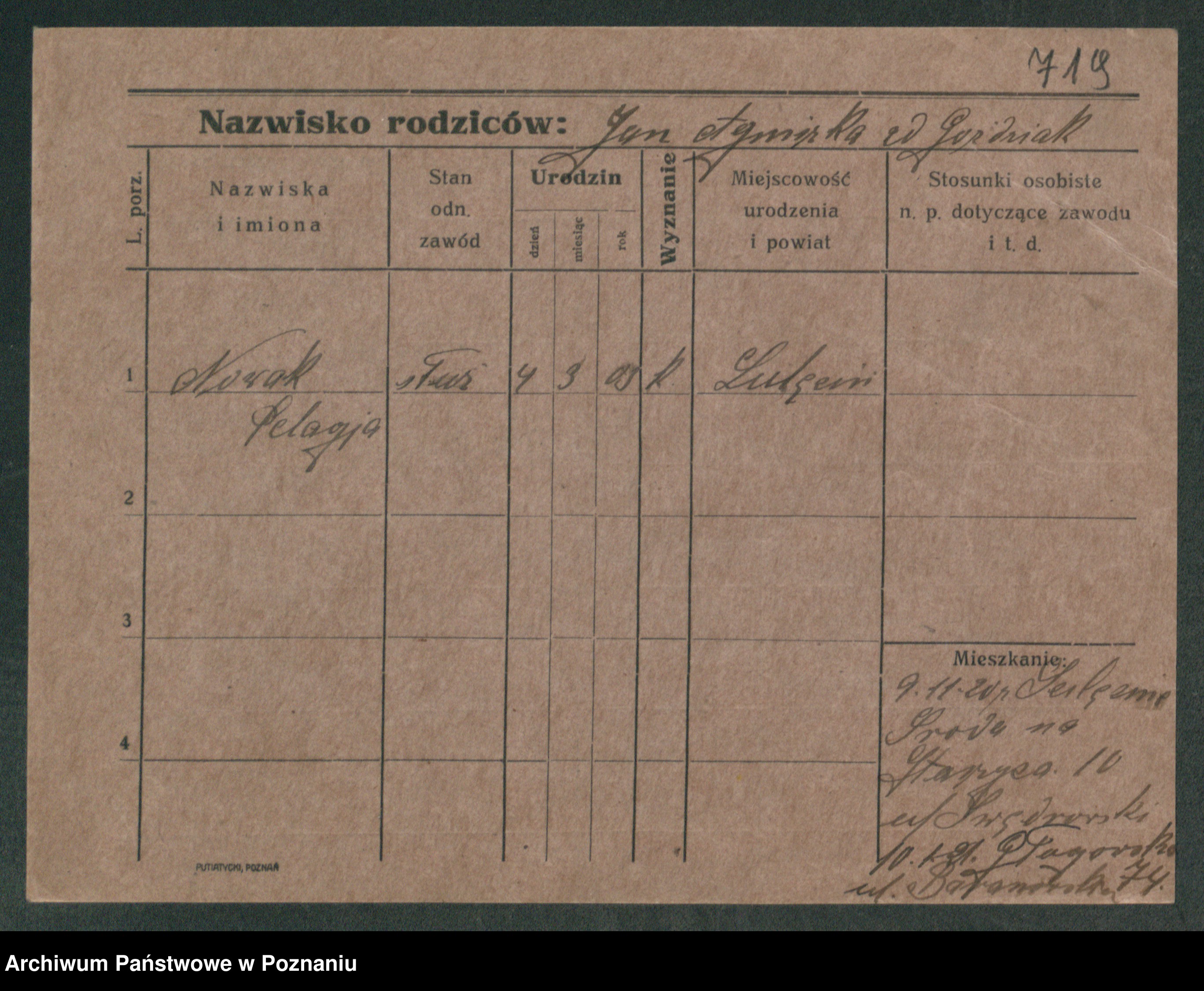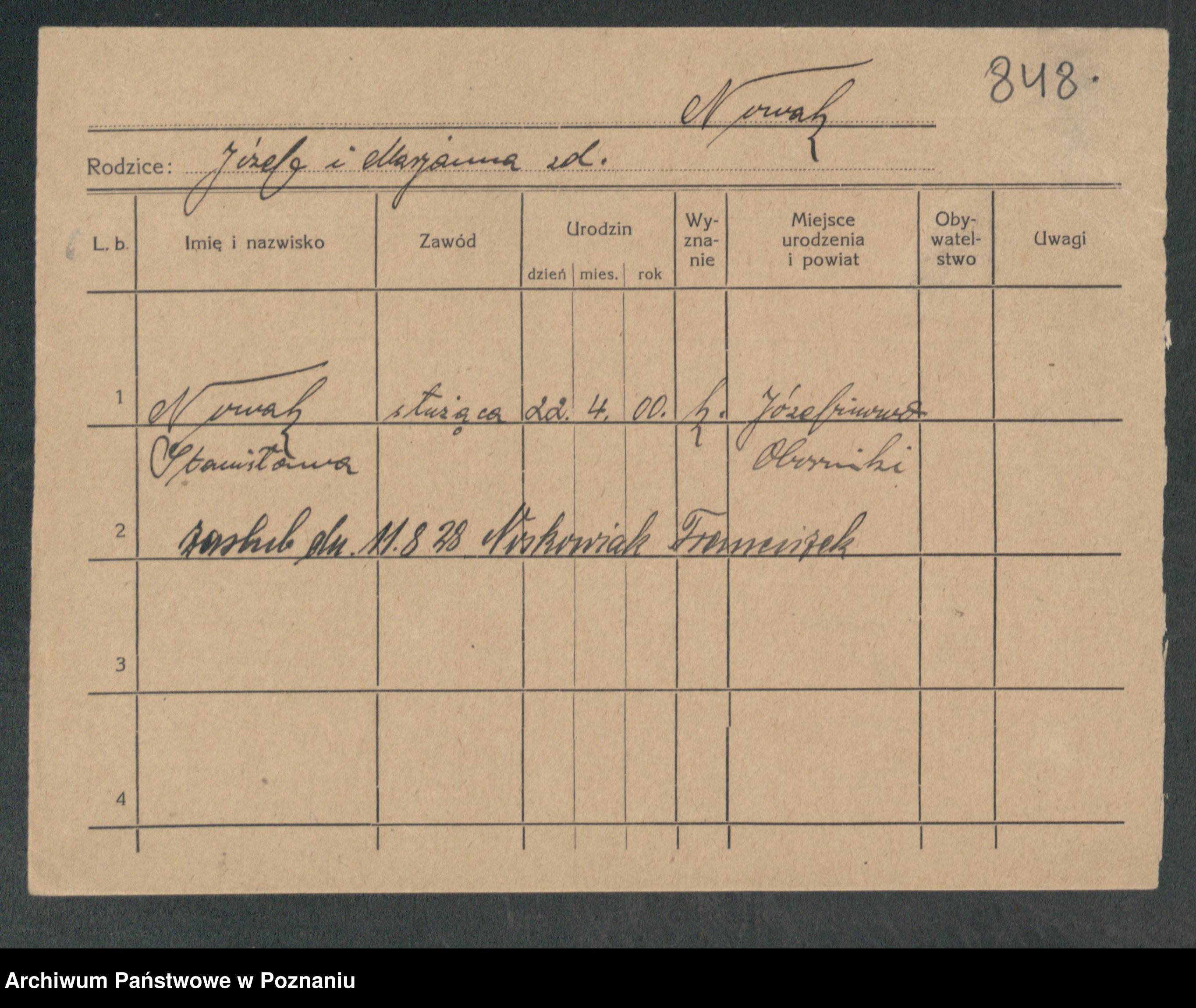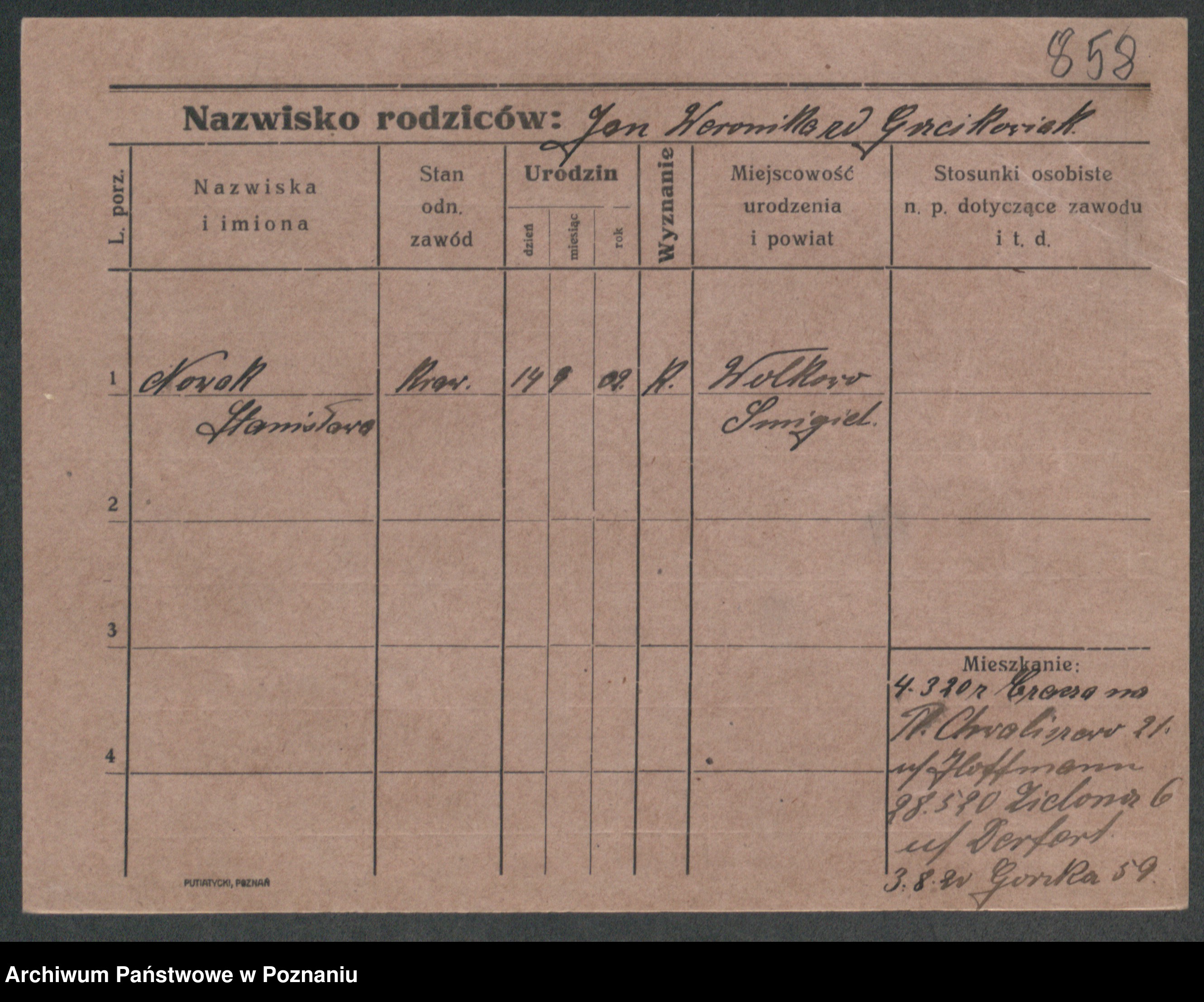 Podgląd karty osobowej dostępny jest po kliknięciu na nazwisko lub ikonkę karty. Można dokonywać powiększenia (ikony na górze) lub przechodzić między kolejnymi skanami (strzałki po bokach).