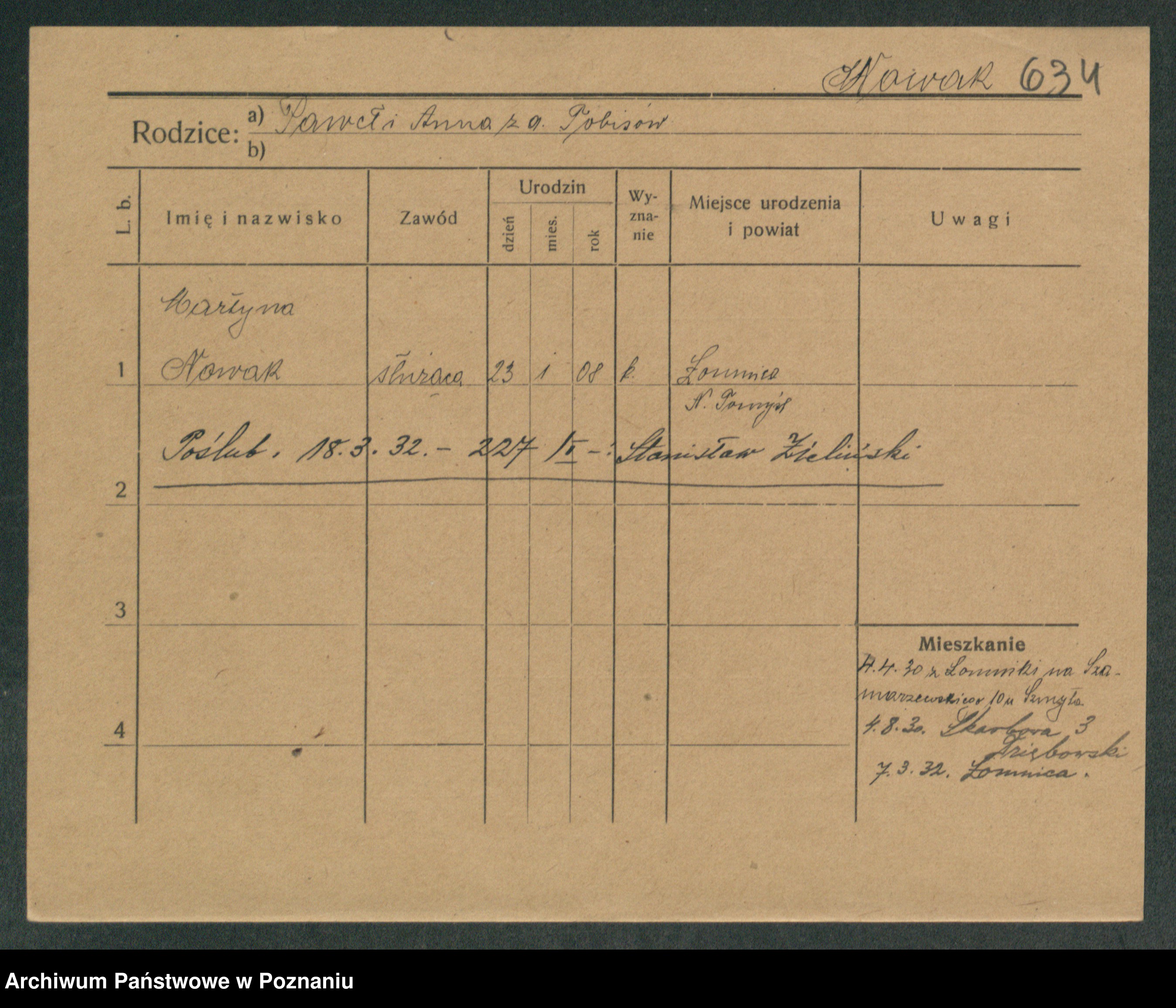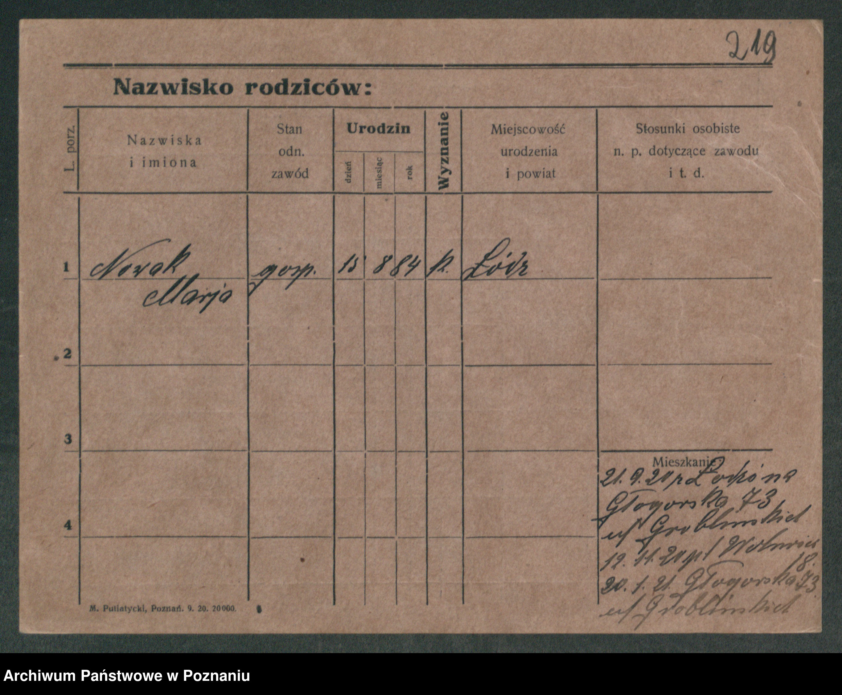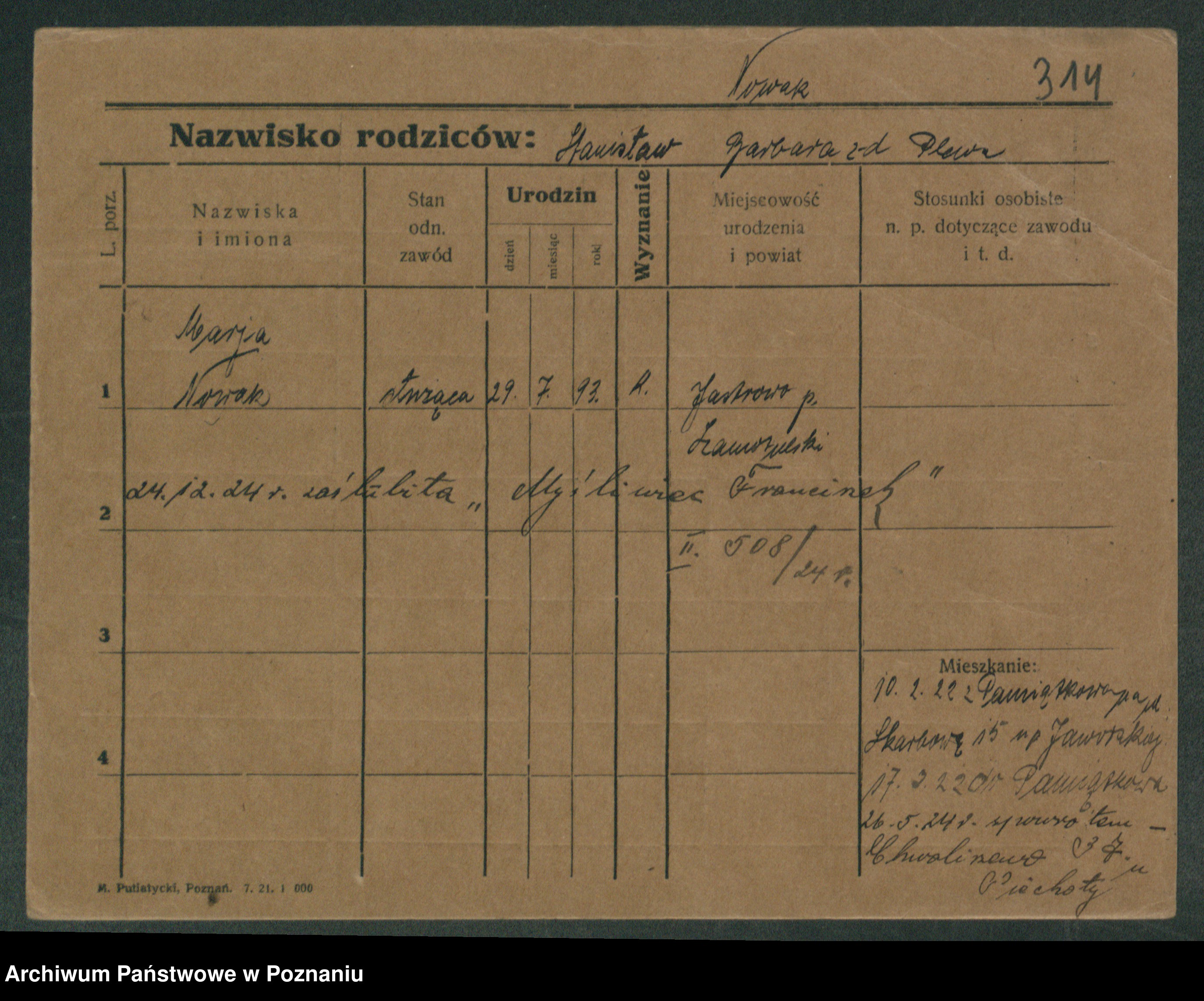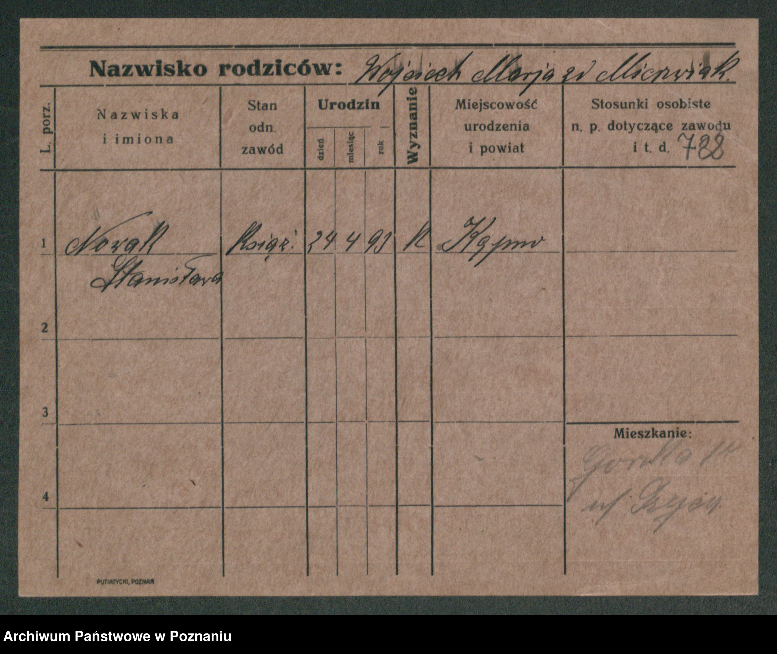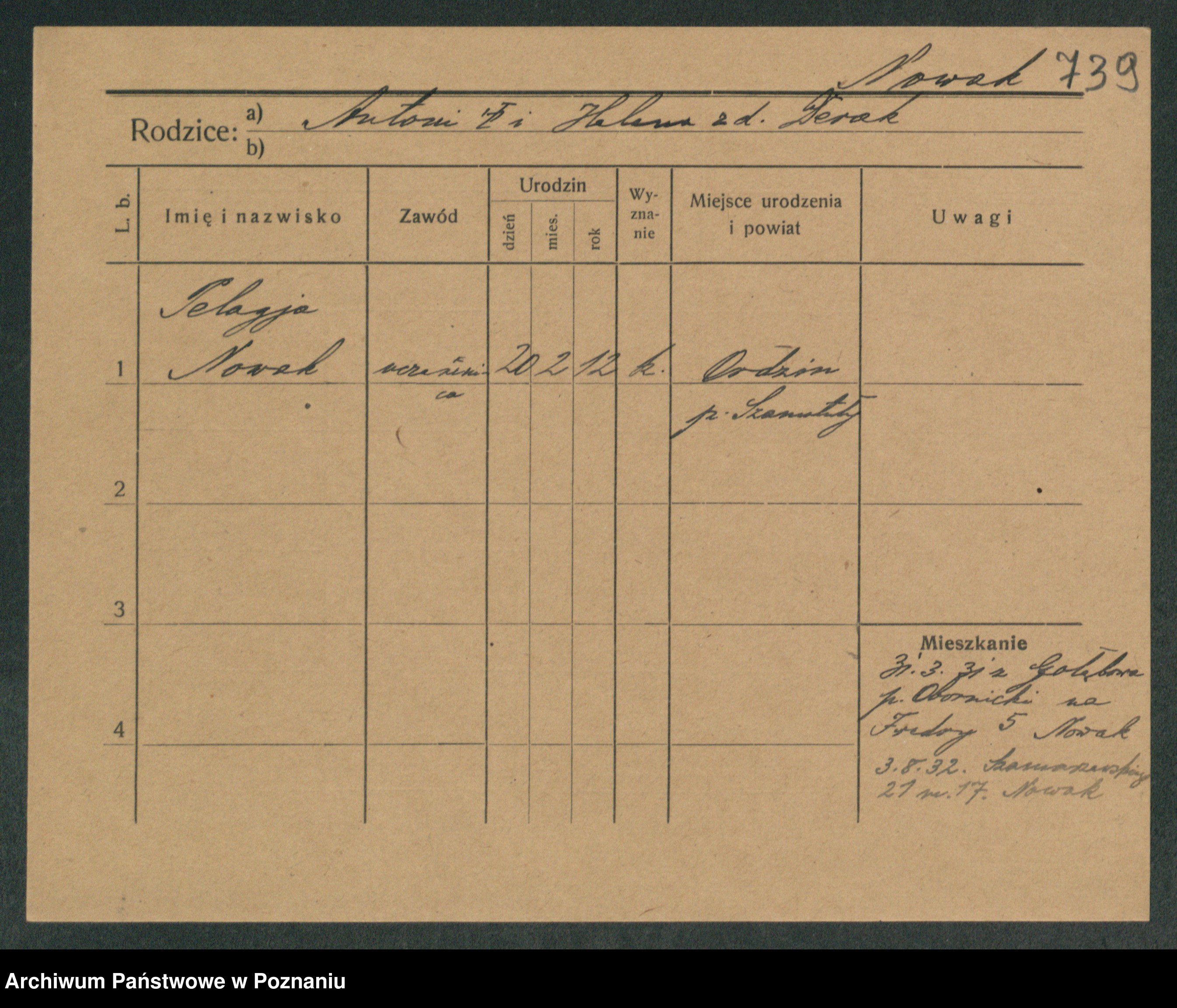 Podgląd karty osobowej dostępny jest po kliknięciu na nazwisko lub ikonkę karty. Można dokonywać powiększenia (ikony na górze) lub przechodzić między kolejnymi skanami (strzałki po bokach).
