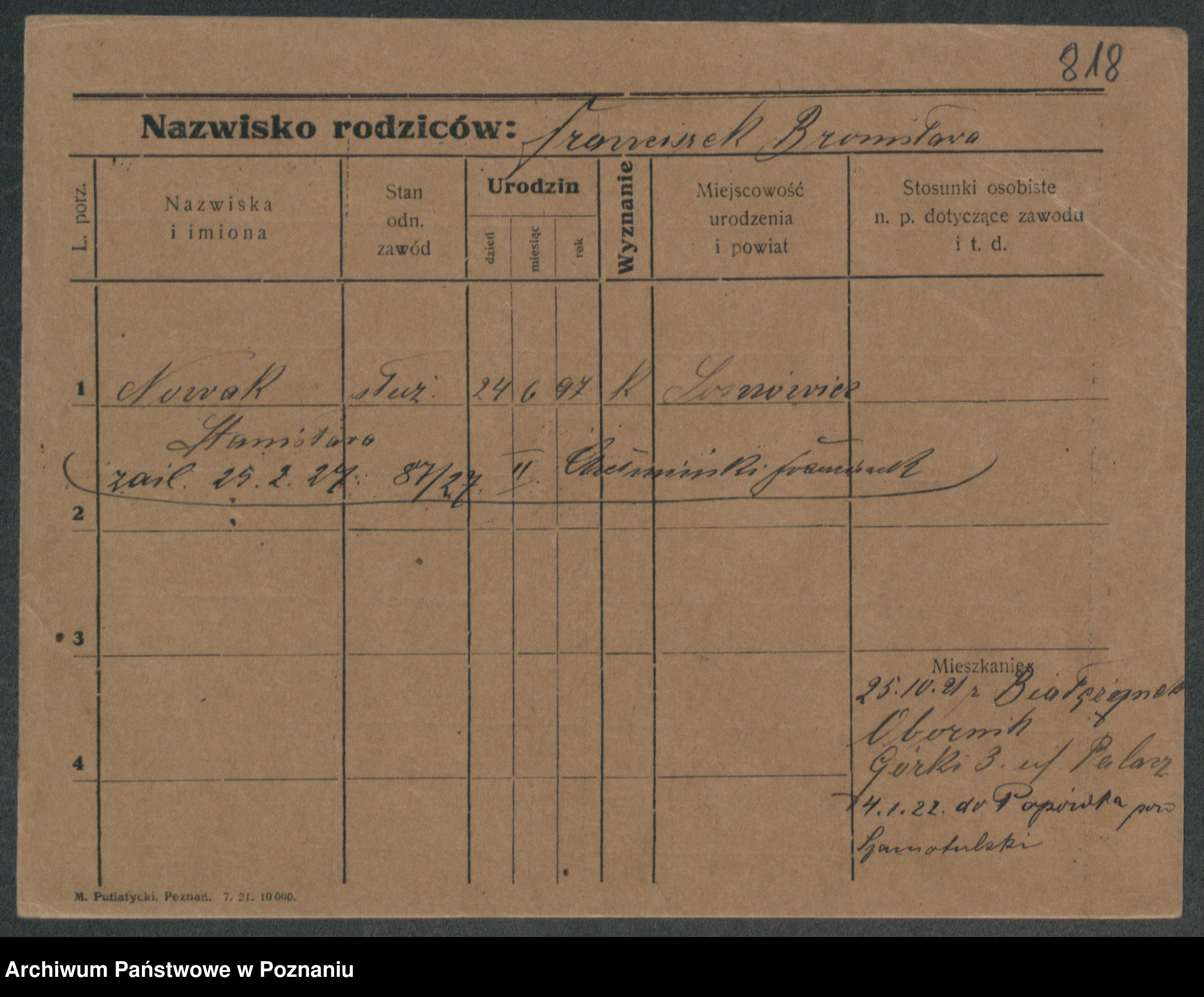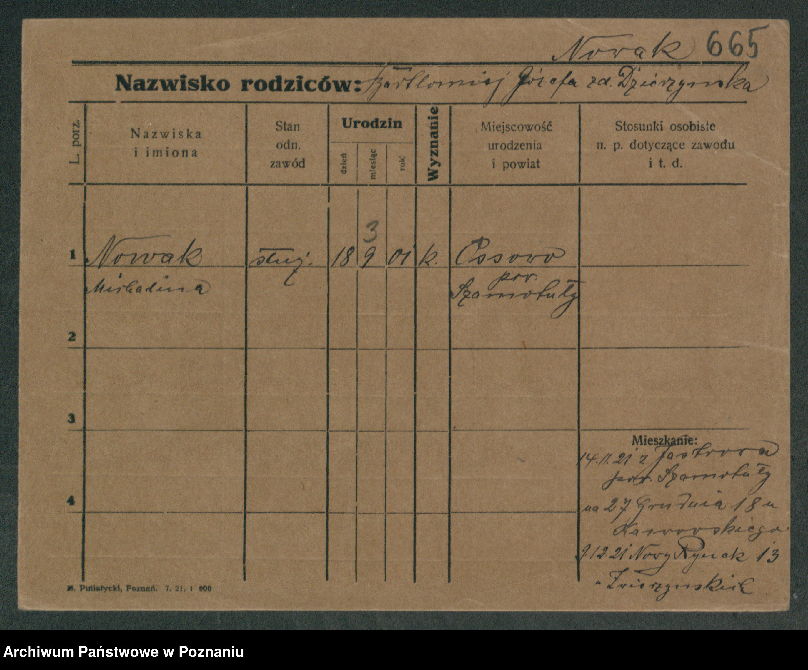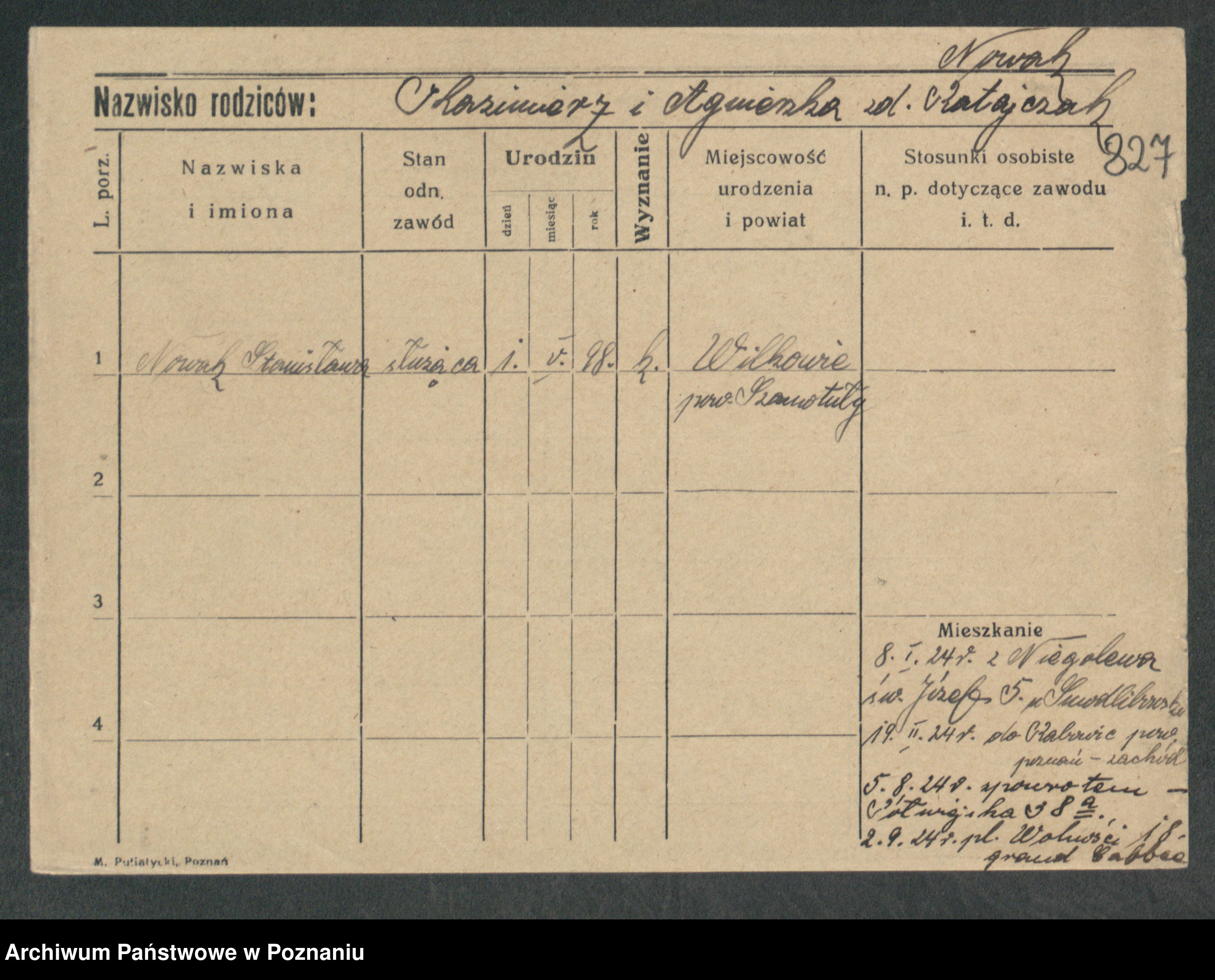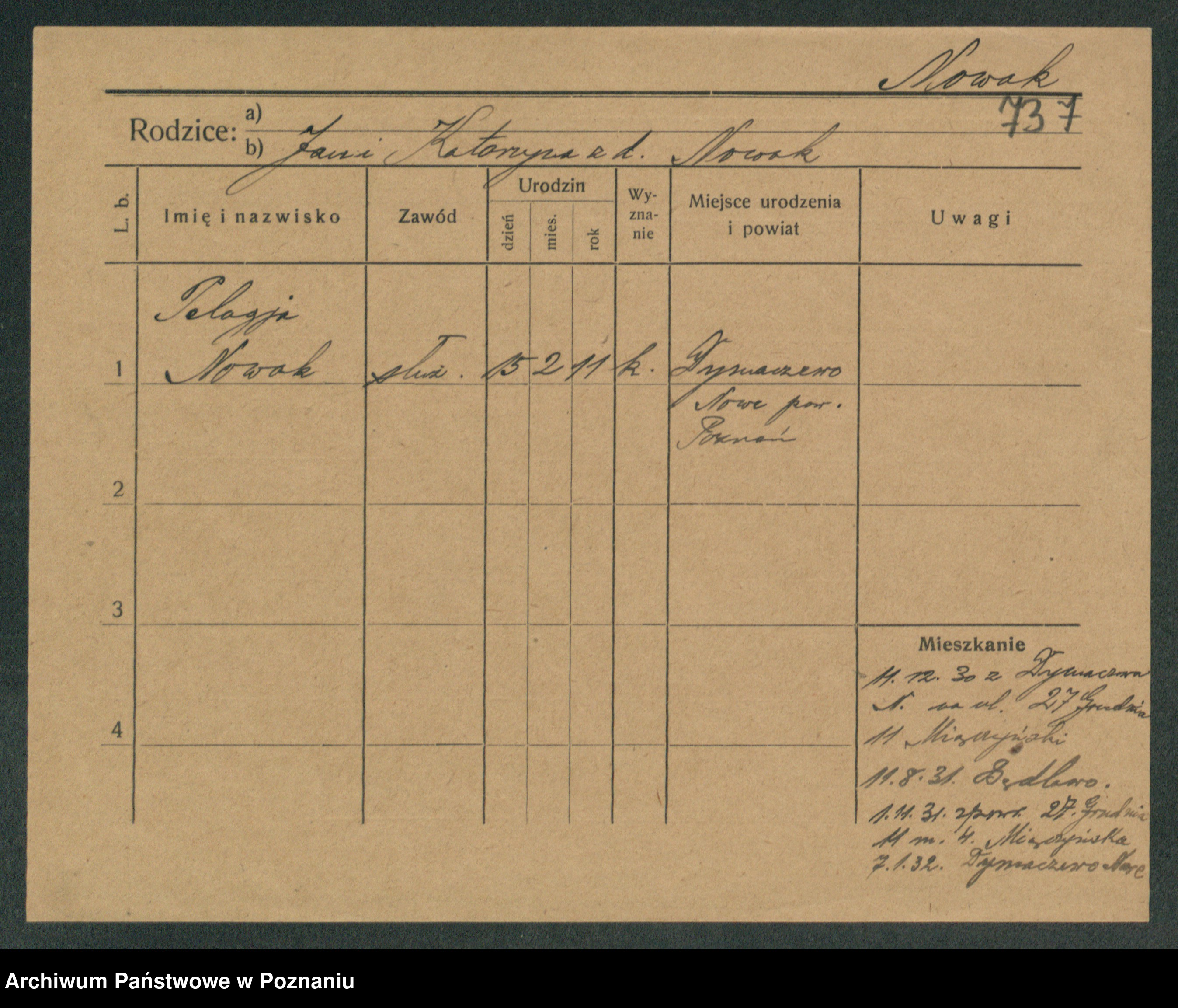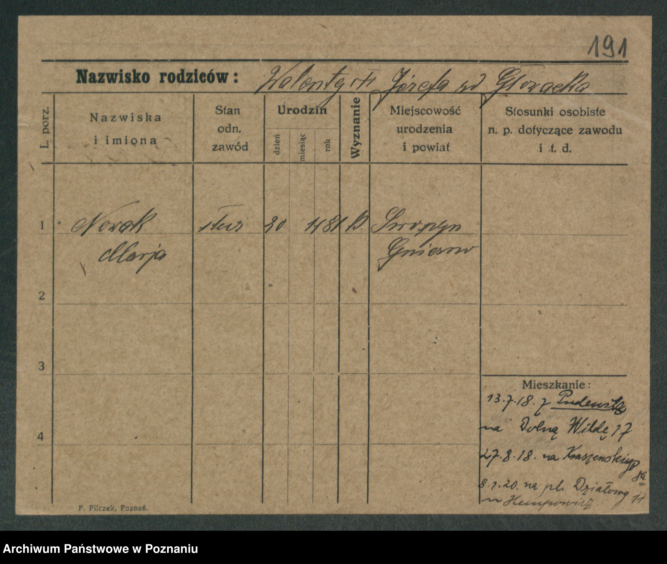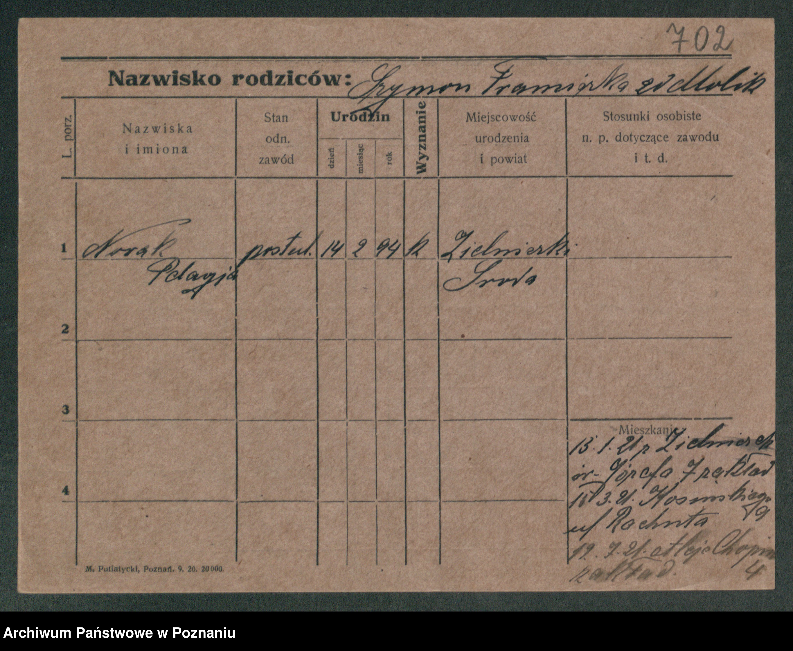 Podgląd karty osobowej dostępny jest po kliknięciu na nazwisko lub ikonkę karty. Można dokonywać powiększenia (ikony na górze) lub przechodzić między kolejnymi skanami (strzałki po bokach).