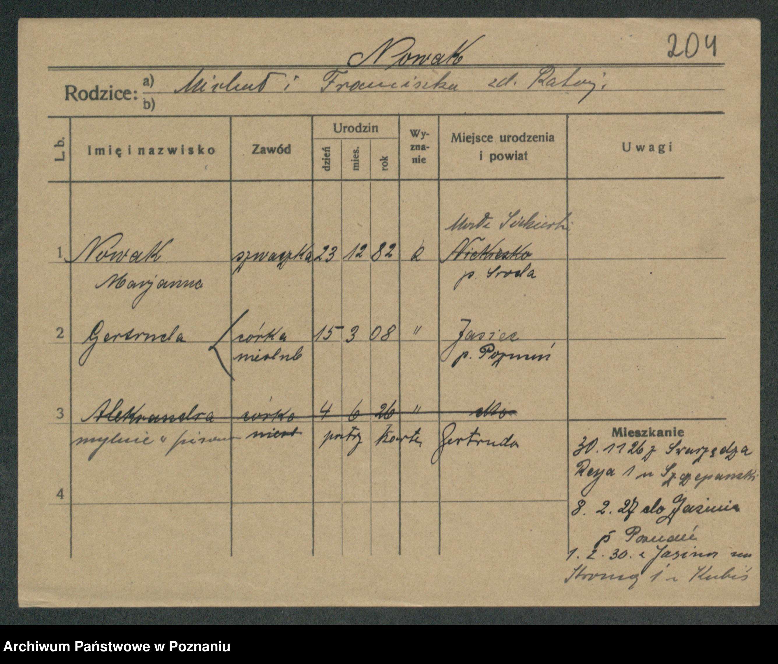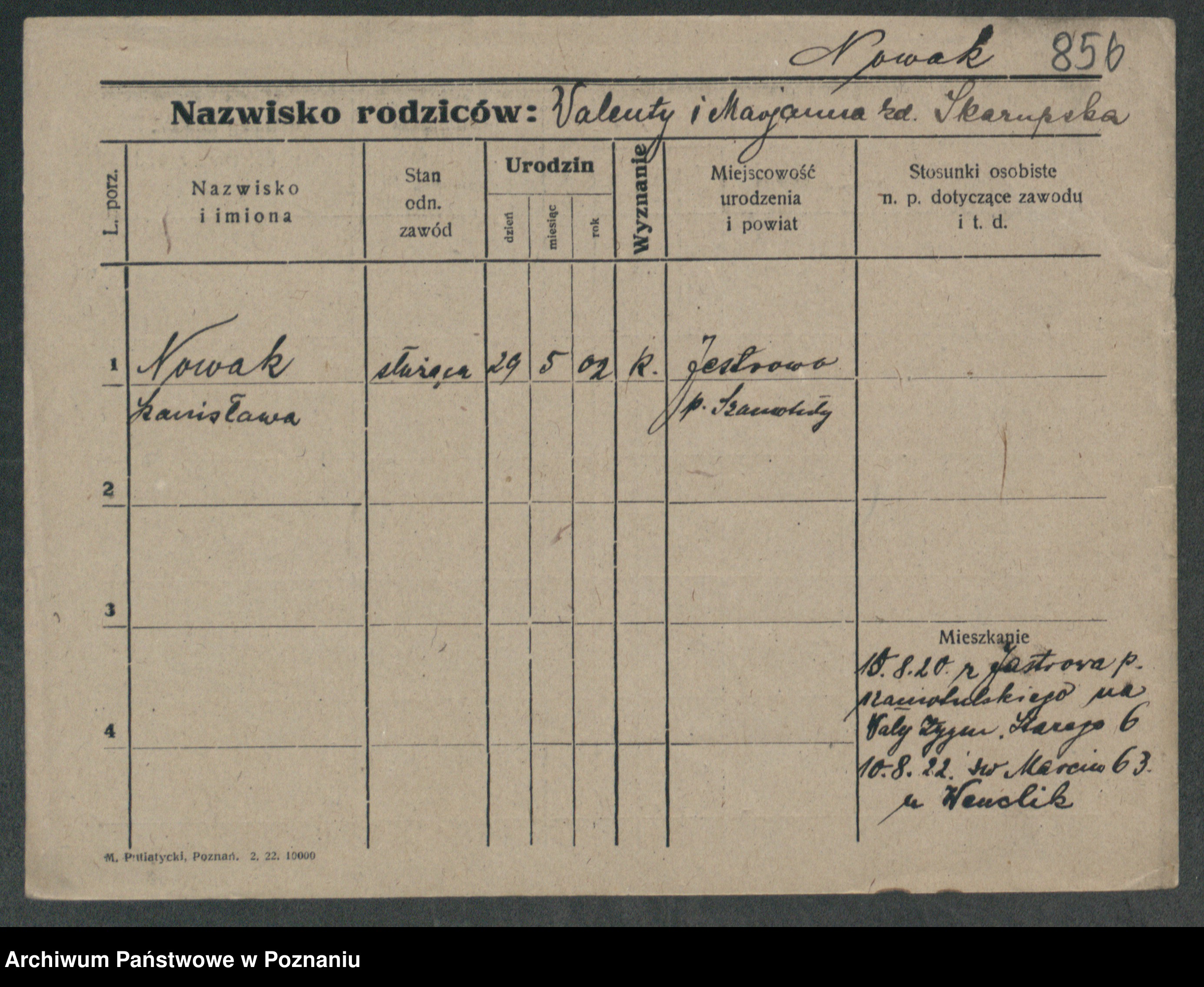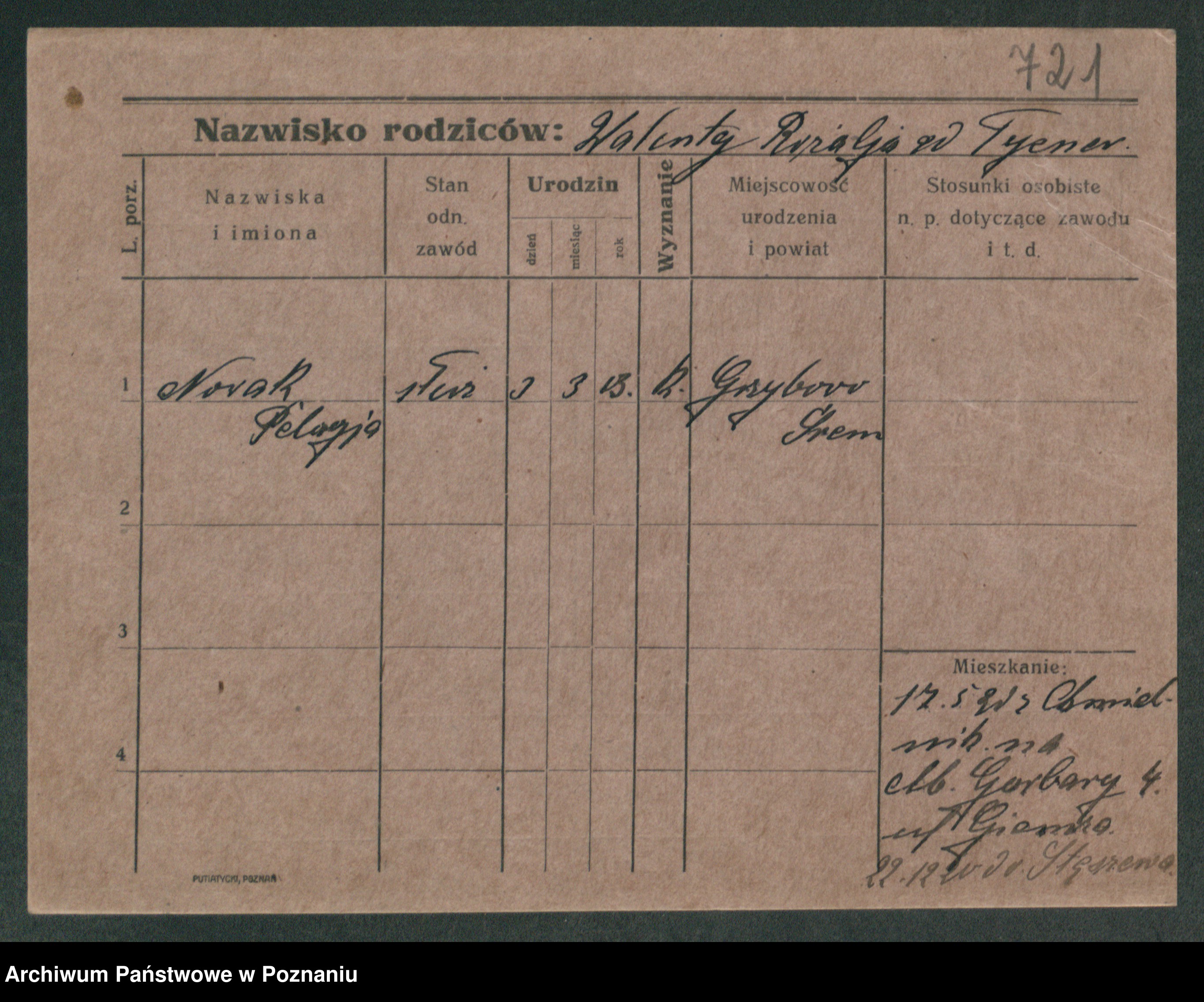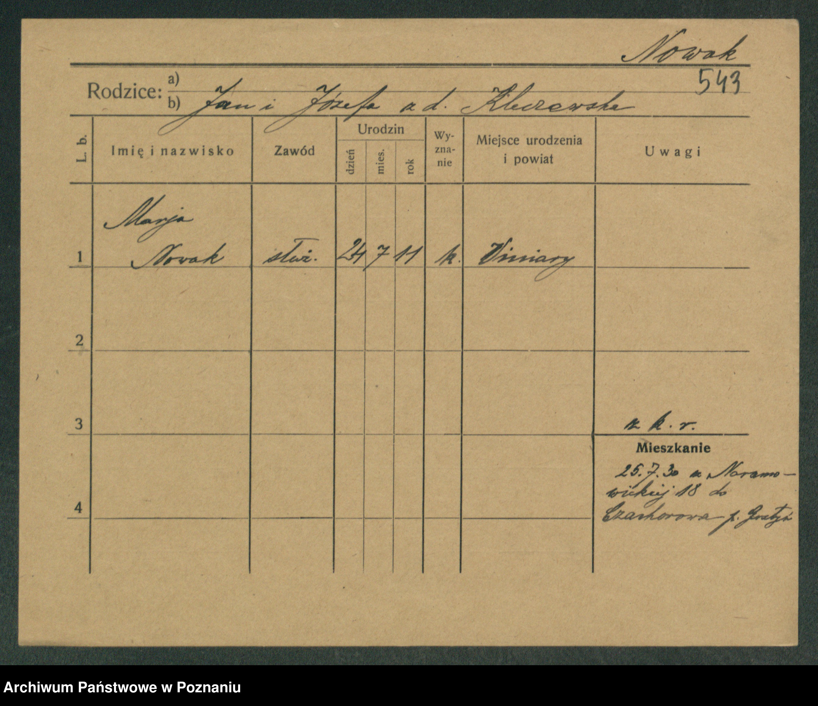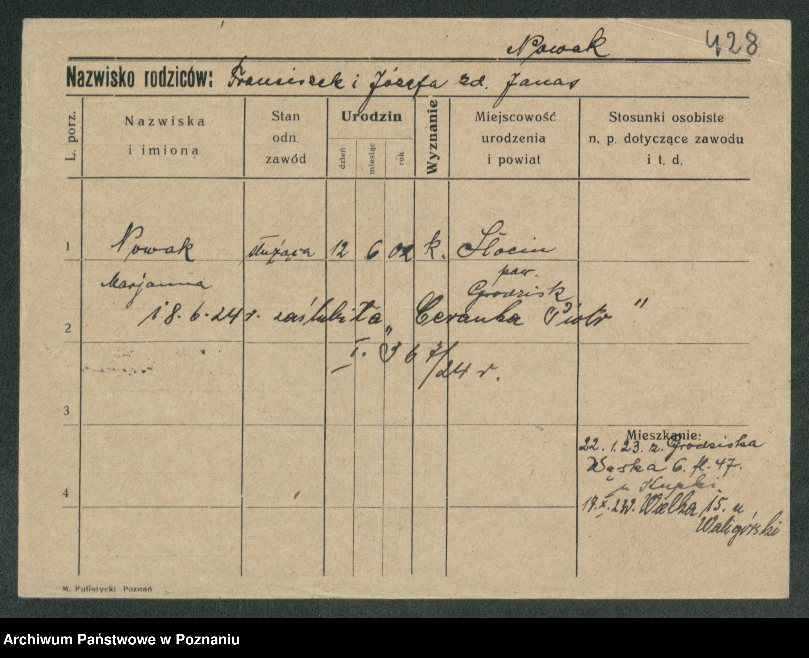 Podgląd karty osobowej dostępny jest po kliknięciu na nazwisko lub ikonkę karty. Można dokonywać powiększenia (ikony na górze) lub przechodzić między kolejnymi skanami (strzałki po bokach).