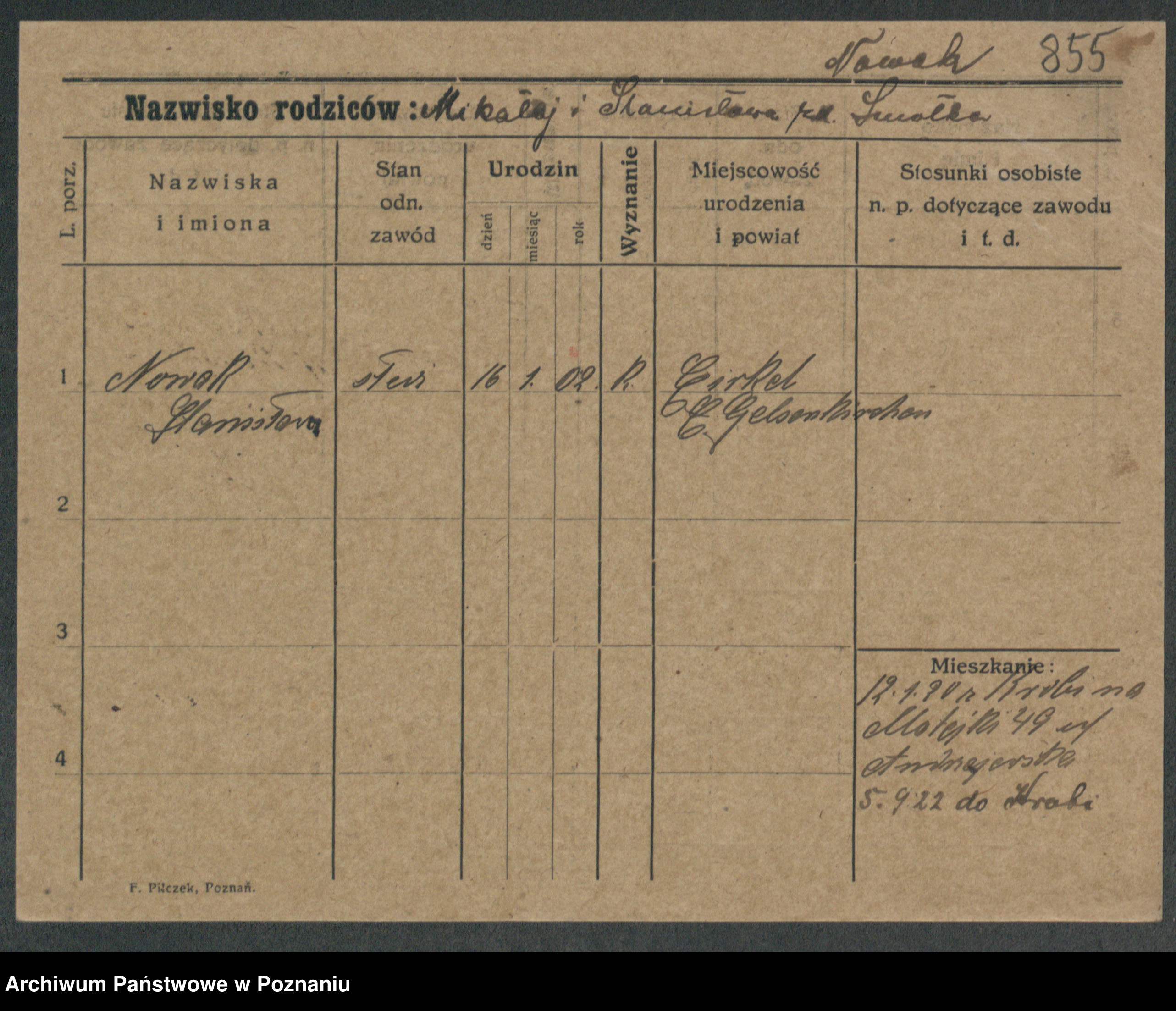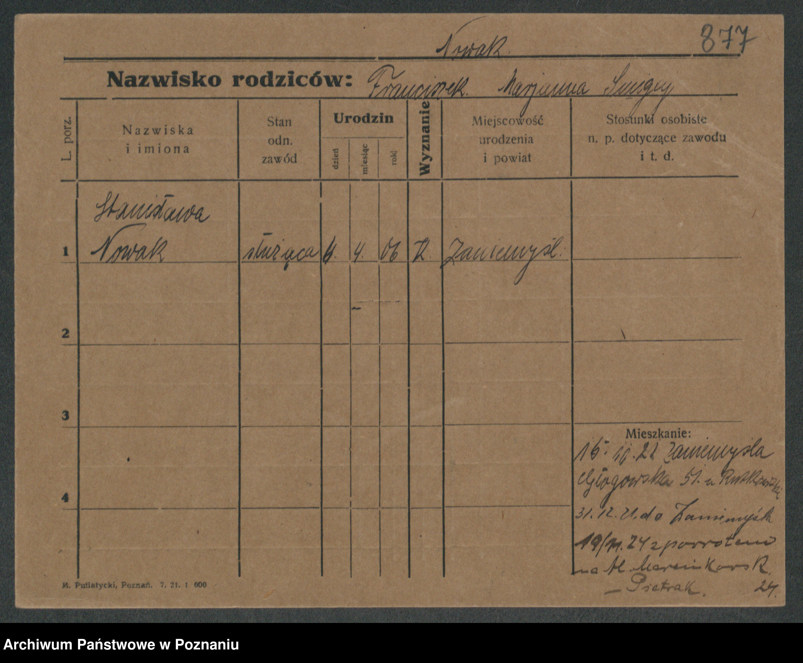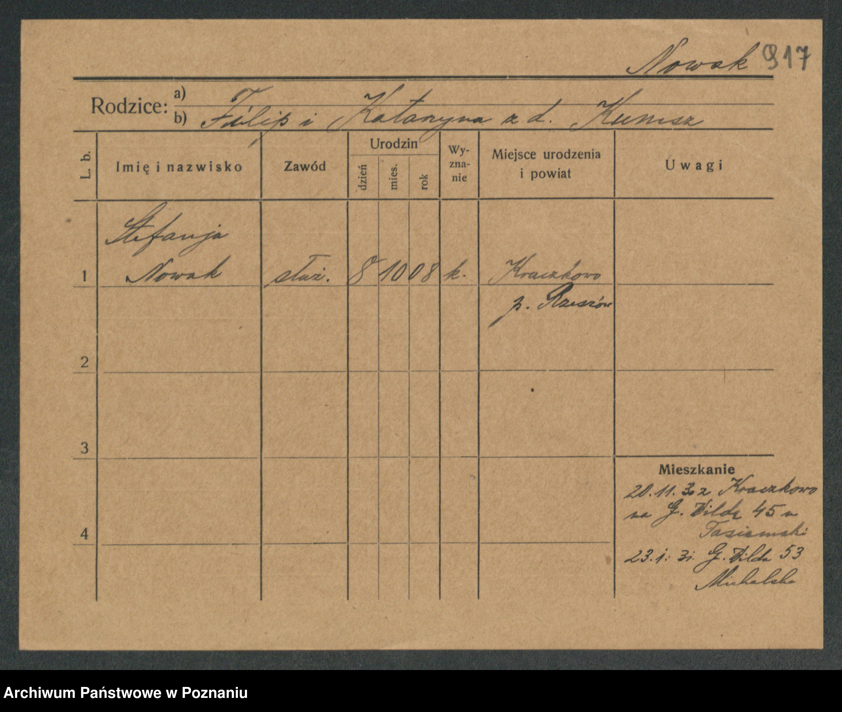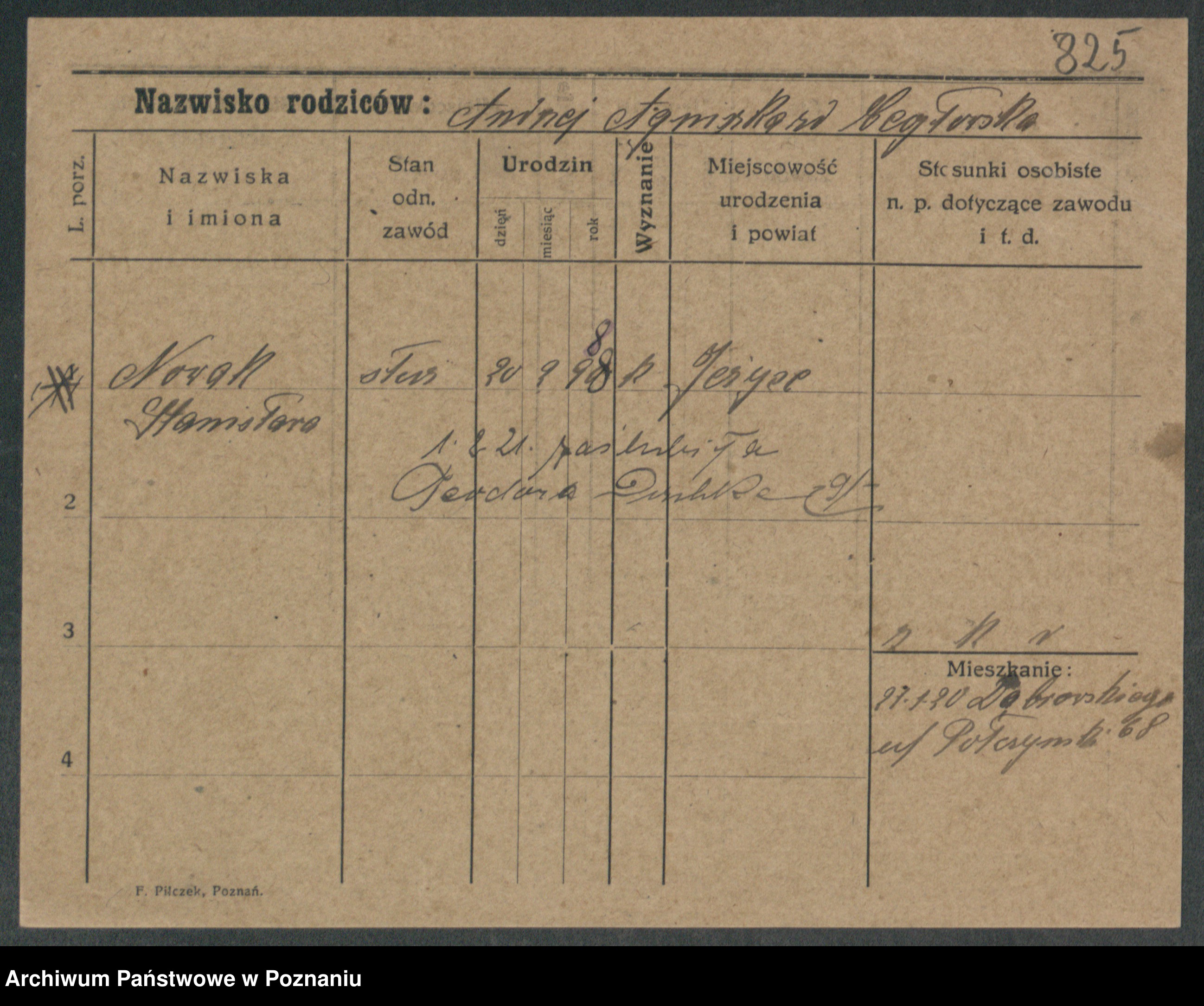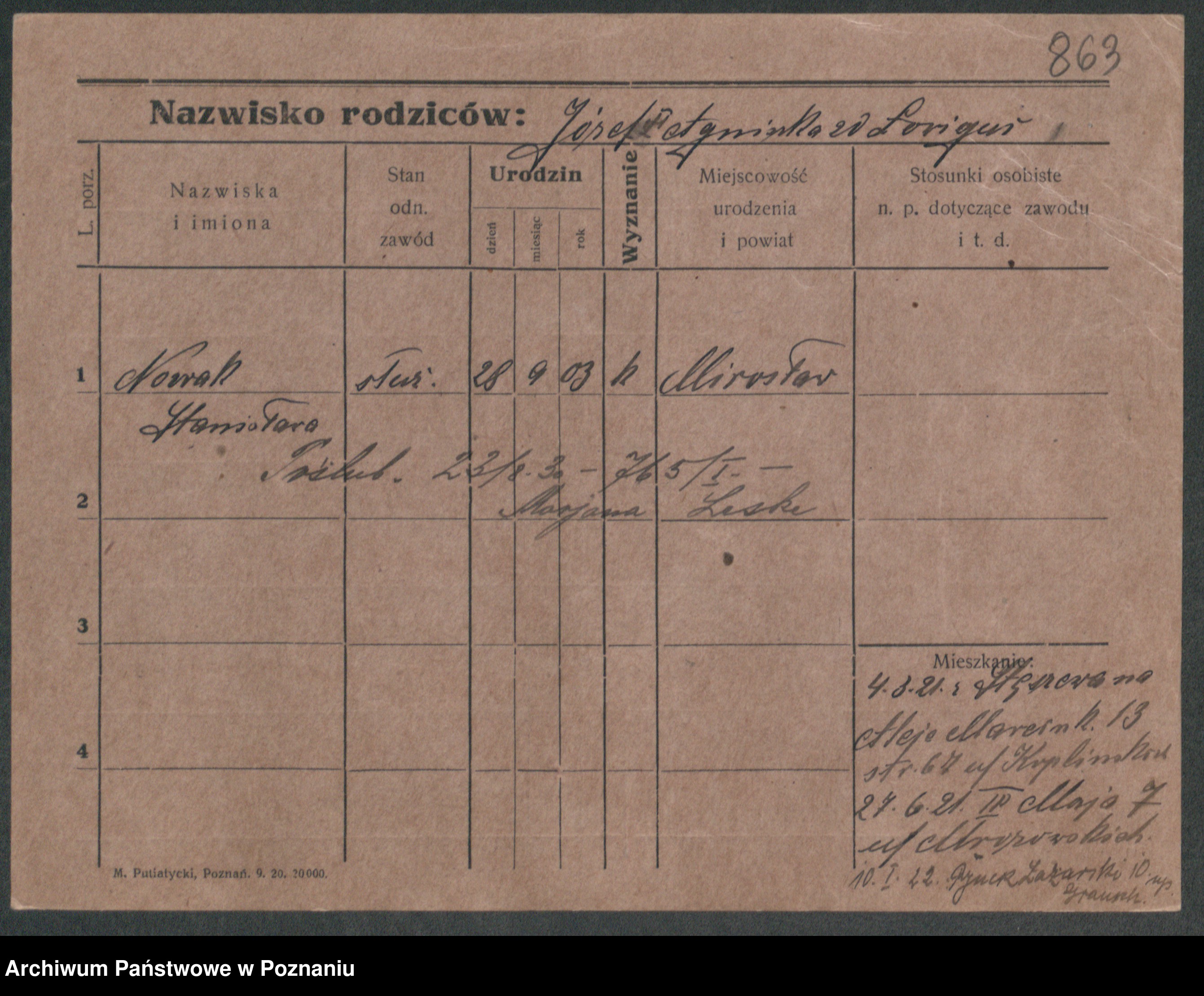 Podgląd karty osobowej dostępny jest po kliknięciu na nazwisko lub ikonkę karty. Można dokonywać powiększenia (ikony na górze) lub przechodzić między kolejnymi skanami (strzałki po bokach).