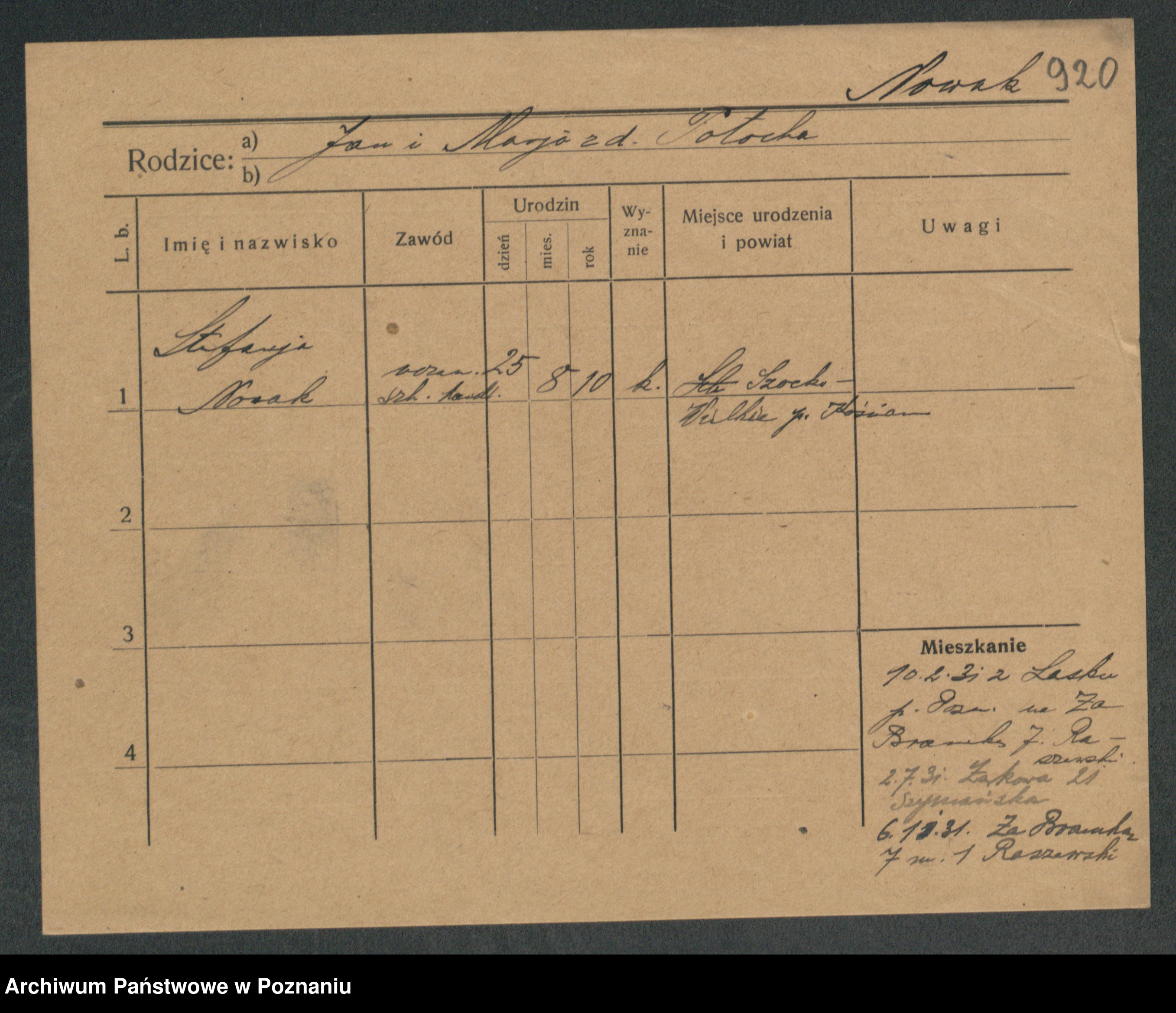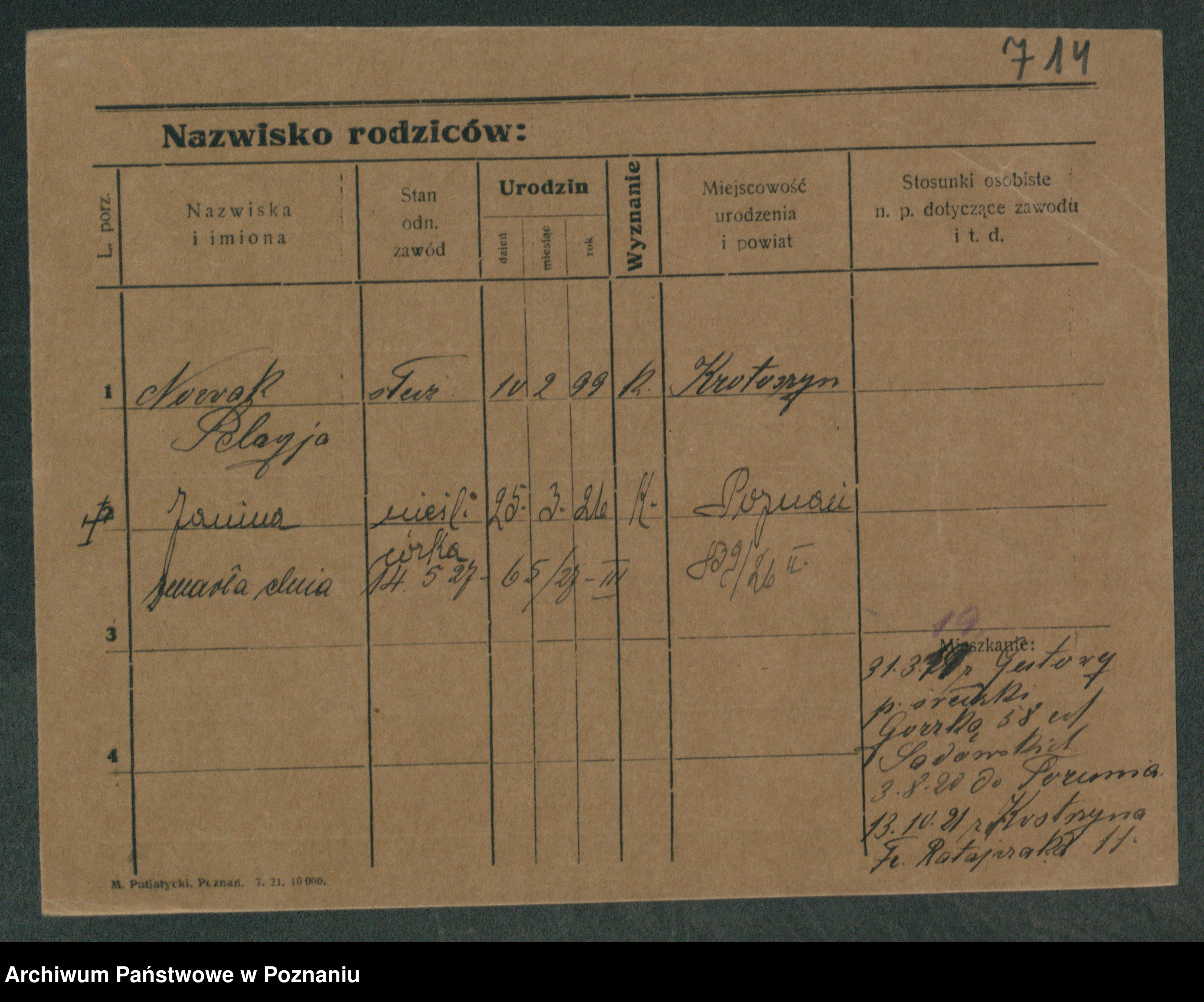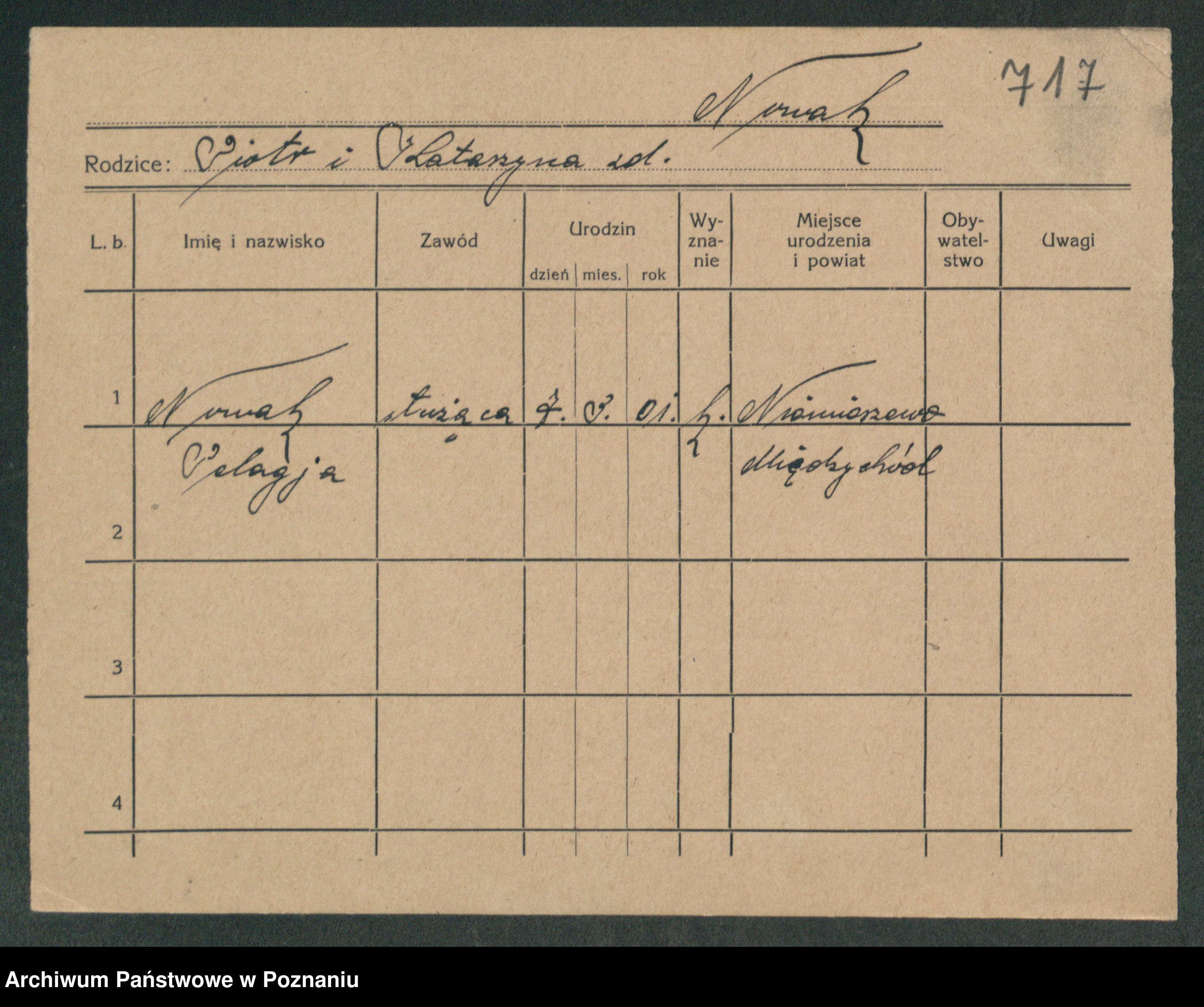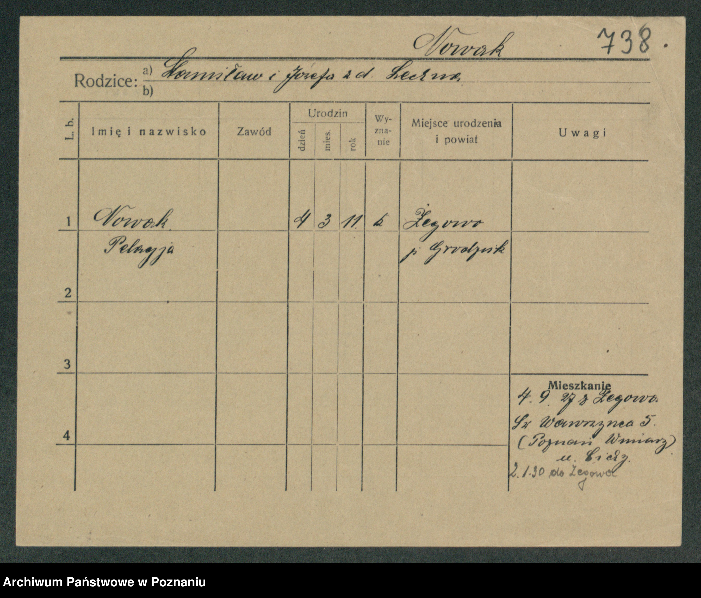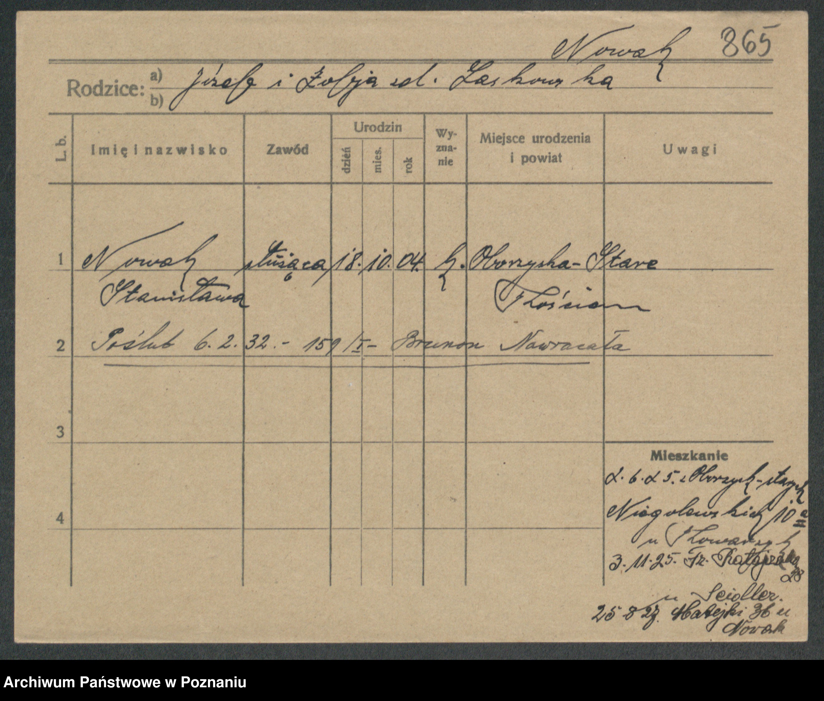 Podgląd karty osobowej dostępny jest po kliknięciu na nazwisko lub ikonkę karty. Można dokonywać powiększenia (ikony na górze) lub przechodzić między kolejnymi skanami (strzałki po bokach).