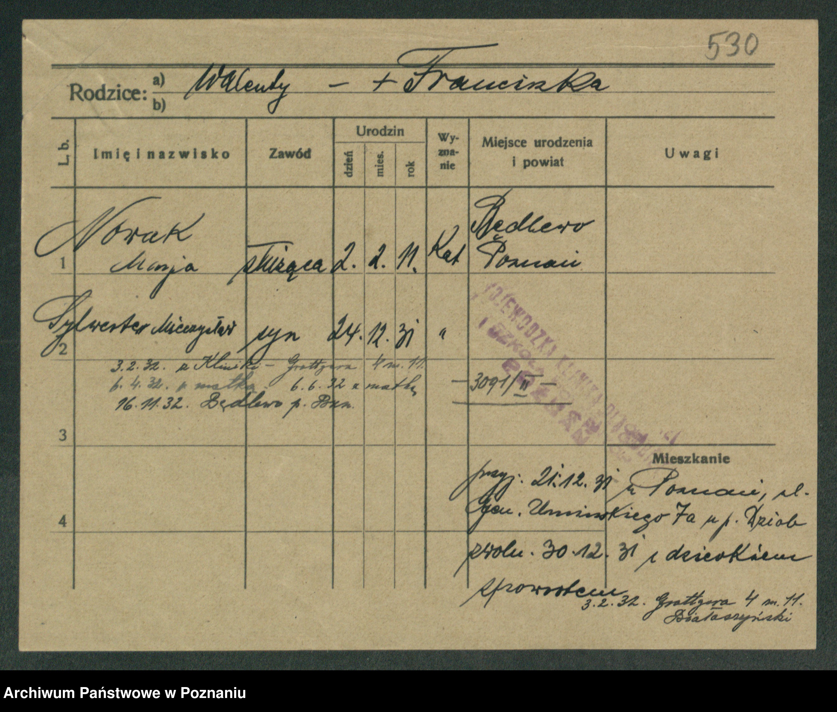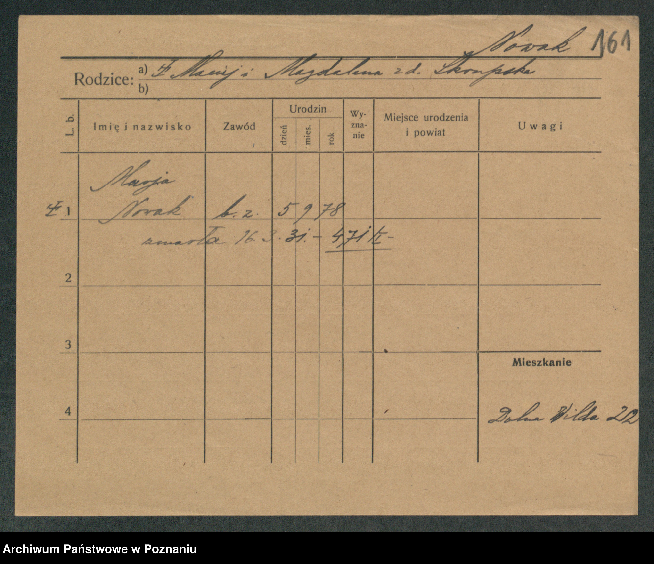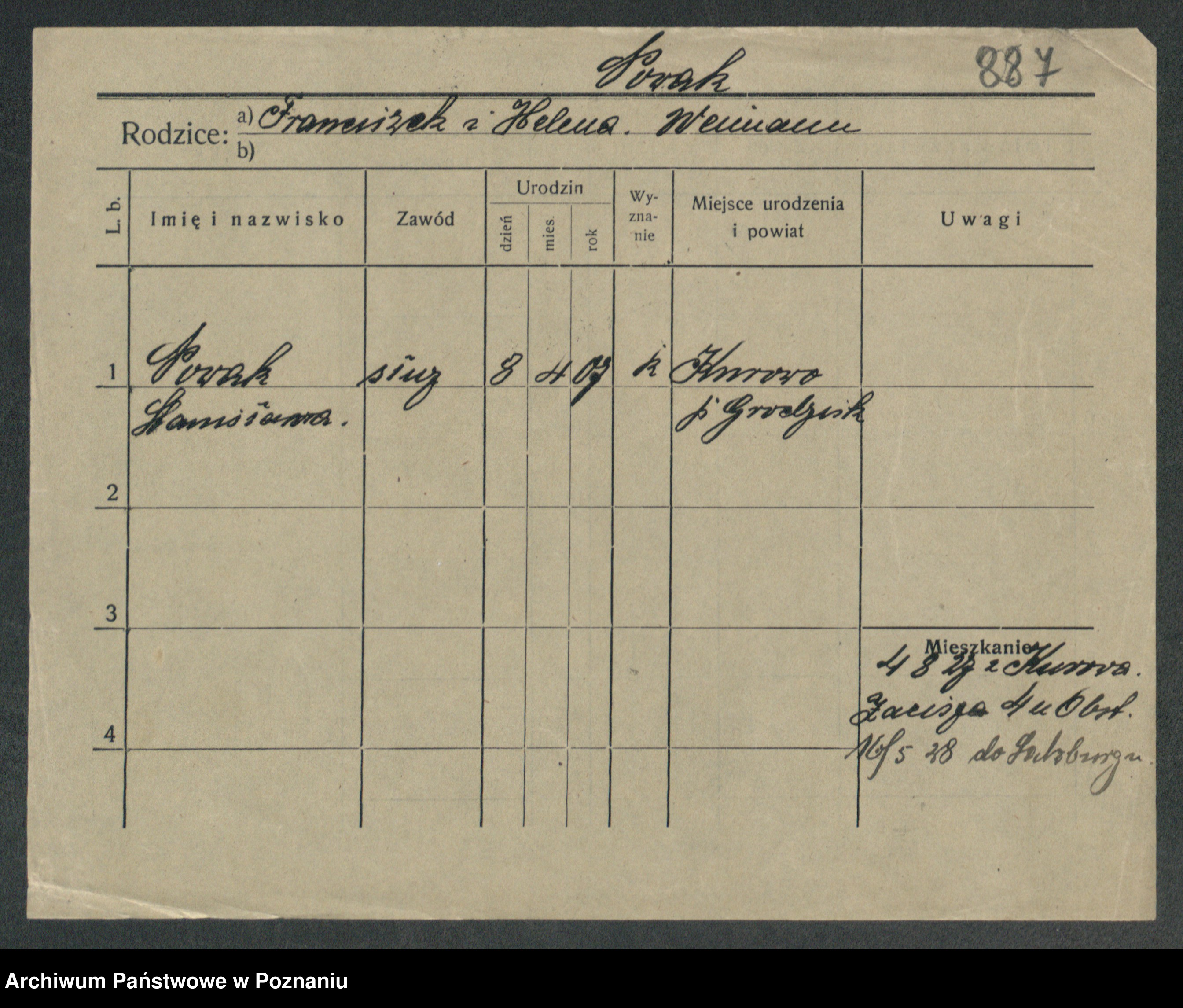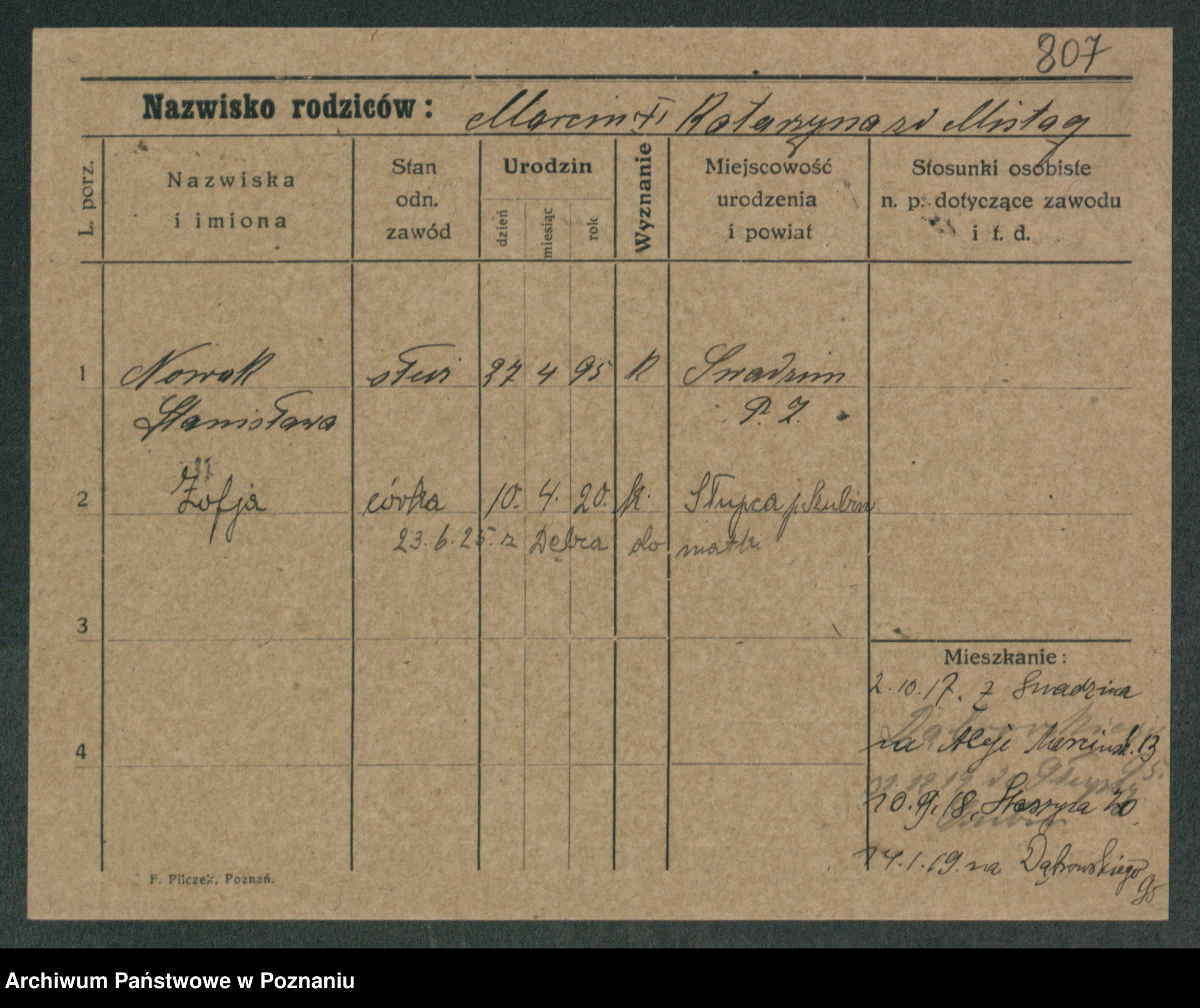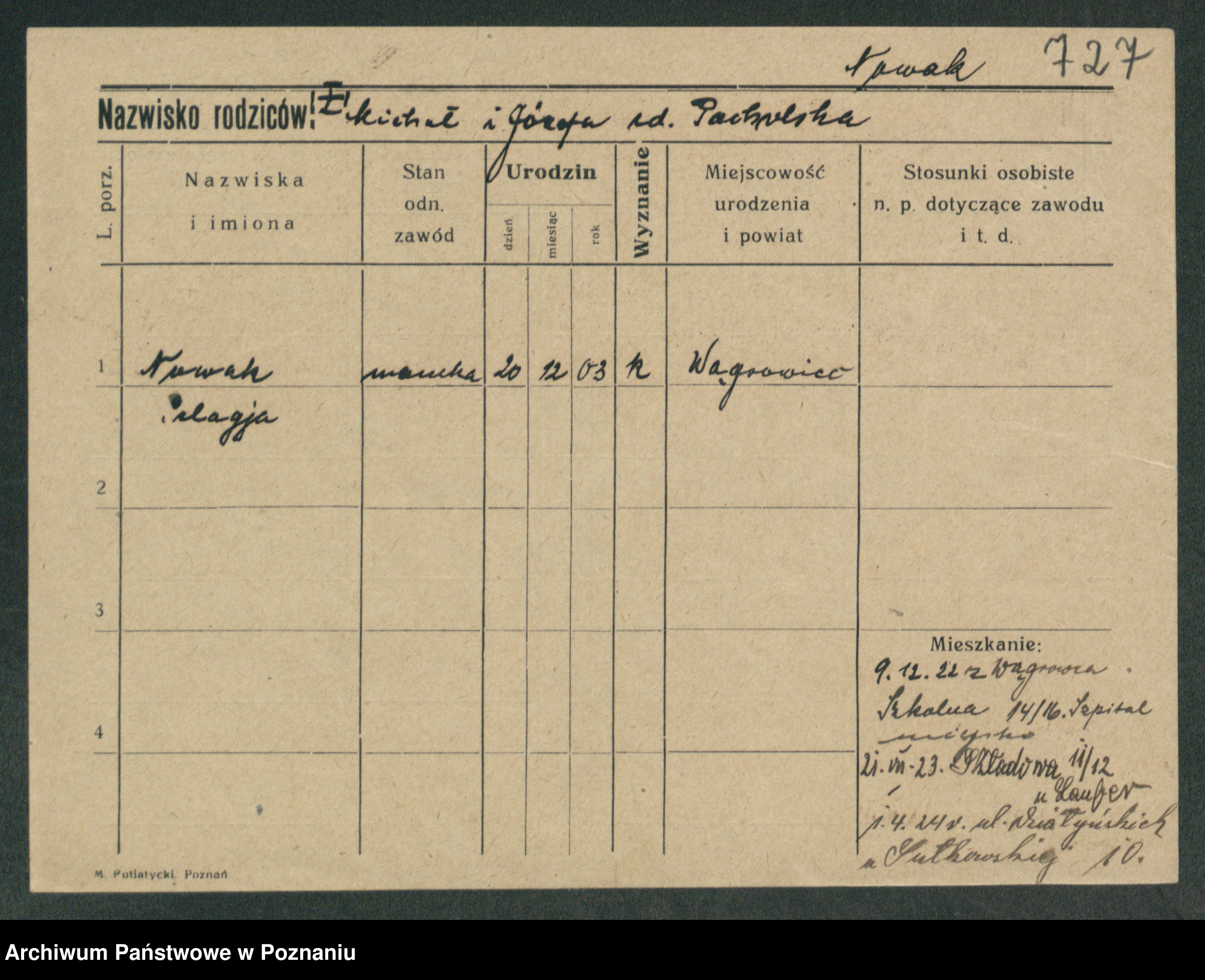 Podgląd karty osobowej dostępny jest po kliknięciu na nazwisko lub ikonkę karty. Można dokonywać powiększenia (ikony na górze) lub przechodzić między kolejnymi skanami (strzałki po bokach).