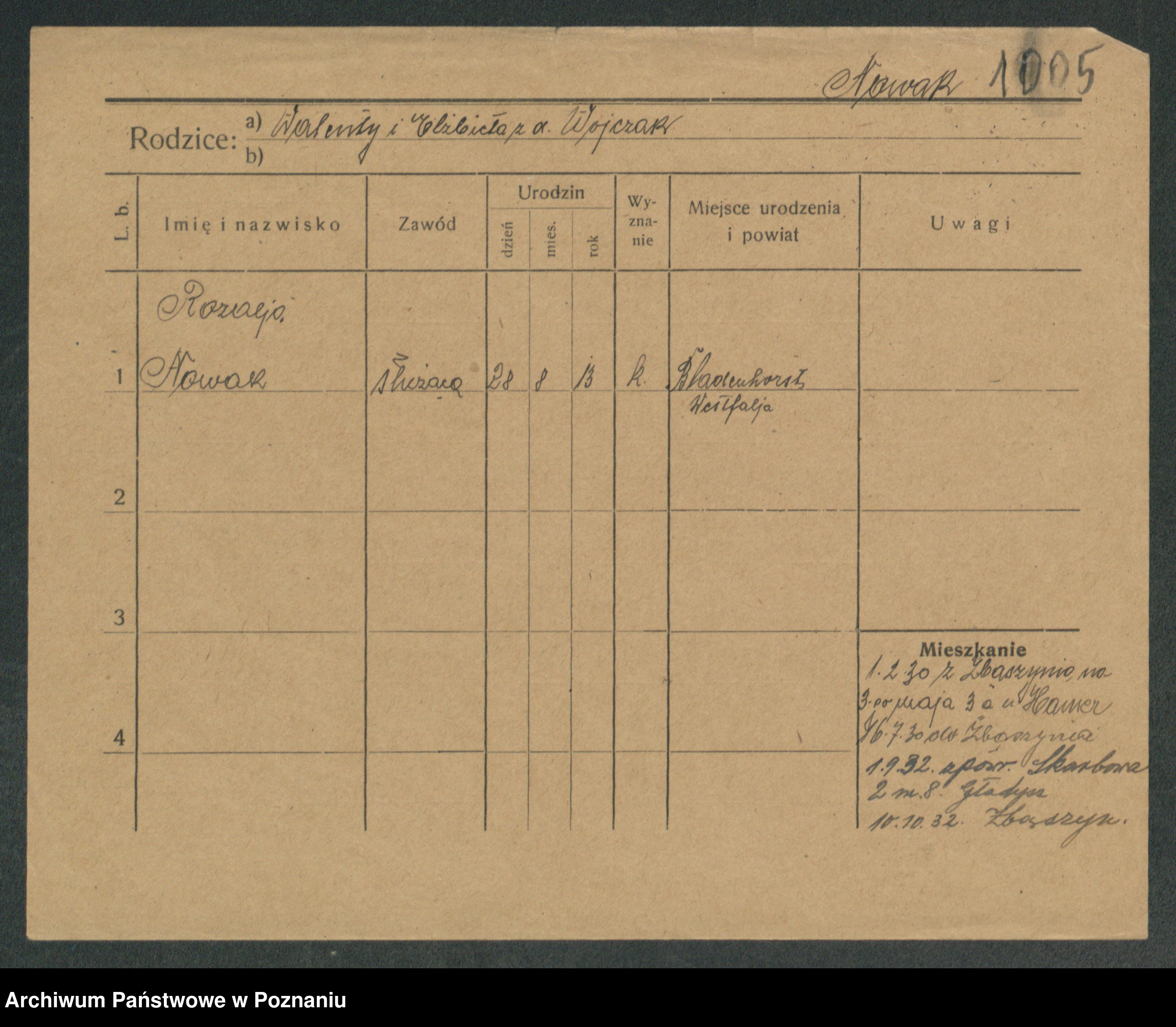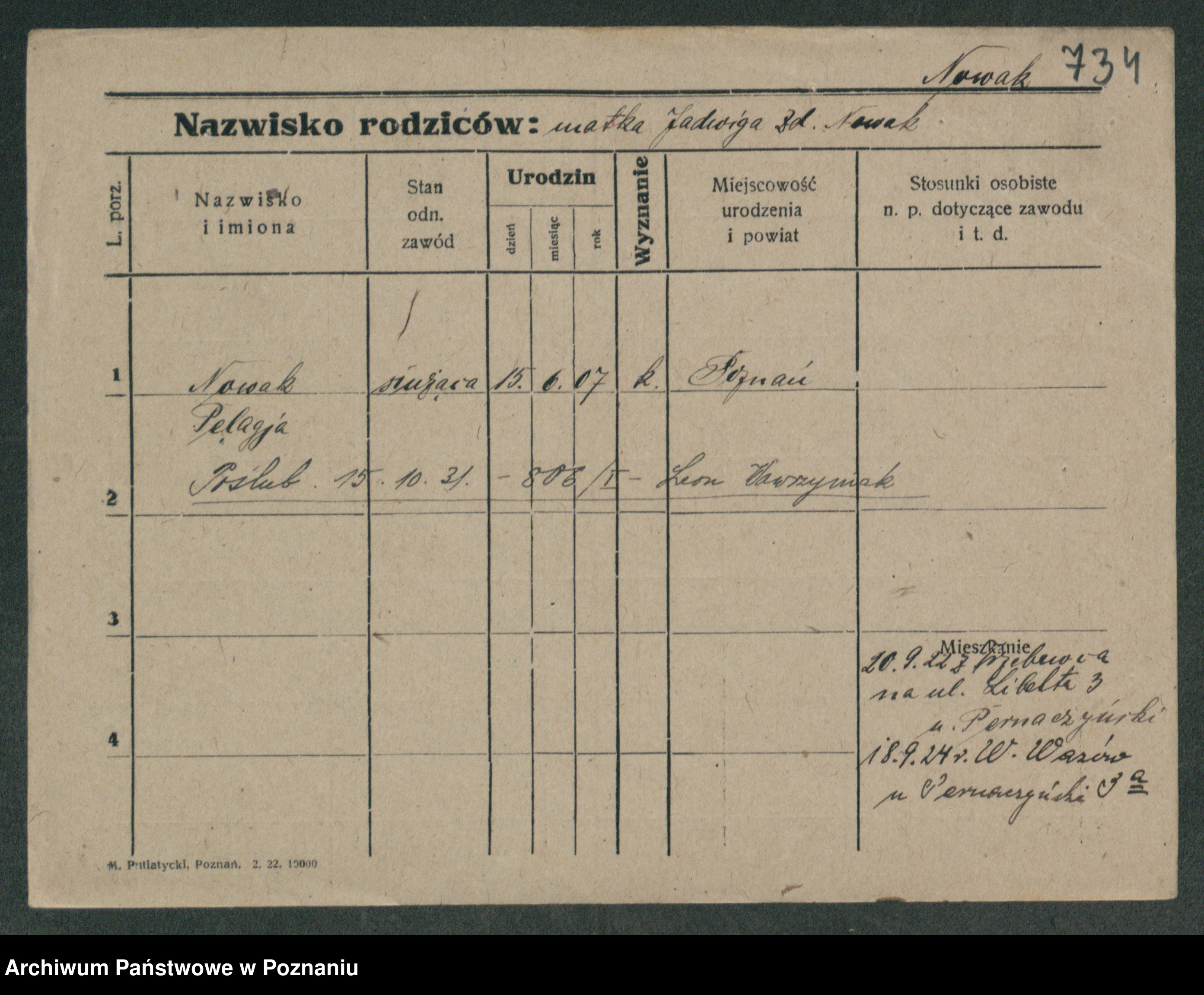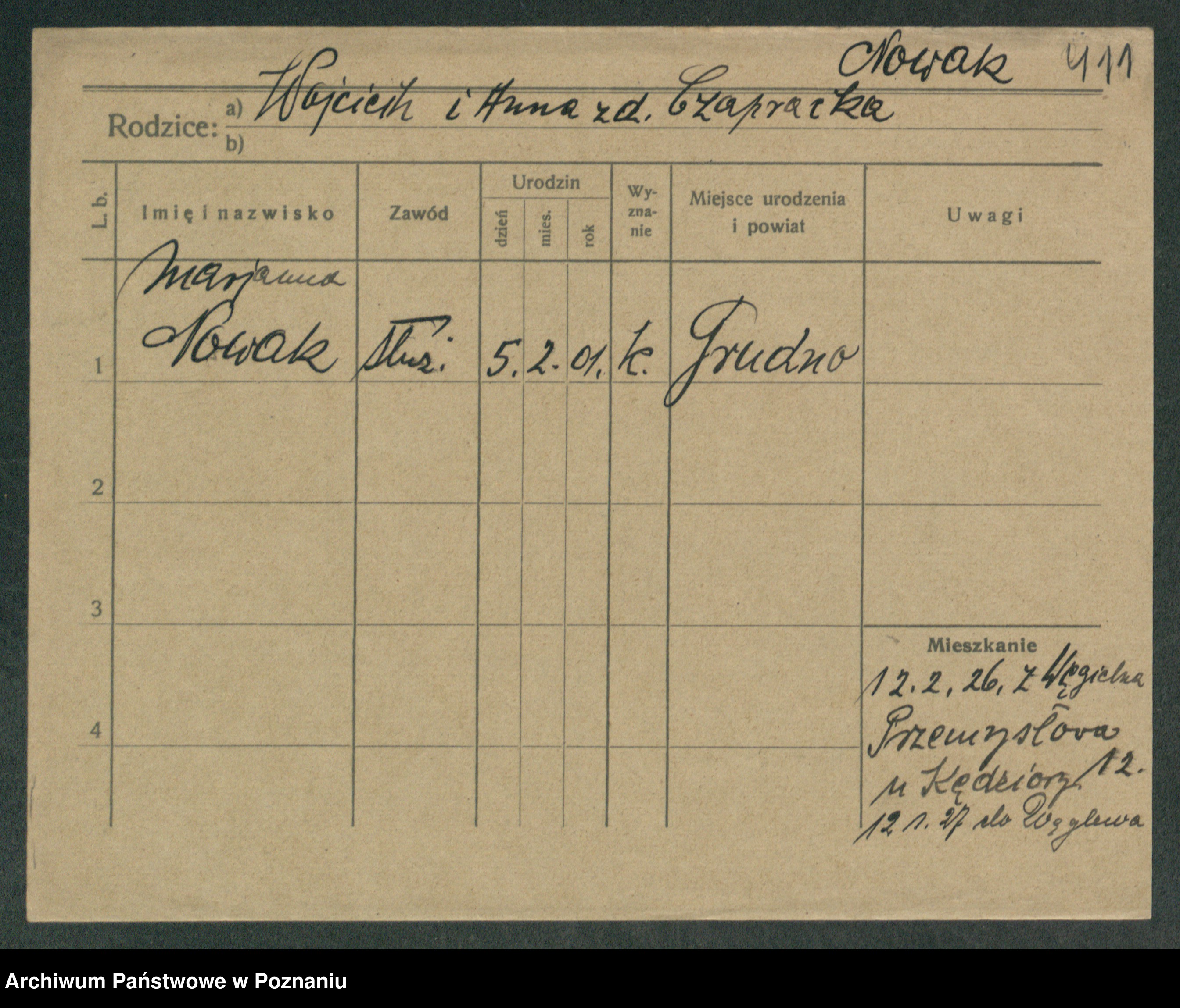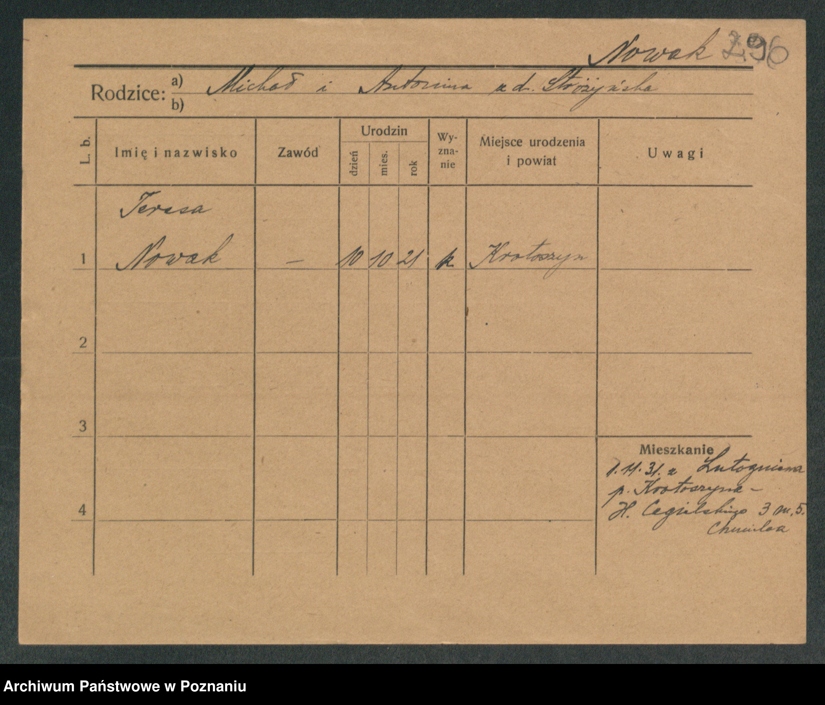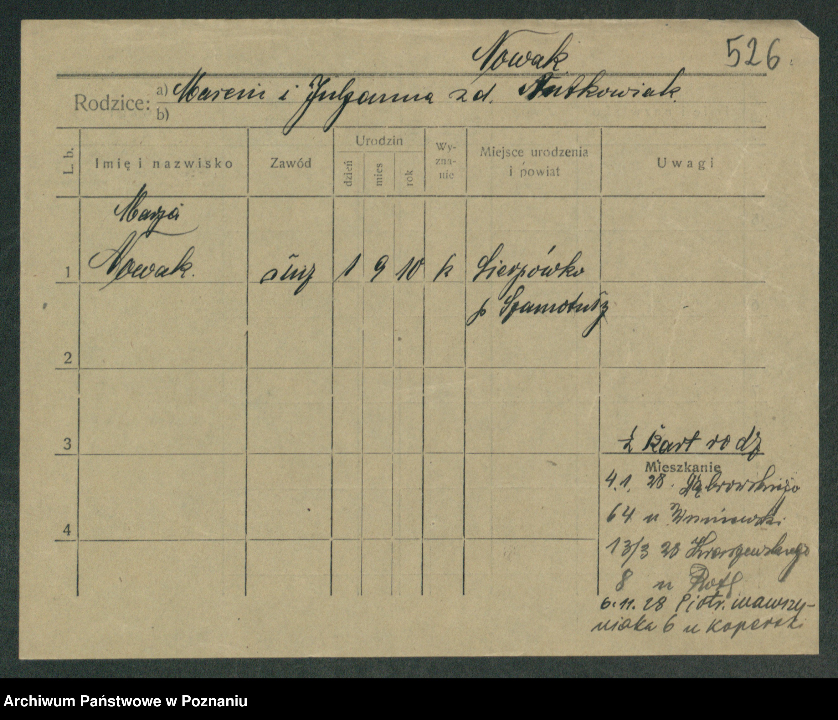 Podgląd karty osobowej dostępny jest po kliknięciu na nazwisko lub ikonkę karty. Można dokonywać powiększenia (ikony na górze) lub przechodzić między kolejnymi skanami (strzałki po bokach).