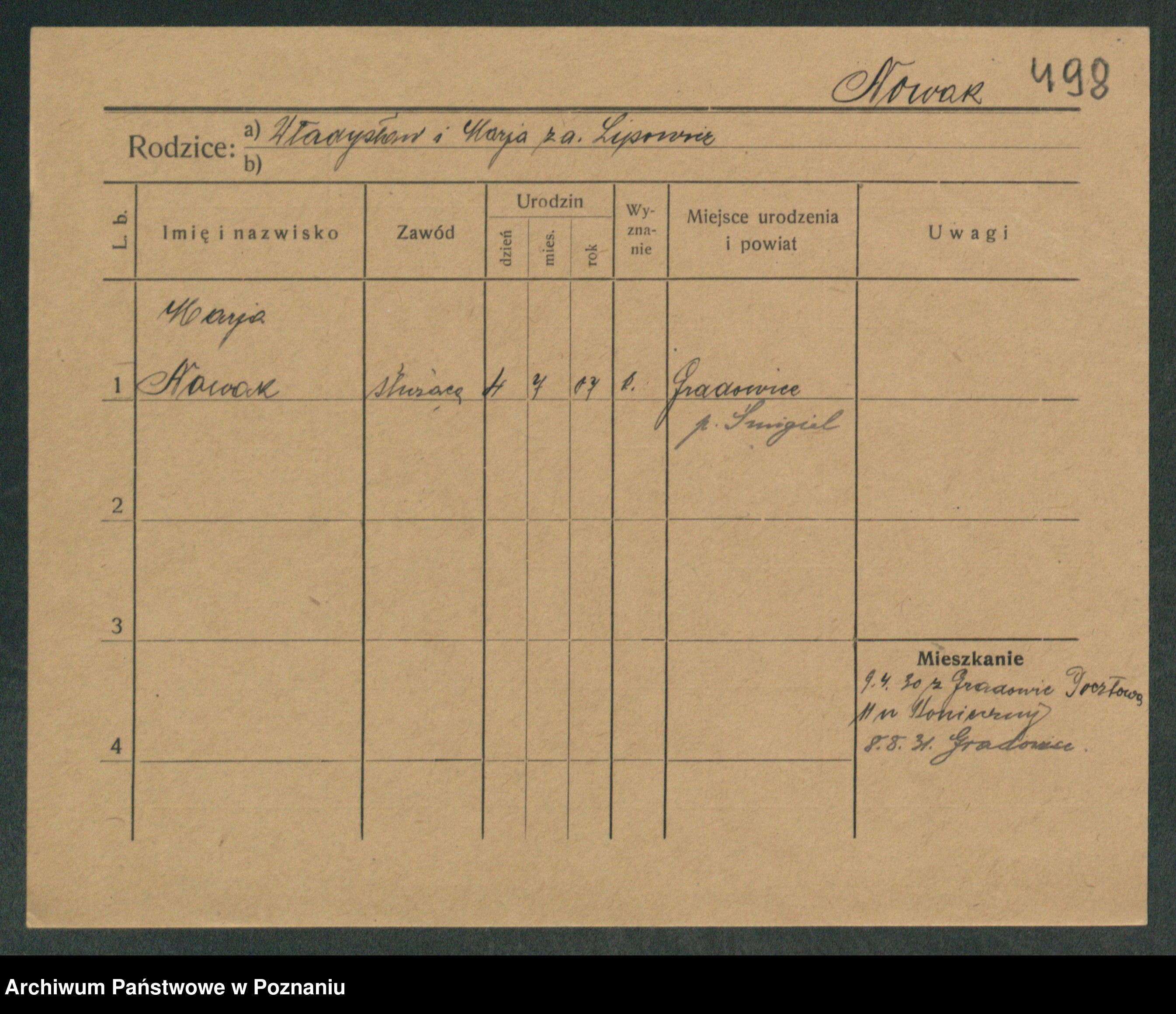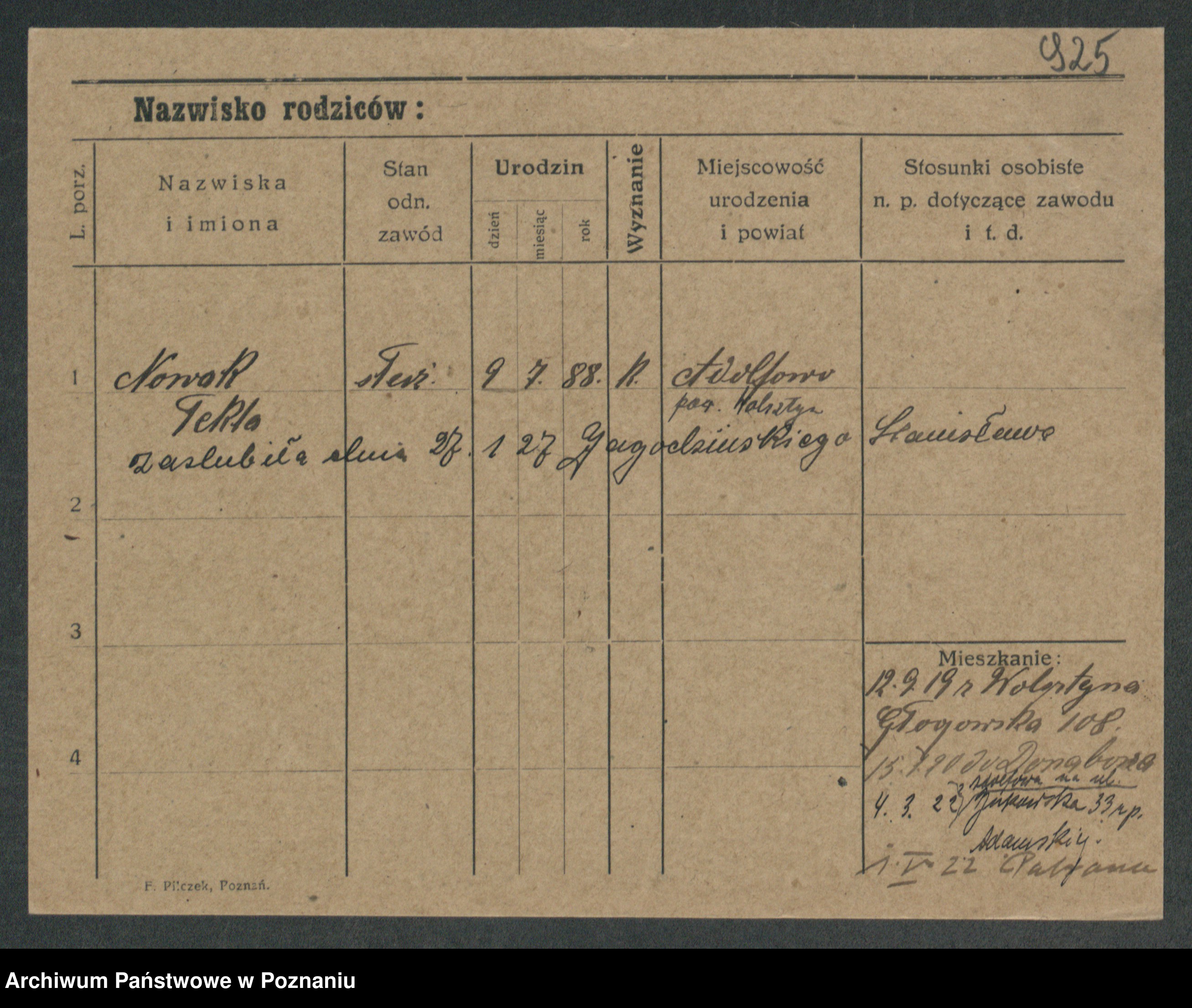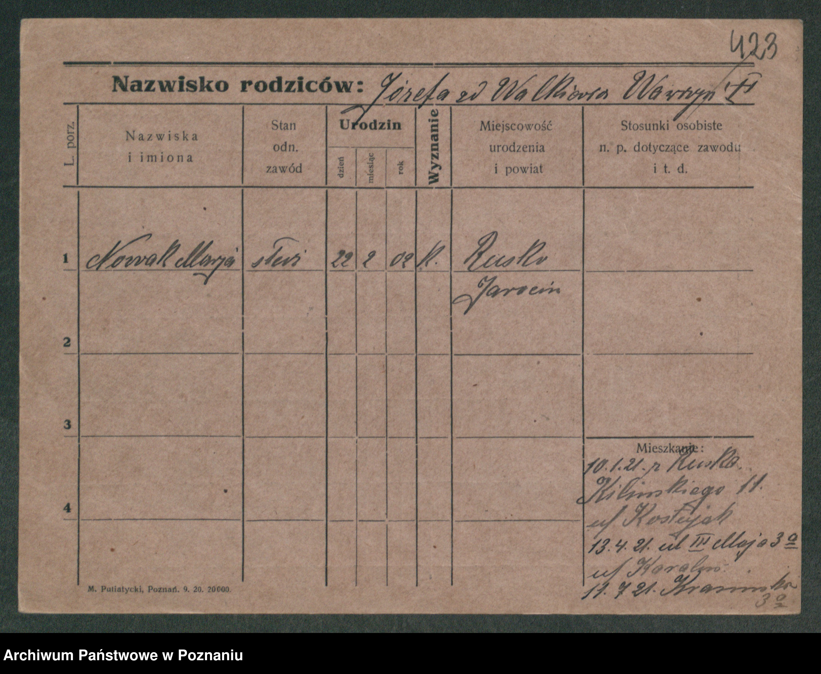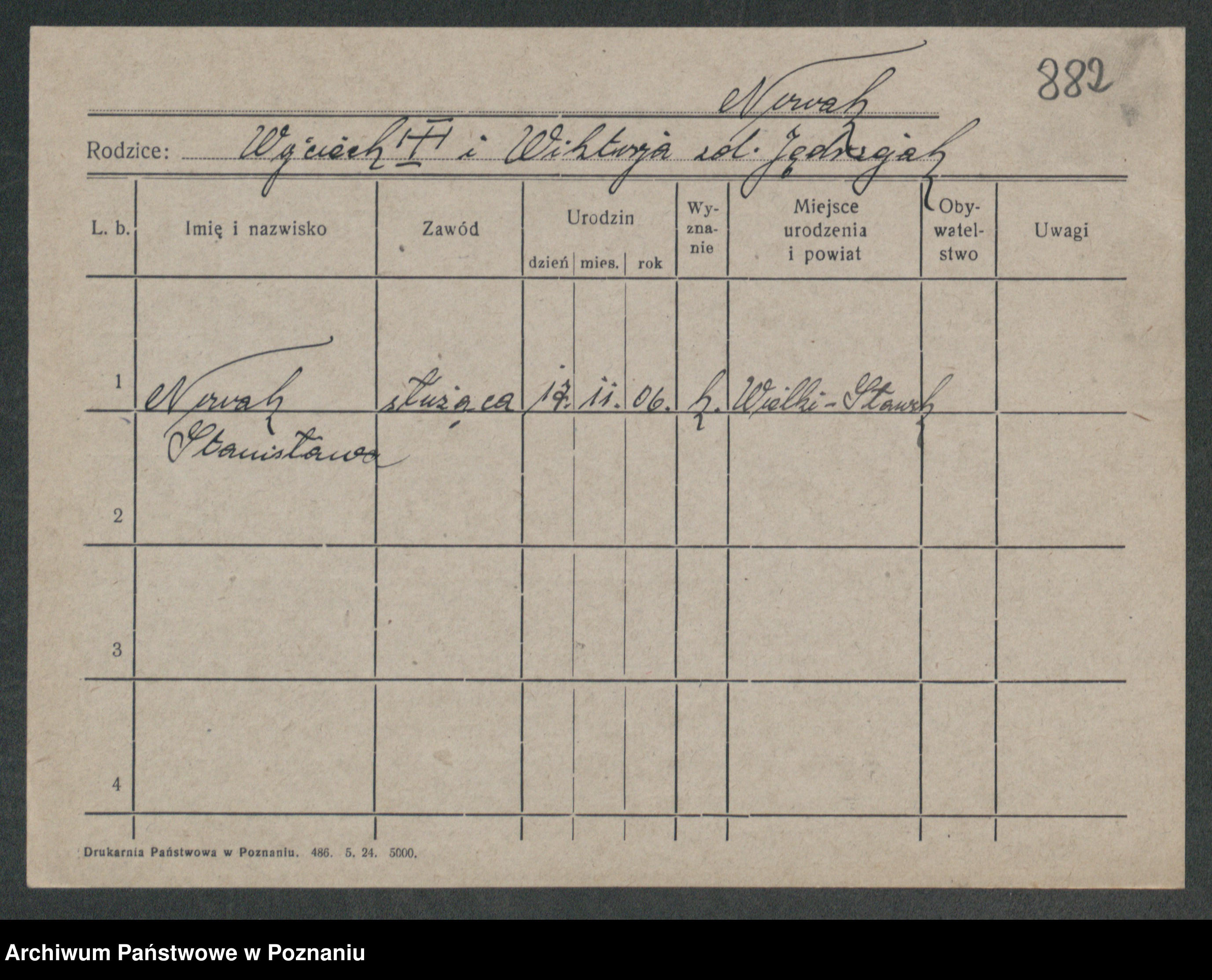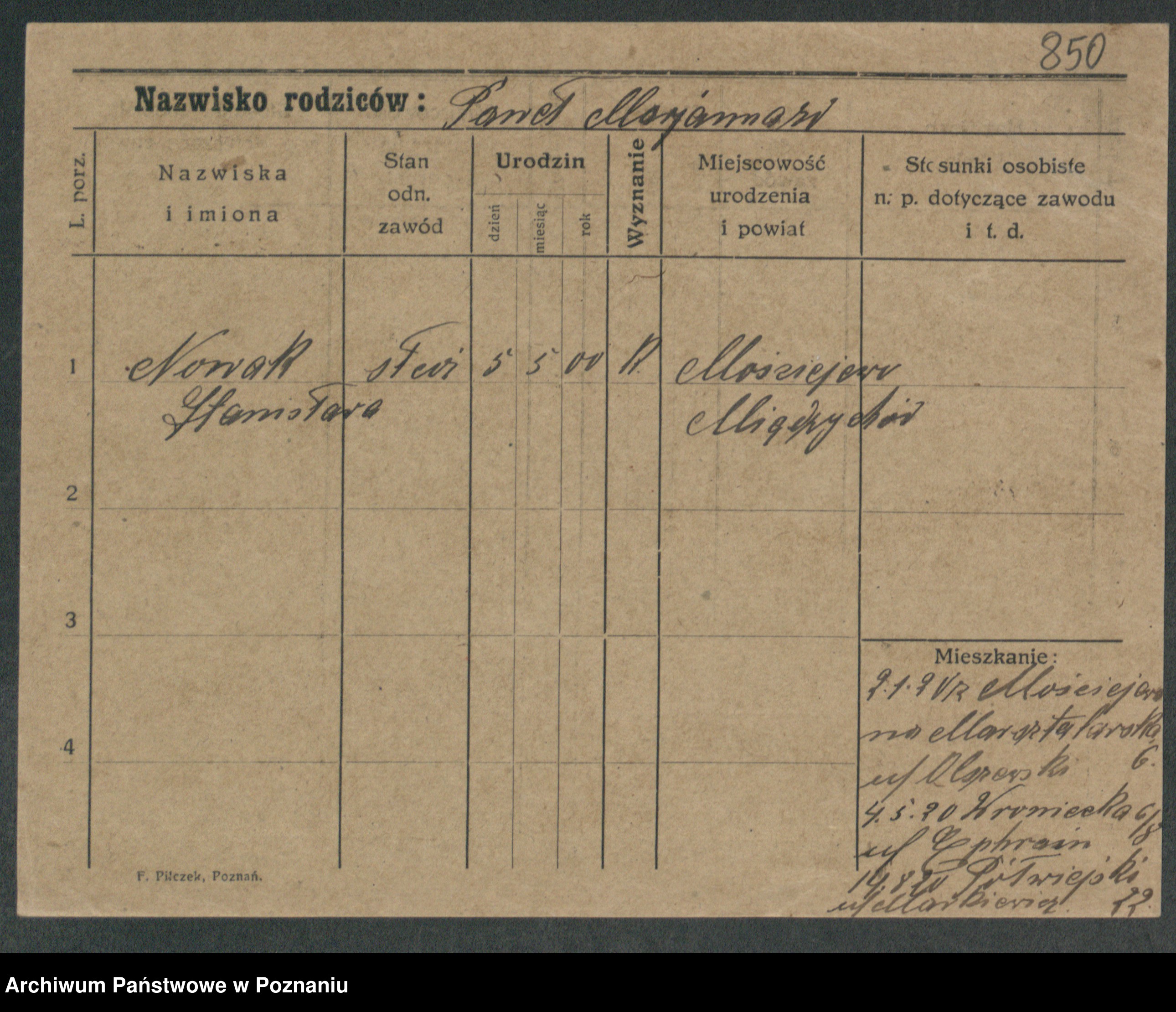 Podgląd karty osobowej dostępny jest po kliknięciu na nazwisko lub ikonkę karty. Można dokonywać powiększenia (ikony na górze) lub przechodzić między kolejnymi skanami (strzałki po bokach).