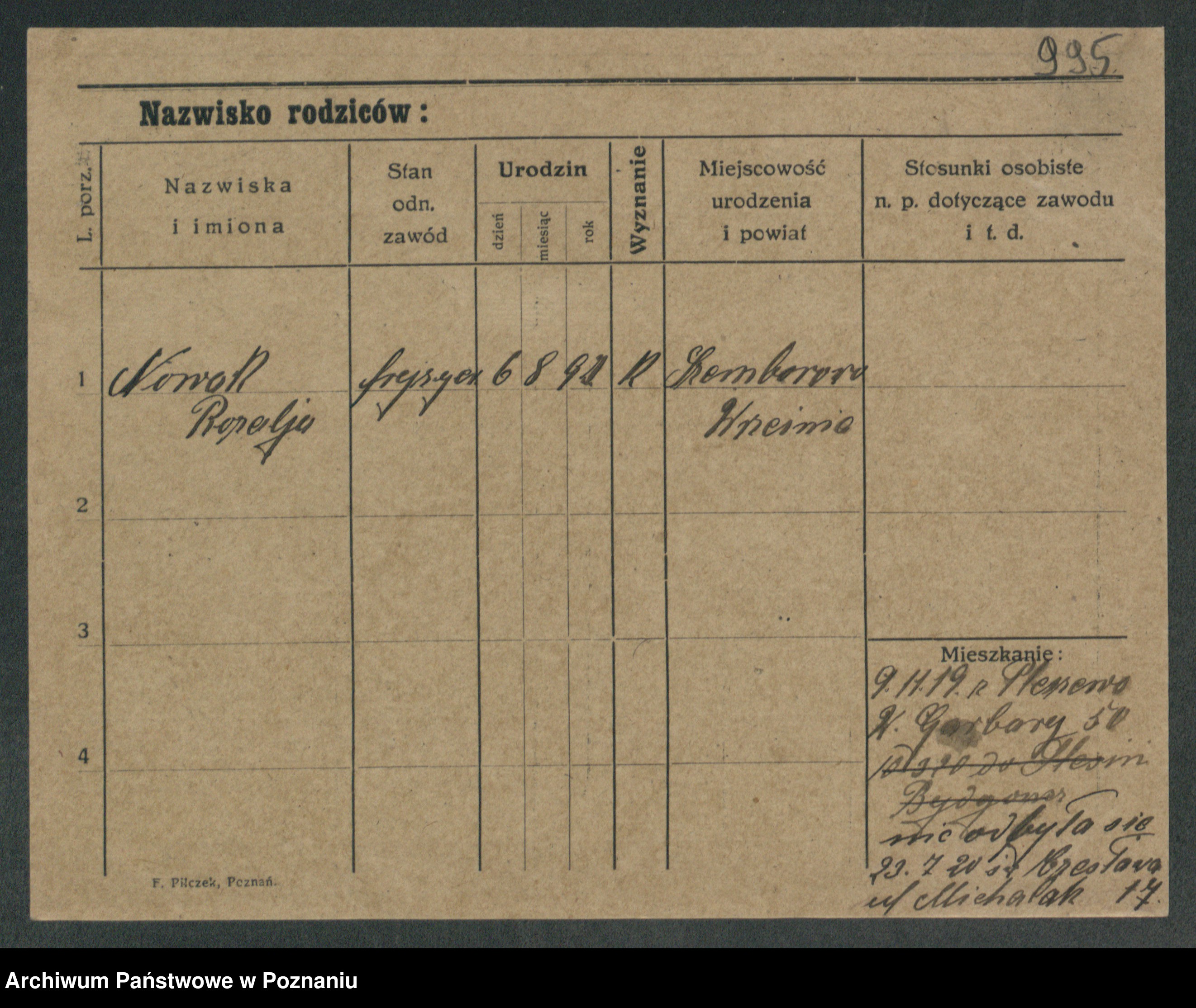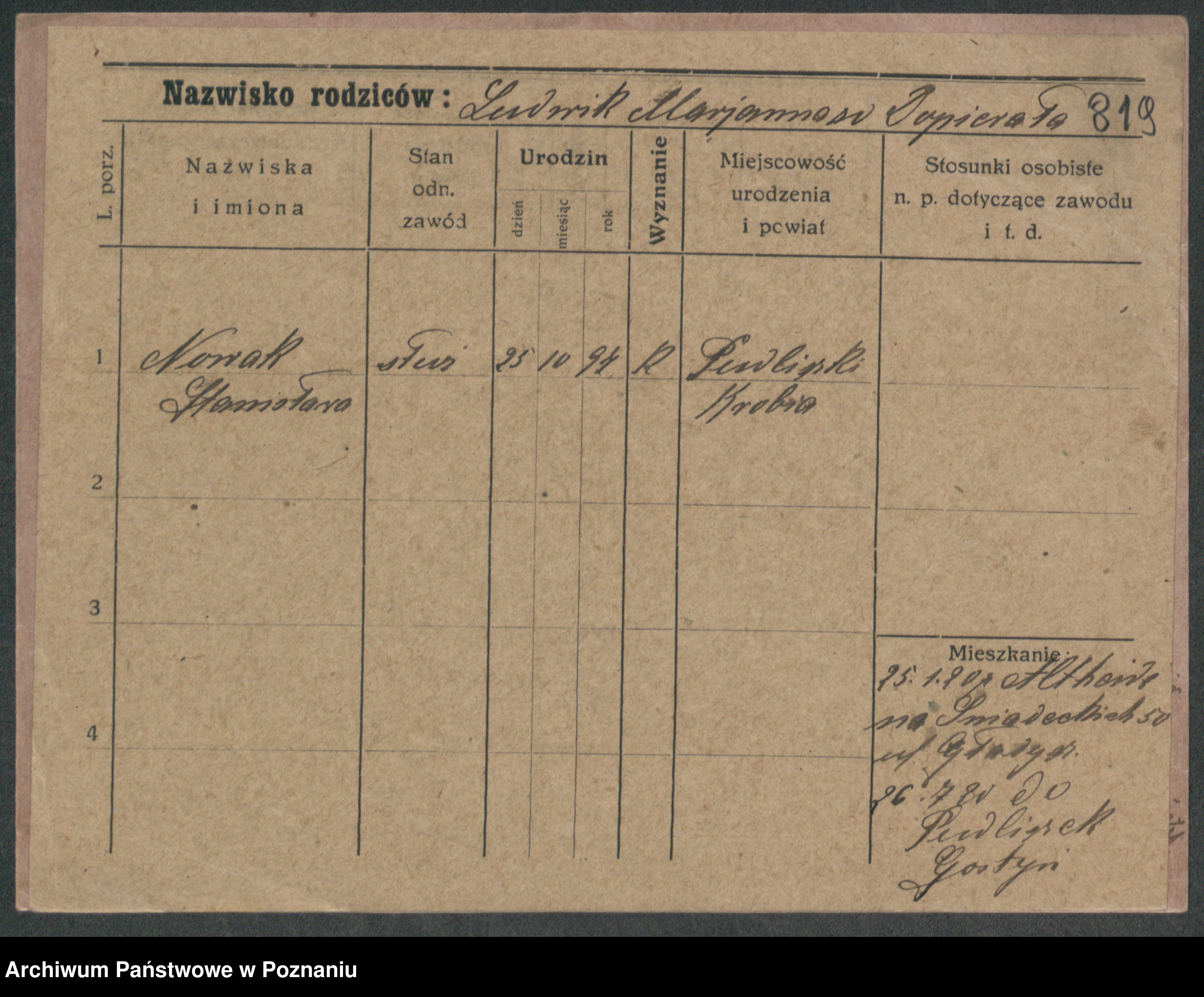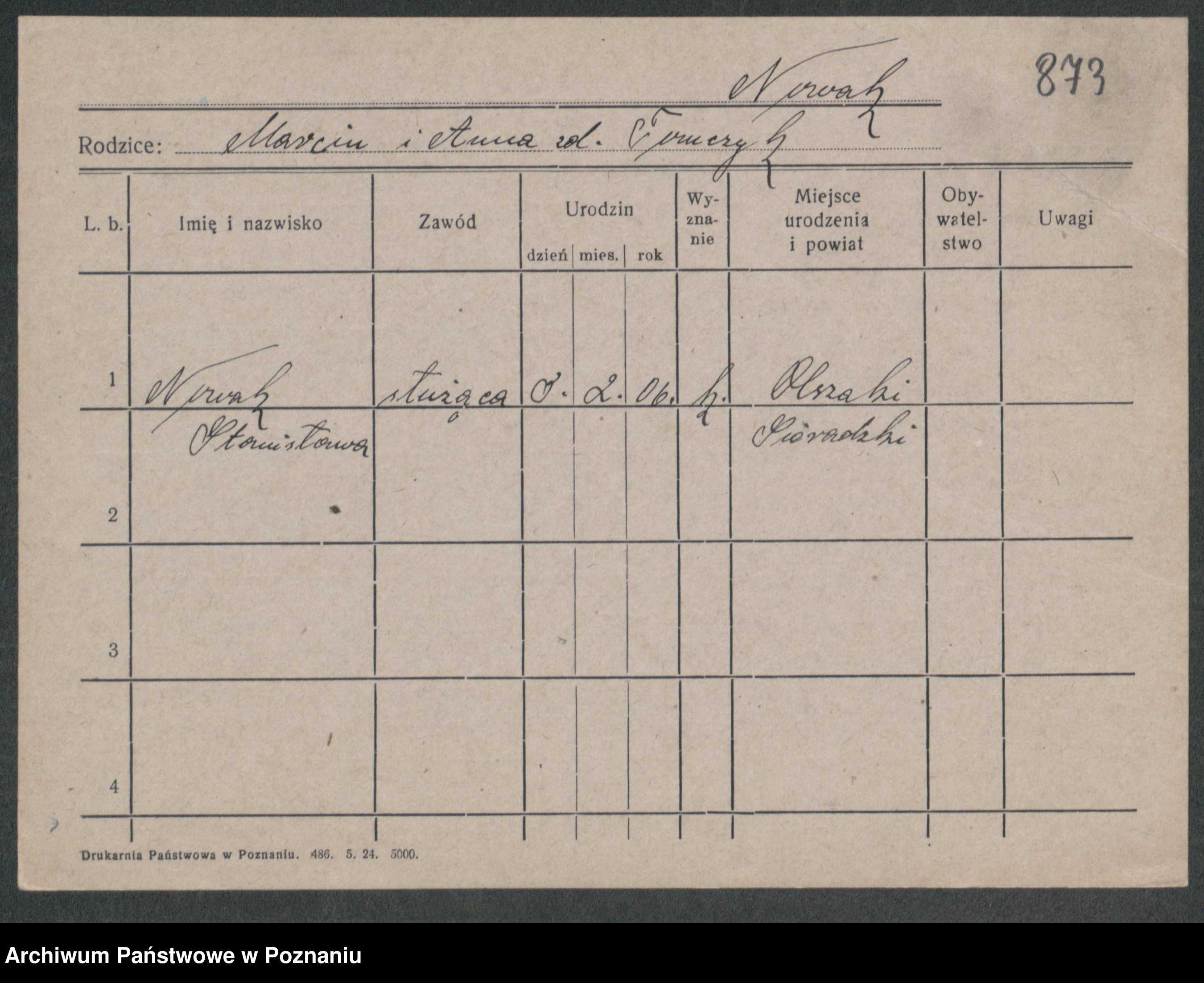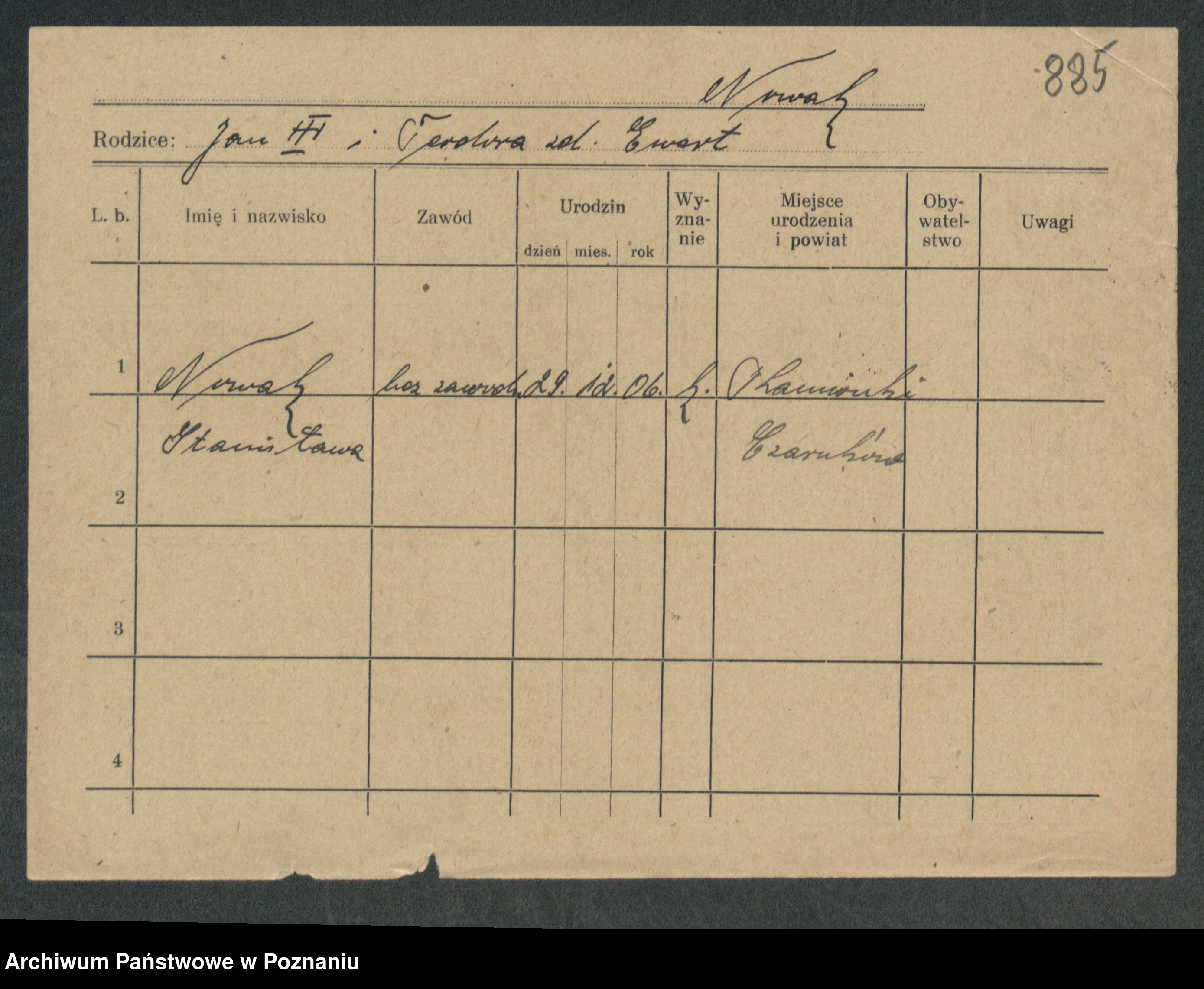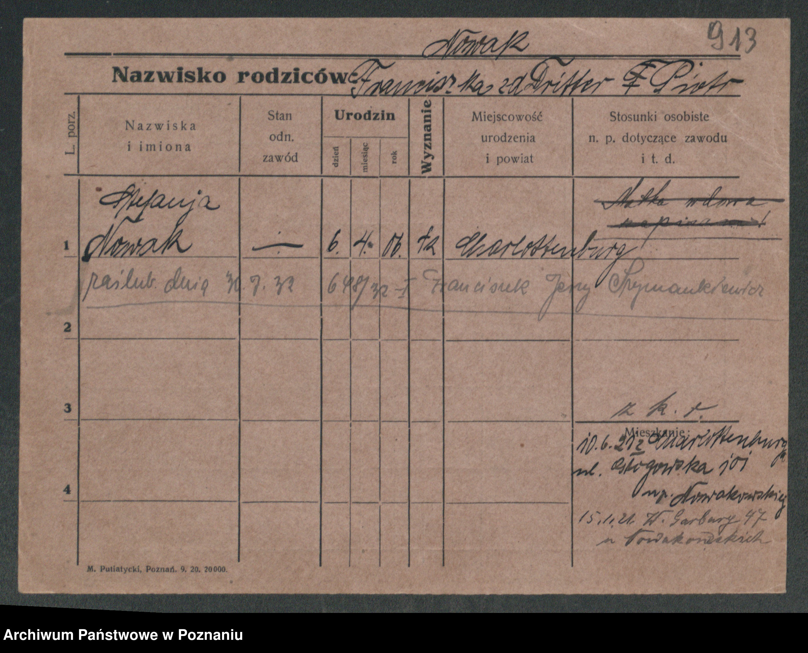 Podgląd karty osobowej dostępny jest po kliknięciu na nazwisko lub ikonkę karty. Można dokonywać powiększenia (ikony na górze) lub przechodzić między kolejnymi skanami (strzałki po bokach).