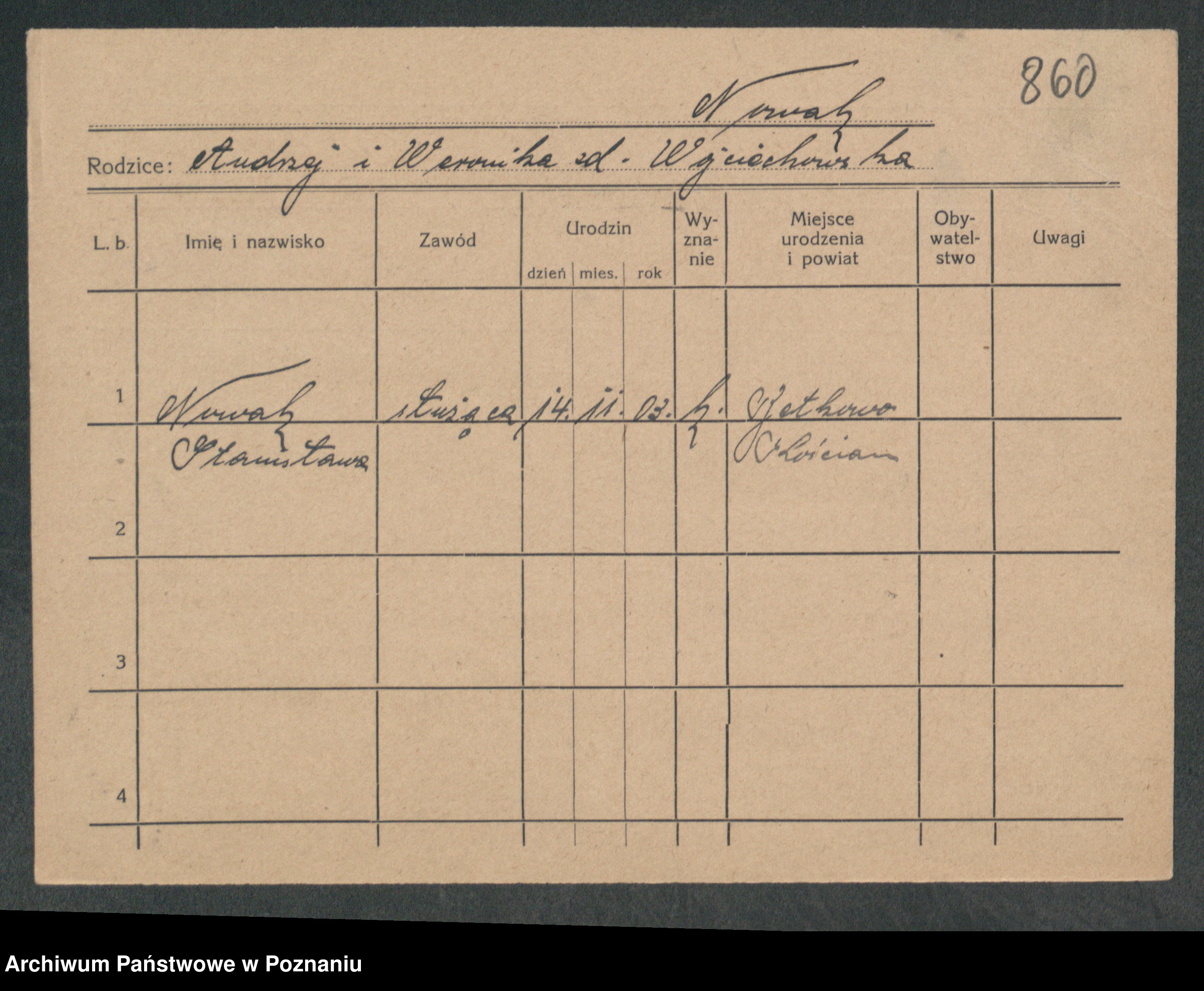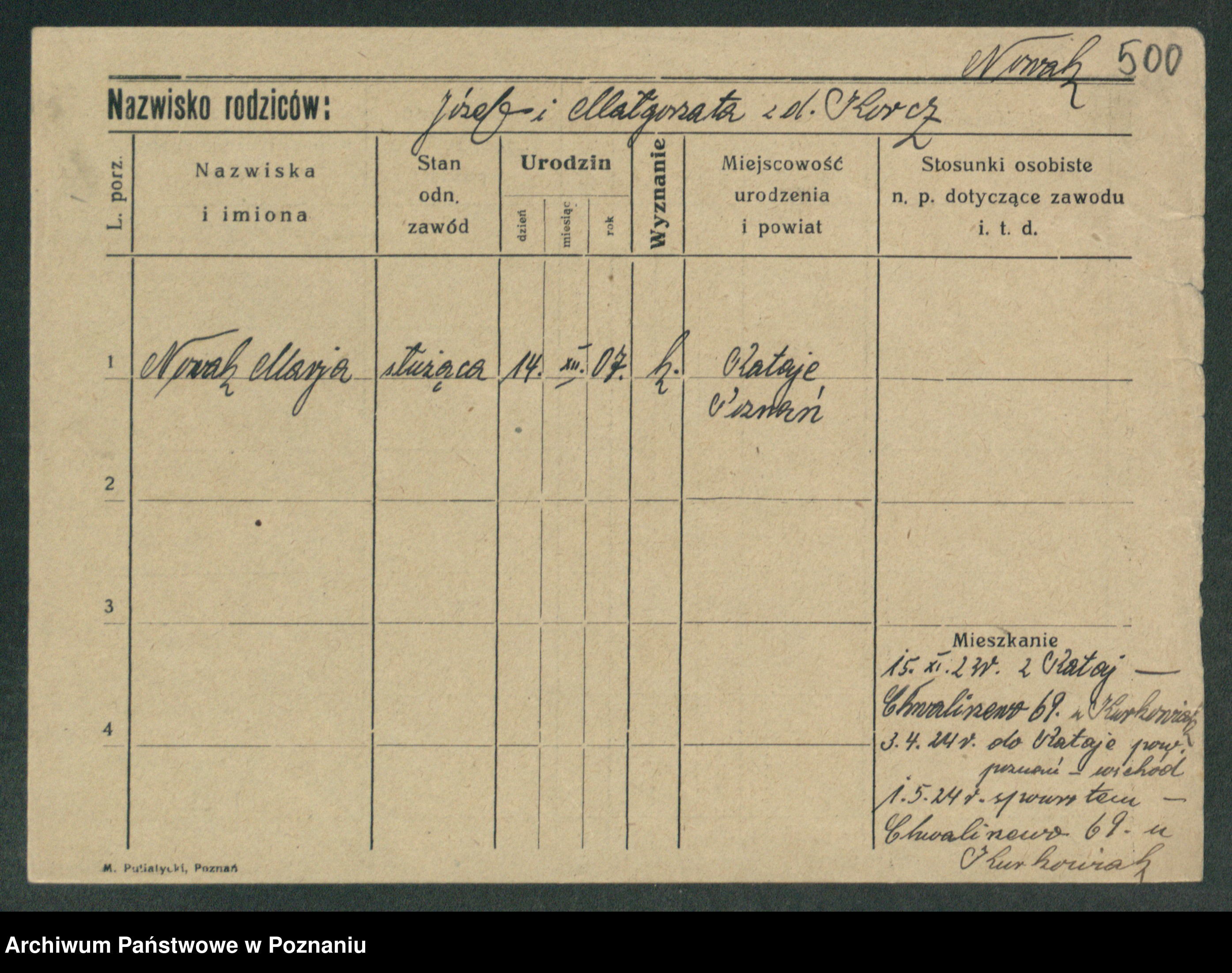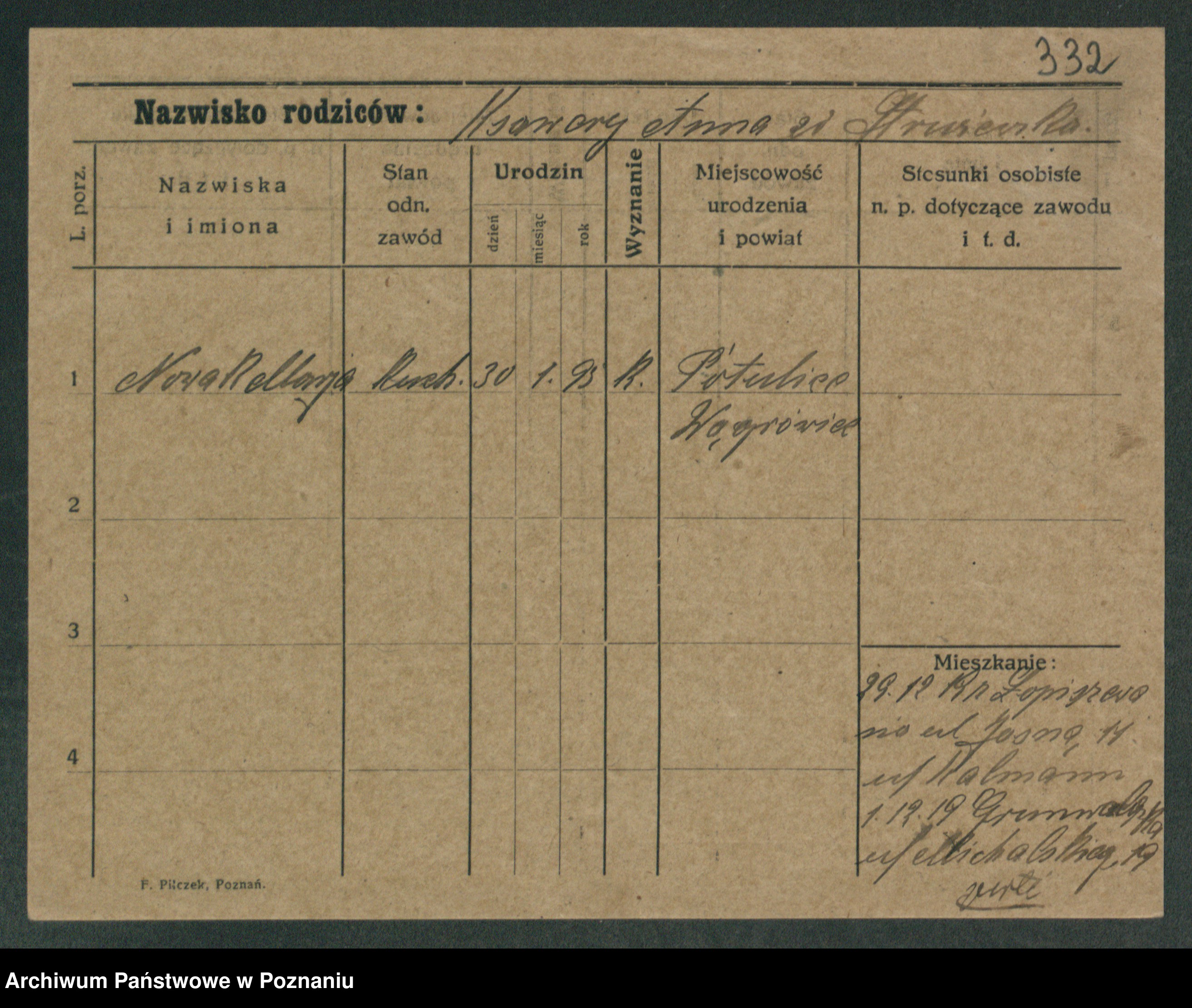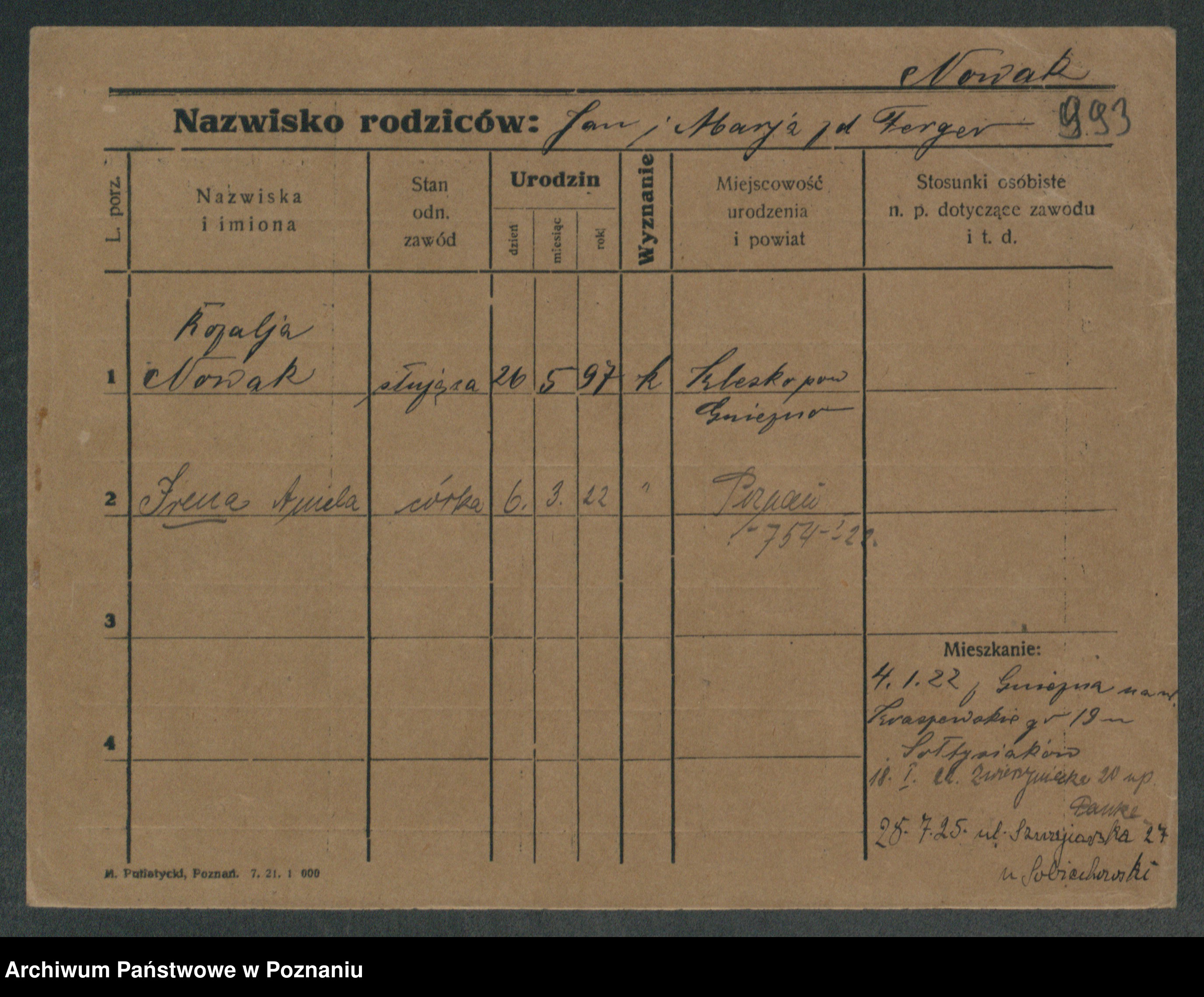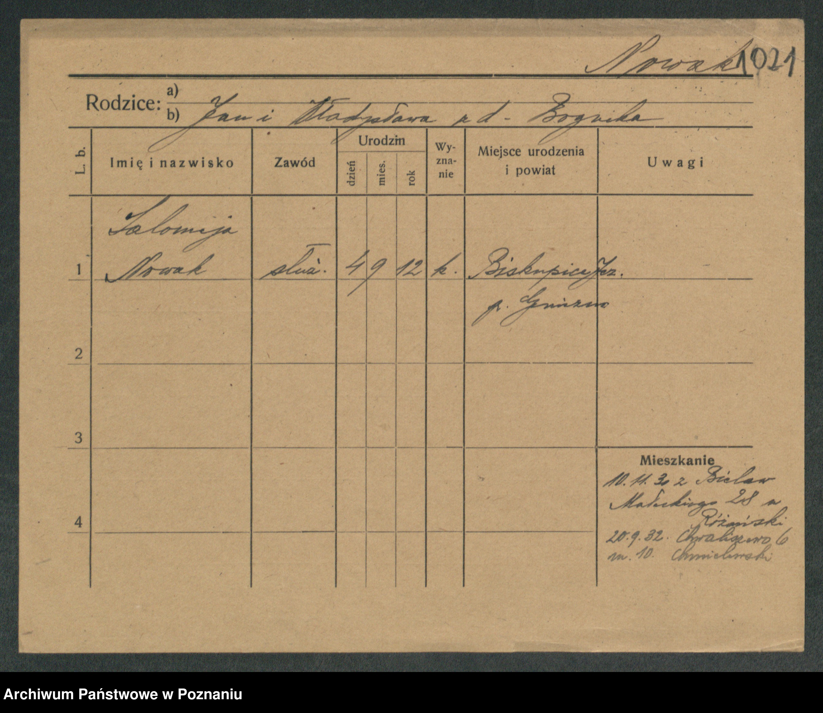 Podgląd karty osobowej dostępny jest po kliknięciu na nazwisko lub ikonkę karty. Można dokonywać powiększenia (ikony na górze) lub przechodzić między kolejnymi skanami (strzałki po bokach).