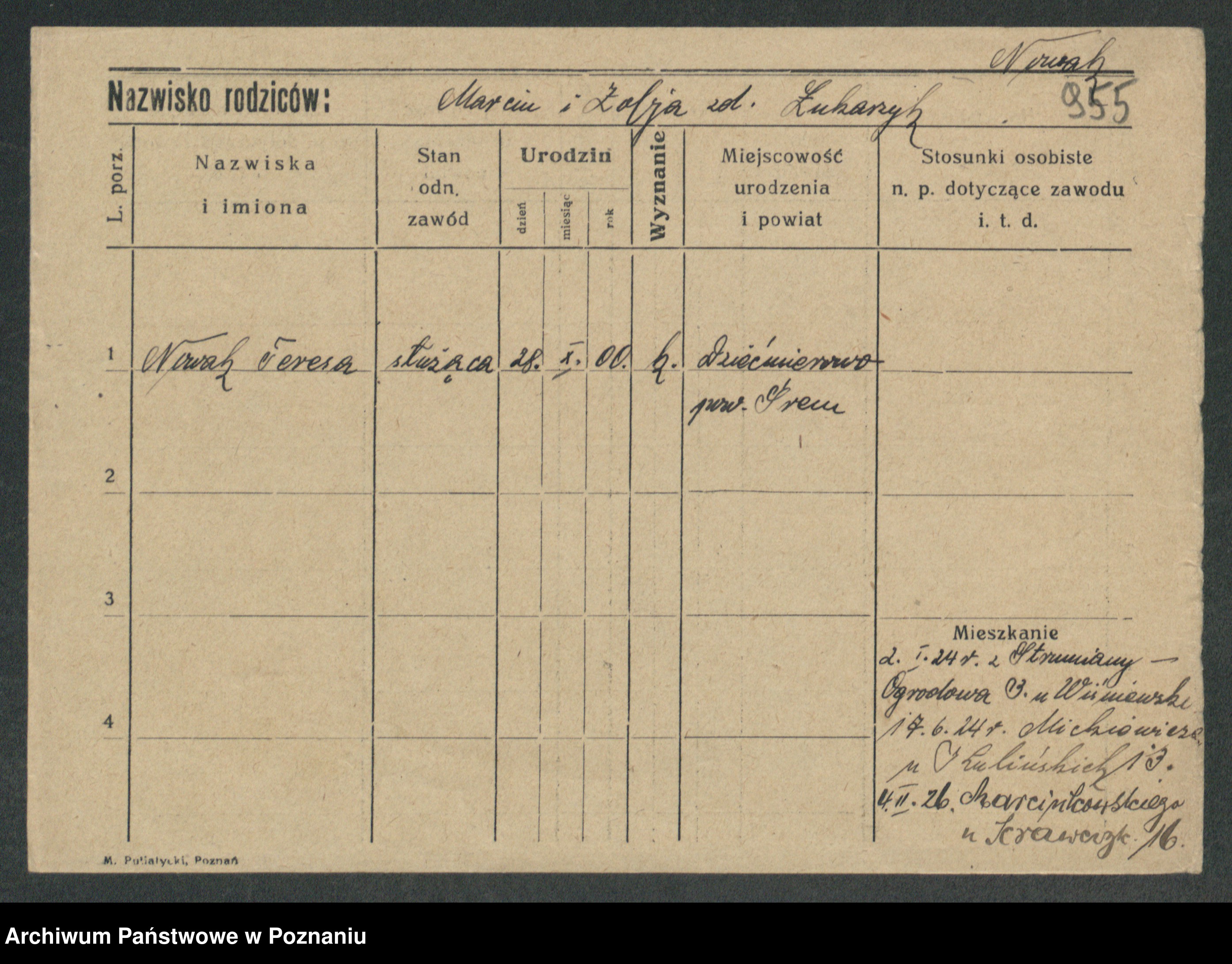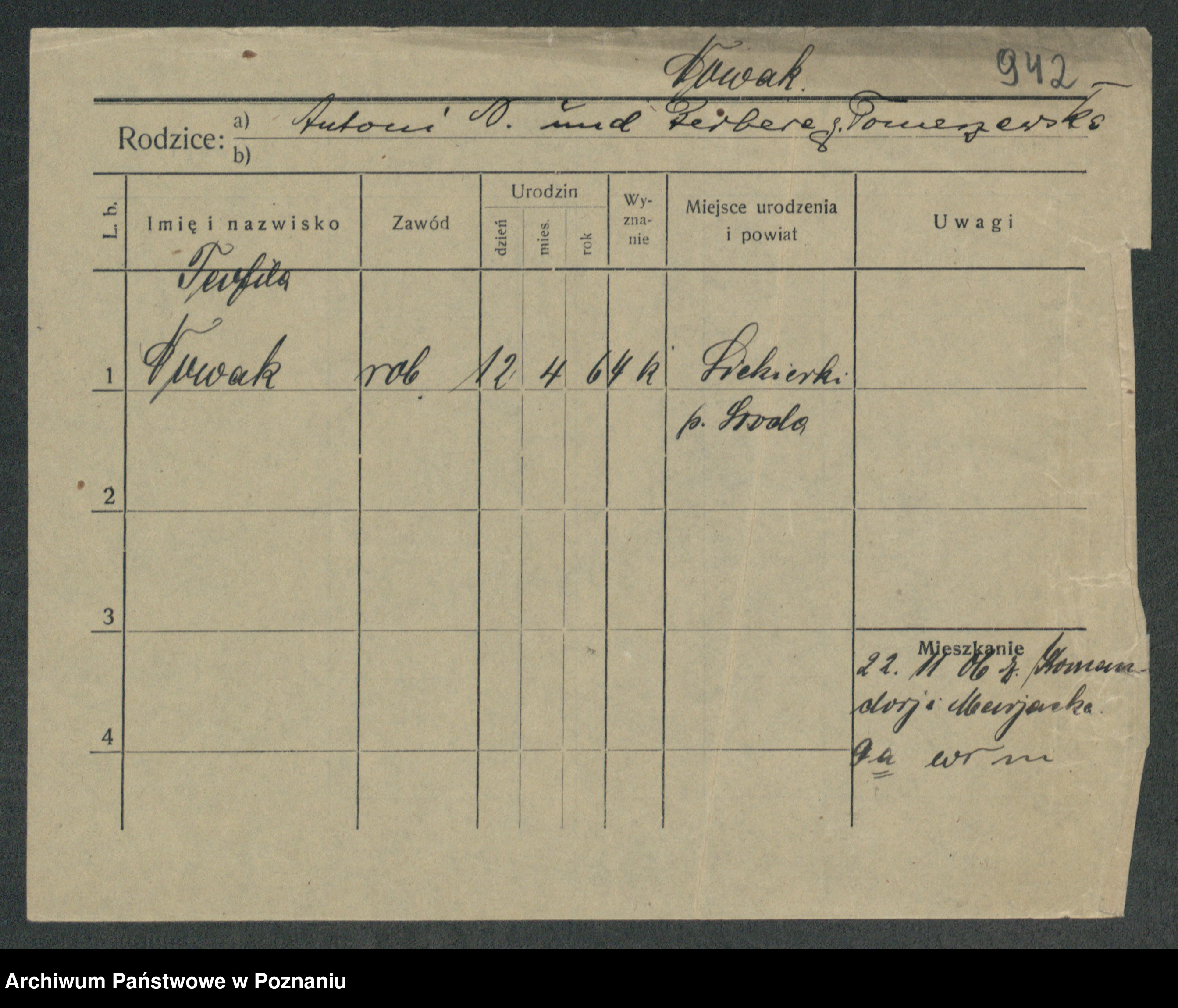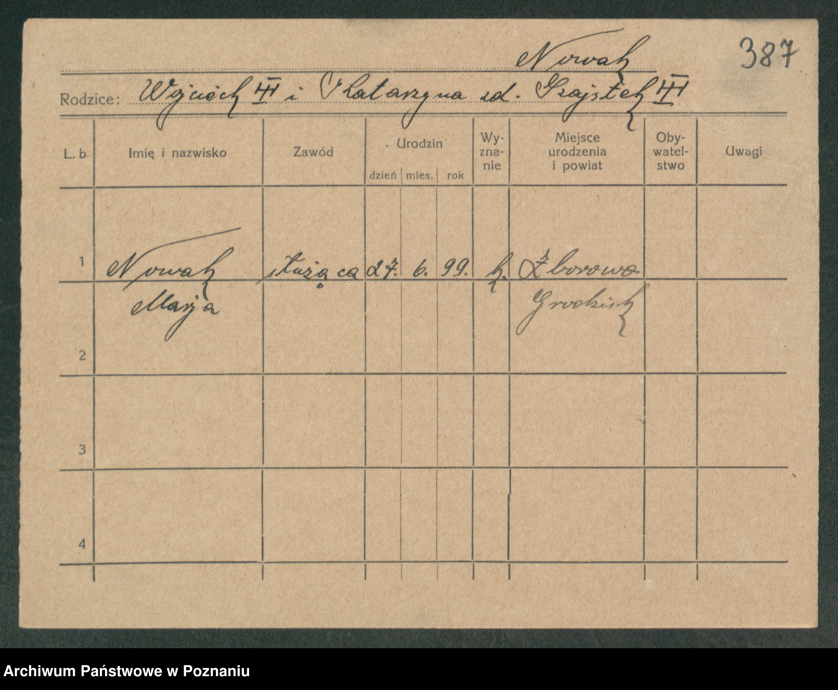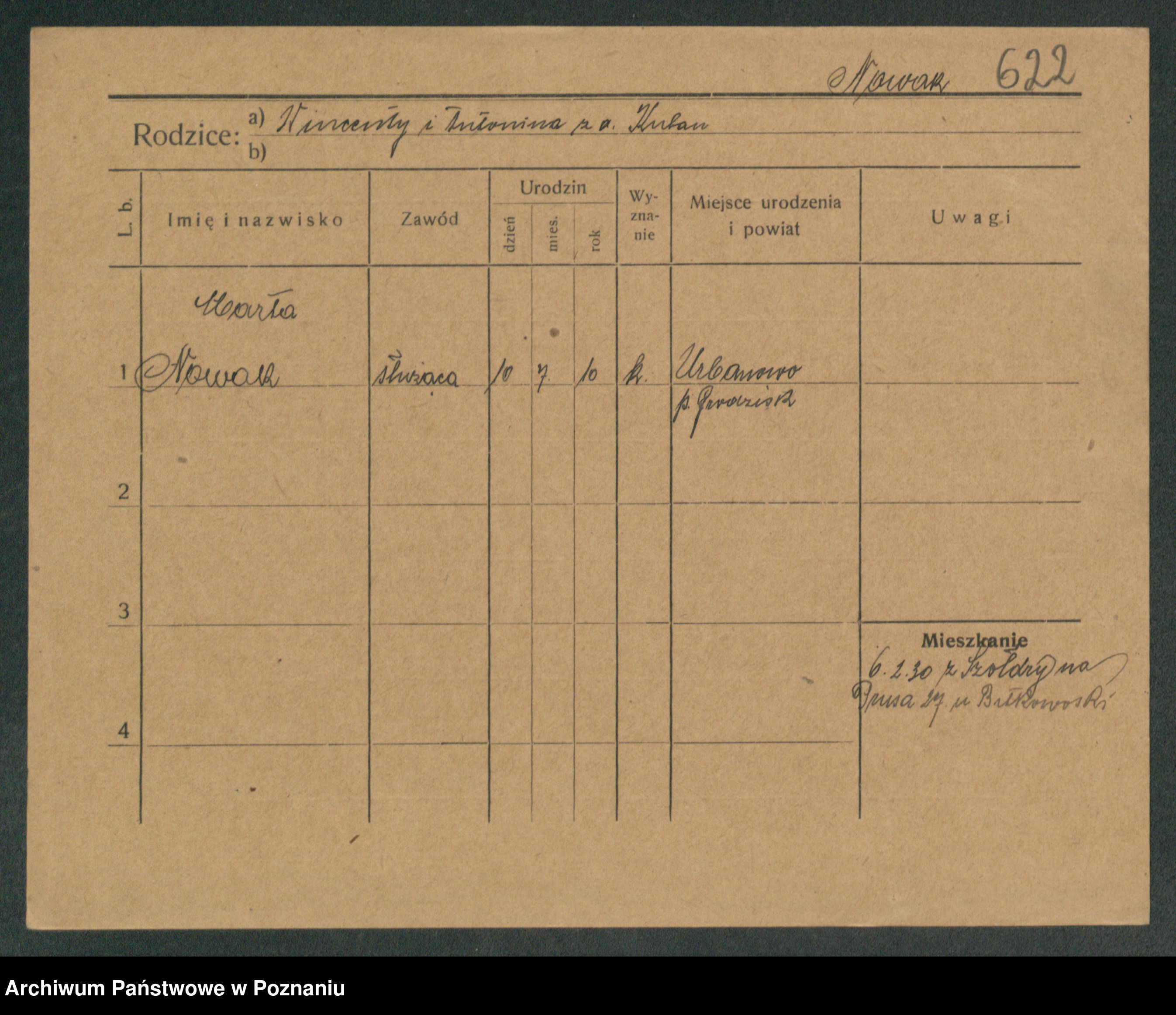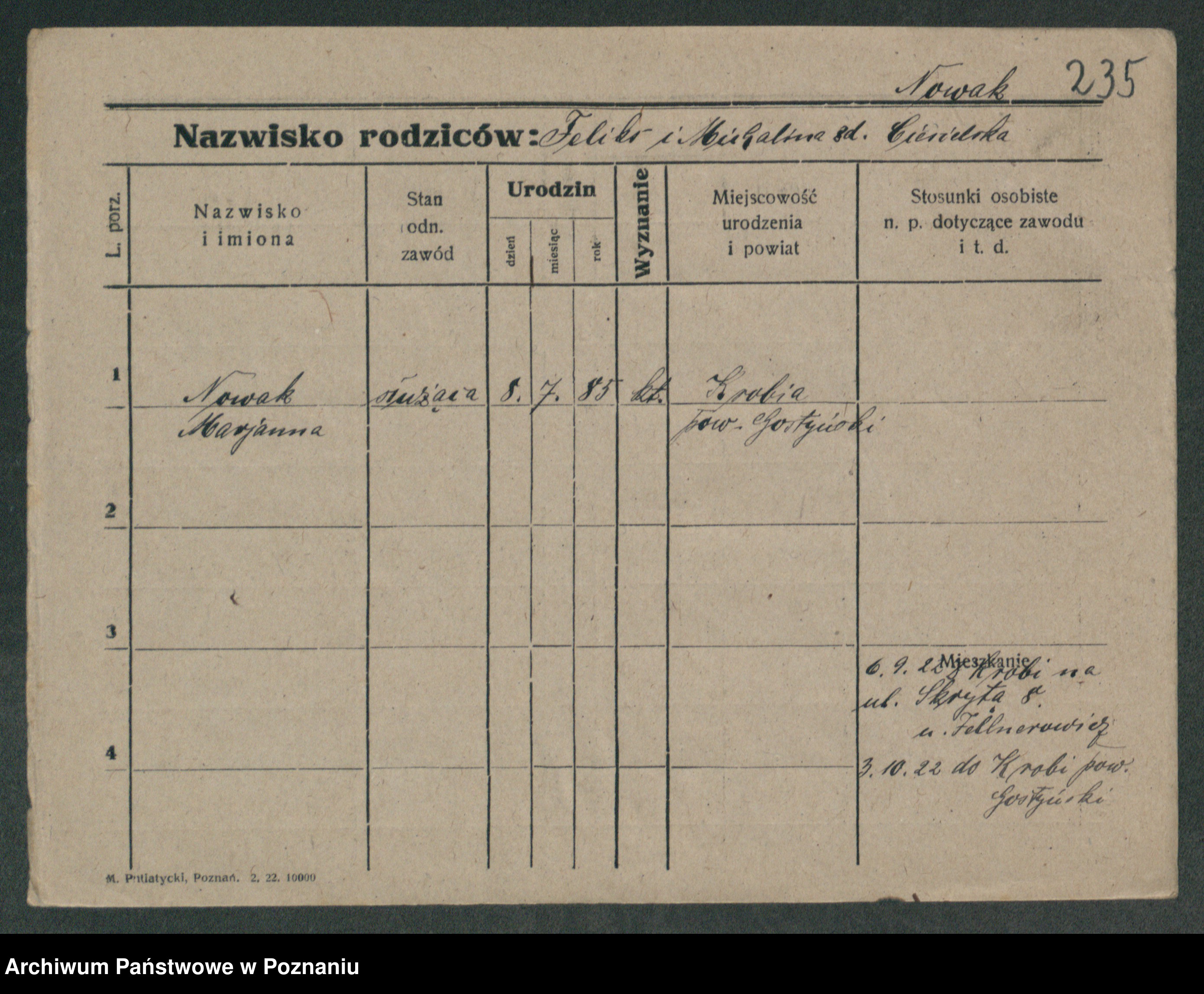 Podgląd karty osobowej dostępny jest po kliknięciu na nazwisko lub ikonkę karty. Można dokonywać powiększenia (ikony na górze) lub przechodzić między kolejnymi skanami (strzałki po bokach).