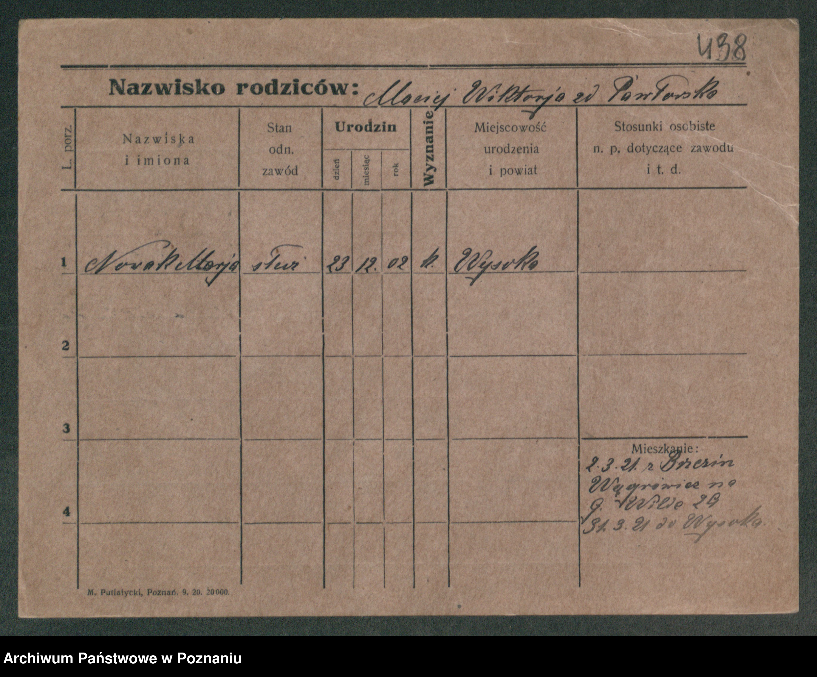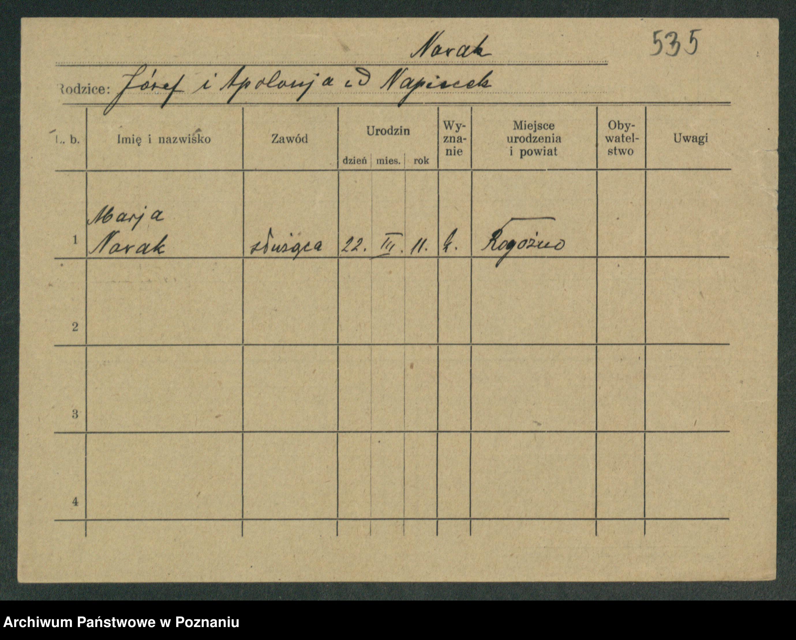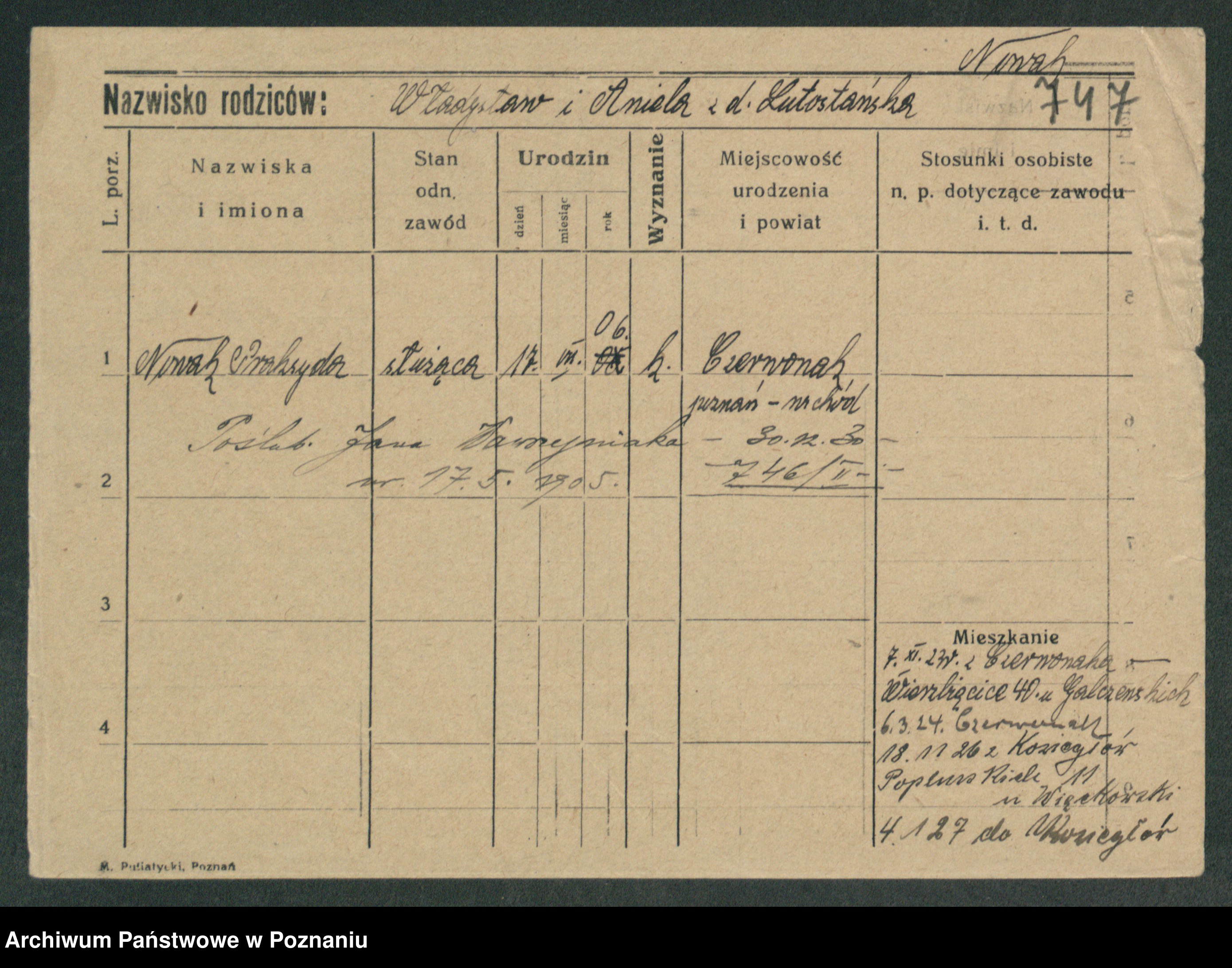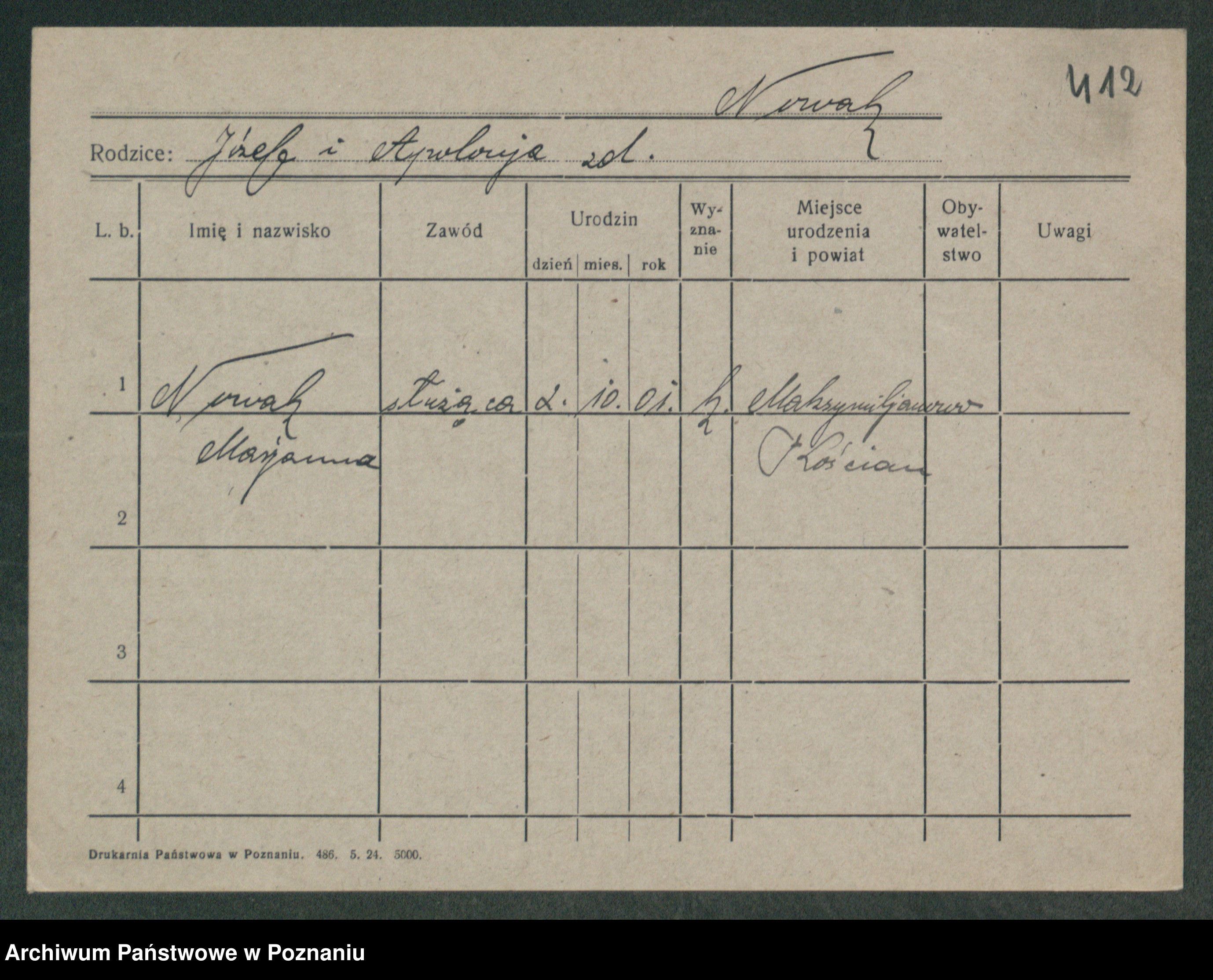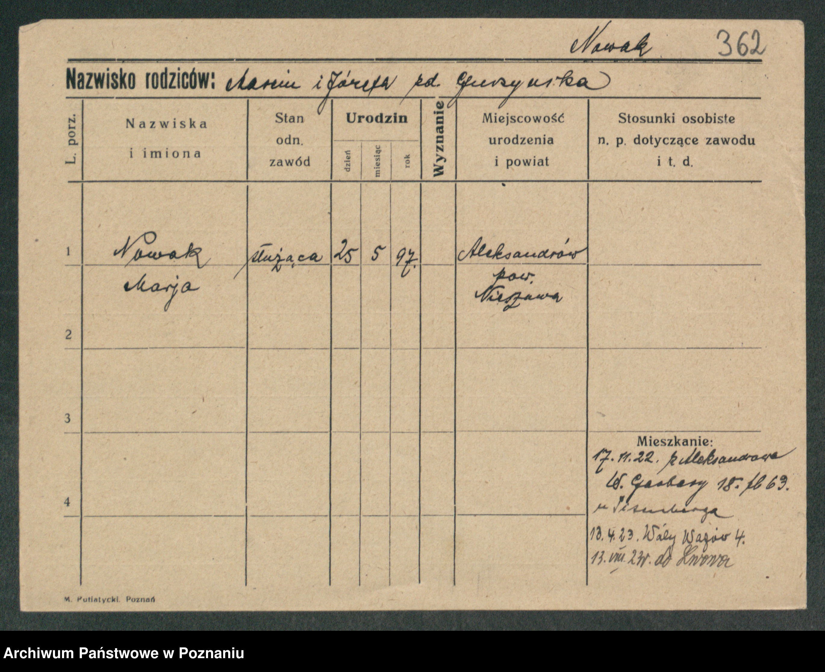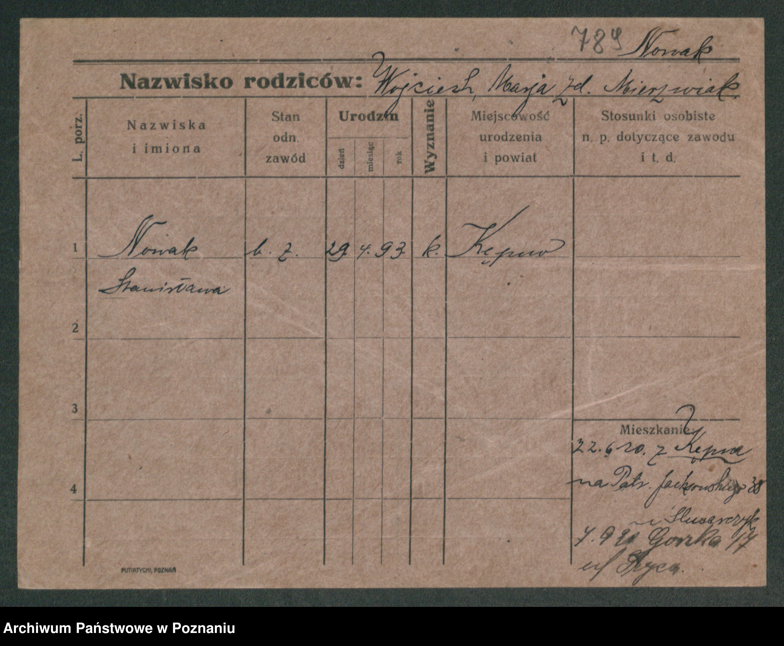 Podgląd karty osobowej dostępny jest po kliknięciu na nazwisko lub ikonkę karty. Można dokonywać powiększenia (ikony na górze) lub przechodzić między kolejnymi skanami (strzałki po bokach).
