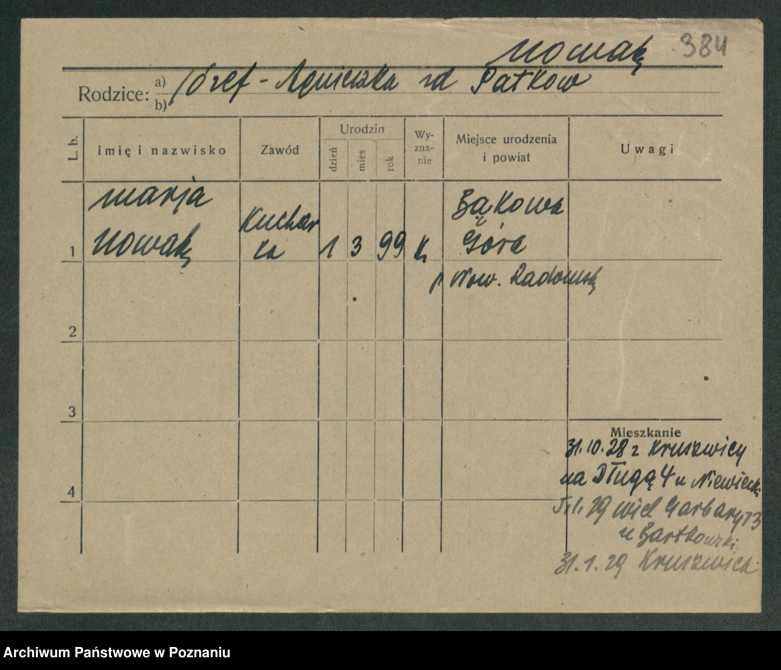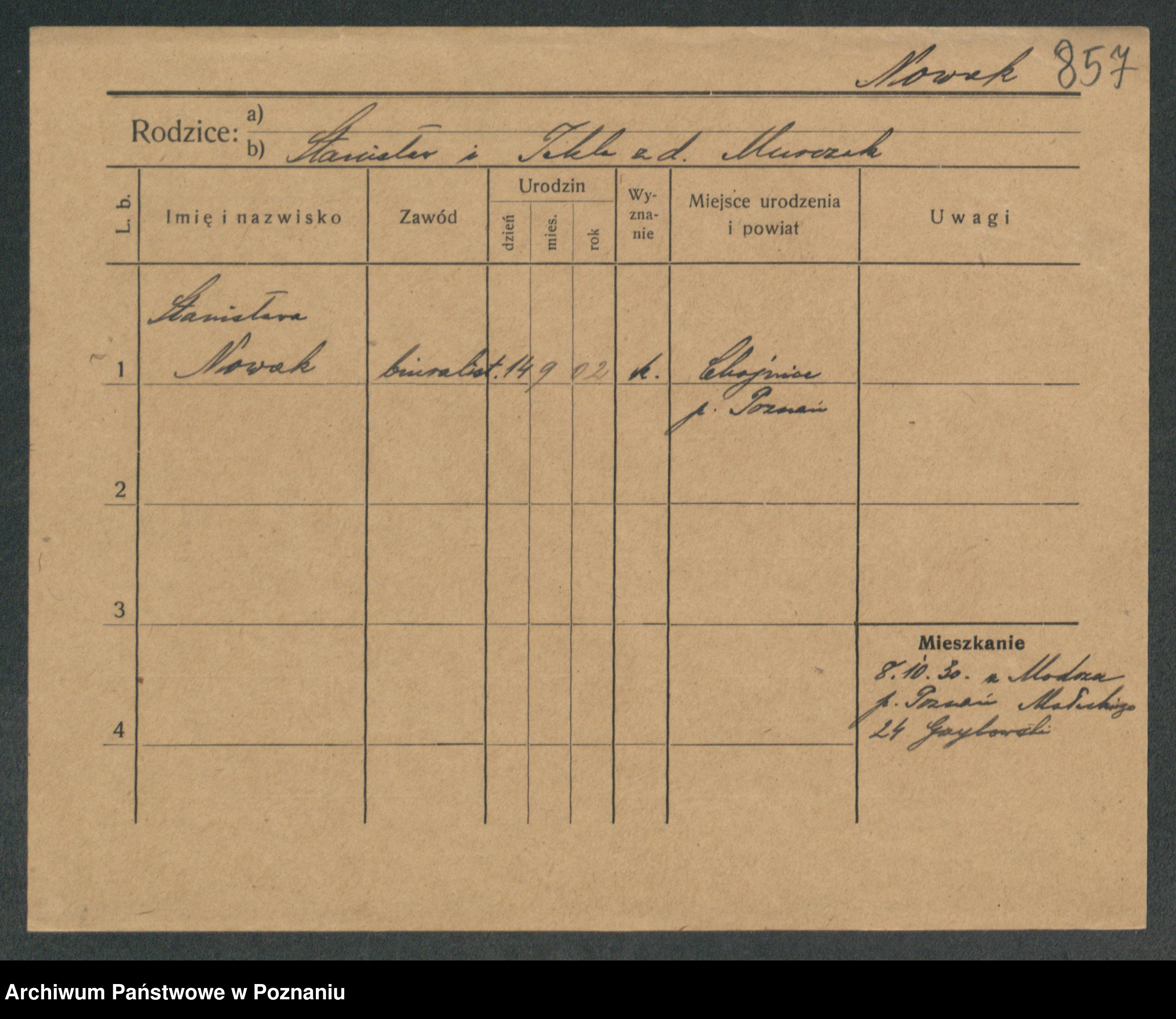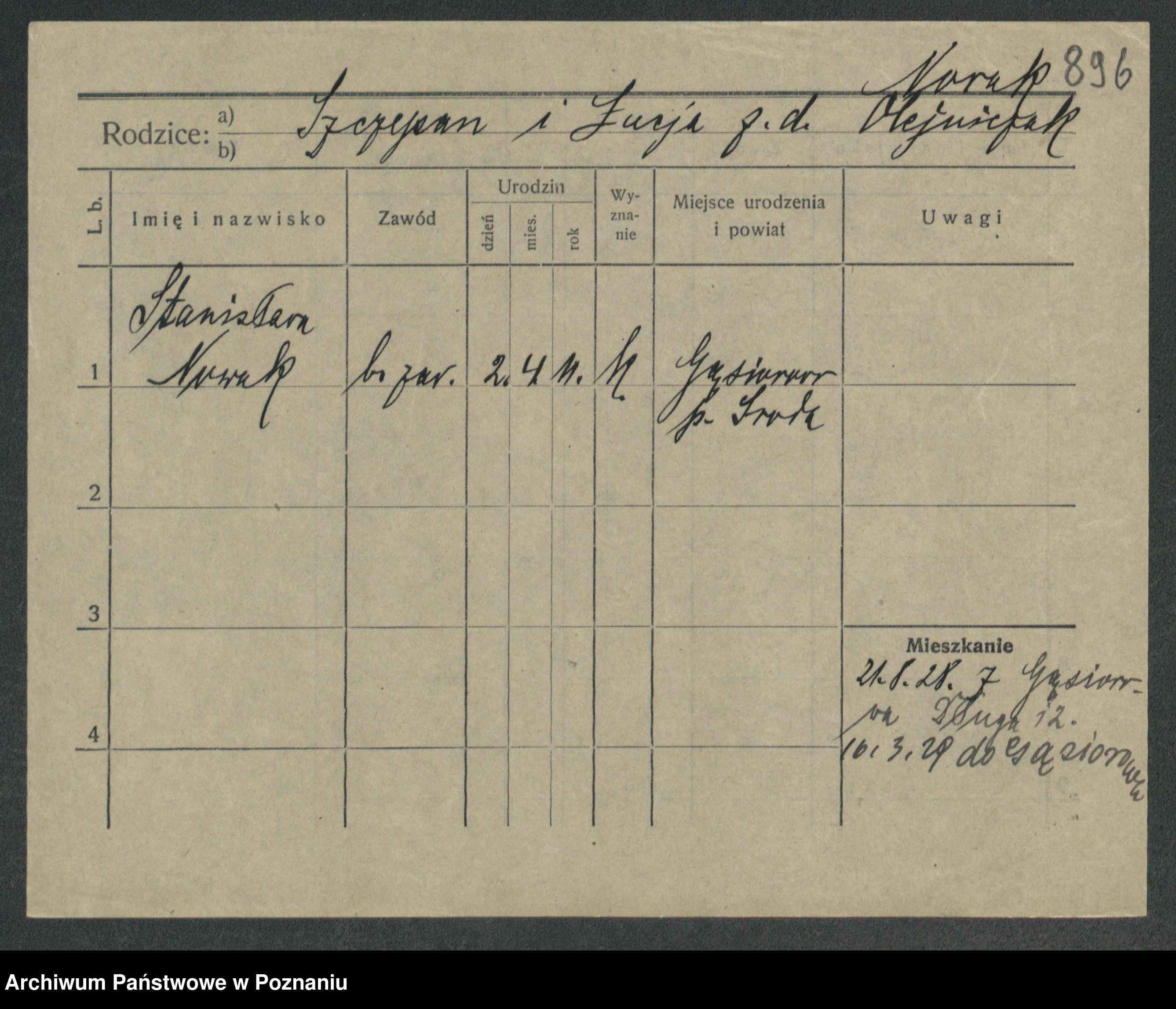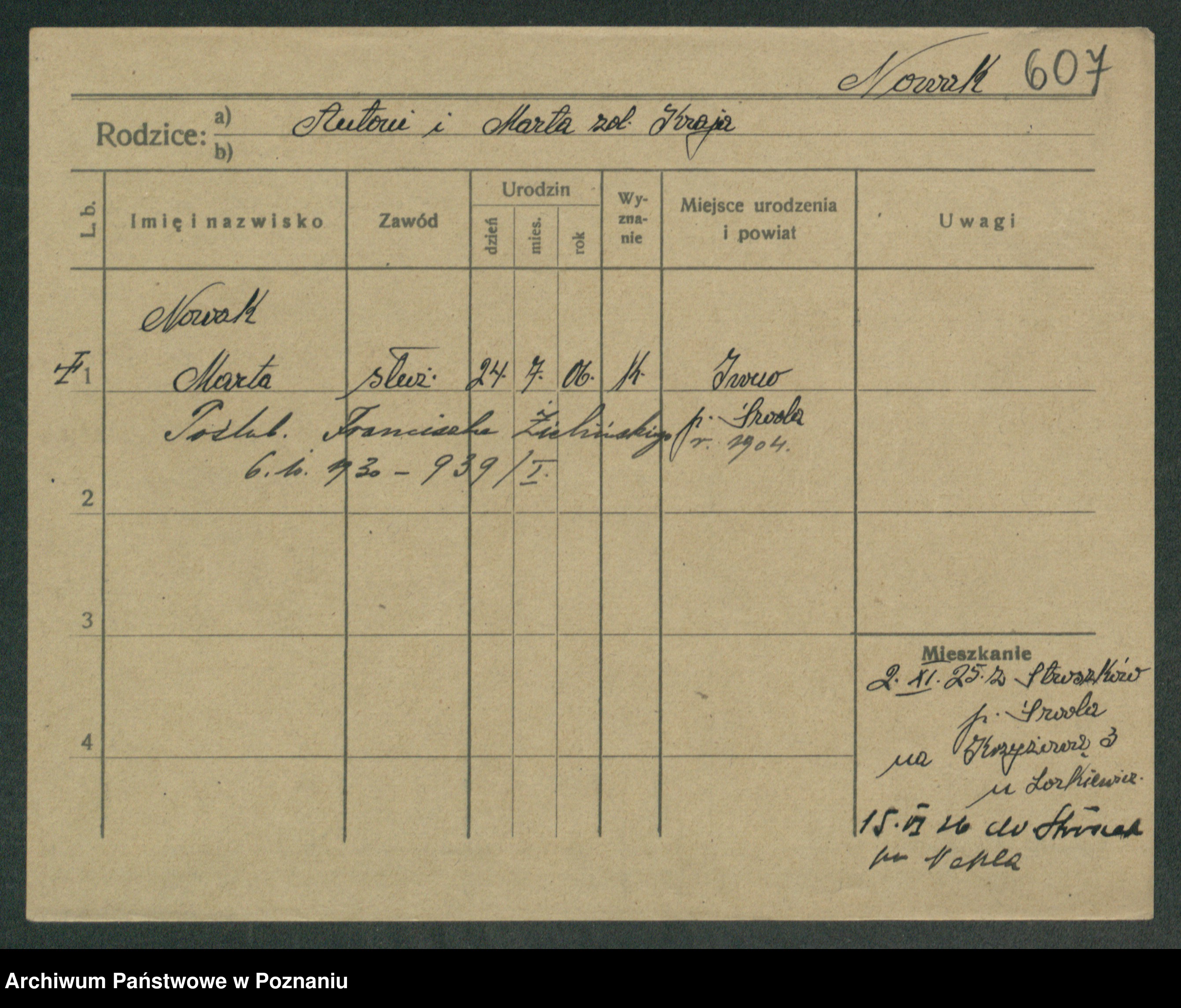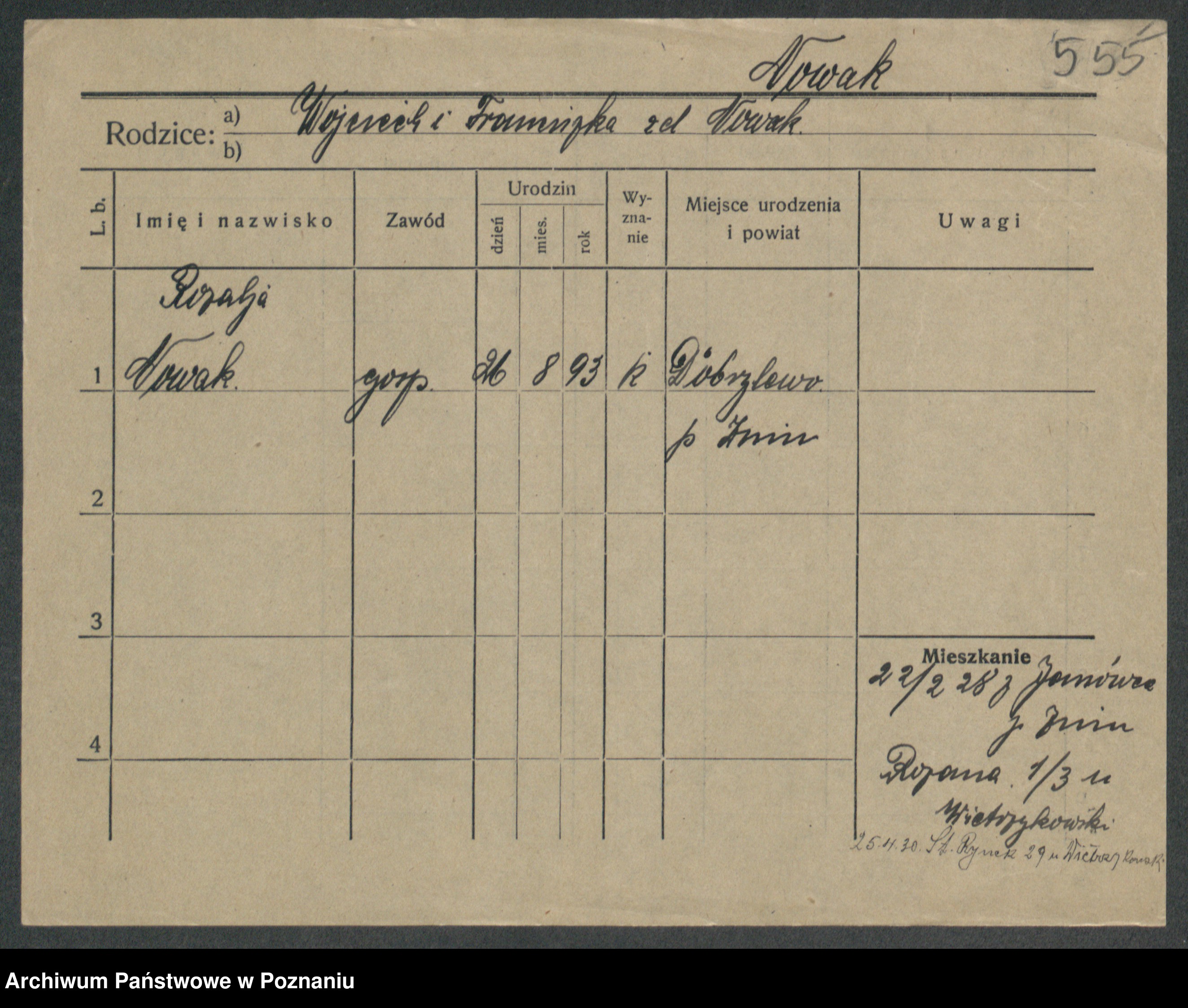 Podgląd karty osobowej dostępny jest po kliknięciu na nazwisko lub ikonkę karty. Można dokonywać powiększenia (ikony na górze) lub przechodzić między kolejnymi skanami (strzałki po bokach).