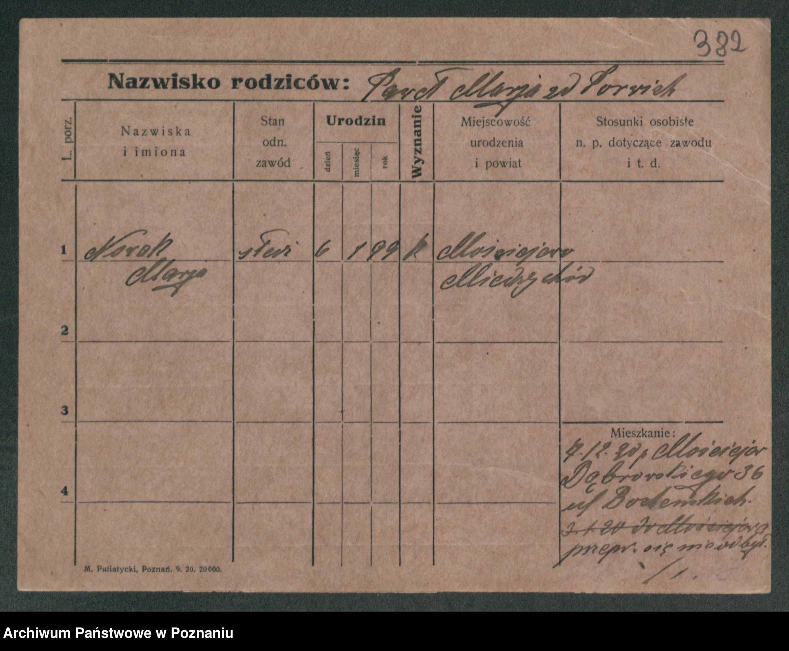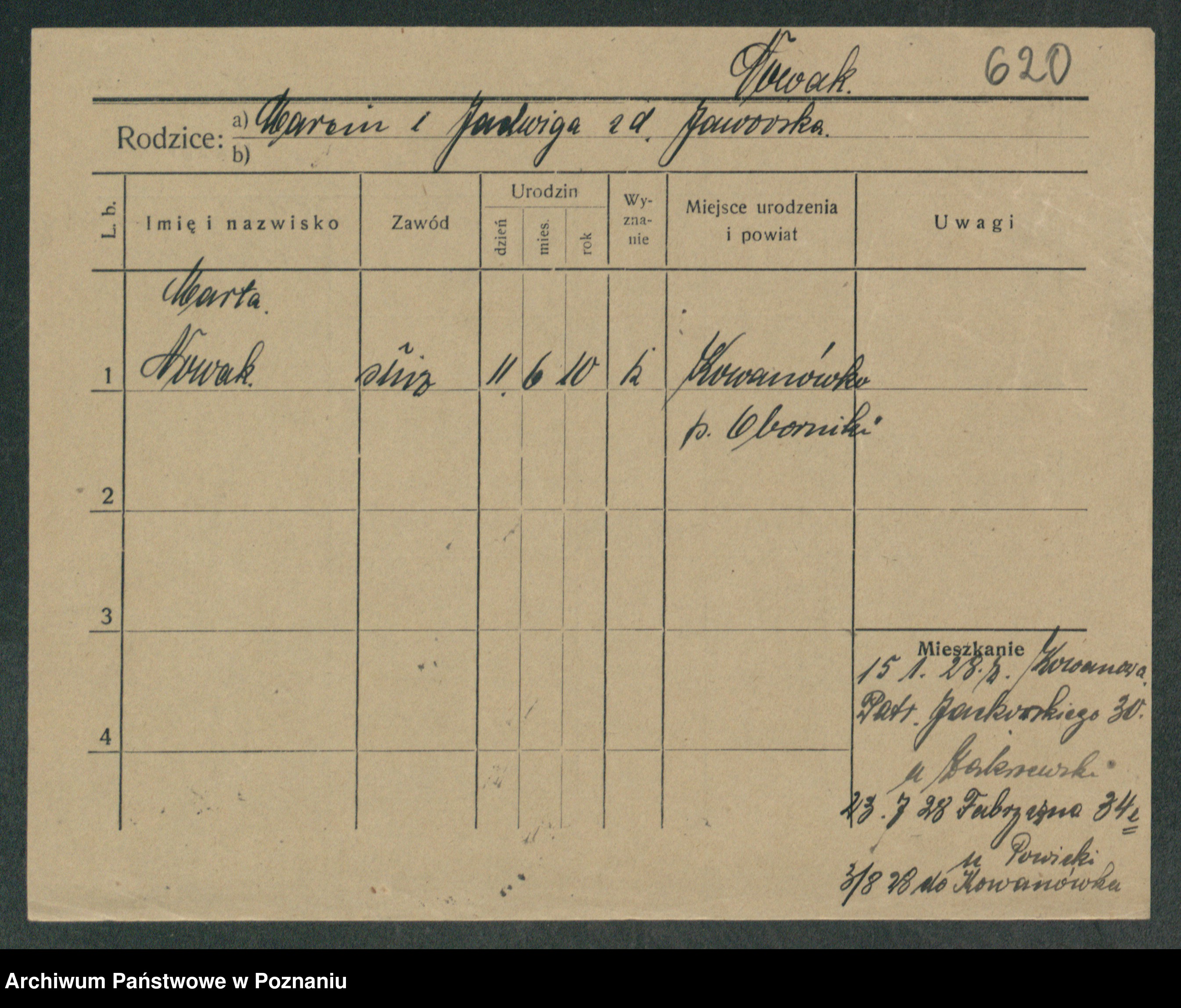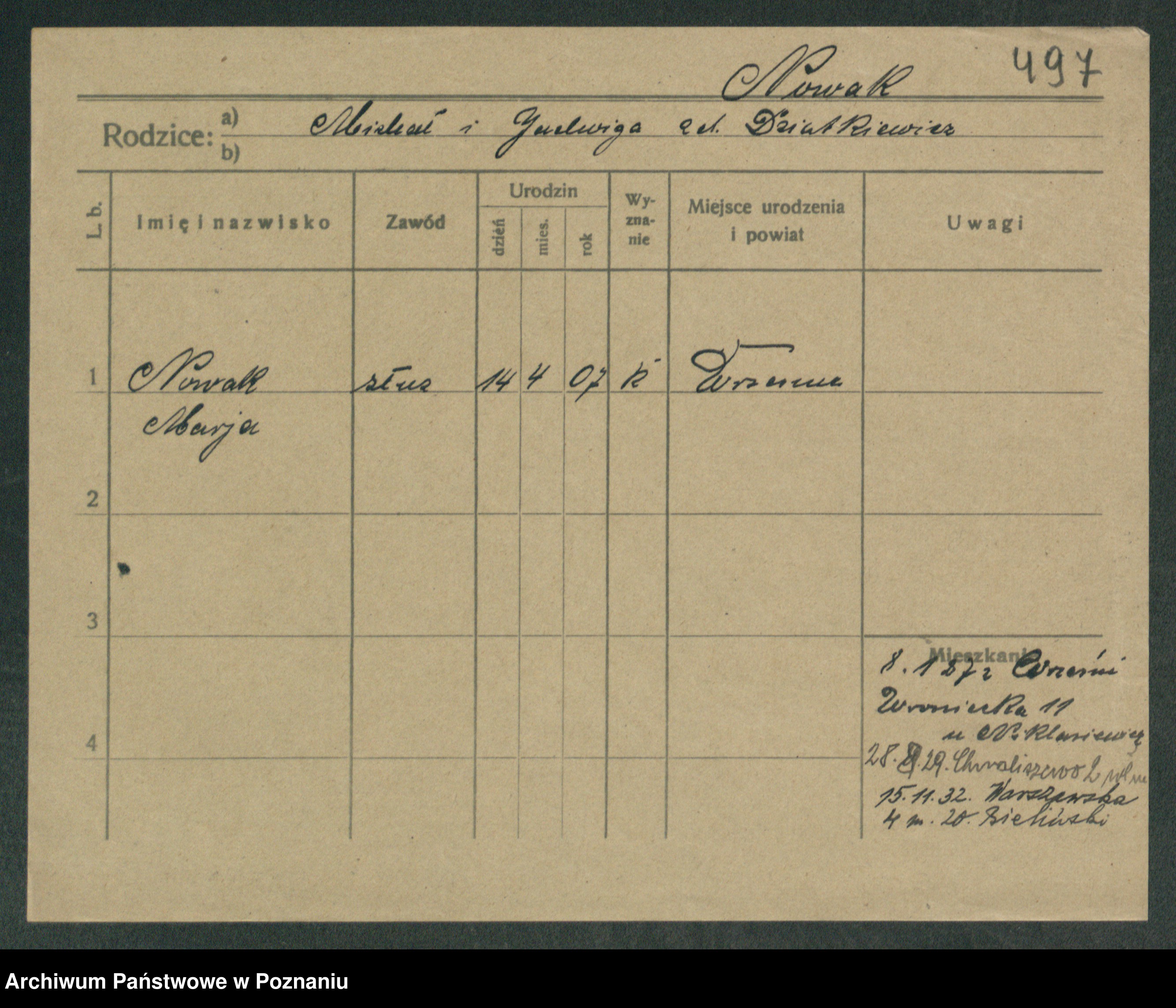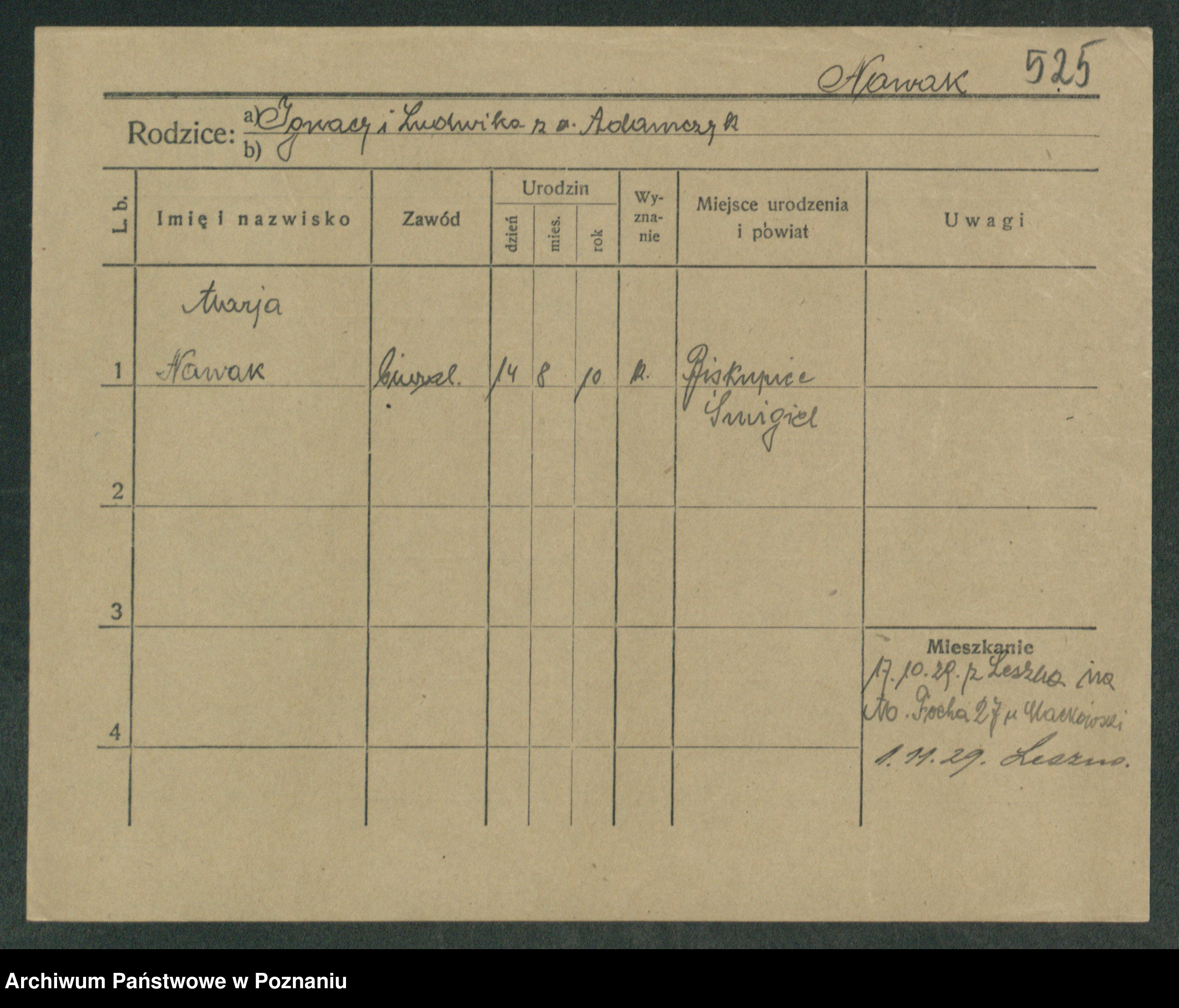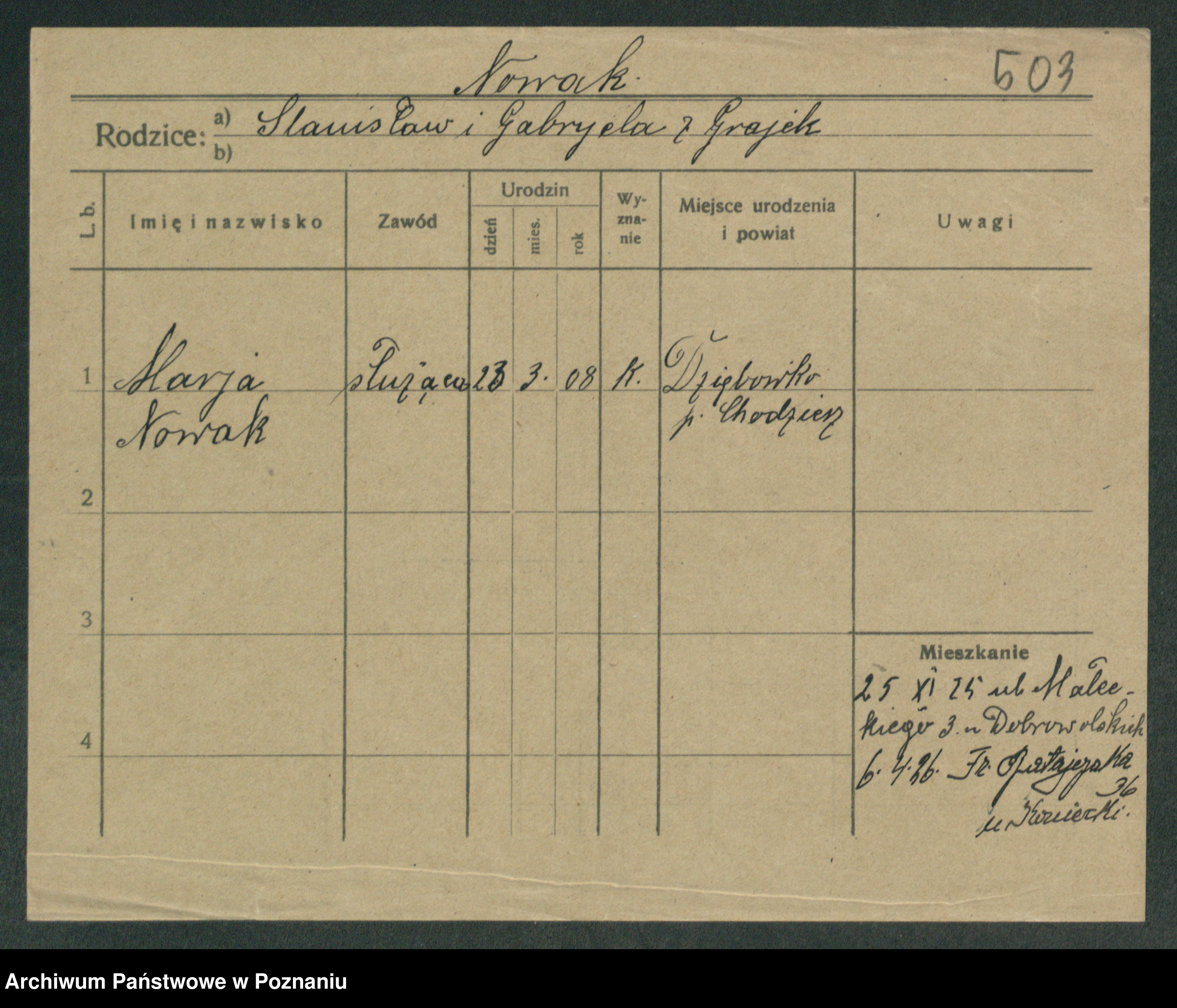 Podgląd karty osobowej dostępny jest po kliknięciu na nazwisko lub ikonkę karty. Można dokonywać powiększenia (ikony na górze) lub przechodzić między kolejnymi skanami (strzałki po bokach).