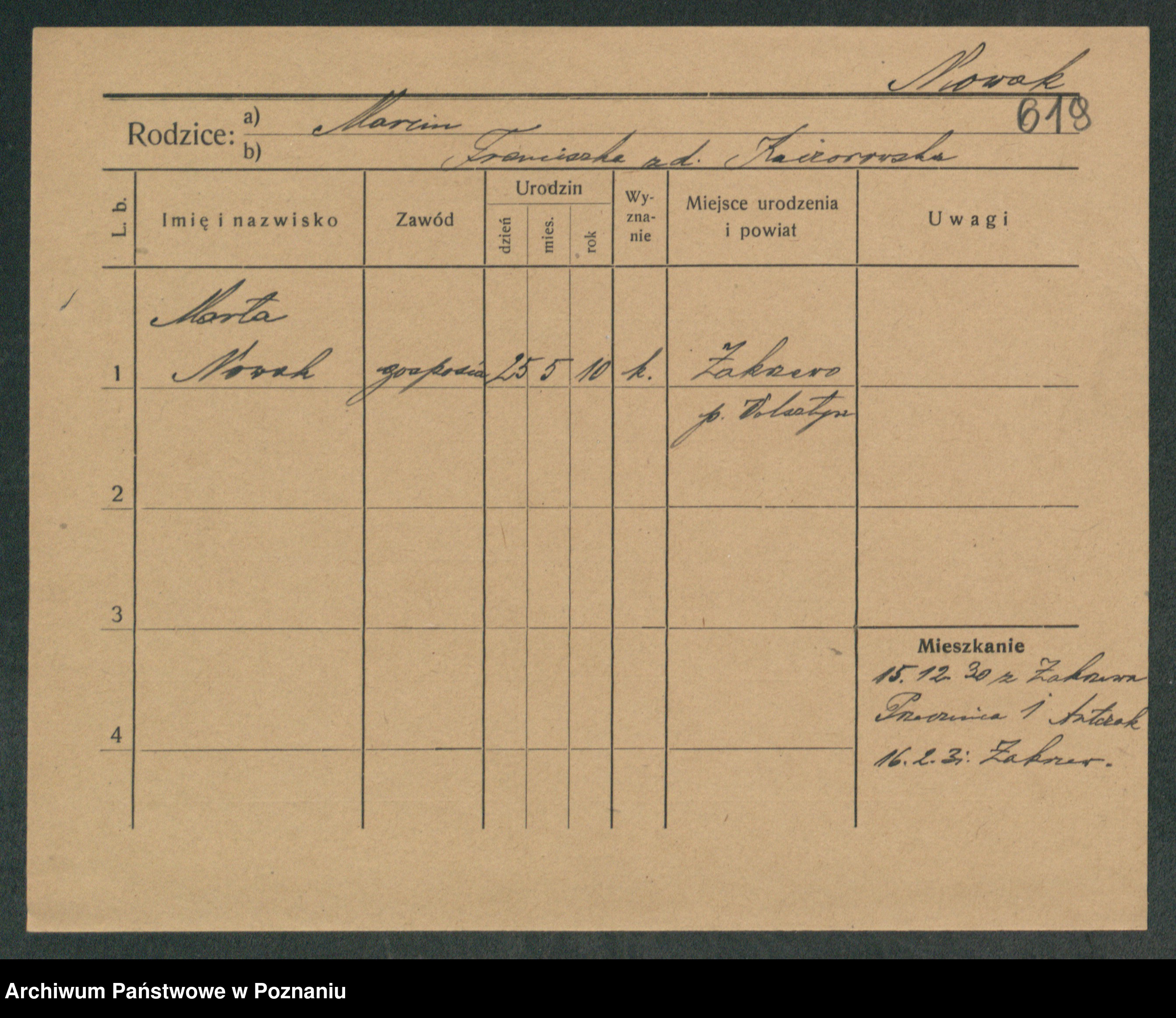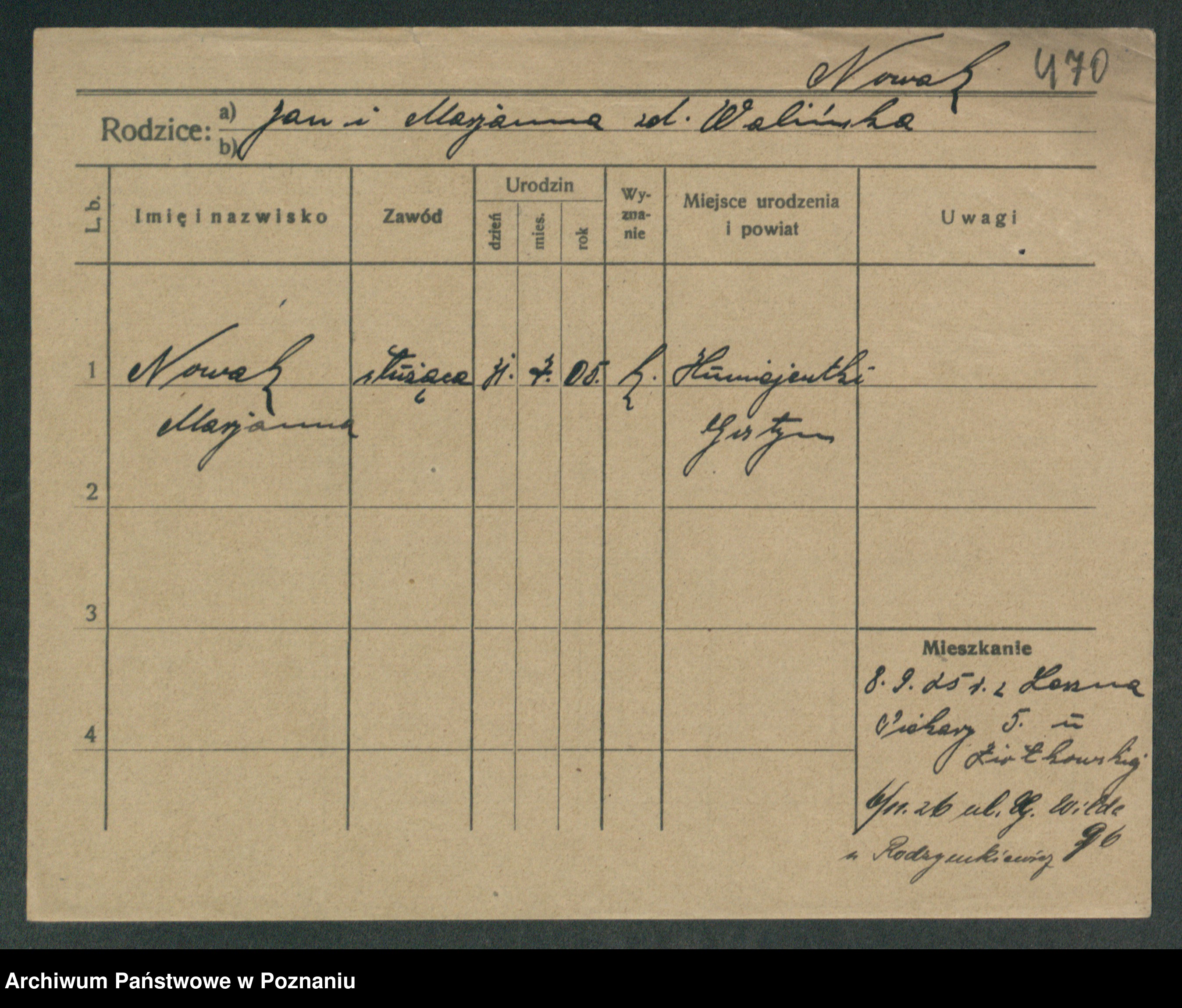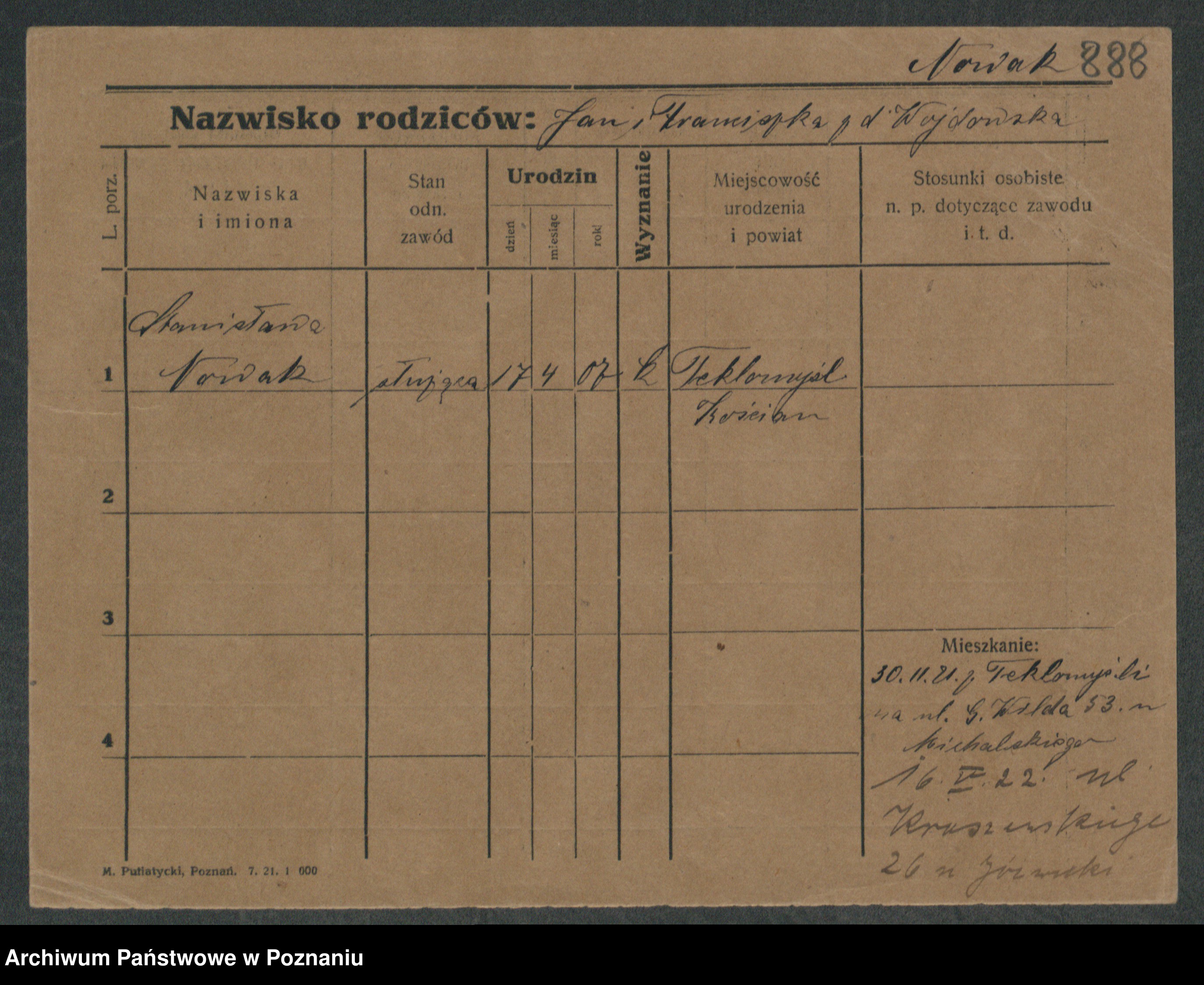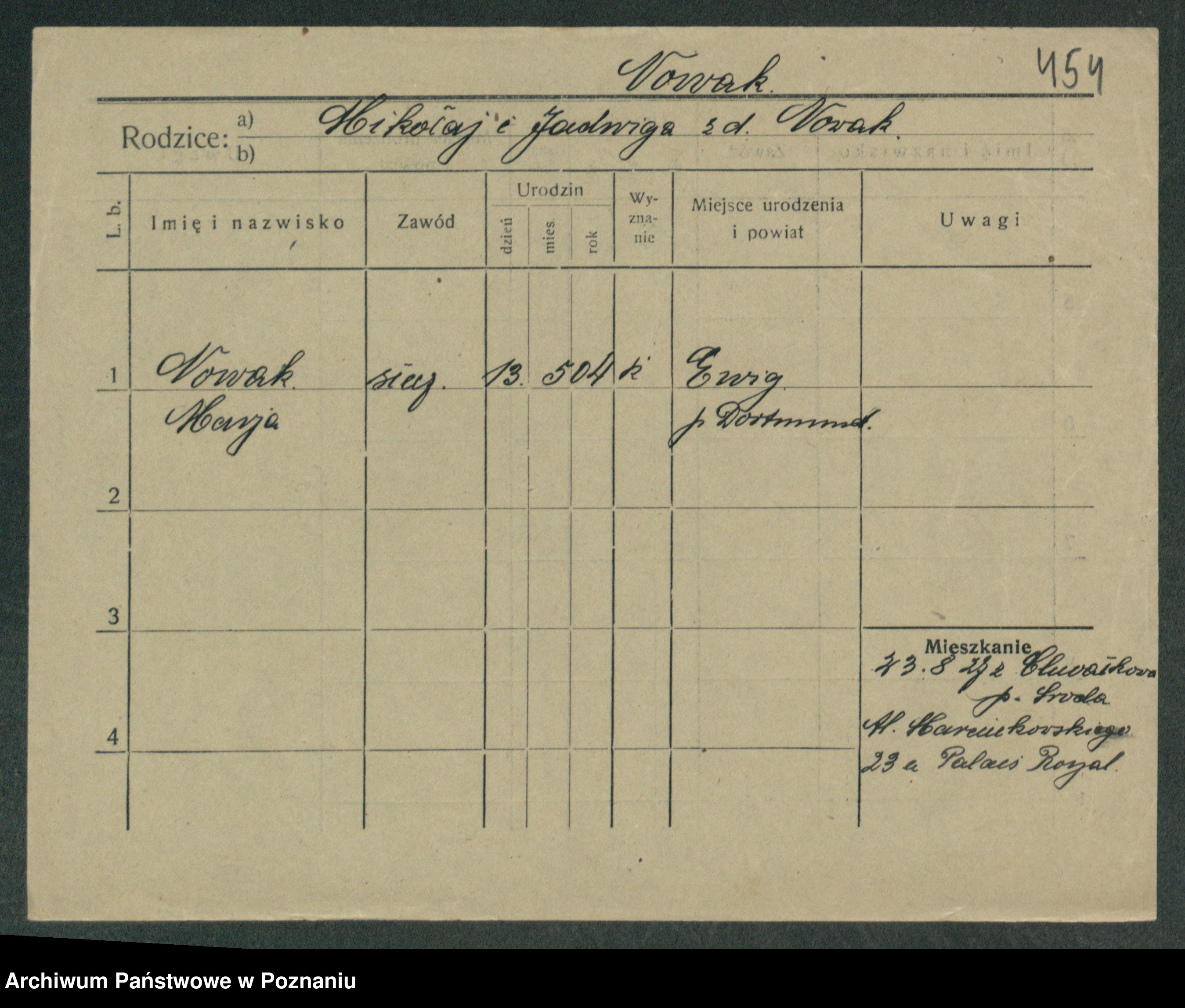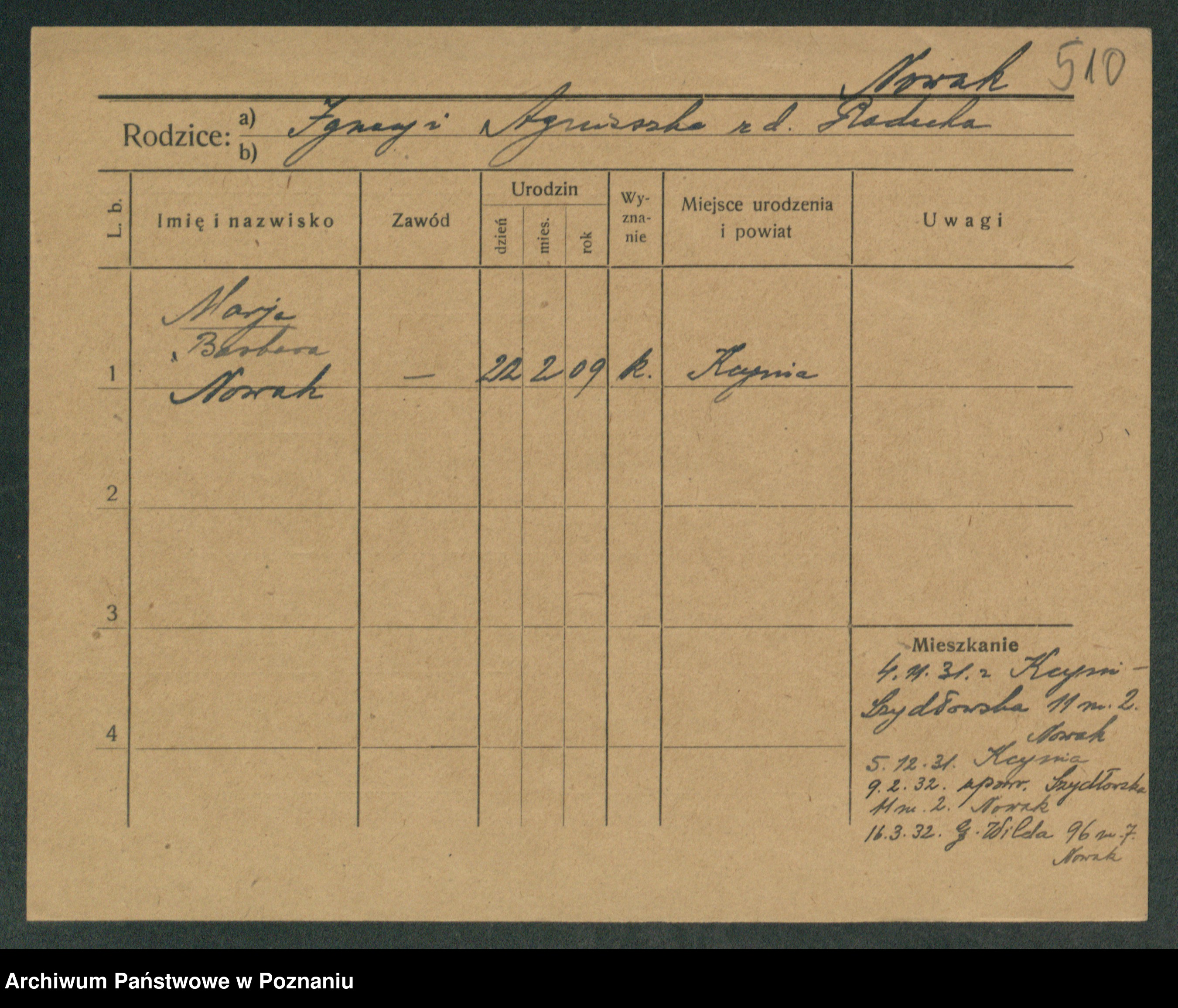 Podgląd karty osobowej dostępny jest po kliknięciu na nazwisko lub ikonkę karty. Można dokonywać powiększenia (ikony na górze) lub przechodzić między kolejnymi skanami (strzałki po bokach).