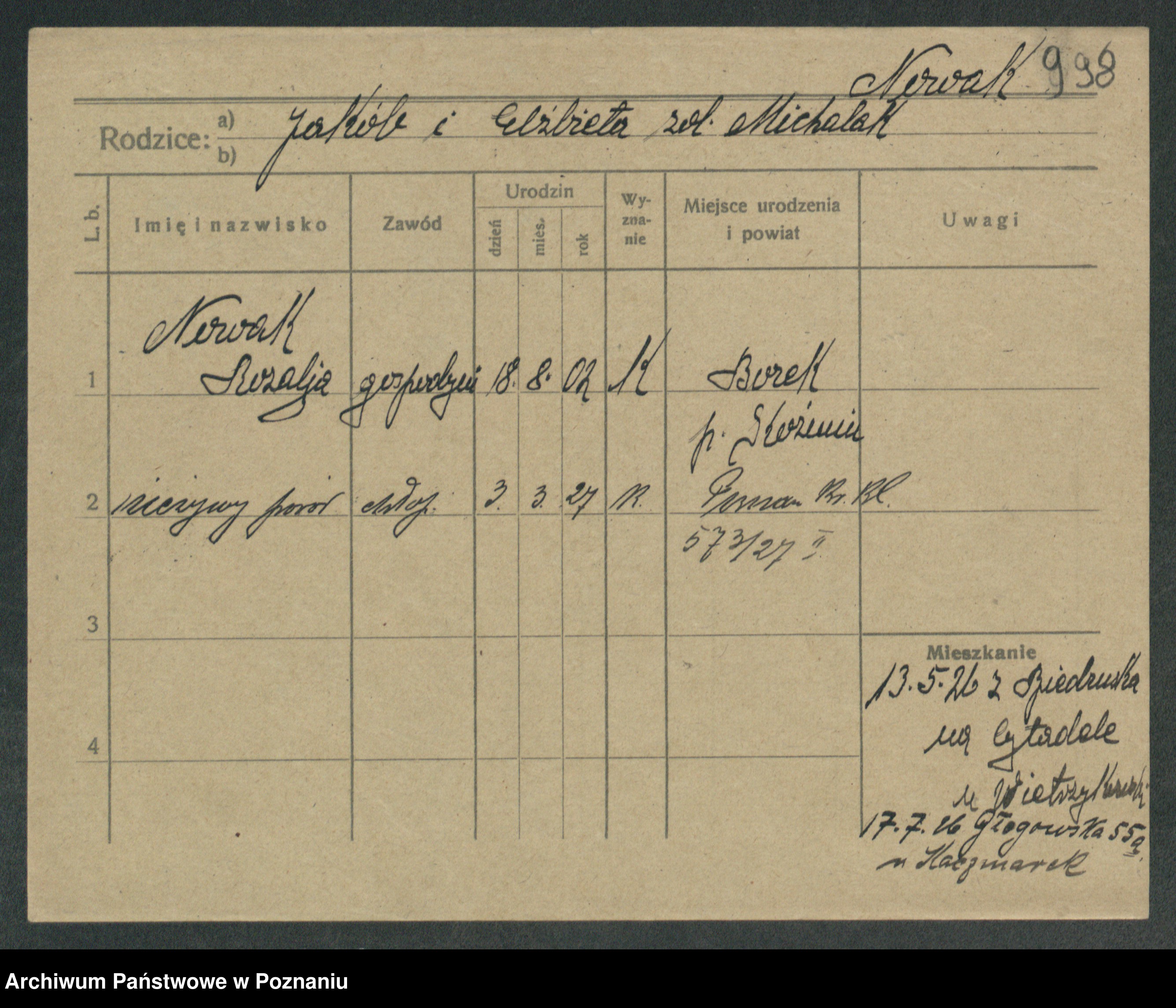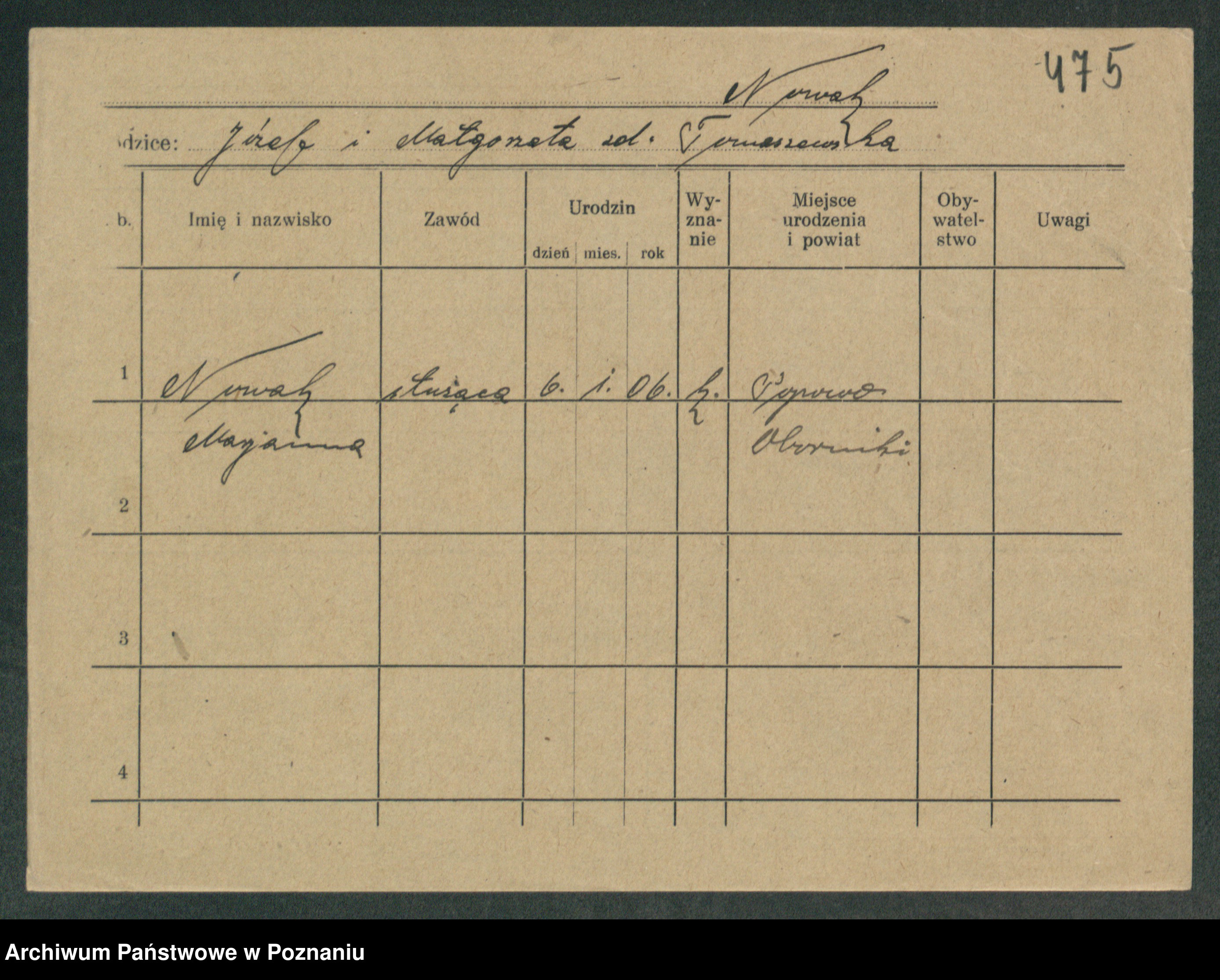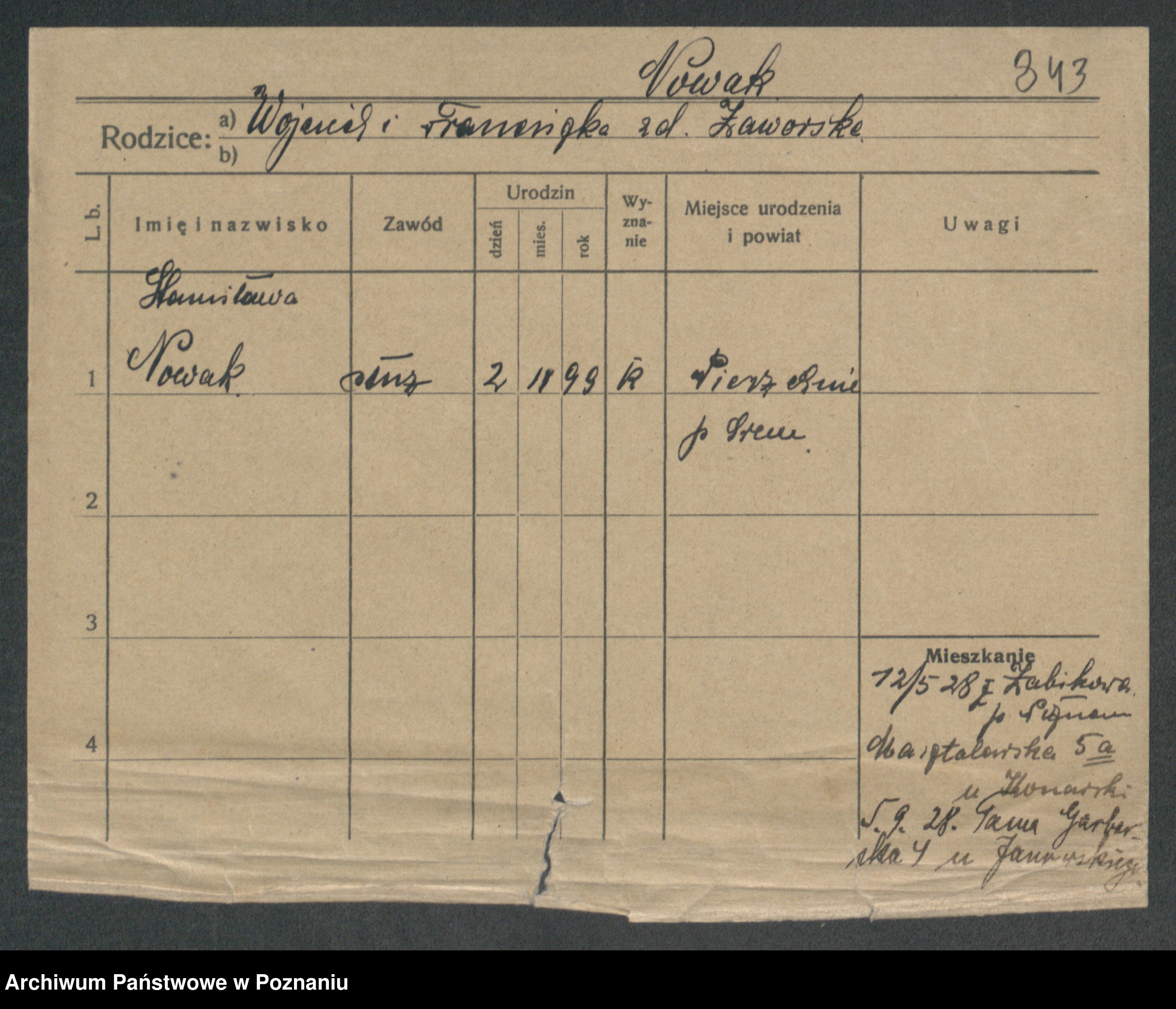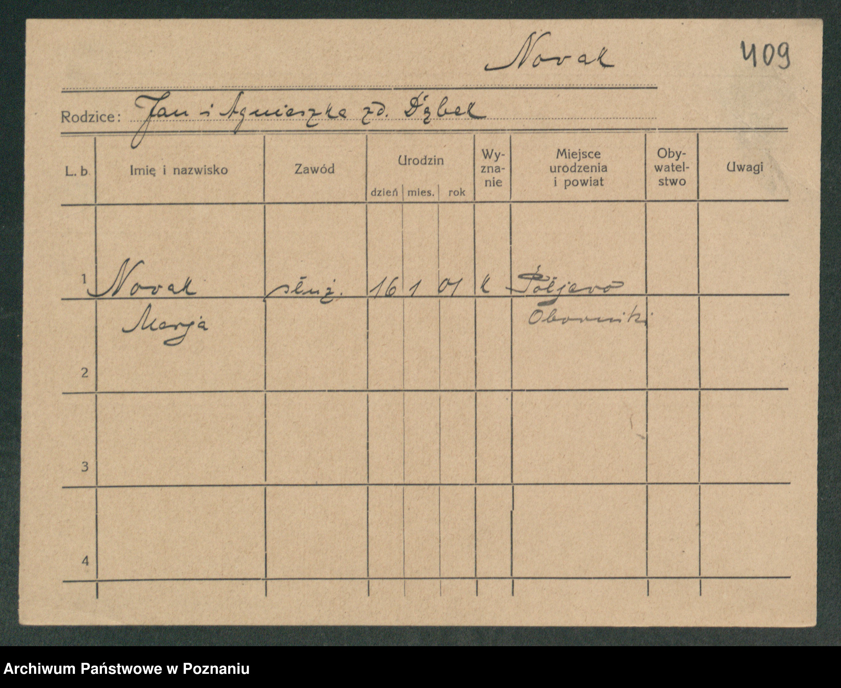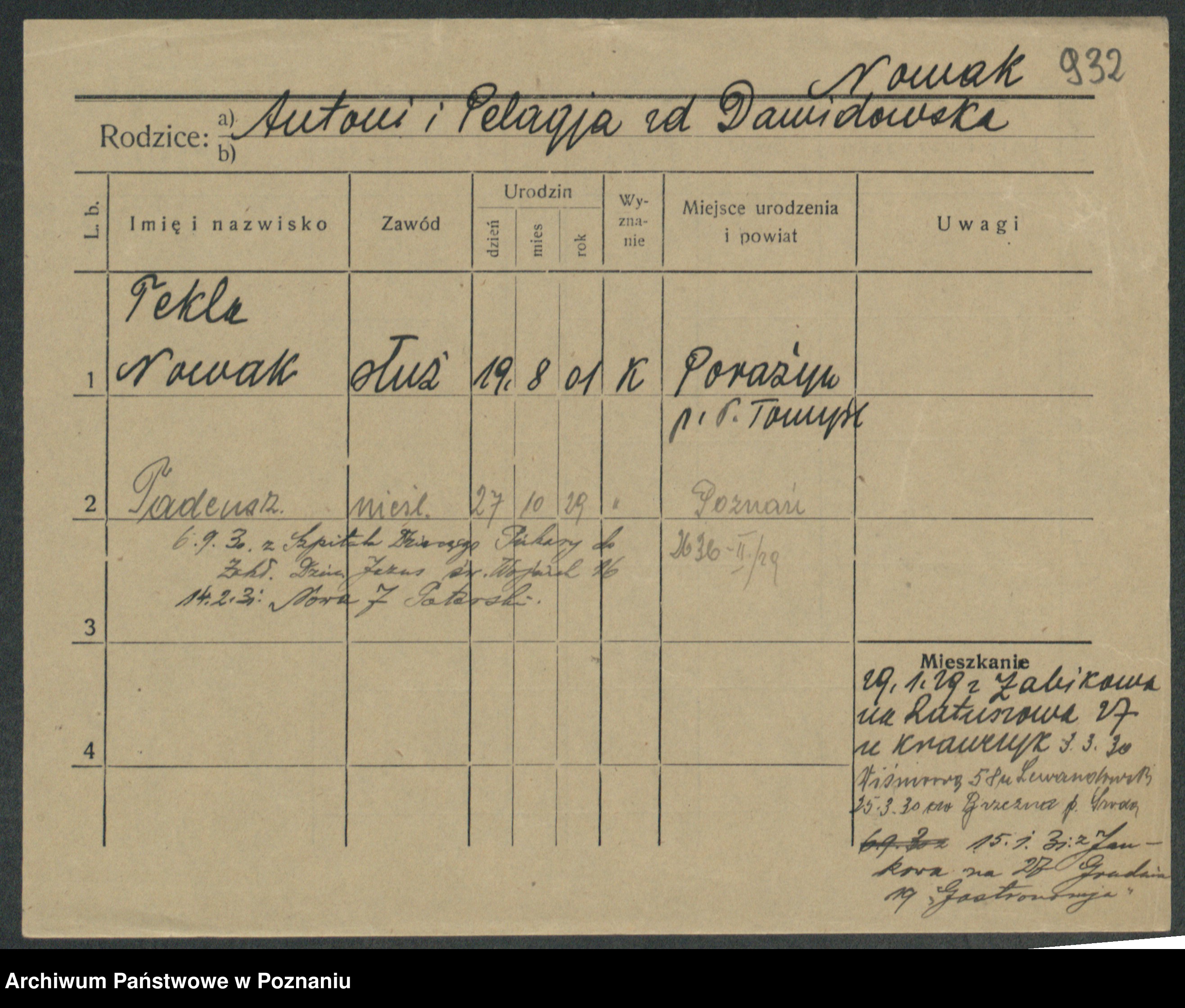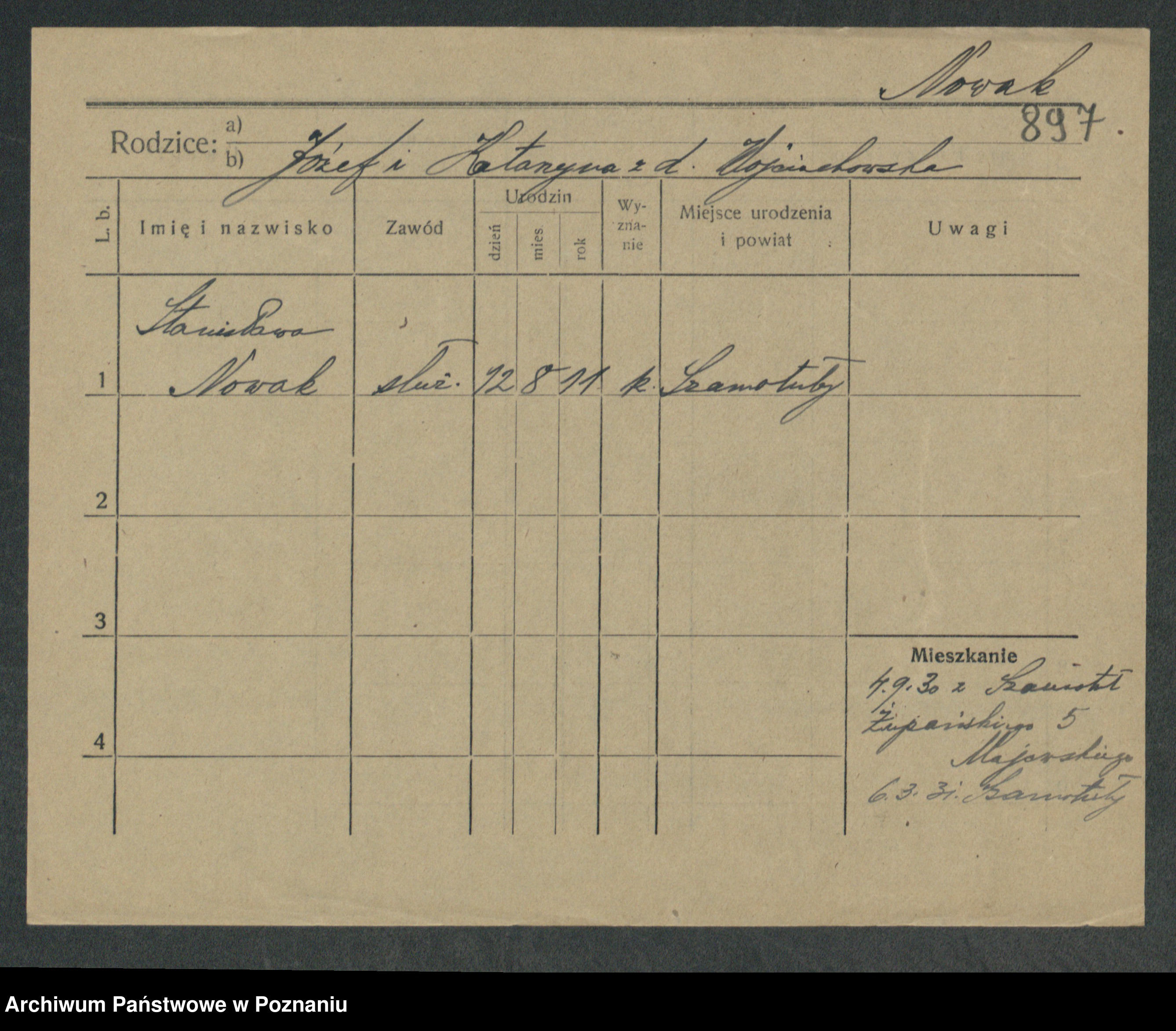 Podgląd karty osobowej dostępny jest po kliknięciu na nazwisko lub ikonkę karty. Można dokonywać powiększenia (ikony na górze) lub przechodzić między kolejnymi skanami (strzałki po bokach).