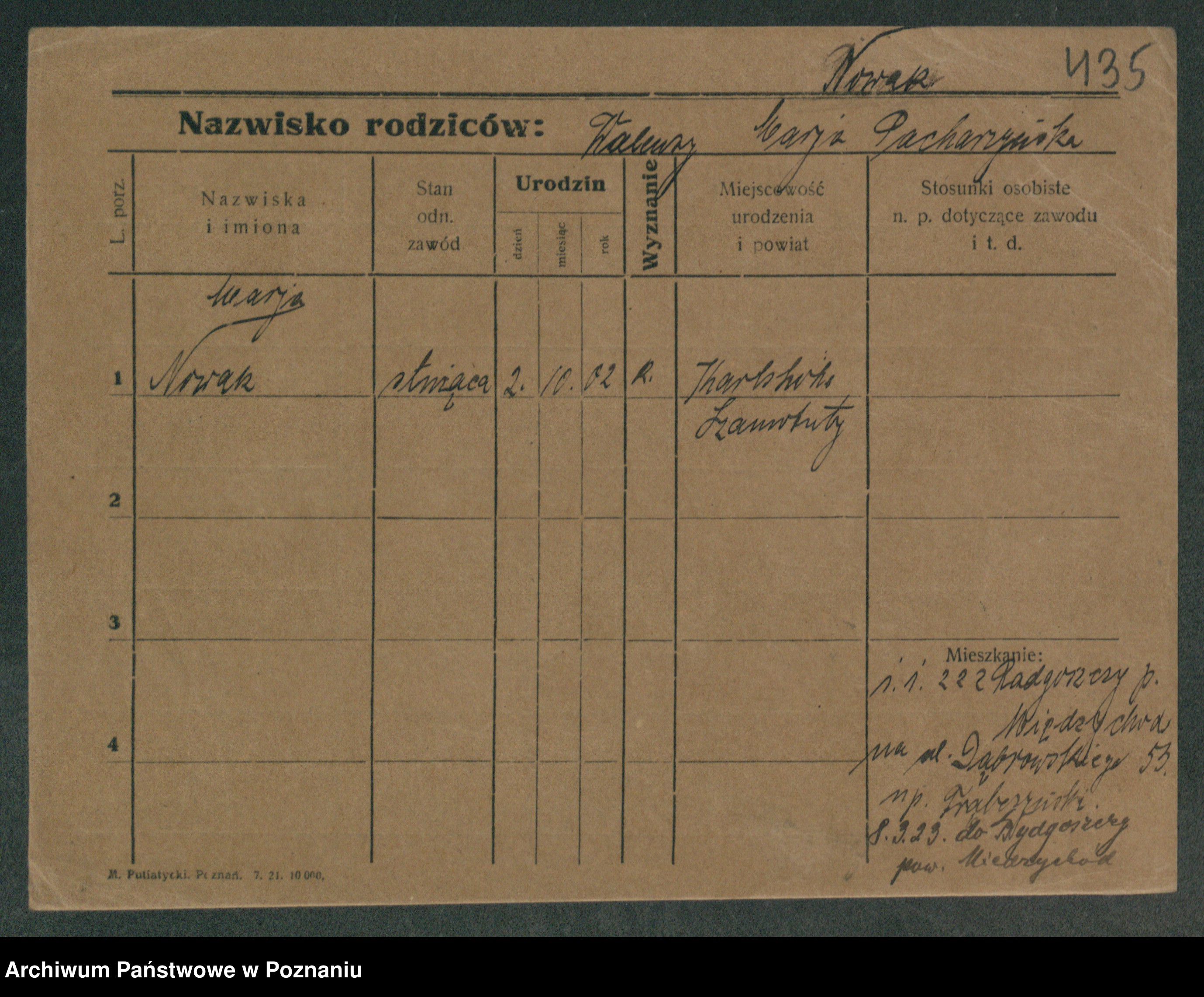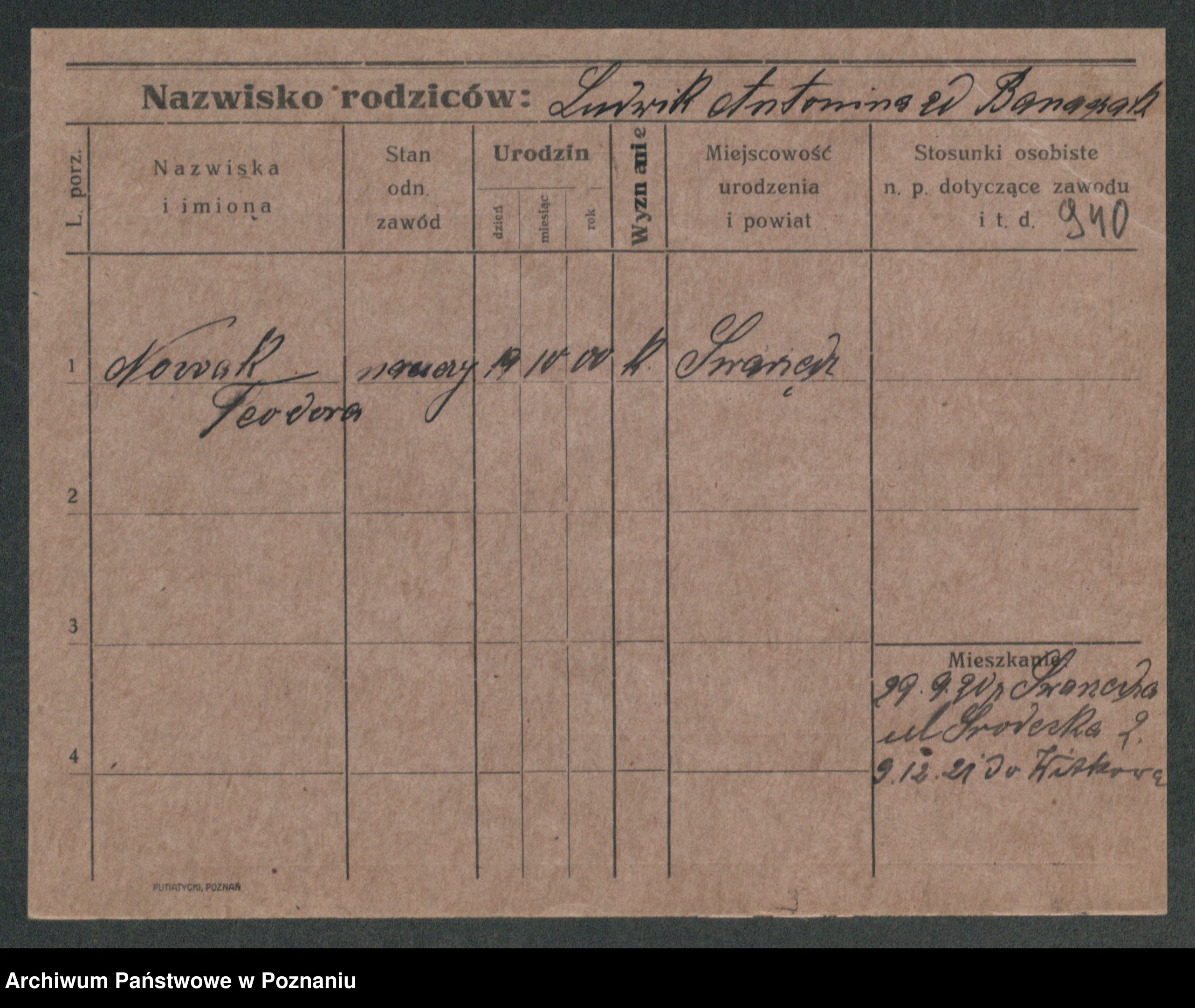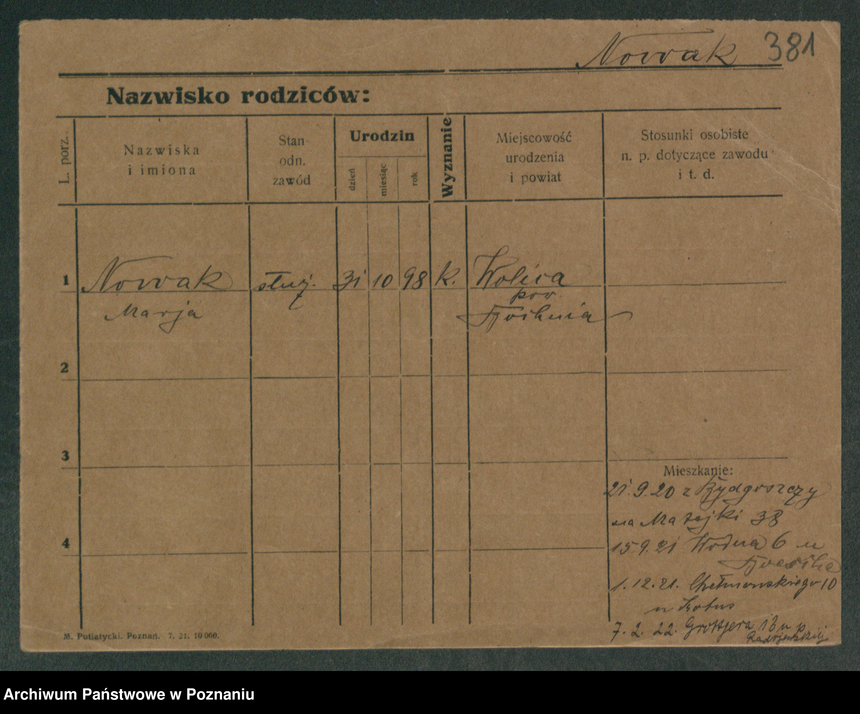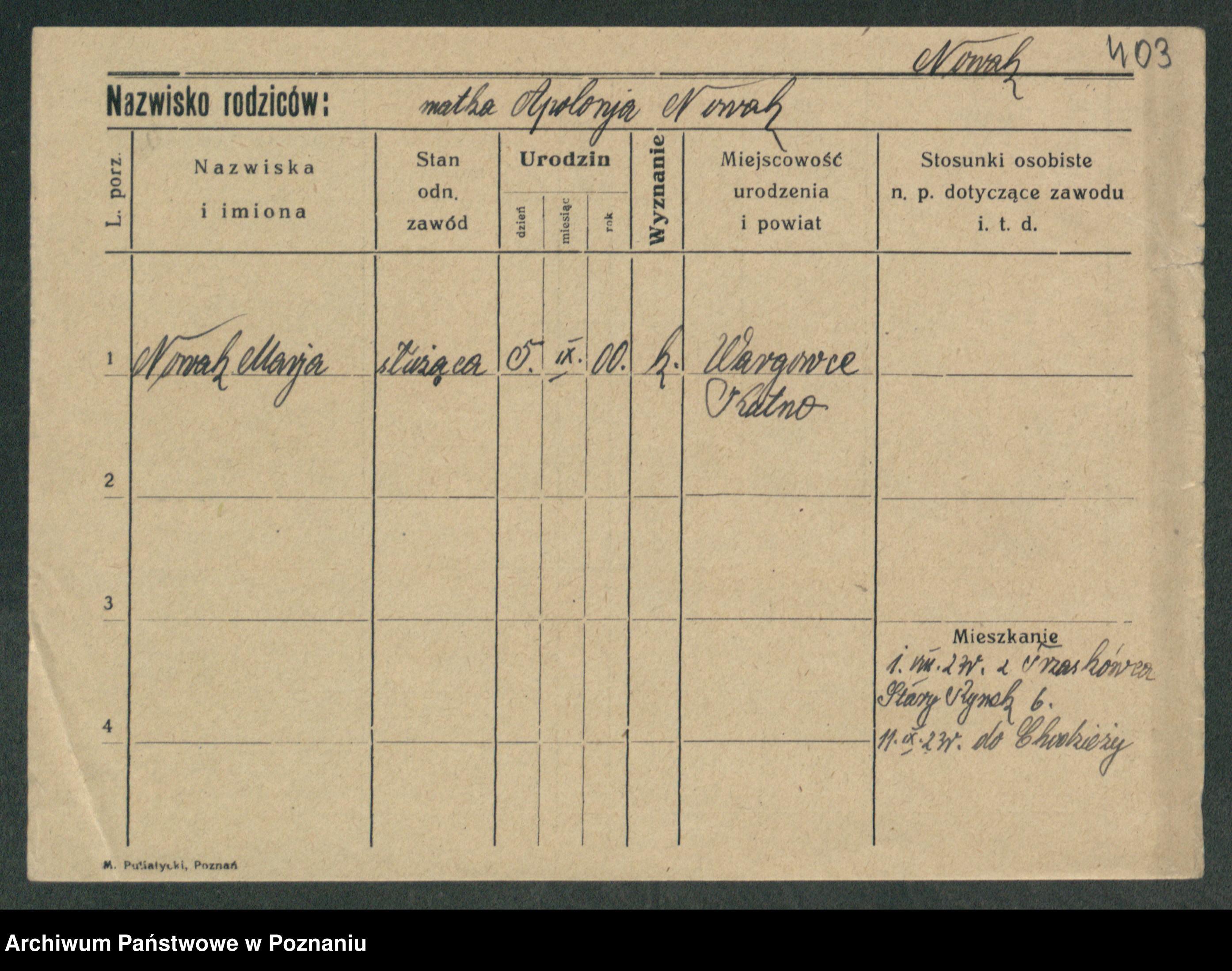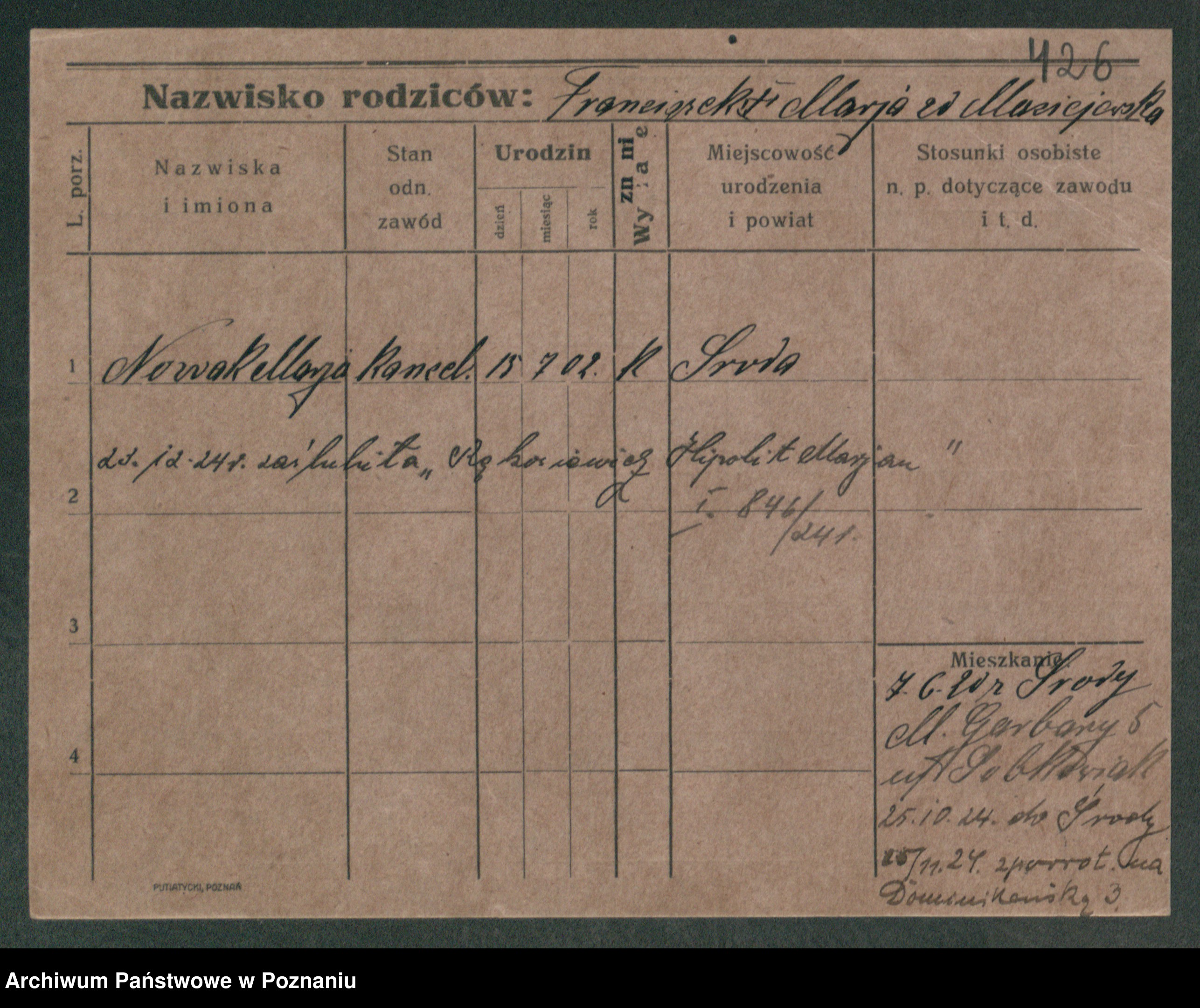 Podgląd karty osobowej dostępny jest po kliknięciu na nazwisko lub ikonkę karty. Można dokonywać powiększenia (ikony na górze) lub przechodzić między kolejnymi skanami (strzałki po bokach).