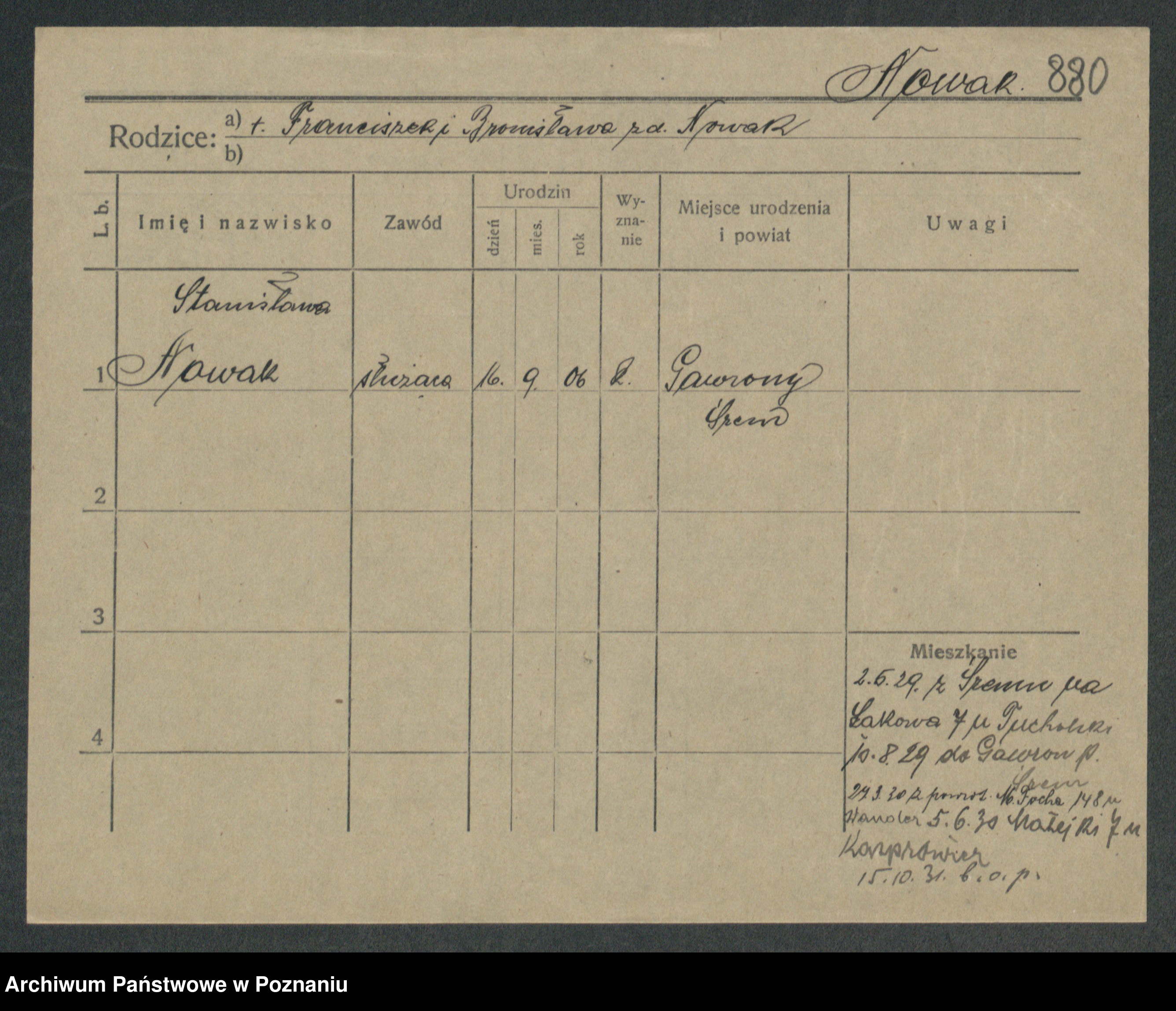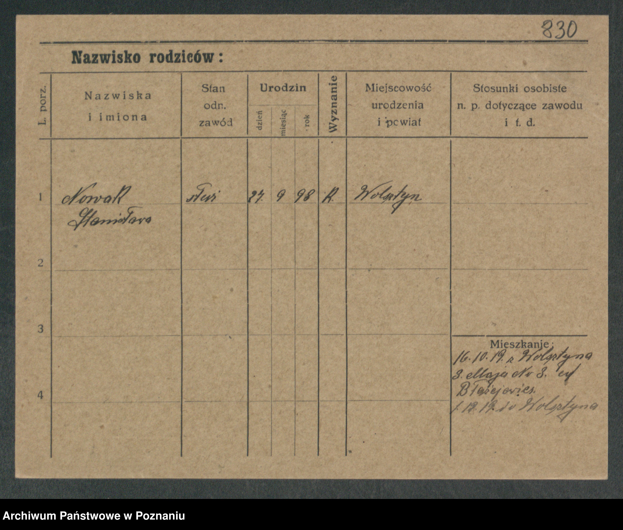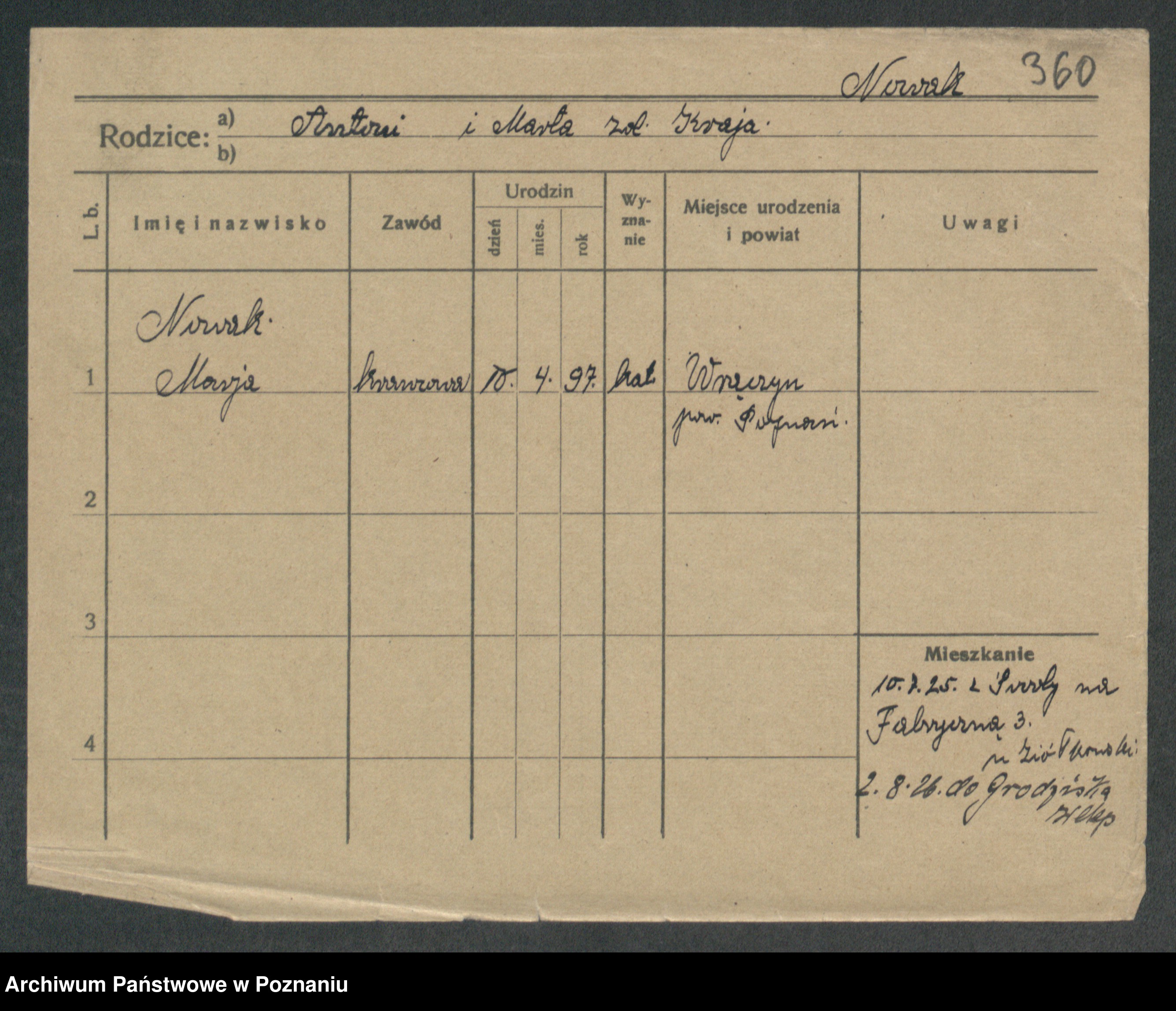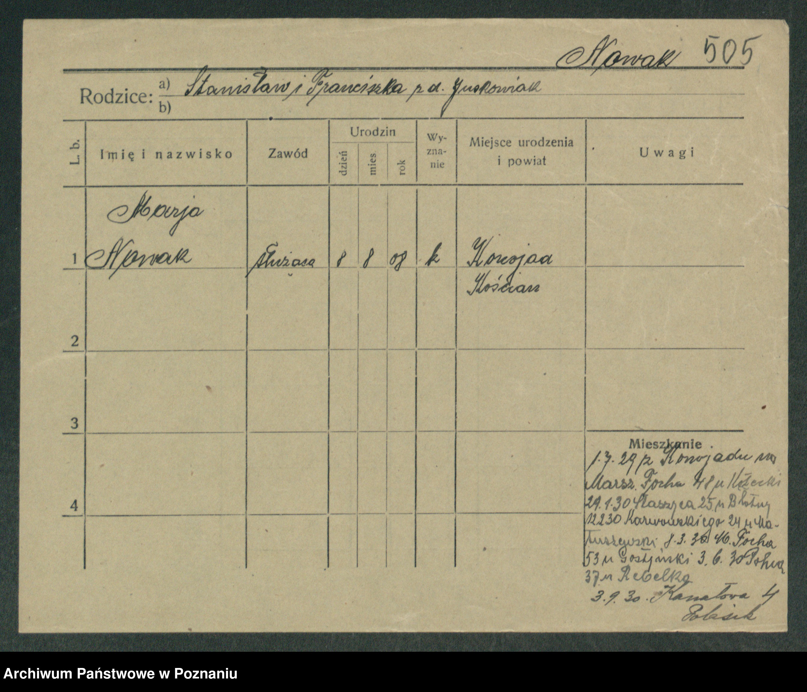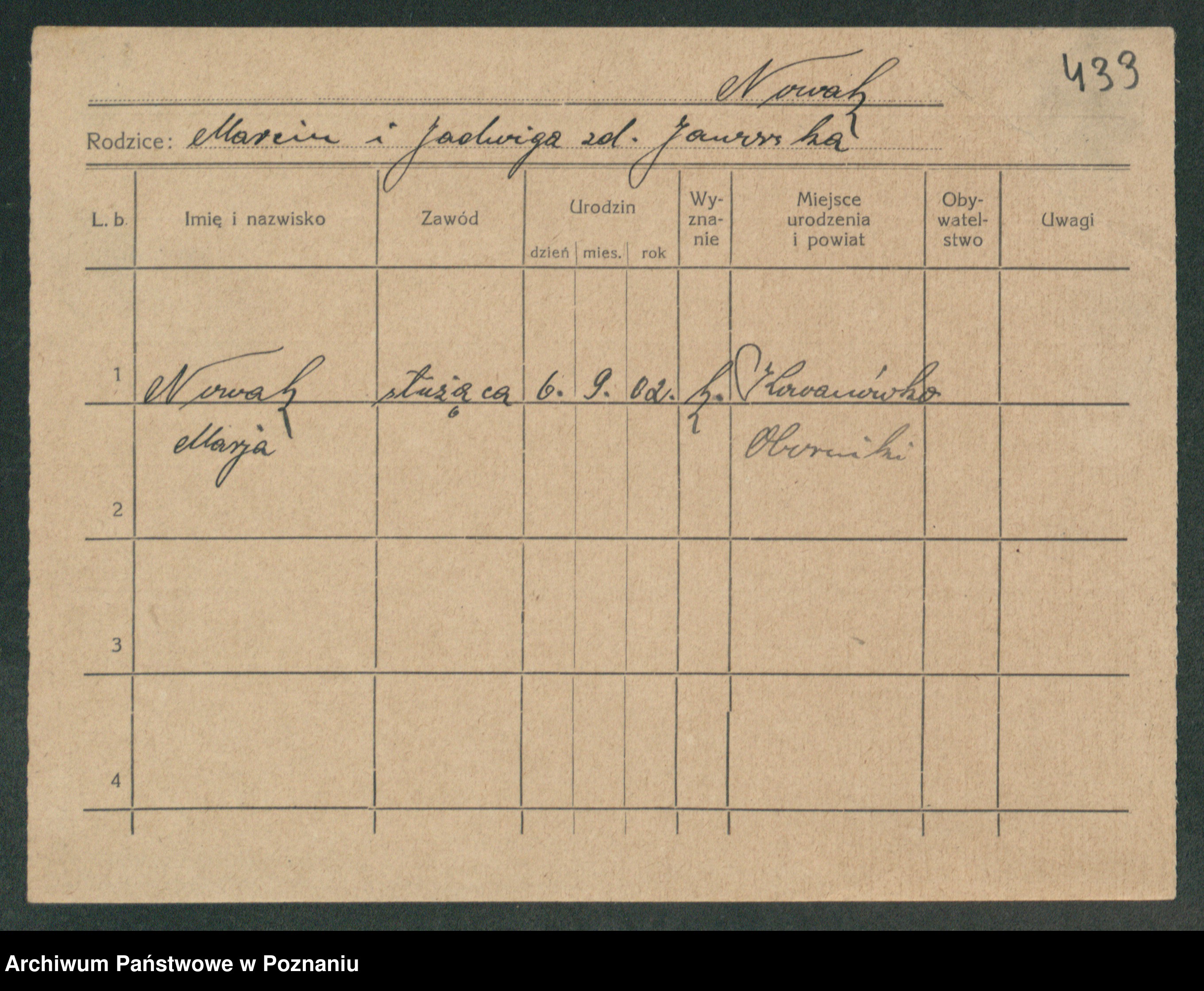 Podgląd karty osobowej dostępny jest po kliknięciu na nazwisko lub ikonkę karty. Można dokonywać powiększenia (ikony na górze) lub przechodzić między kolejnymi skanami (strzałki po bokach).