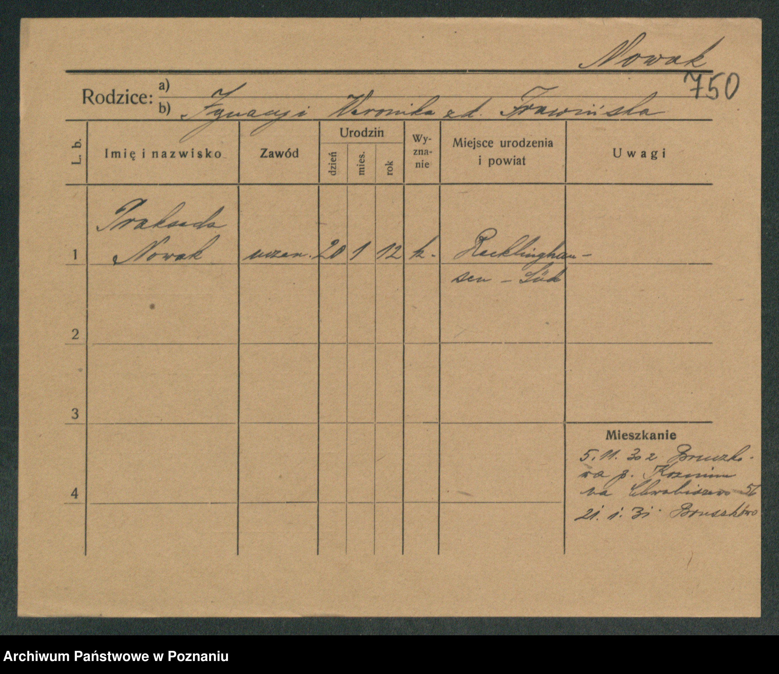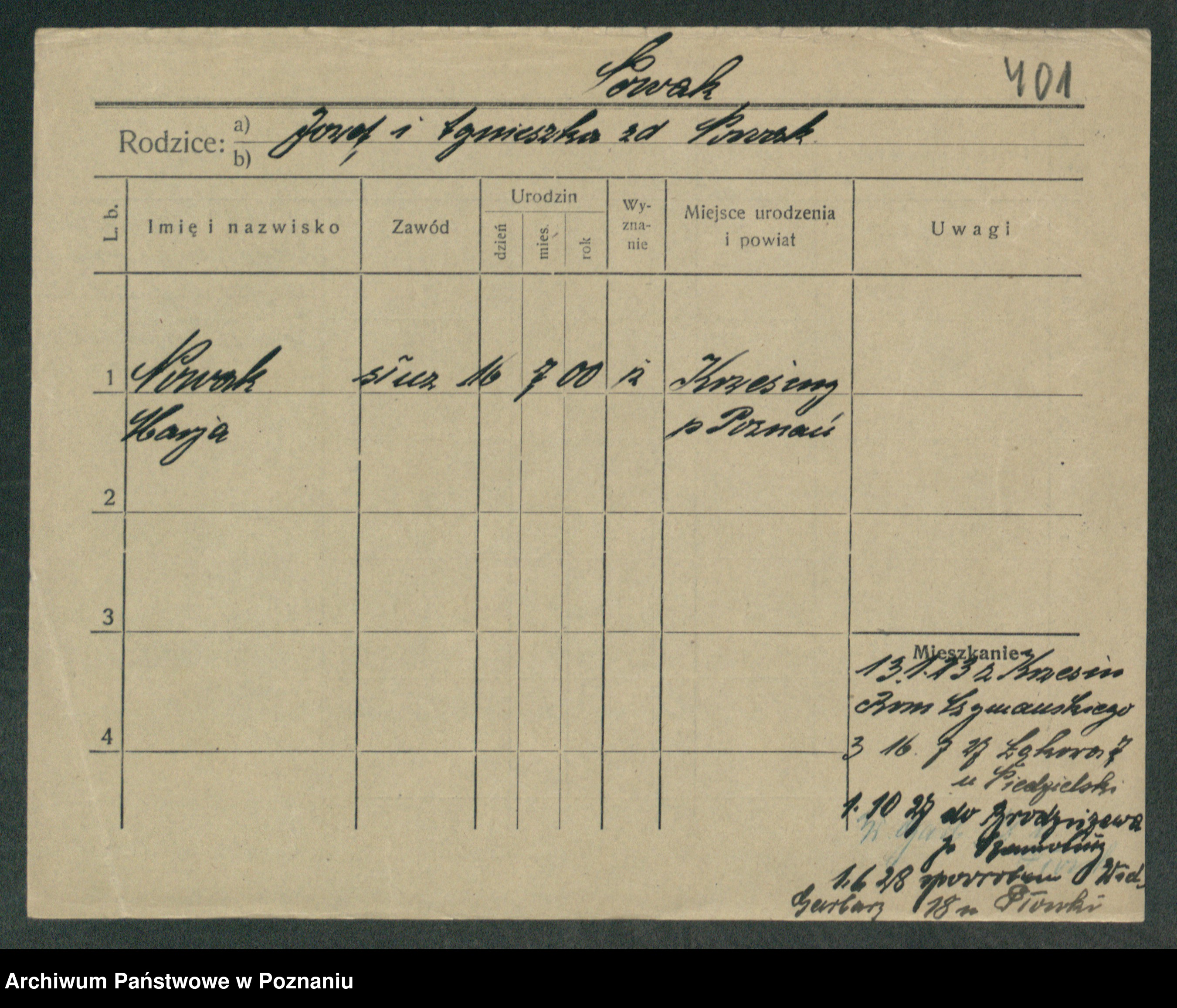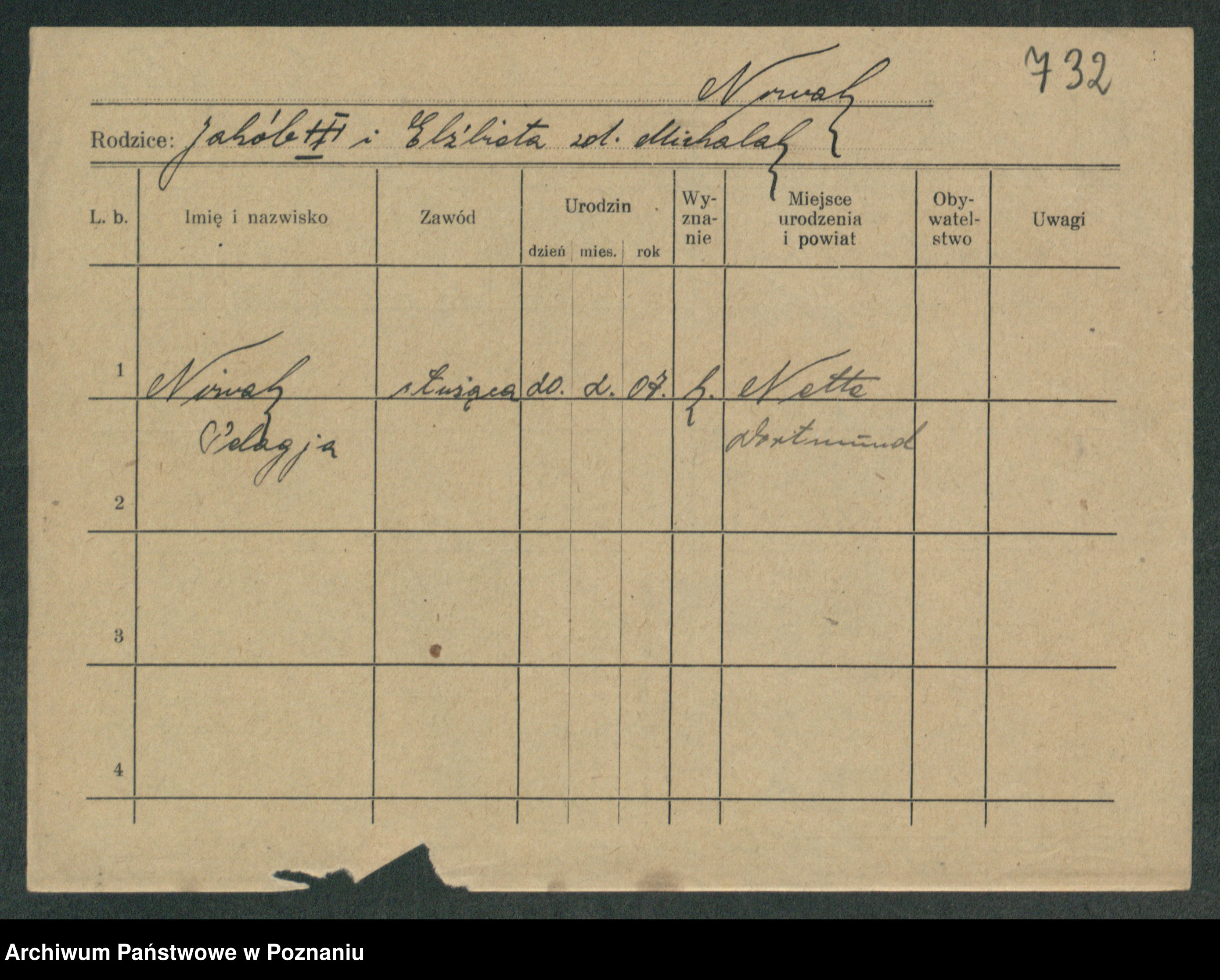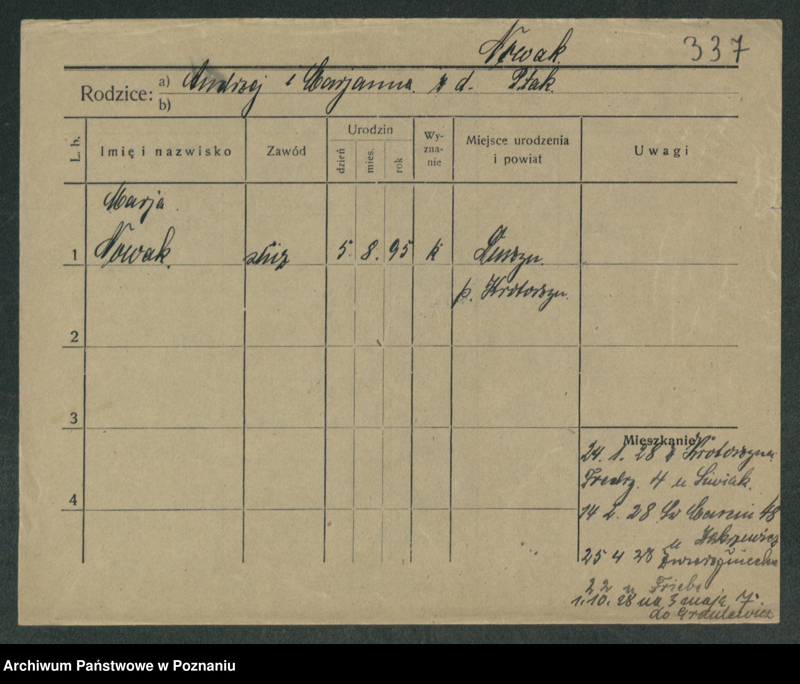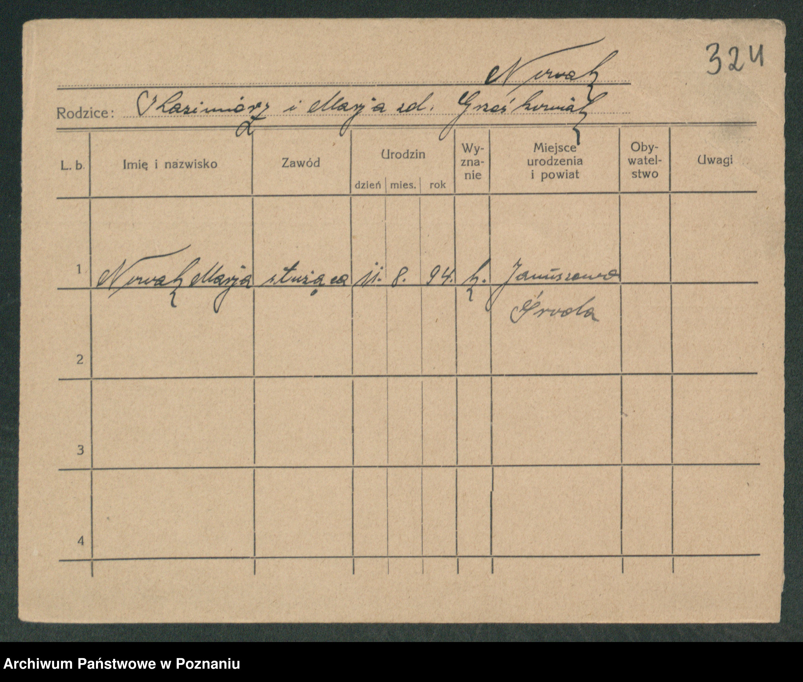 Podgląd karty osobowej dostępny jest po kliknięciu na nazwisko lub ikonkę karty. Można dokonywać powiększenia (ikony na górze) lub przechodzić między kolejnymi skanami (strzałki po bokach).