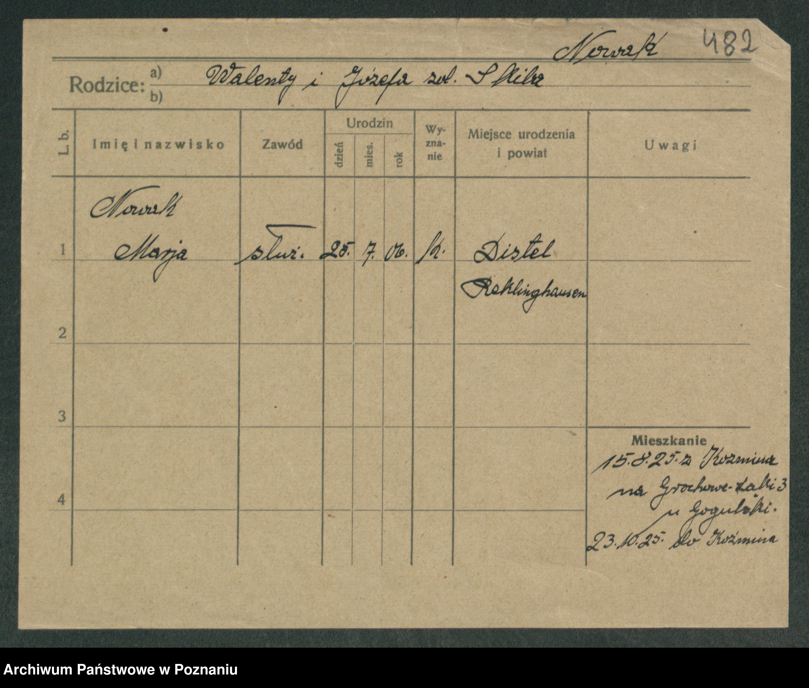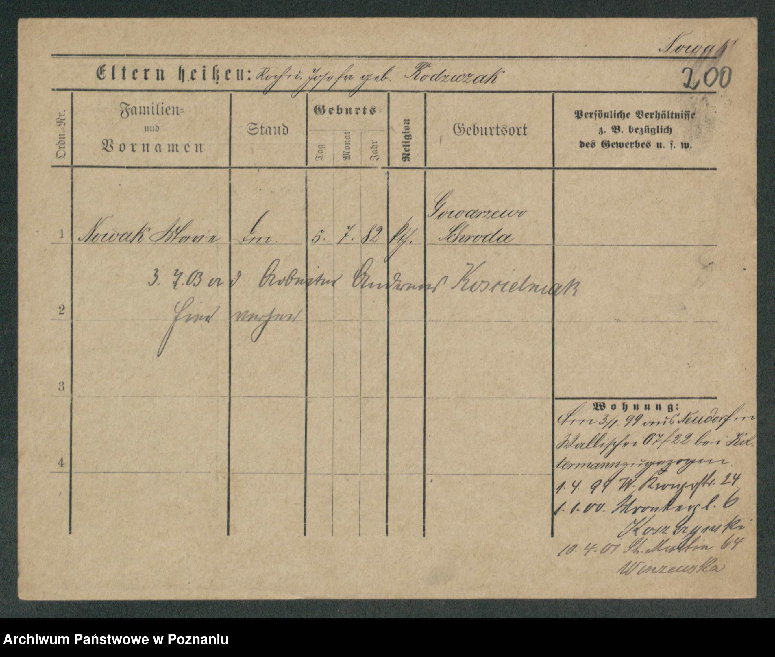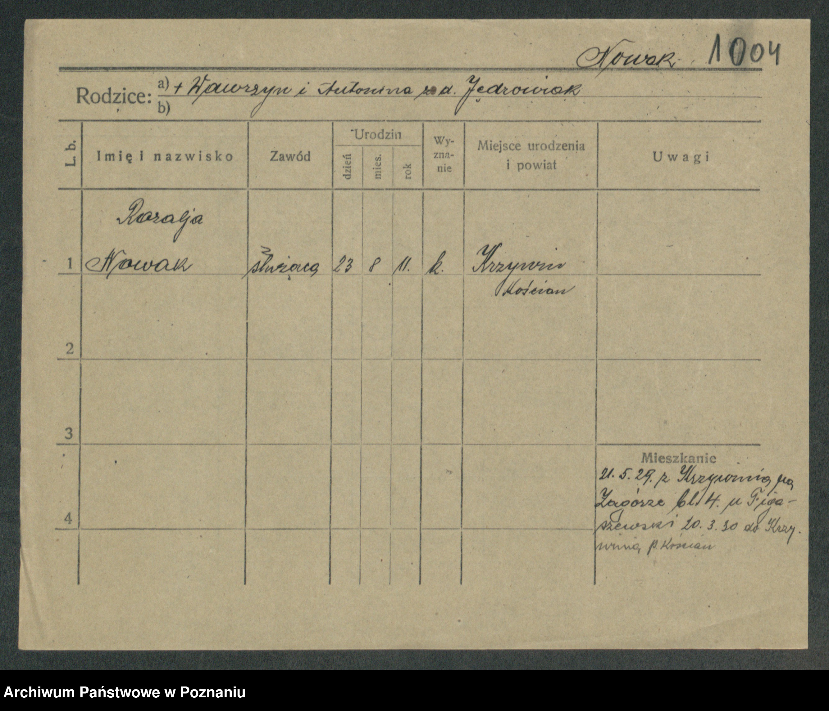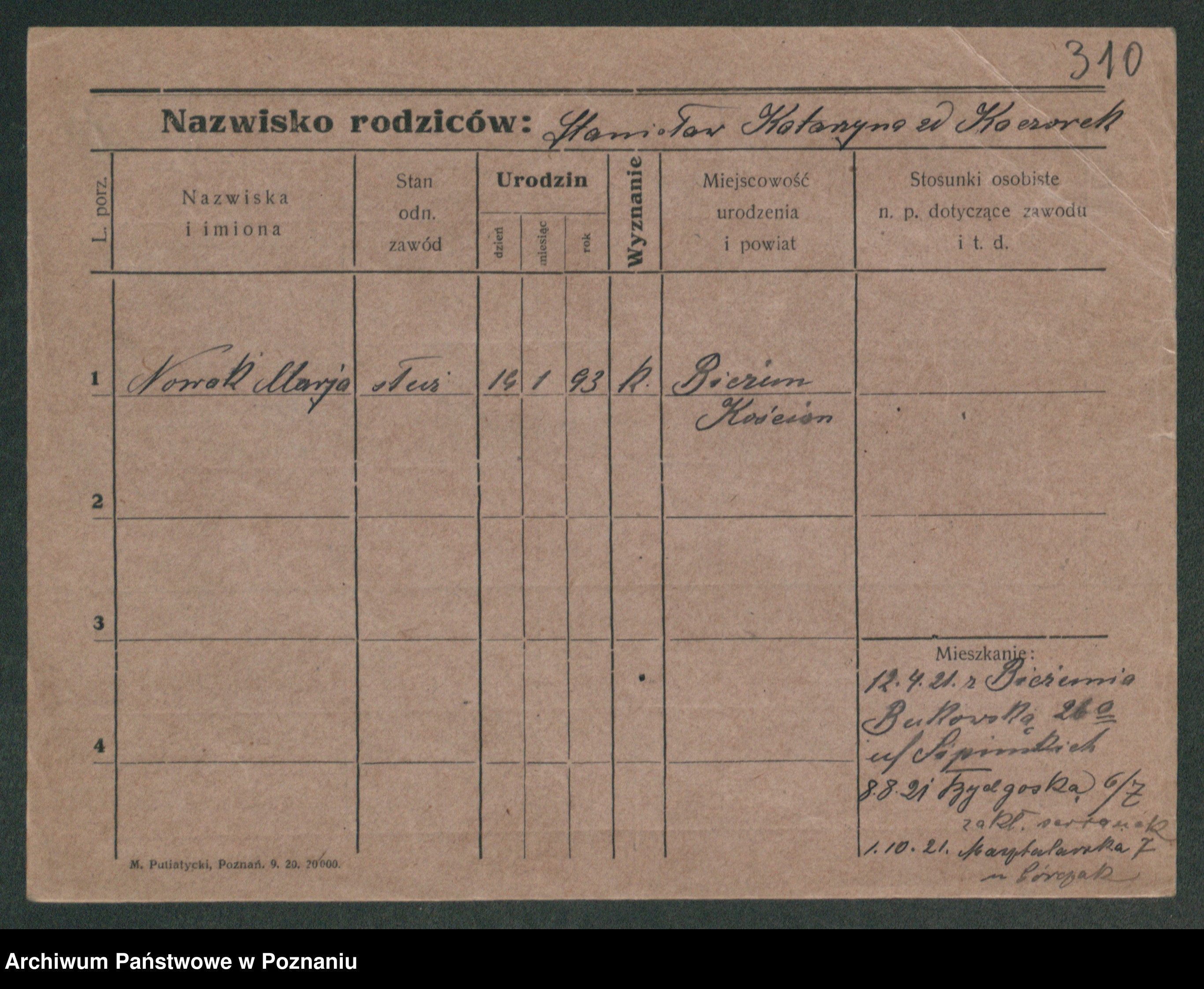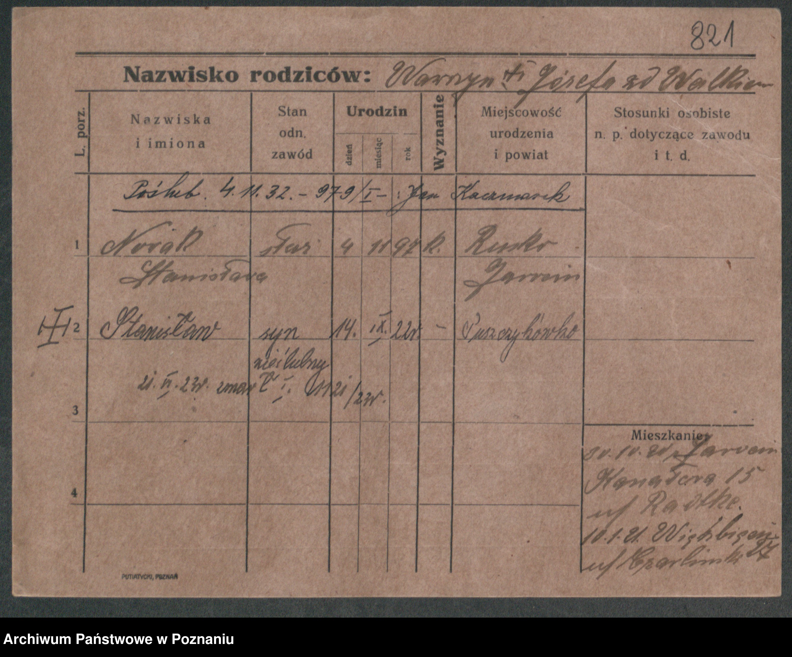 Podgląd karty osobowej dostępny jest po kliknięciu na nazwisko lub ikonkę karty. Można dokonywać powiększenia (ikony na górze) lub przechodzić między kolejnymi skanami (strzałki po bokach).